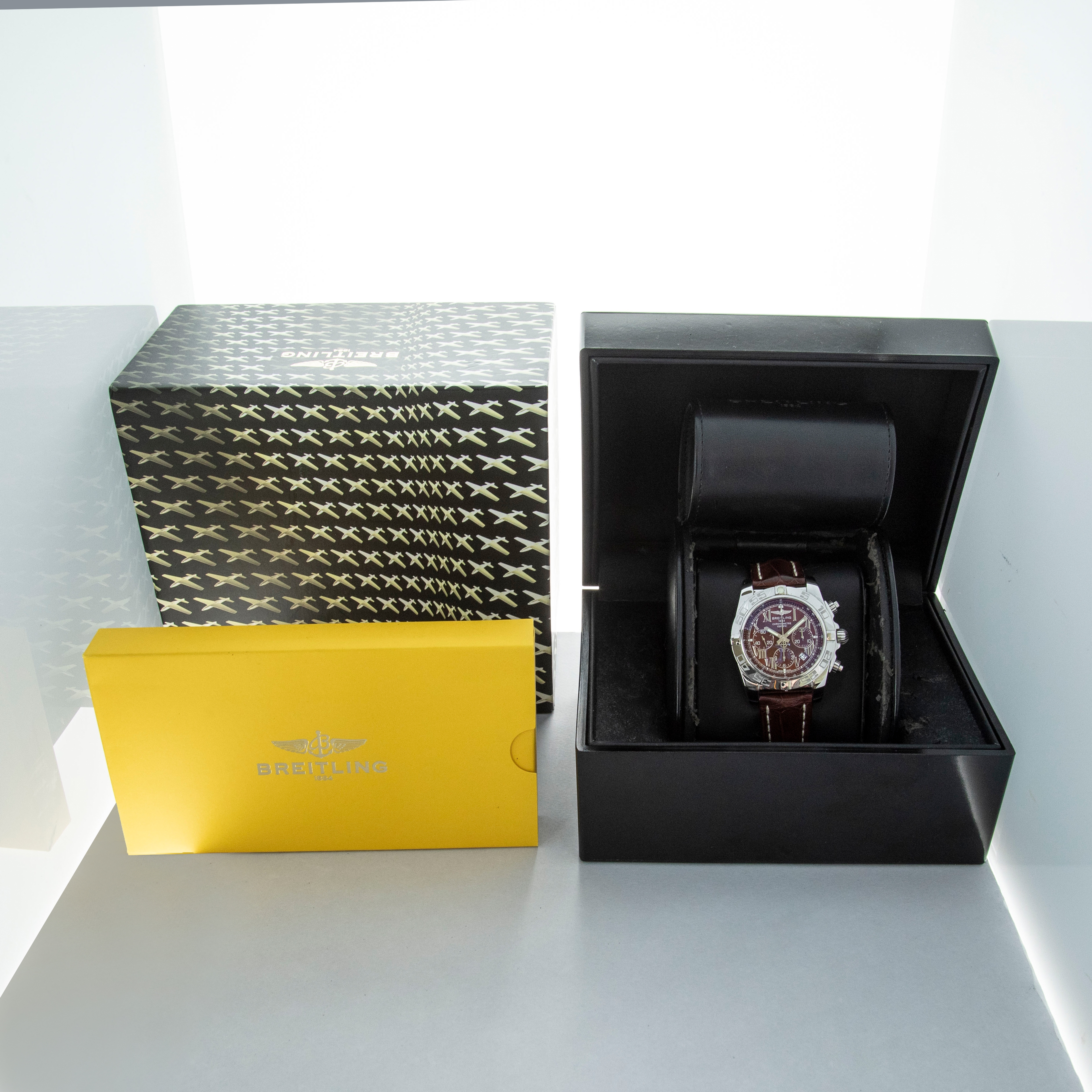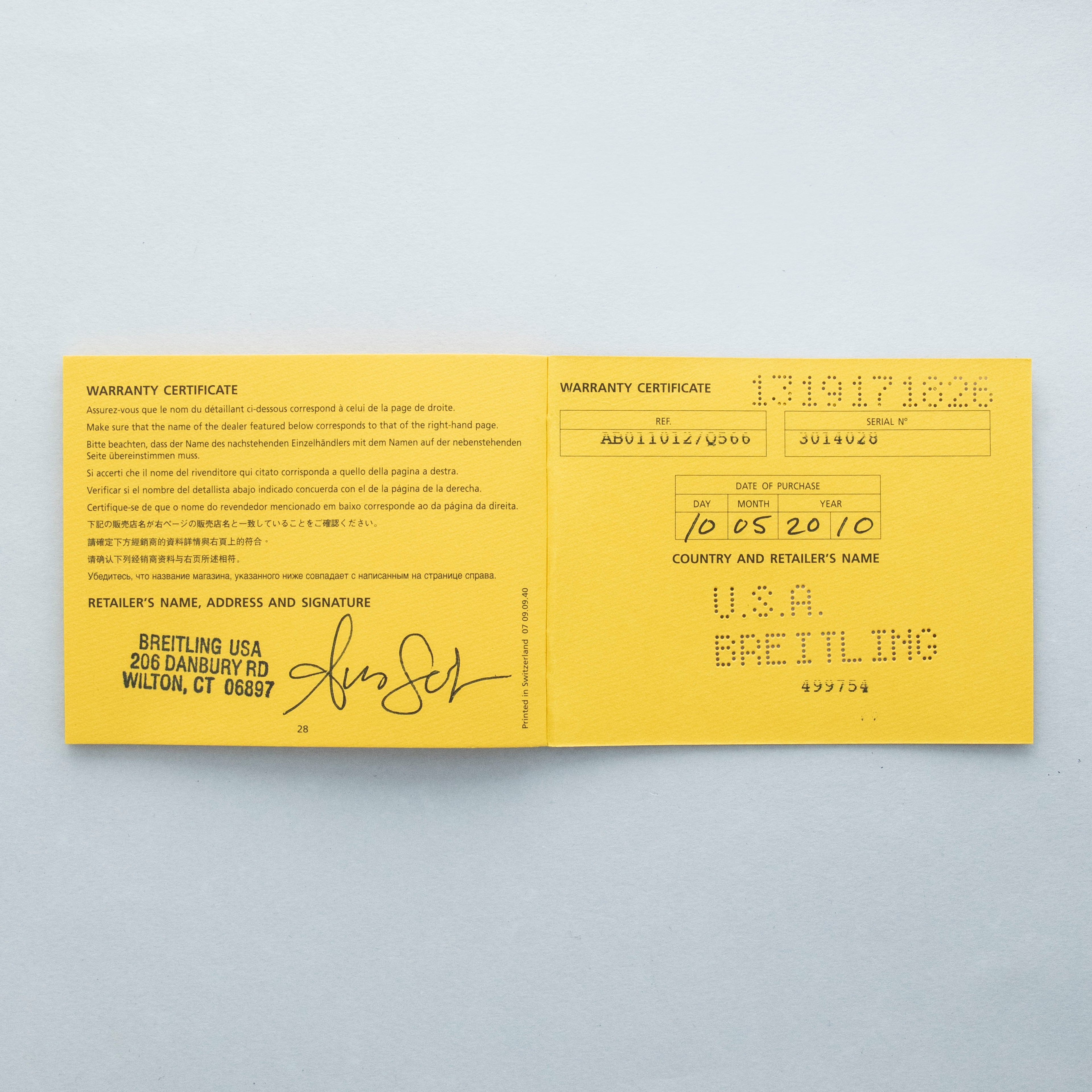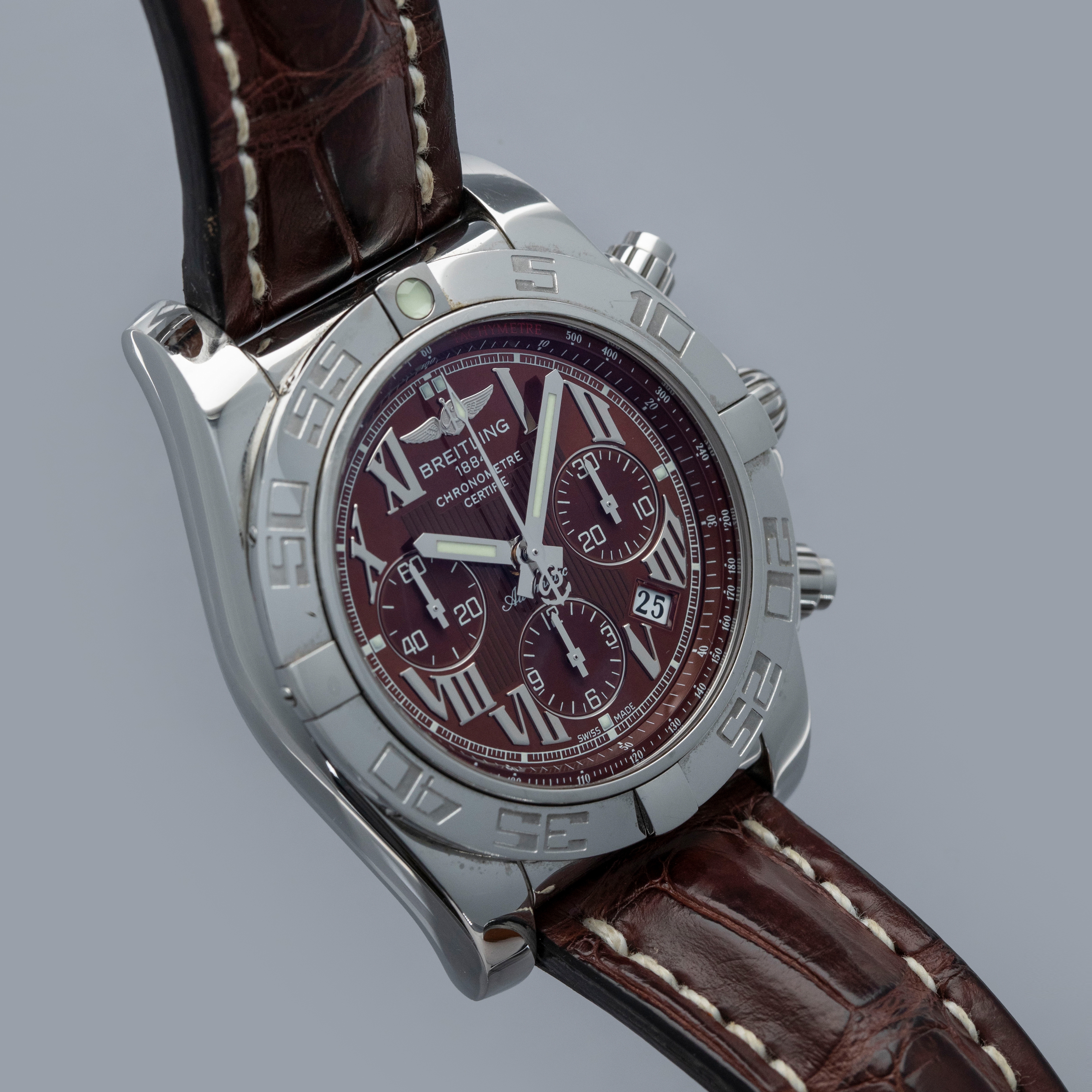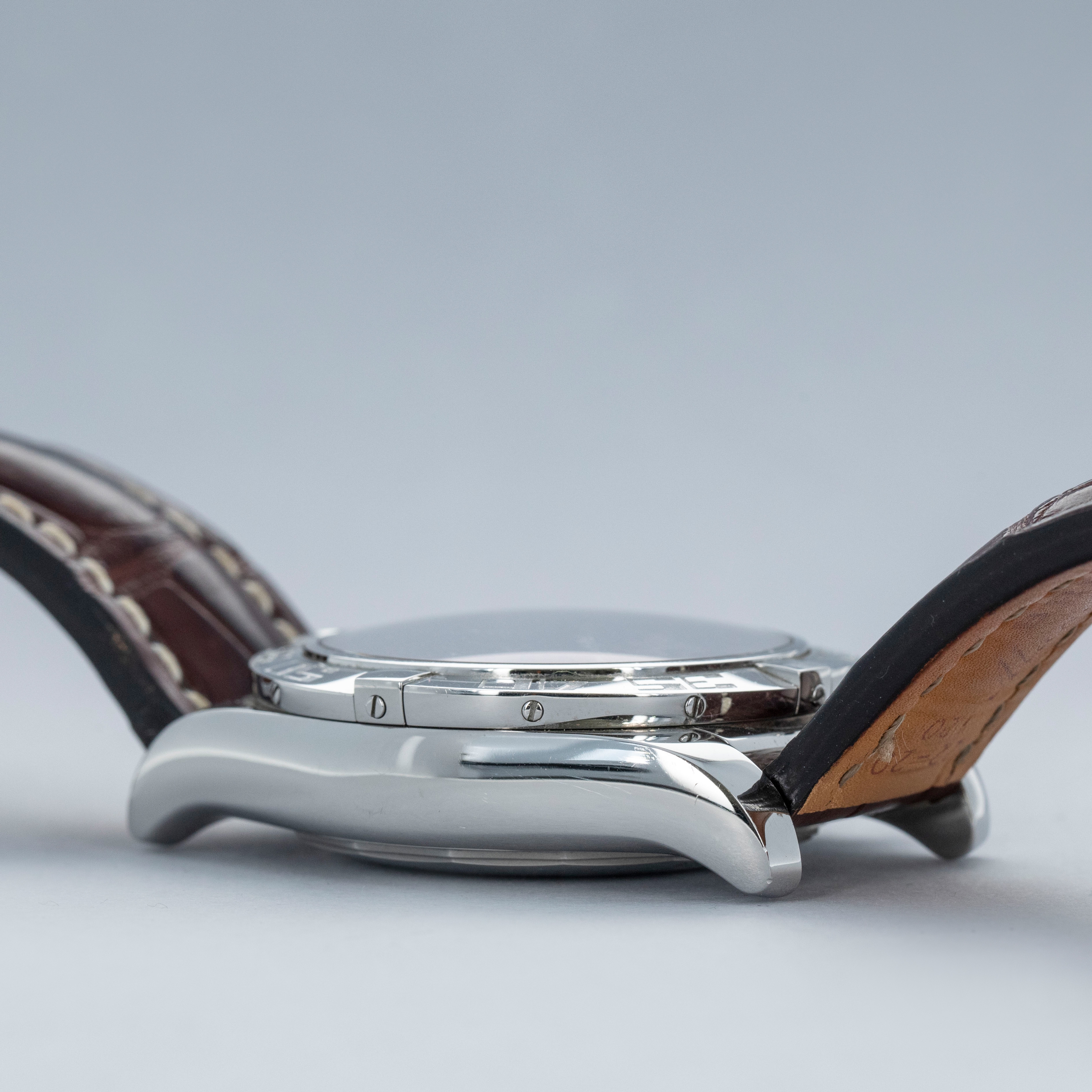 Watch is in overall excellent condition. The steel case shows some marks and scratches from wear, particularly on the inner bezel and on the rotating bezel. The case back has deep engravings and further wear marks. The dial is near mint and the hands are very clean. It is fitted with a Breitling crocodile strap and steel pin buckle in excellent condition. Comes with inner and outer boxes, guarantee, chronometer certificate, booklet and document holder.