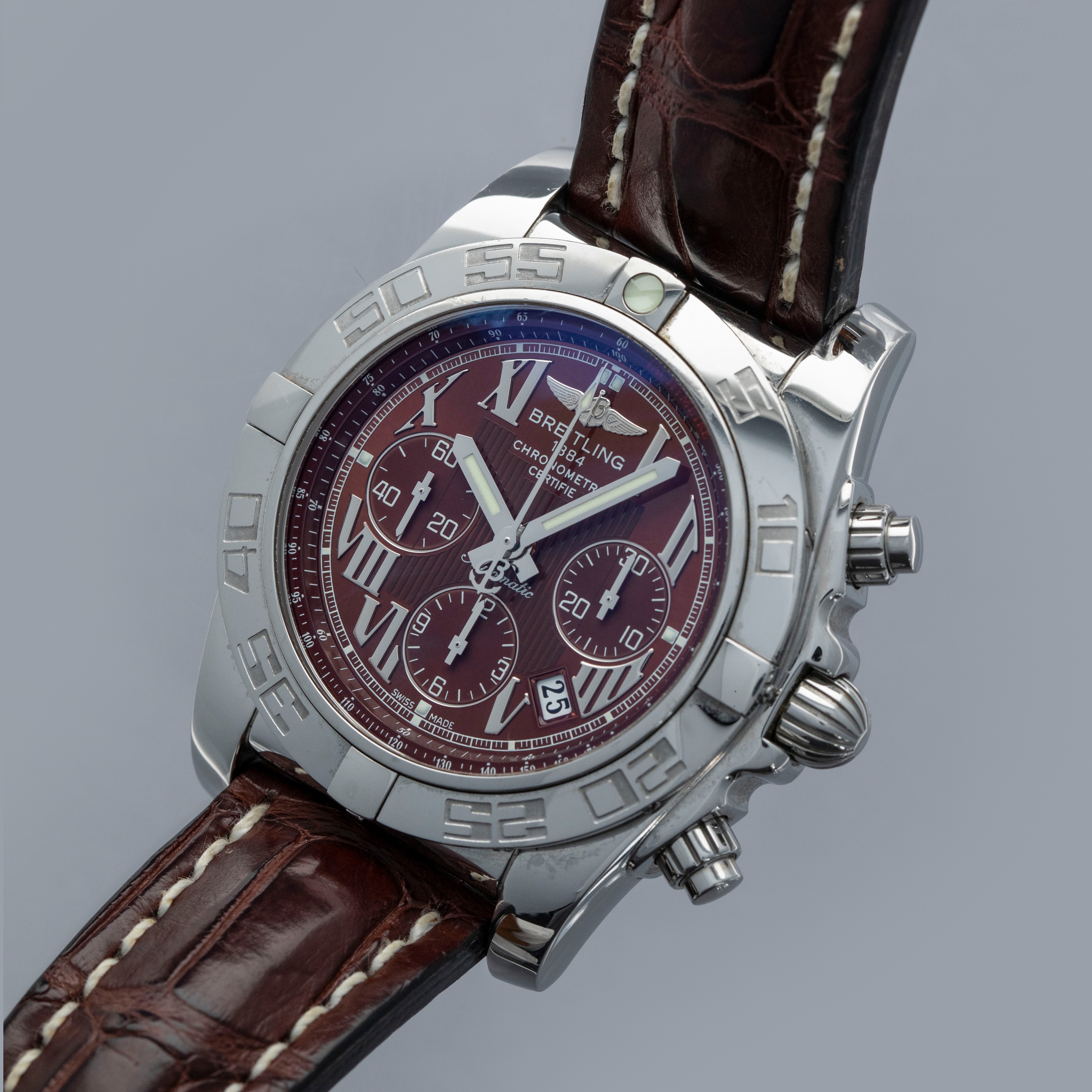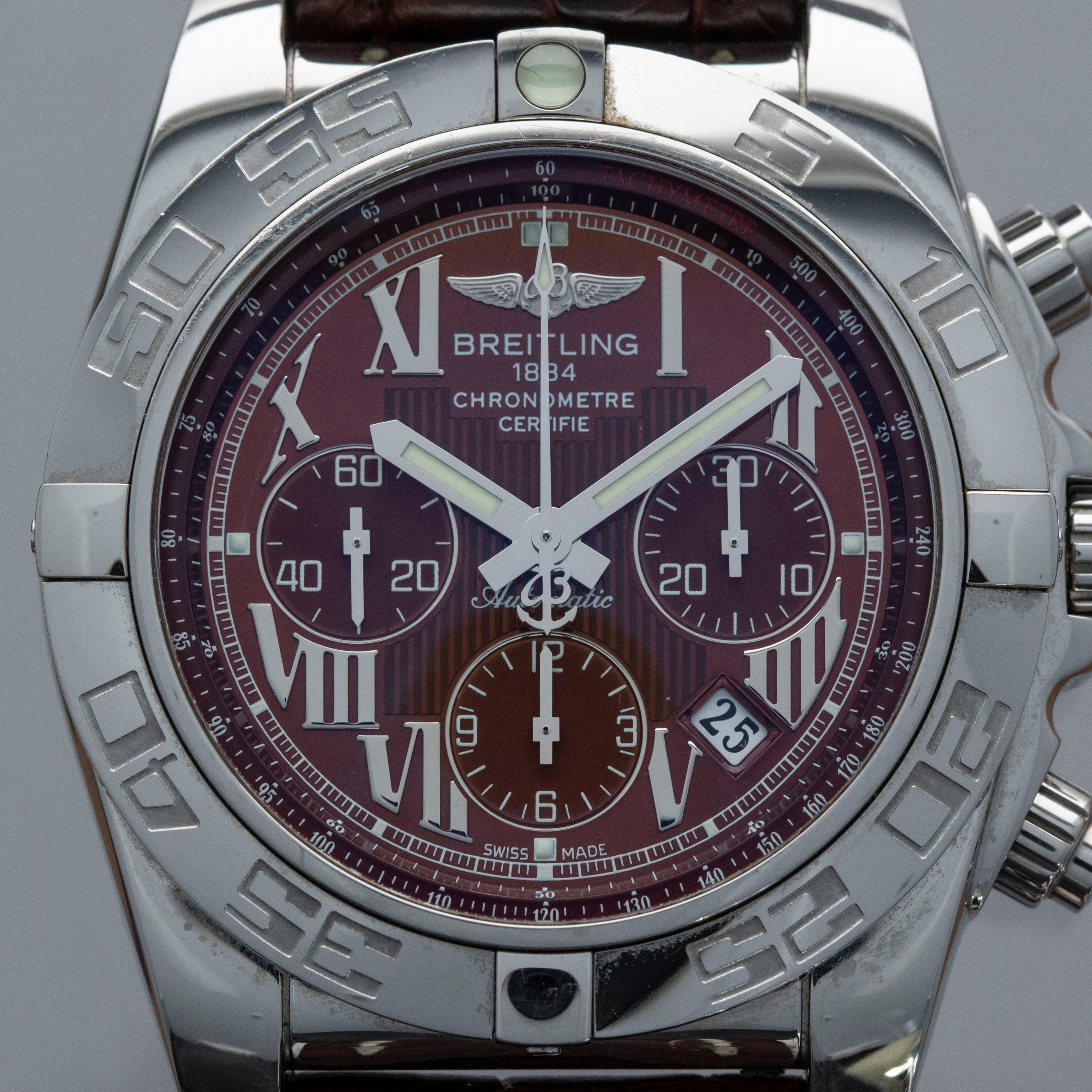 A hallmark of Breitling’s horological involvement in the aviation industry, the Breitling Chronomat has stood as a beacon of horological excellence since its inception in 1941. Originally created for the scientific and engineering community, the Chronomat boasted its pioneering slide-rule bezel, an innovative feature designed to aid in complex calculations. This distinctive characteristic not only underscored Breitling's commitment to functionality but also marked the Chronomat as a forerunner in the realm of tool watches. Then in 1983 Breitling decided to revive the collection, specifically for pilots, an industry it has made a magnificent impact on, through its collaborations with Frecce Tricolori, an aerobatic demonstration team of the Italian Air Force and others. Today, the Breitling Chronomat continues to embody the brand's pioneering spirit, combining timeless elegance with unmatched precision. Its design, featuring a robust case, intricate dial layouts, and the signature onion crown, appeals to both aviation professionals and watch enthusiasts alike. Offered here we have the stainless steel Chronomat 44 ref. AB011012/Q566 from the 2010s with the collection’s signature onion crown, aggressive bezel and information-dense plum purple chronograph dial with silver detailing. Featuring an entirely polished exterior, the Chronomat 44 that we have here is an inarguably stylish and luxurious take on one of the most tool-focused watches on the market.
