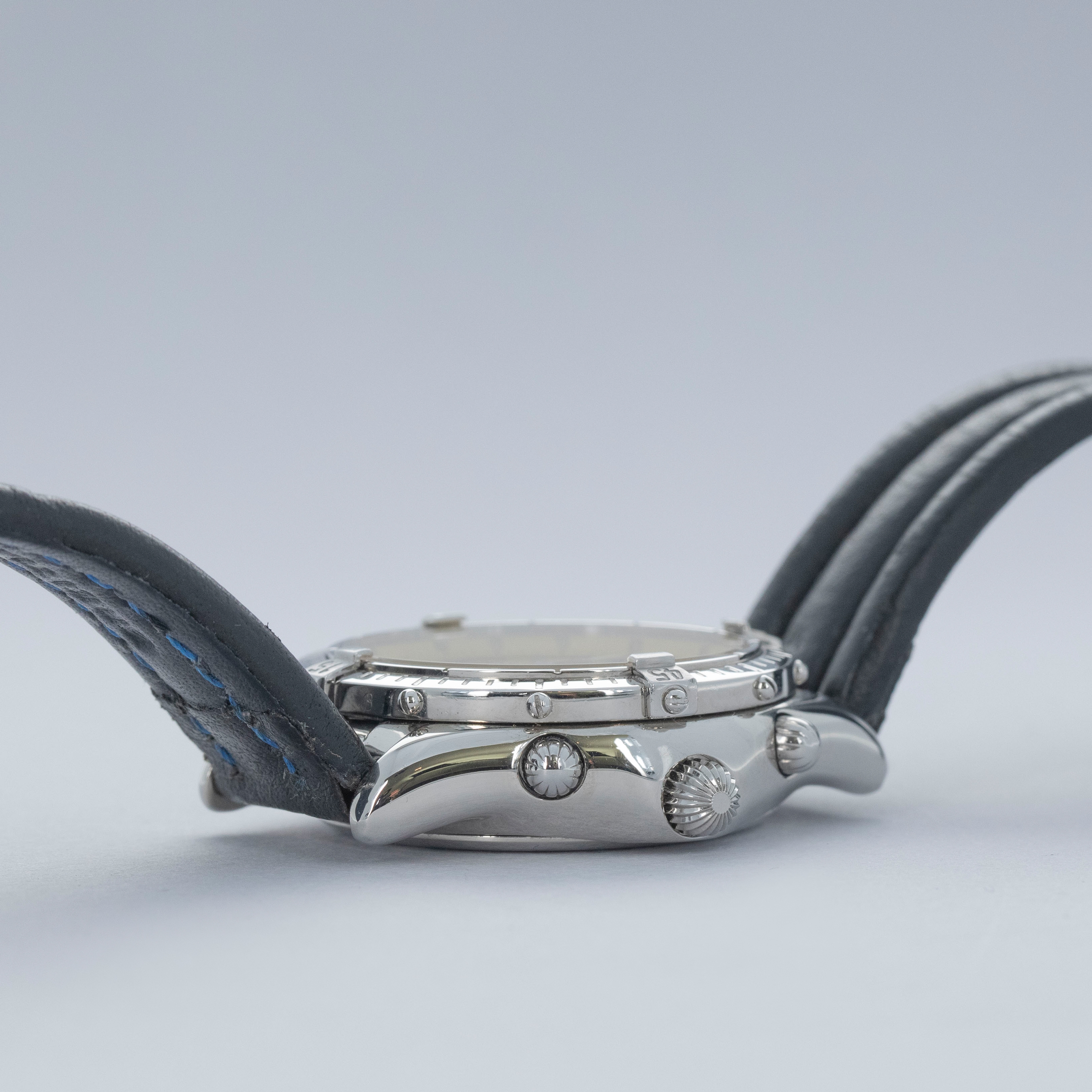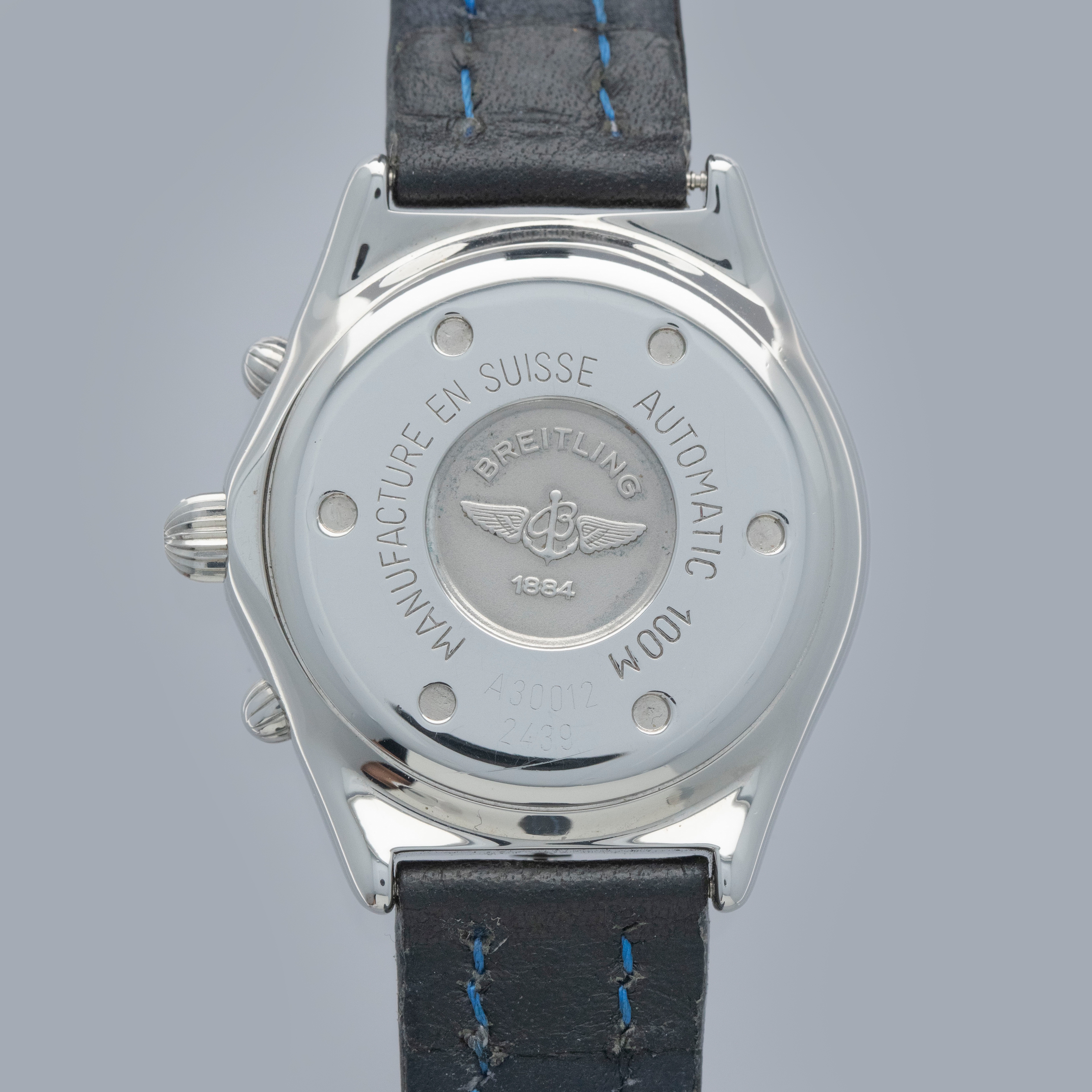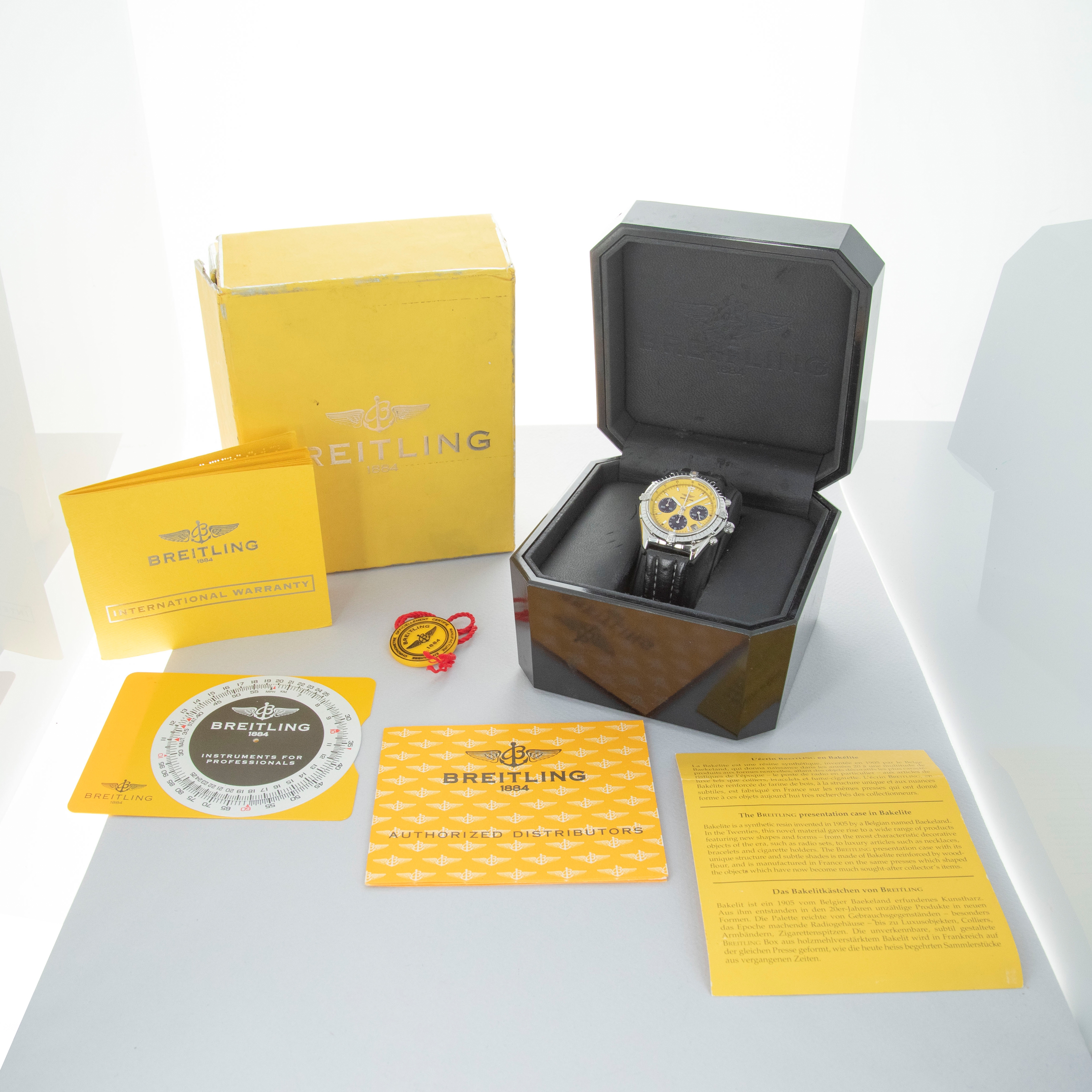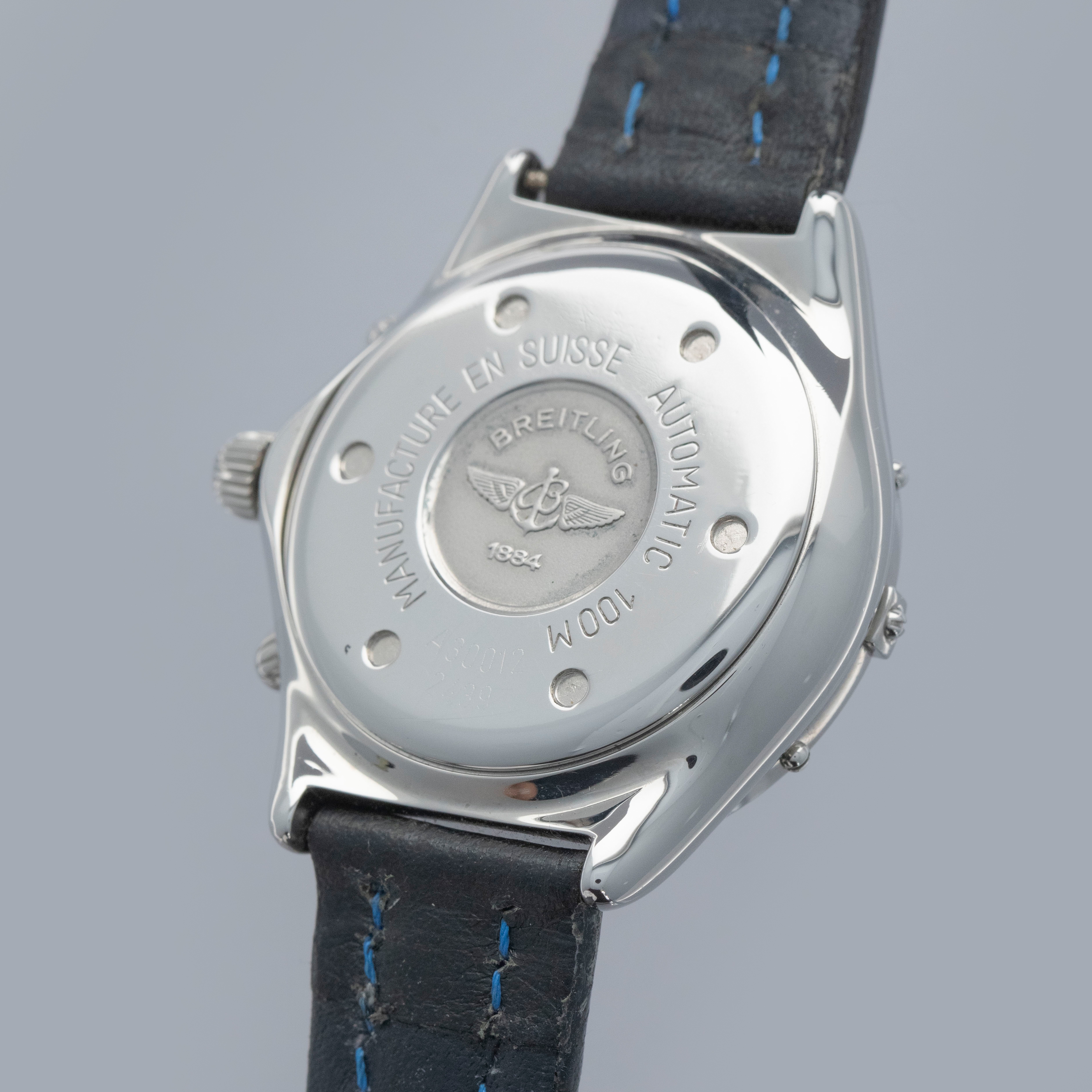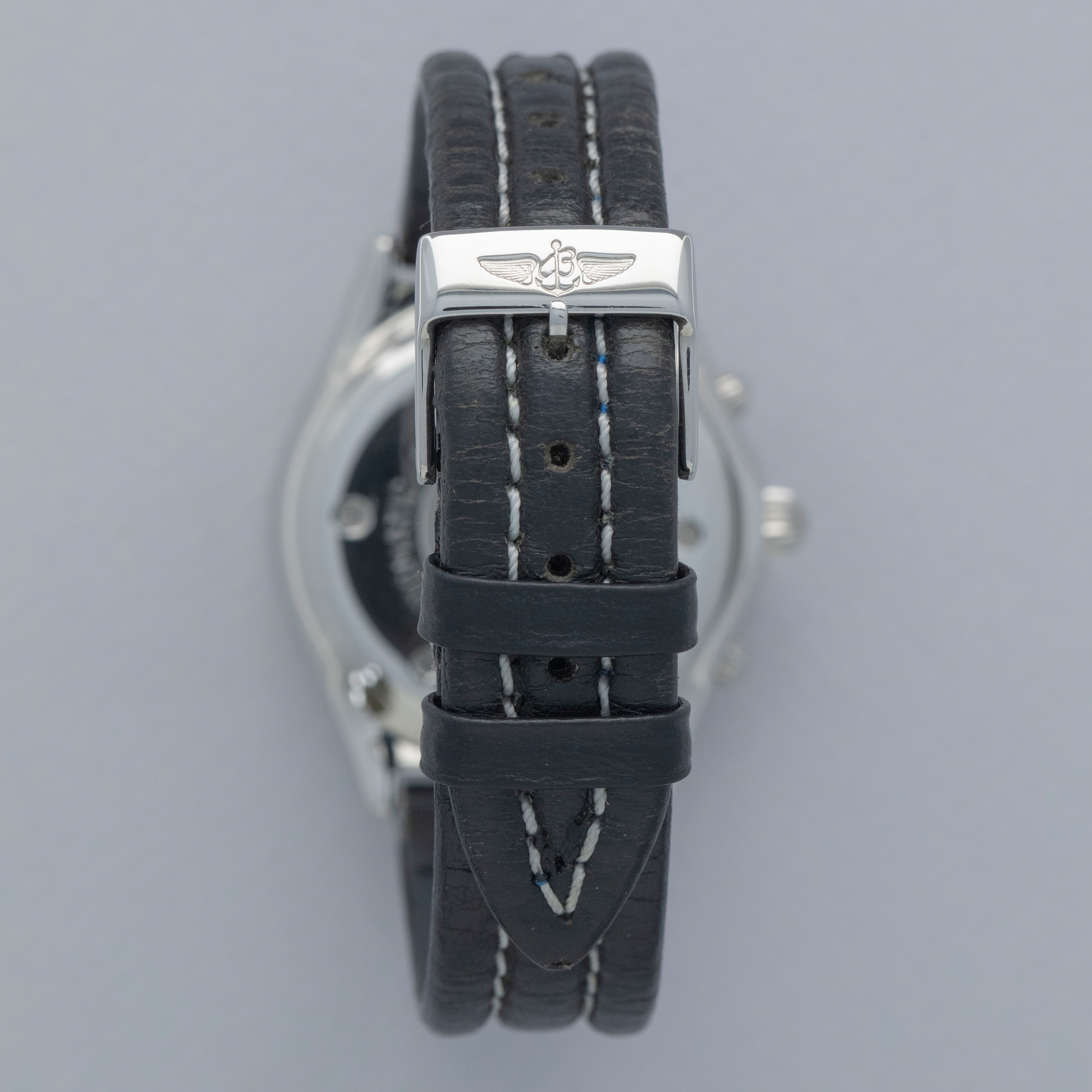 Watch is in overall excellent condition. The steel case shows light surface scratches and marks, while the bezel displays a few small scuffs. The case back retains well-defined engravings along with clear reference and serial numbers. The dial remains excellent, though there are some lume plots missing, while the hands appear to have been relumed. It is fitted with a Breitling leather strap and a steel pin buckle, both remaining in excellent condition. Comes complete with inner and outer boxes, blank warranty, slide rule calculator, booklets, and hangtag.