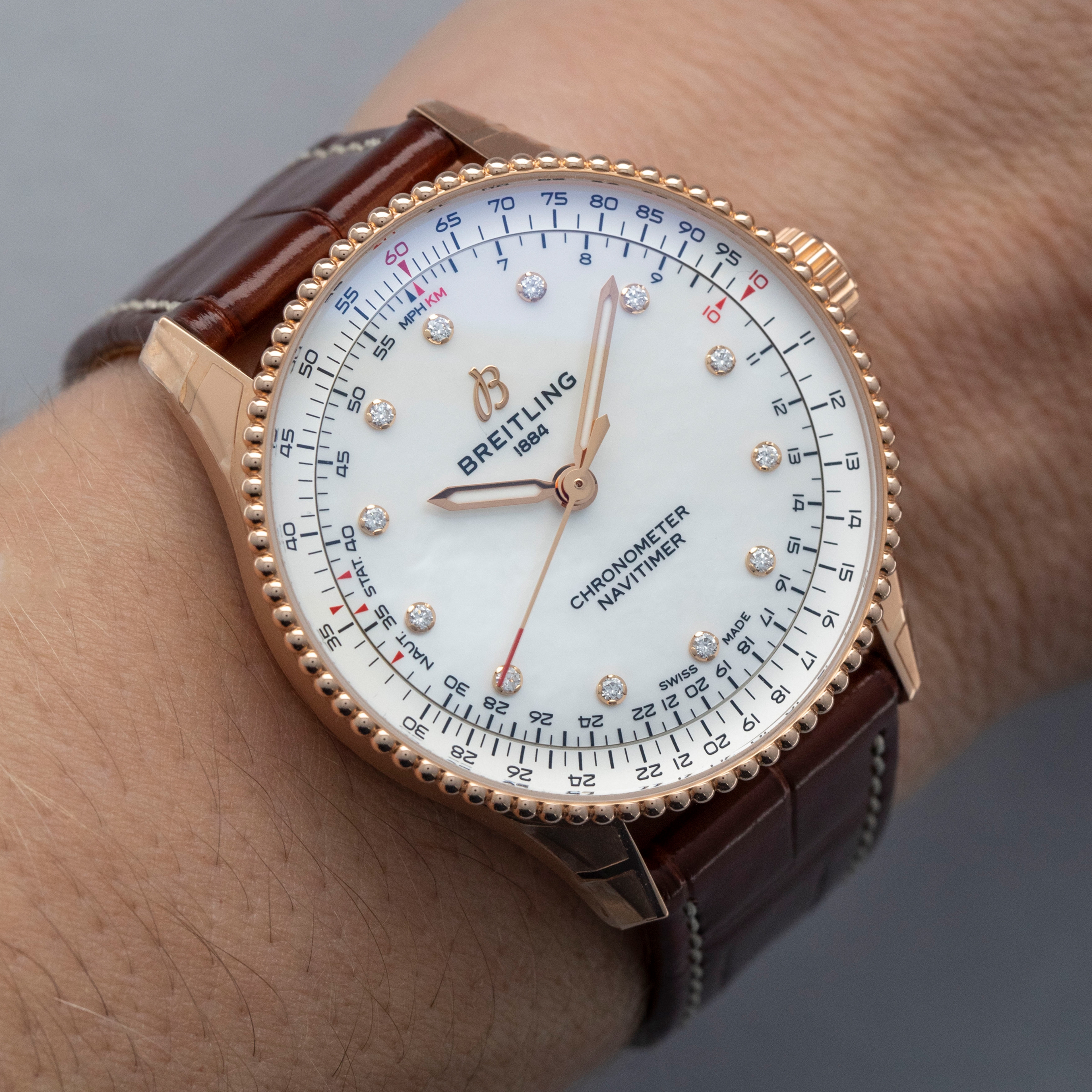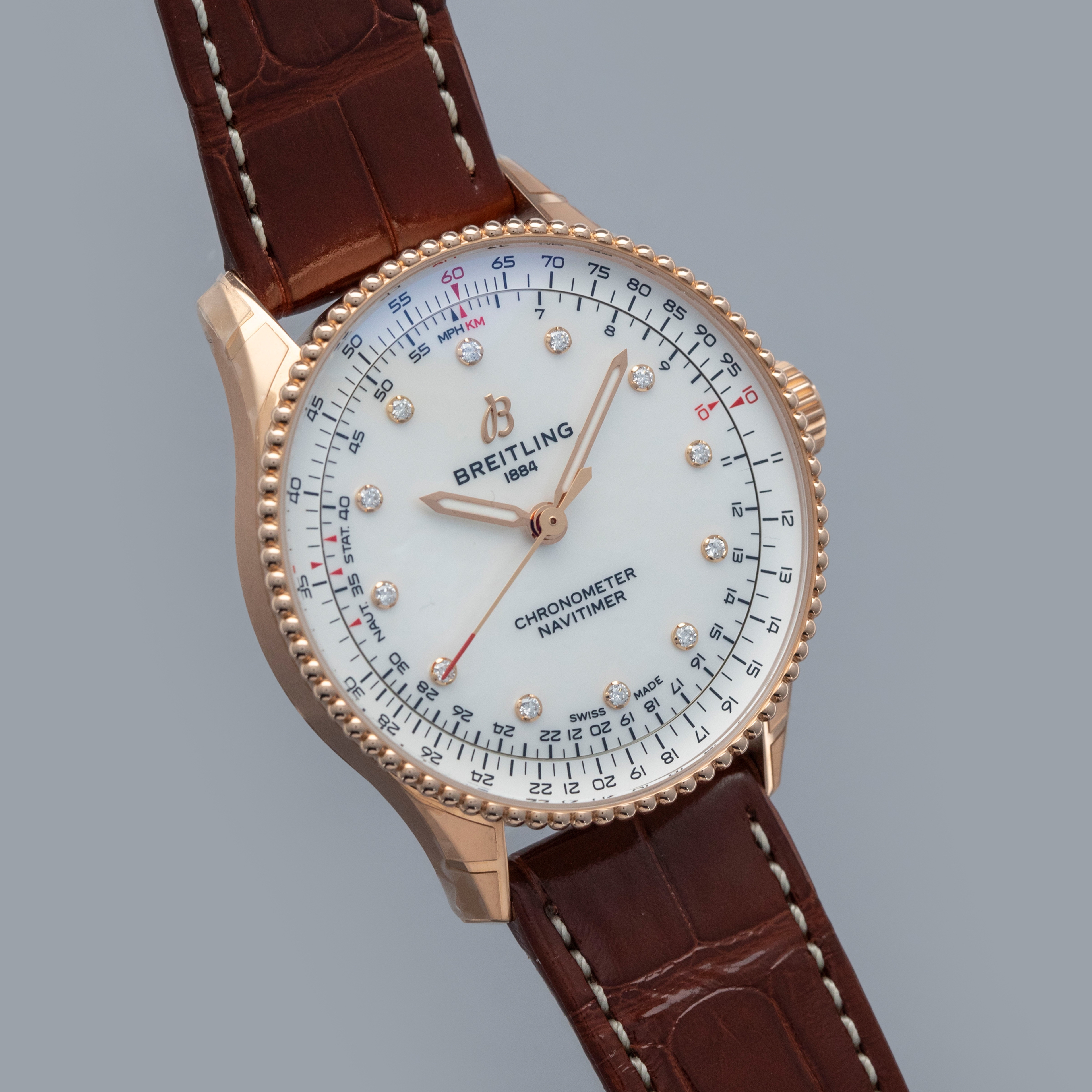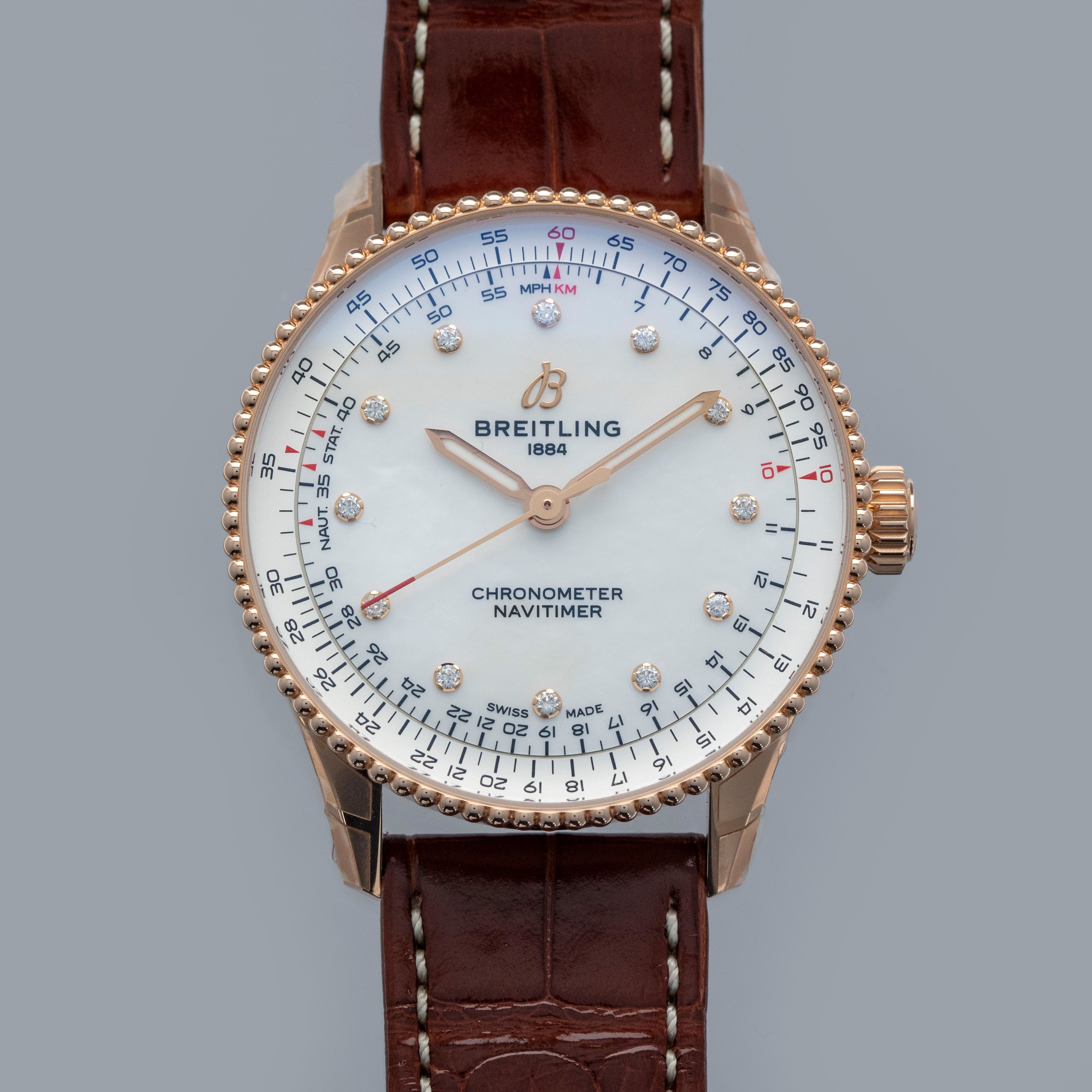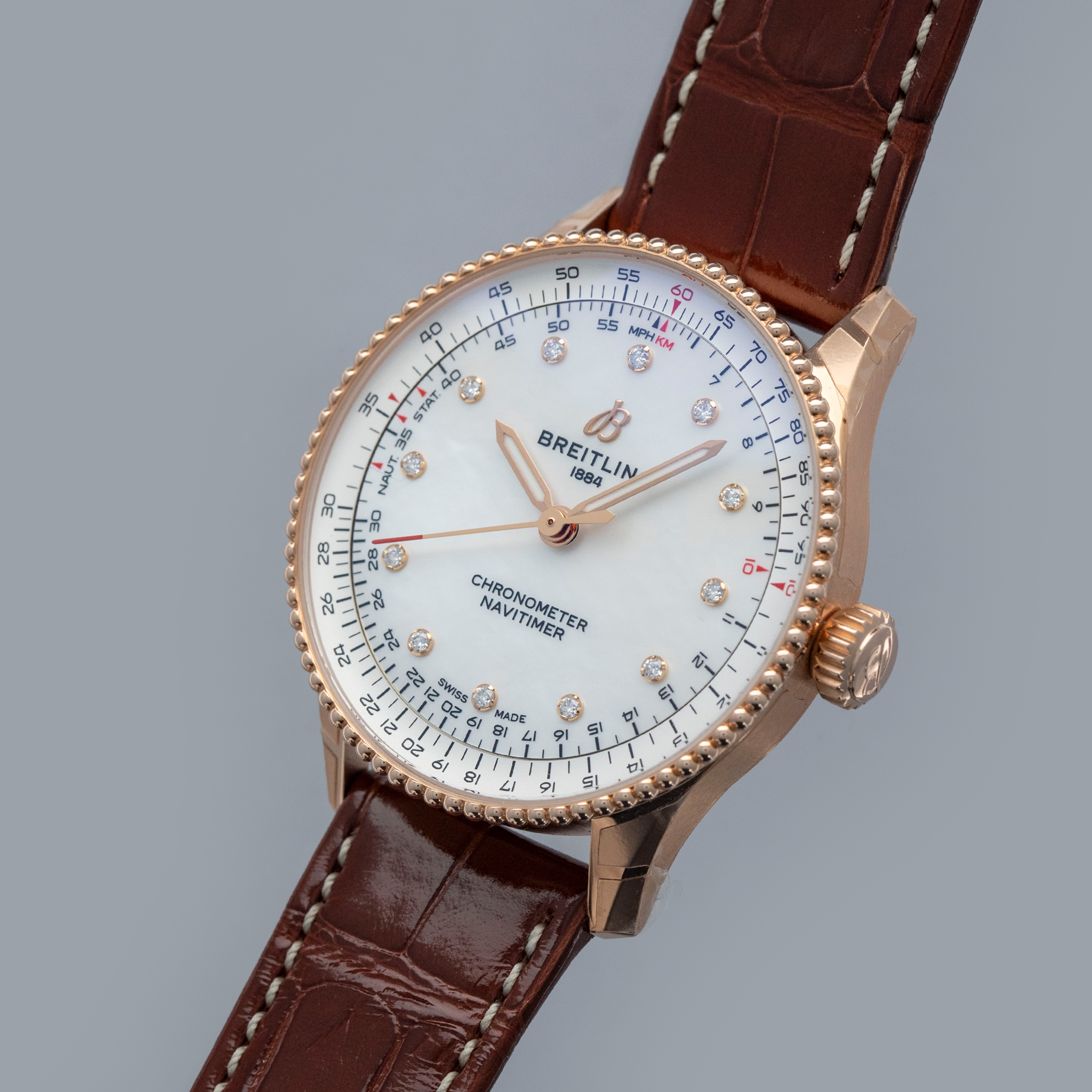 First released in 1952 and based on Breitling’s 1942 Chronomat, the Breitling Navitimer was the pilot’s watch to end all pilot’s watches. Following Breitling’s collaboration with the AOPA (Aircraft Owners and Pilots Association) to make the slide rule of its Chronomat even more relevant to pilots, the Navitimer was born as the ultimate pilot’s watch. Basically a hand-held computer, the Navitimer enabled pilots to quickly figure out fuel consumption rates, average speeds, convert between various scales, and much more. Offered here as a variation of that iconic pilot’s watch, we have the Ladies Navitimer ref. R17327. Boasting a 36mm 18kt rose gold case, it features the Navitimer’s iconic slide rule bezel, but instead of the collection’s typical chronograph display, it features a time-only mother-of-pearl dial with diamond-set hour markers, as it merges the Navitimer’s historical design with luxury and aesthetic nuance.