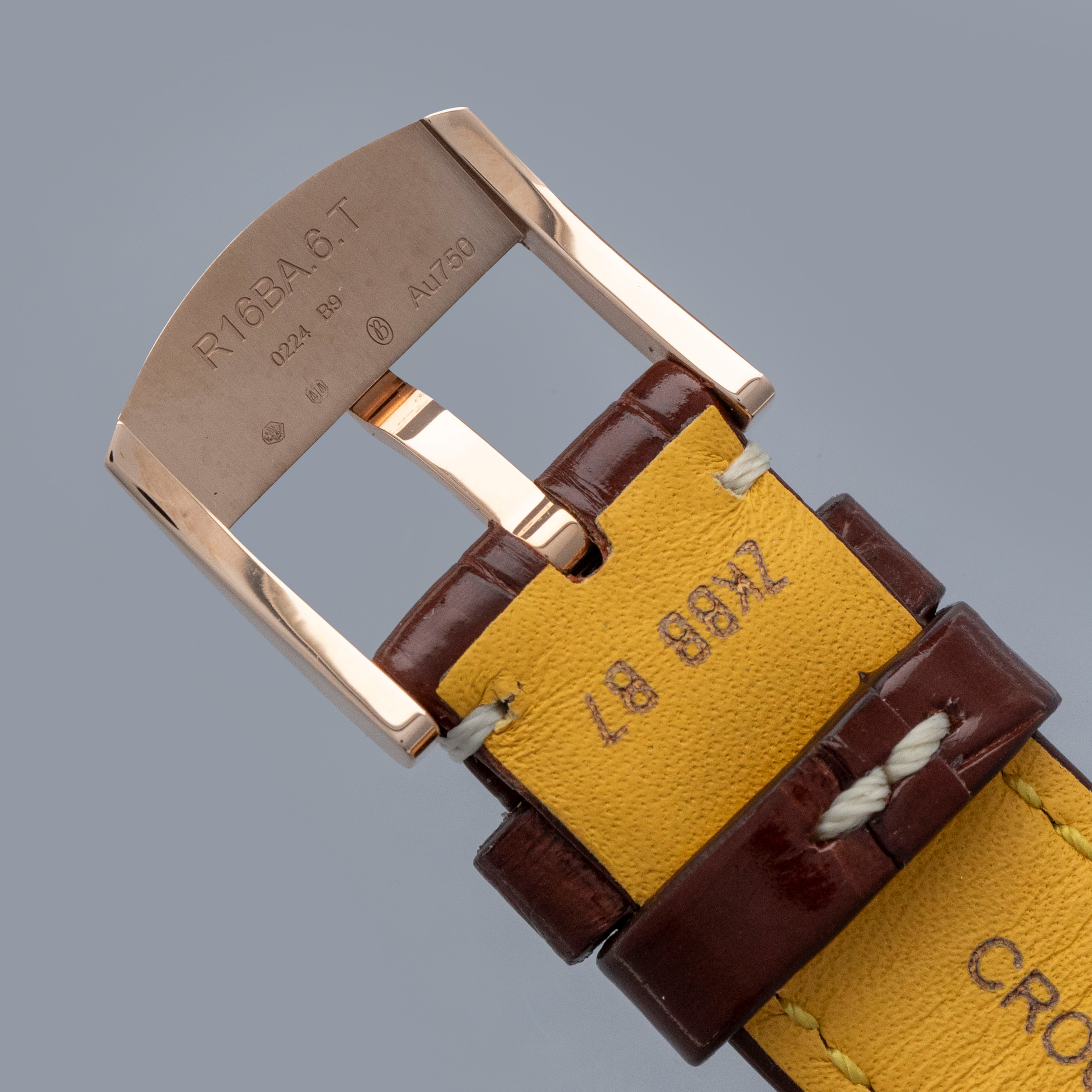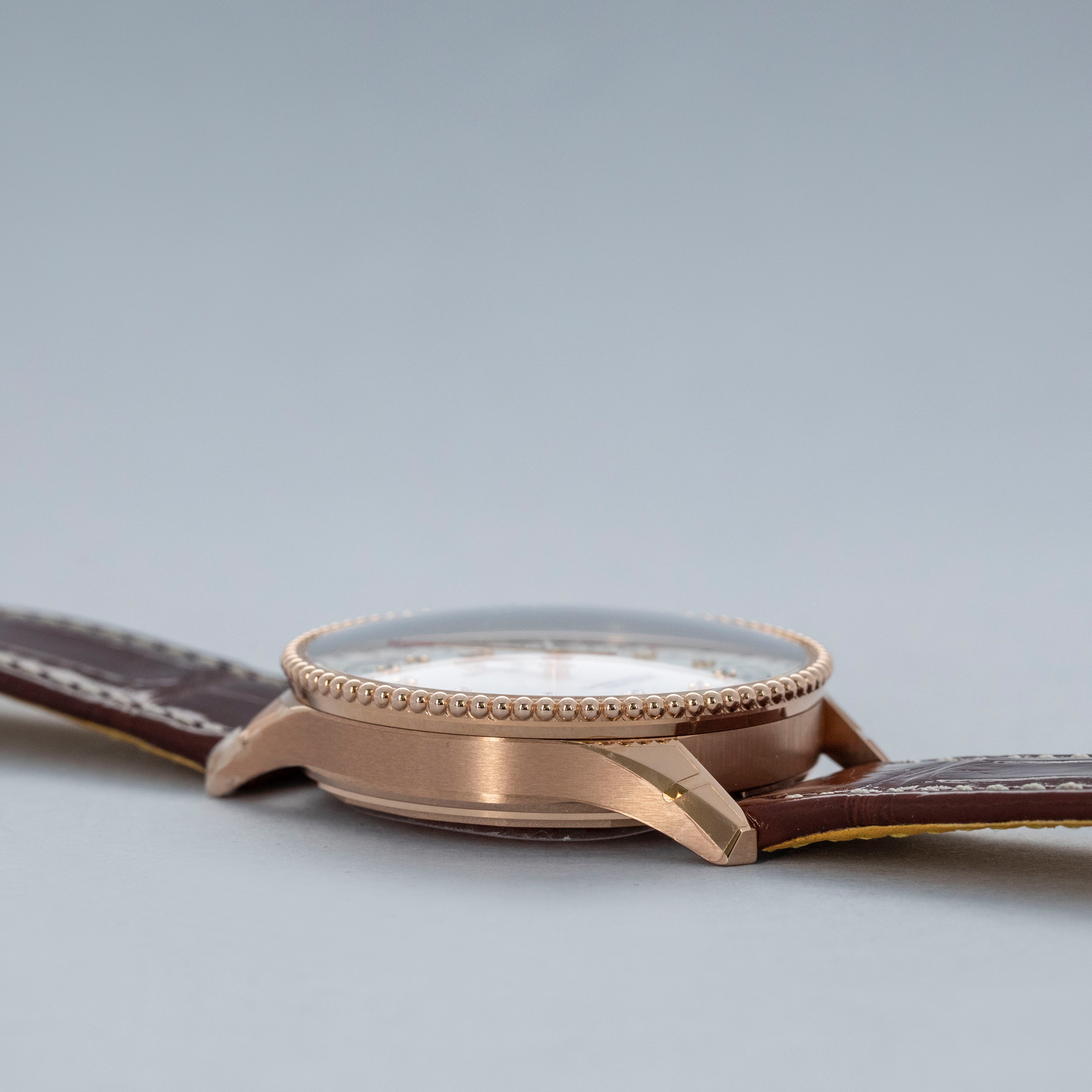 Sized at 36mm in diameter and fitted with its beaded bezel, the 18kt rose gold ref. R17327 is elegant on the wrist.