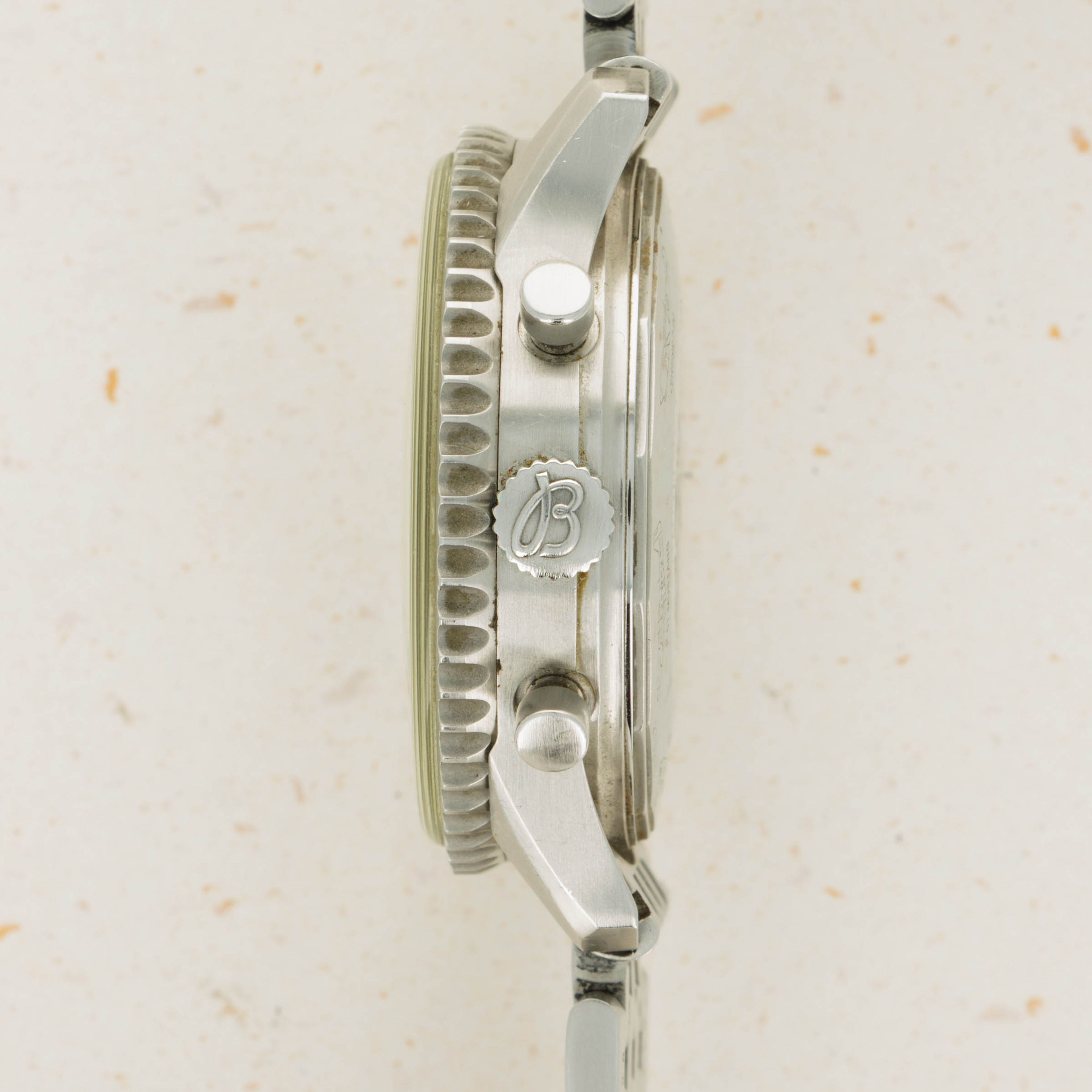 Watch is in very good overall condition. Case shows signs of use with some scratches and marks visible along the surface. There is slight surface corrosion between the mid-case and bezel visible around the edge near the lower pusher. There are marks visible along the bracelet and caseback areas as well. "B" signed crown has scratches visible. Dial appears to show no signs of wear or aging, but the crystal has marks and scratches visible on the surface. Bracelet has 8 links total, 1 of which is removable. It will fit a 6 1/2" wrist.