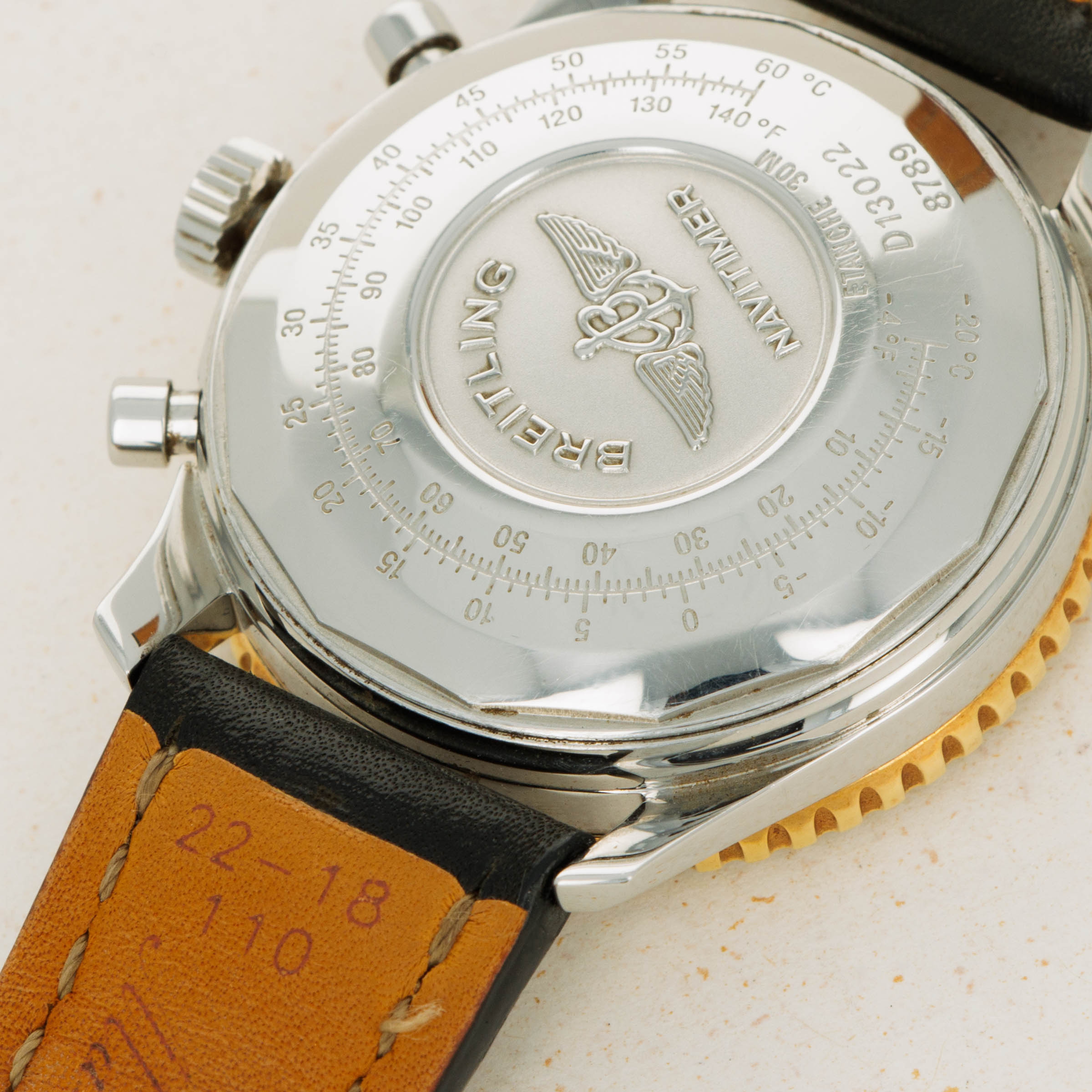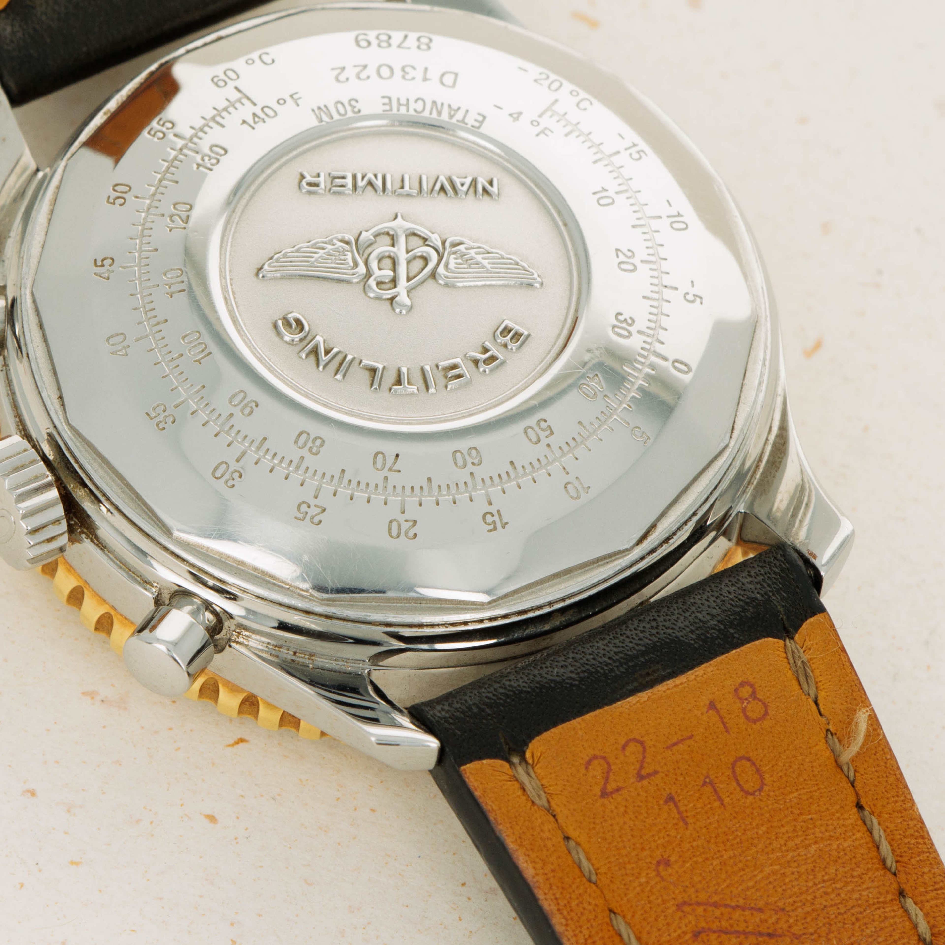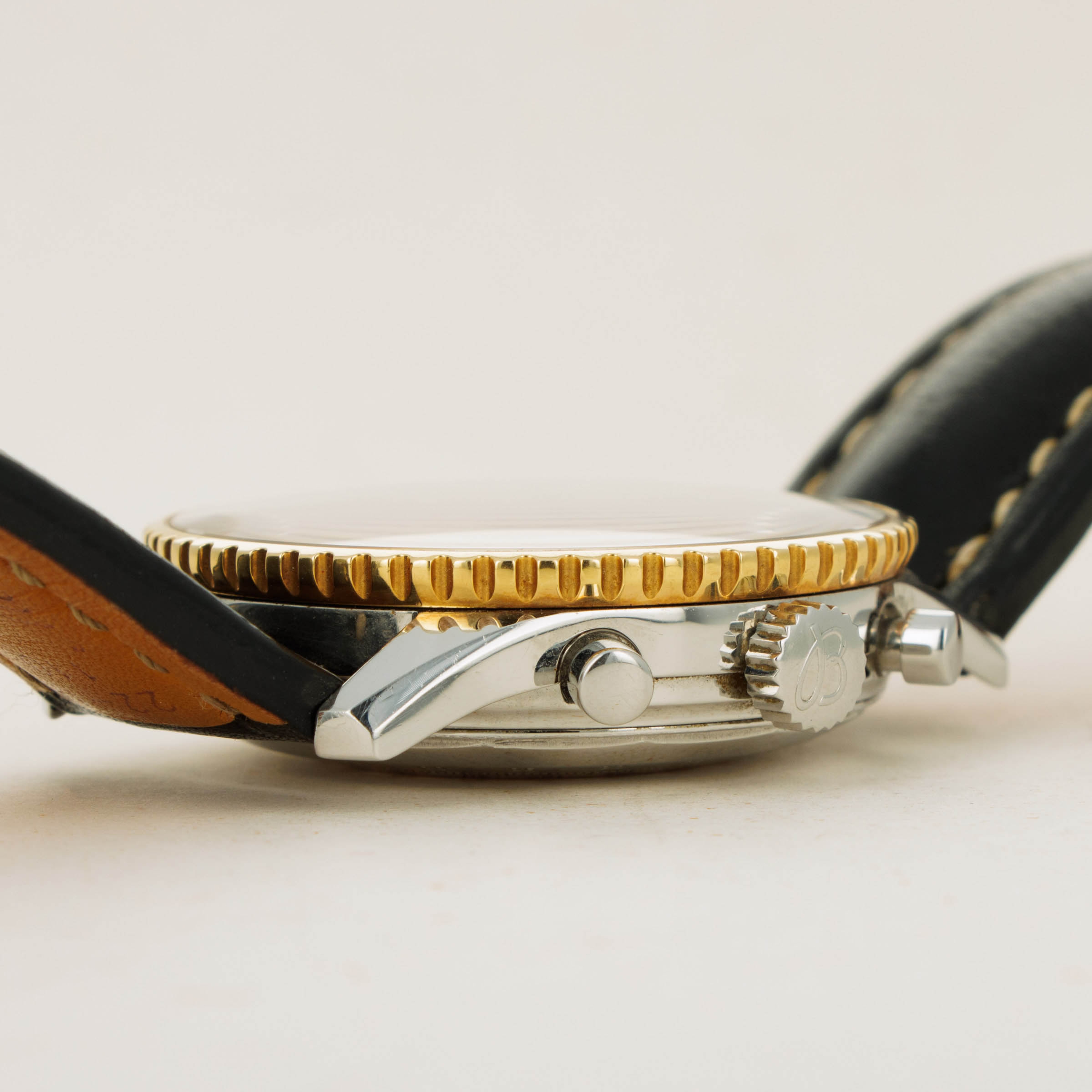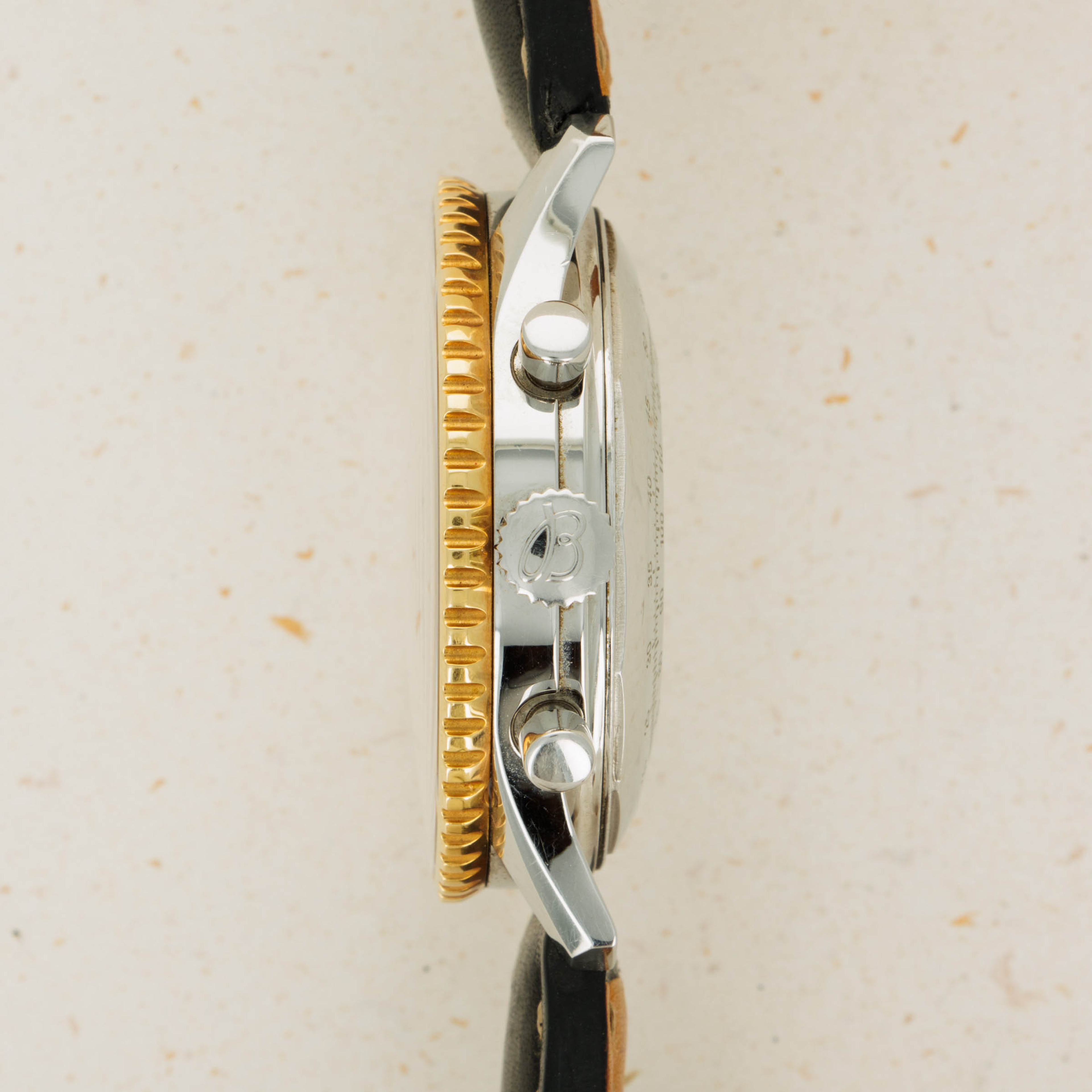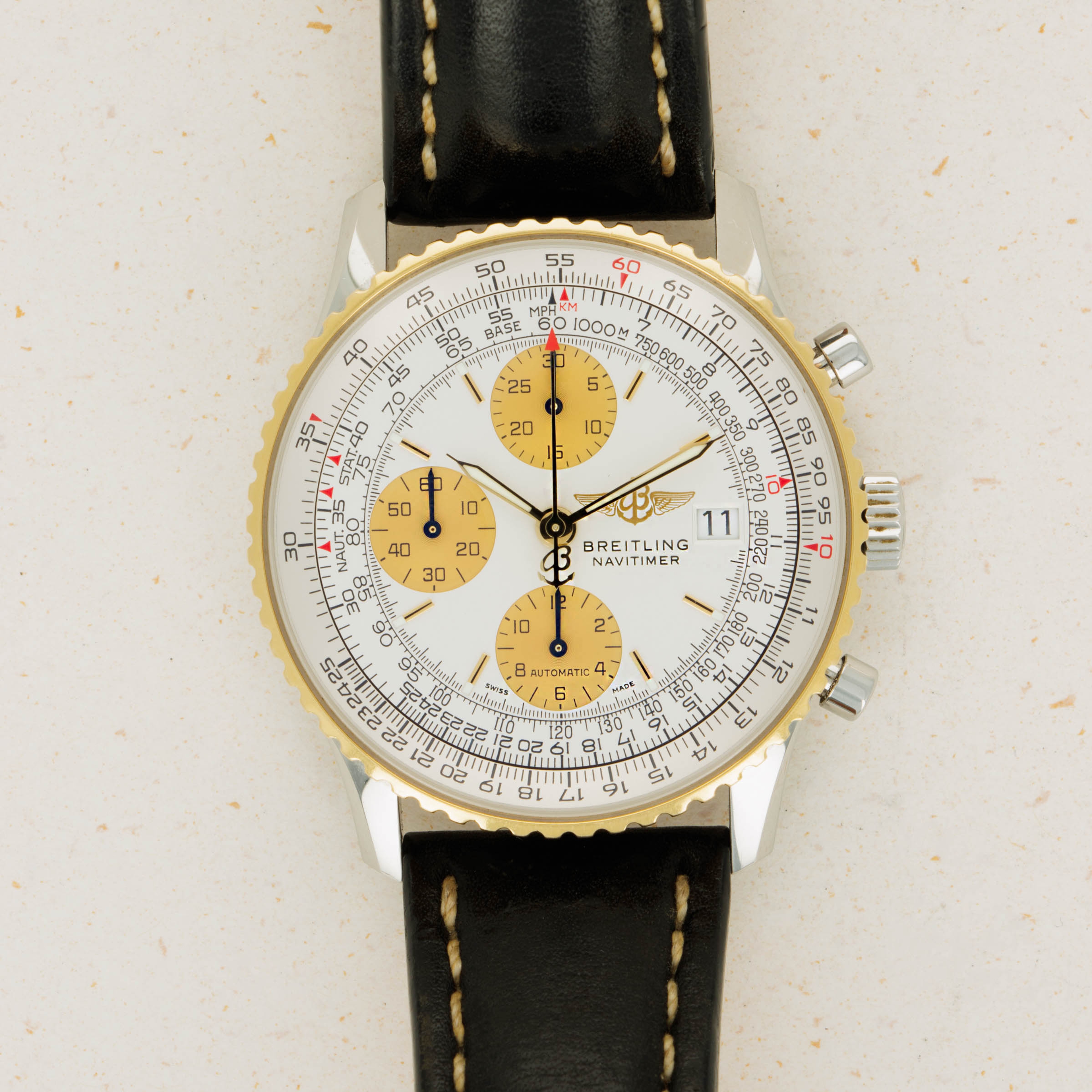 With its 18kt yellow gold bezel injecting some luxury into the Navitimer's construction and design, the ref. D13022 staddles the line between the Navitimer's utilitarian aesthetic and fashion-forward thinking.