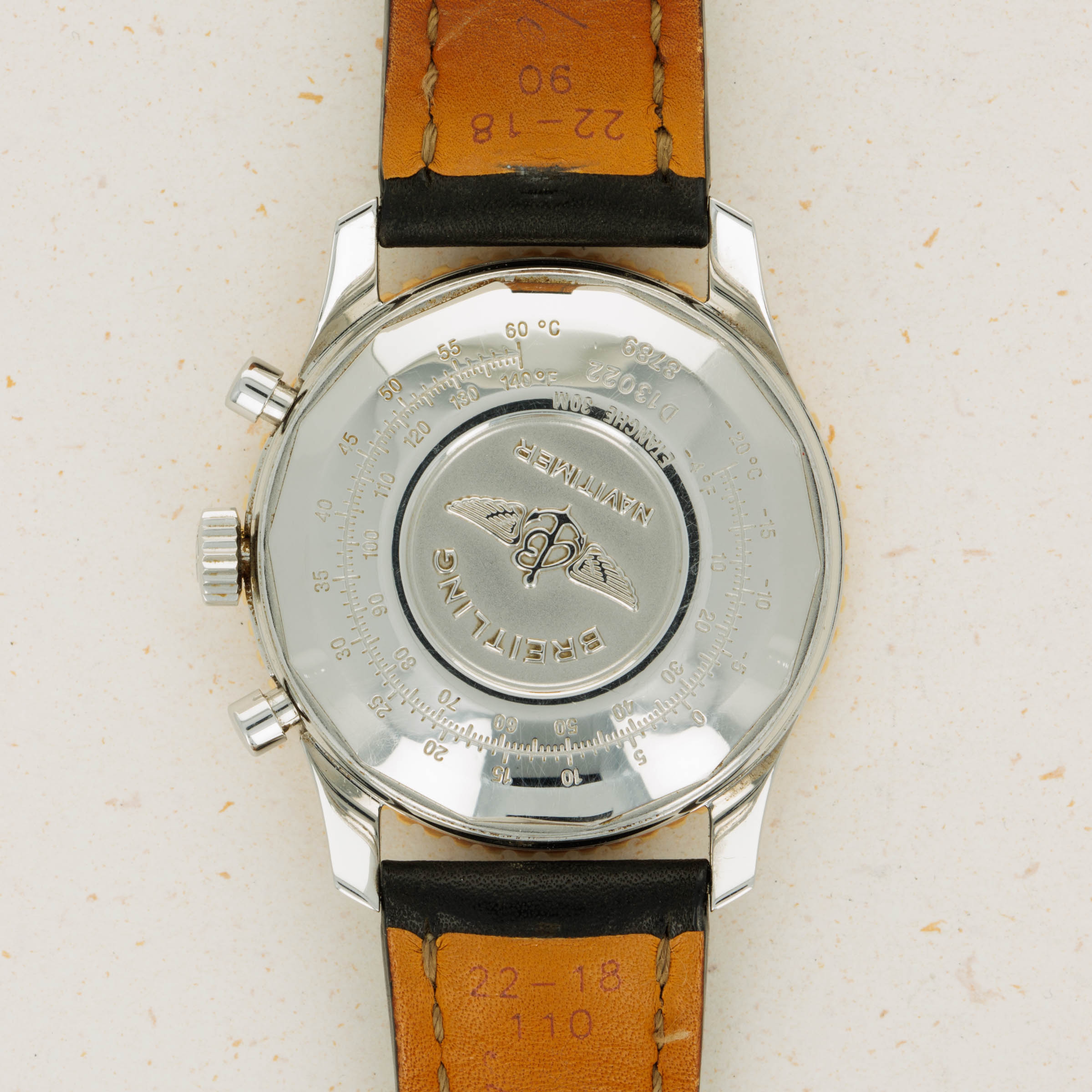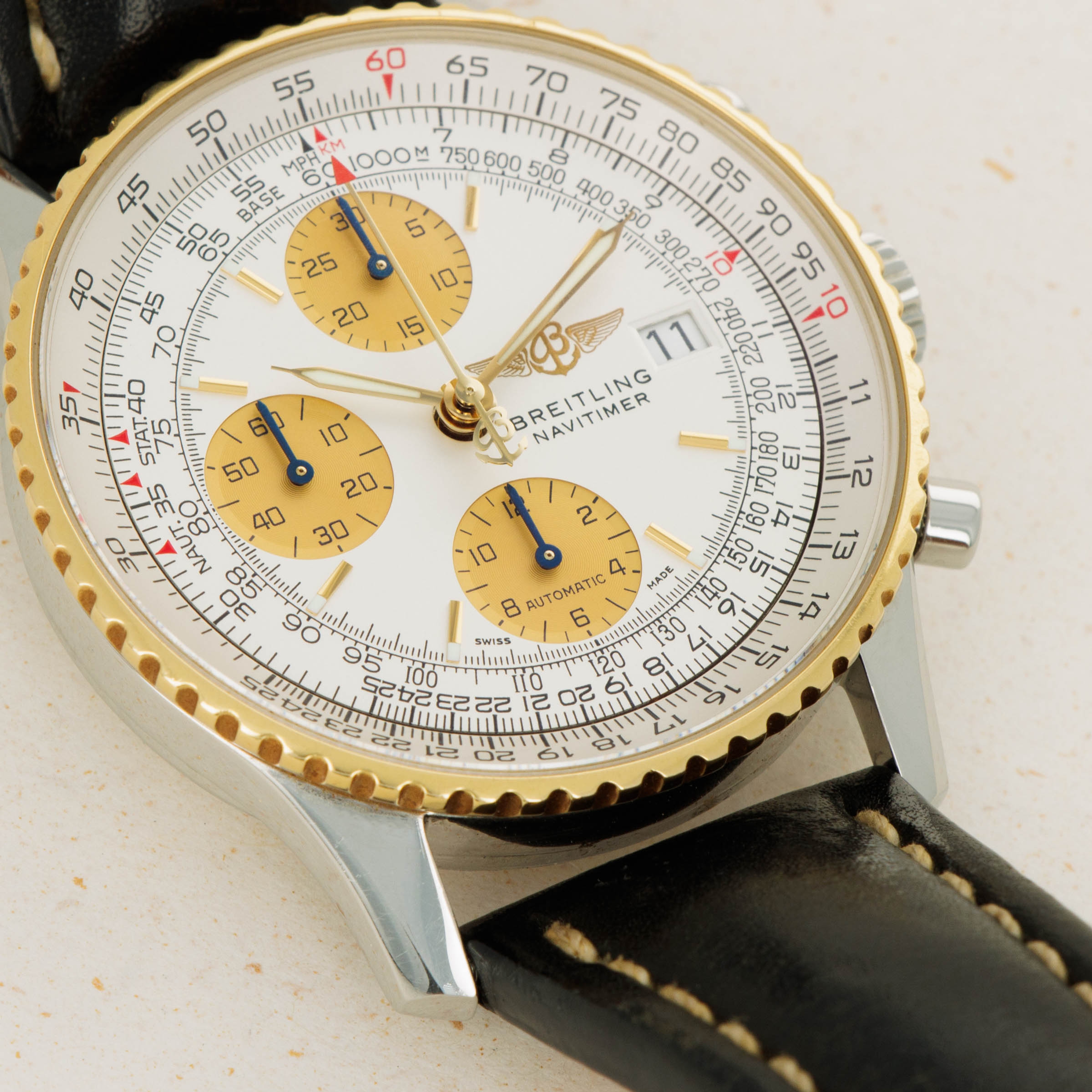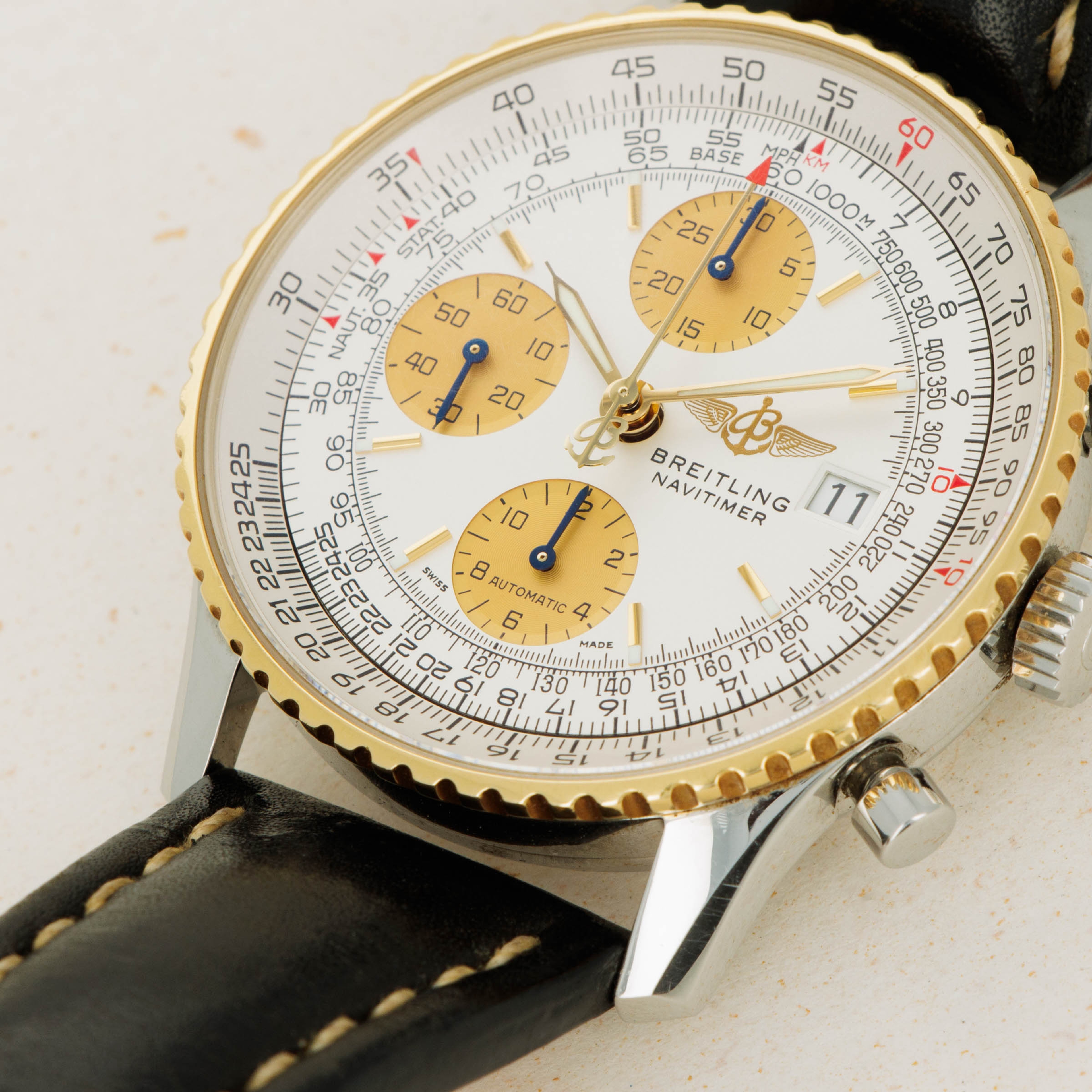 Boasting a gorgeous silver dial with gold hands and subdials, the Navitimer ref. D13022 features an information-dense display that injects some luxury into the Navitimer's tool watch design brief.