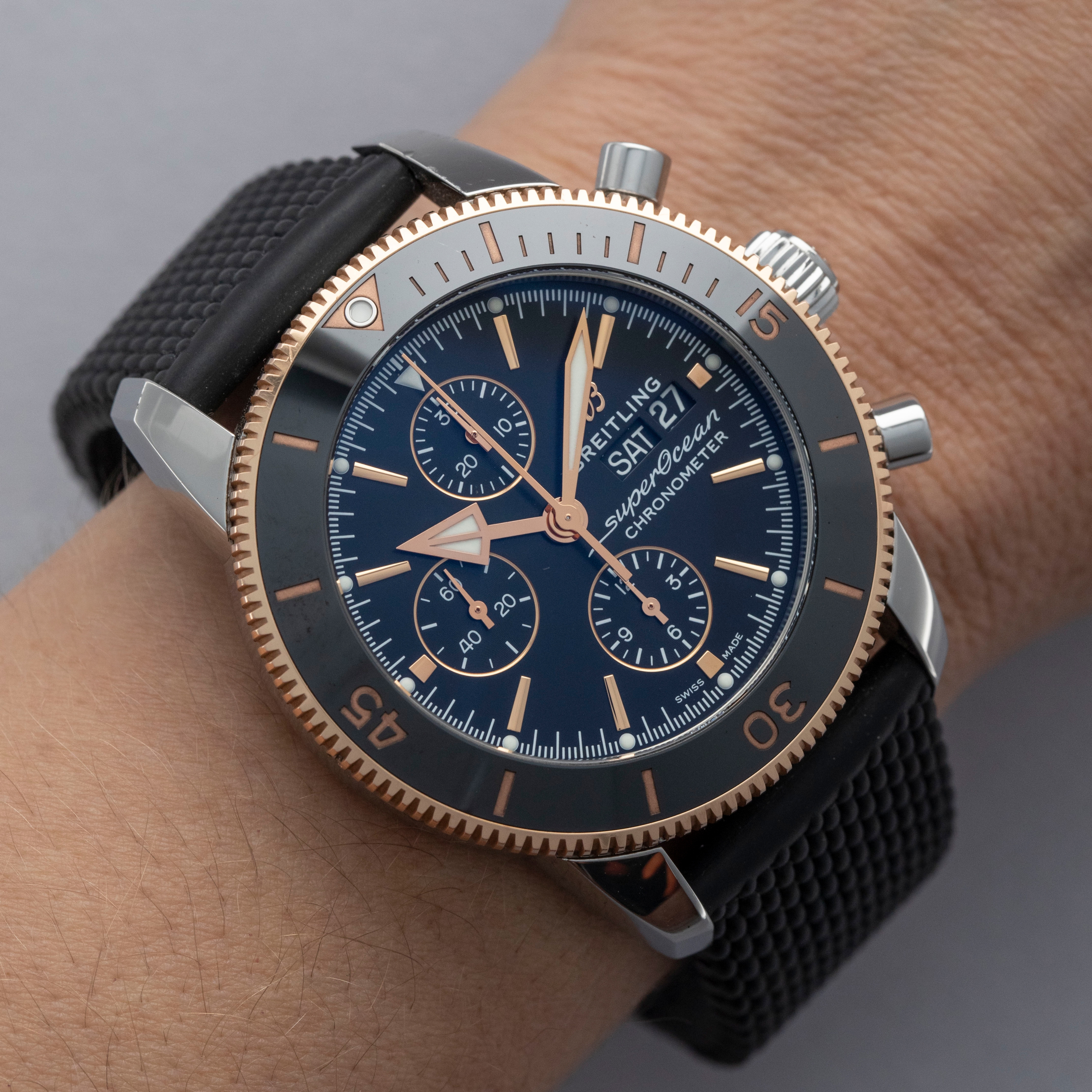 Large on the wrist like most Breitling models, the Superocean Heritage Chronograph features a commanding wrist presence that is aided by its polished stainless steel case and rose gold accents, such as its bezel and dial furniture.