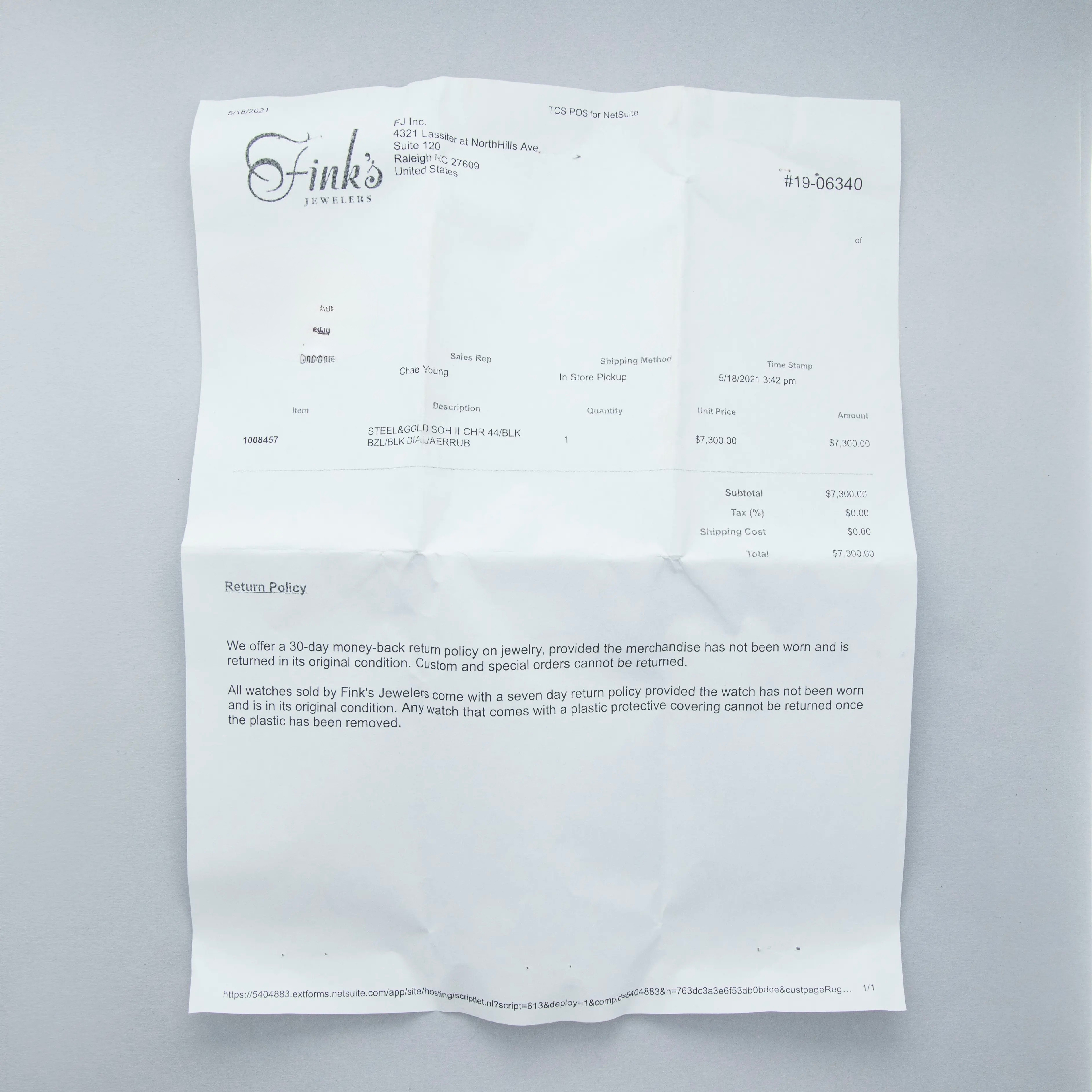 Watch is in overall very good condition. The steel case shows surface scratches, with more noticeable nicks to the upper right lug and the case sides. The case back retains well-defined engravings. The bezel and insert remain excellent, while the dial and hands are near mint. It is fitted with a black rubber strap and a steel deployant clasp showing surface scratches. Comes complete with watch roll, outer box, warranty, booklets, document holders, and original sales paperwork.