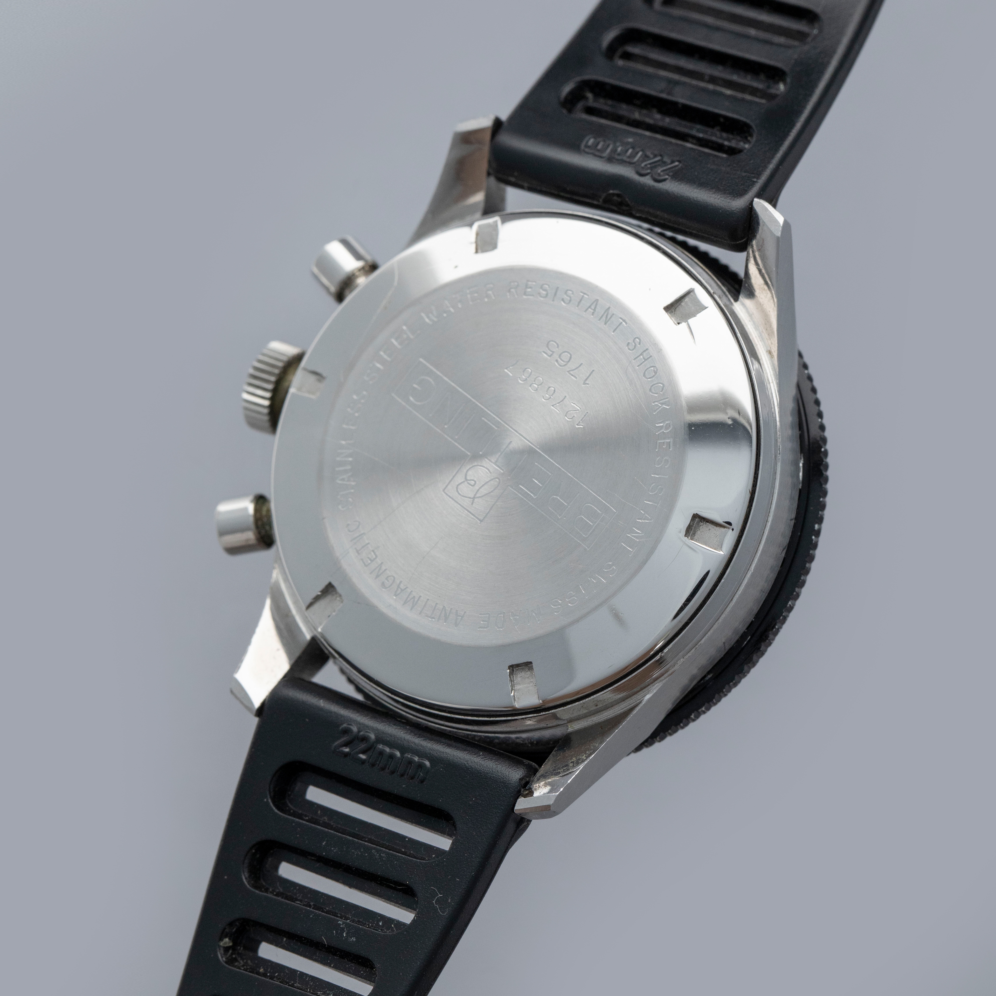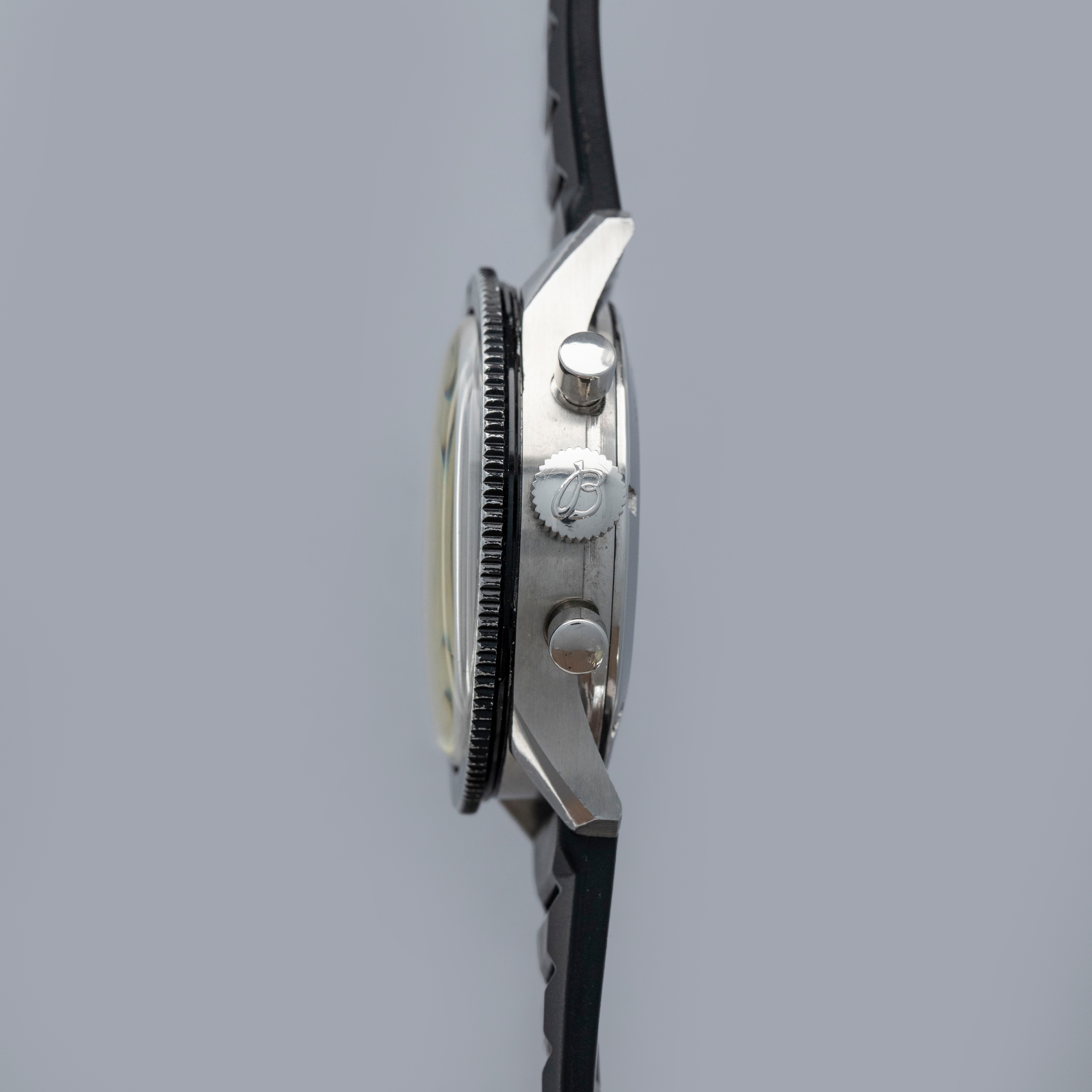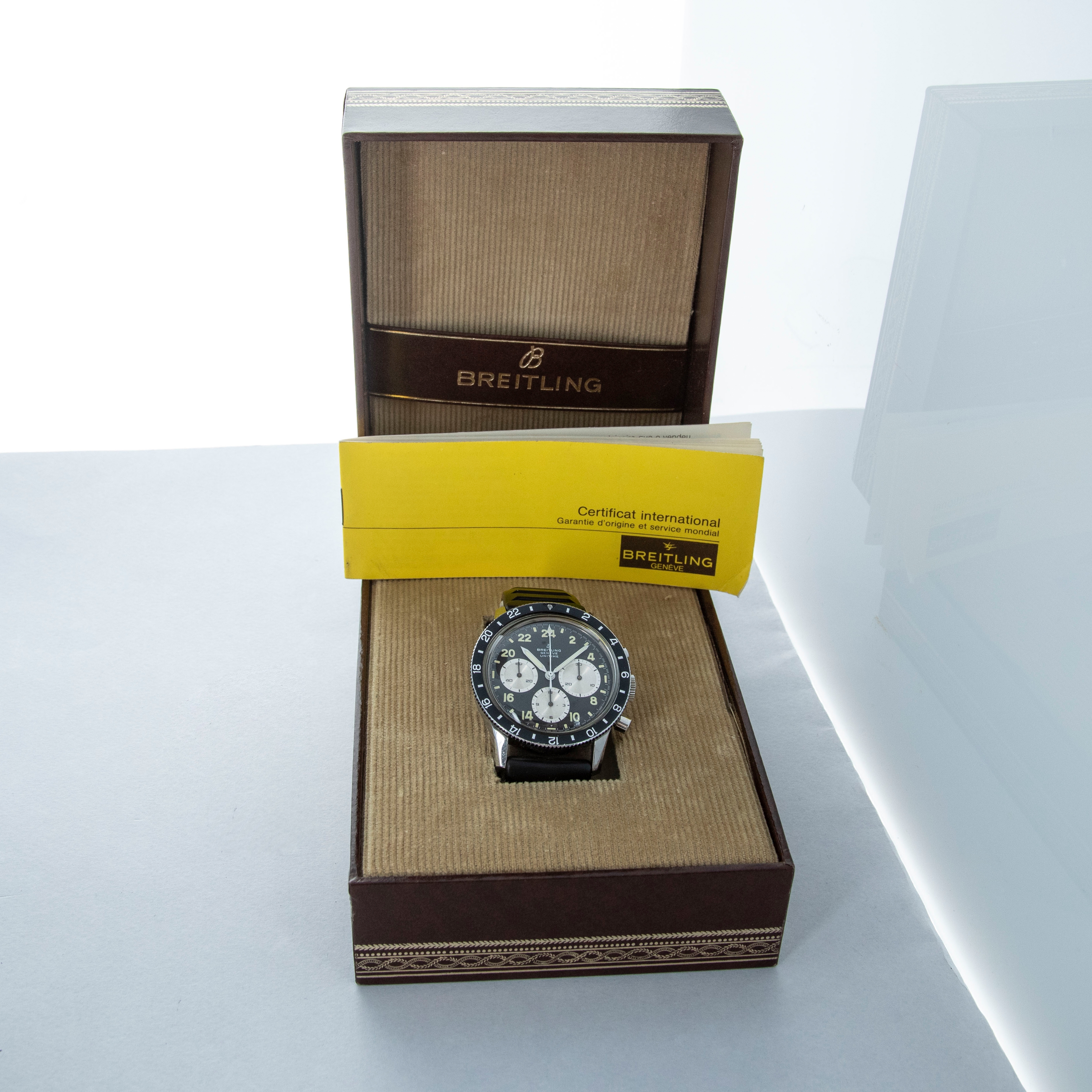 Watch is in overall excellent condition. The steel case has some light scratches and marks, including on the case back. The Breitling winged crown remains well defined and the pushers show light wear. The bezel is well defined, though some of the black coating has worn away; the insert itself is very clean. The dial is excellent, with only light surface marks visible on the sub-dials, and the white hands are very clean. It is fitted with a black rubber strap and steel pin buckle, both in excellent condition. Comes with box and open certificate booklet.