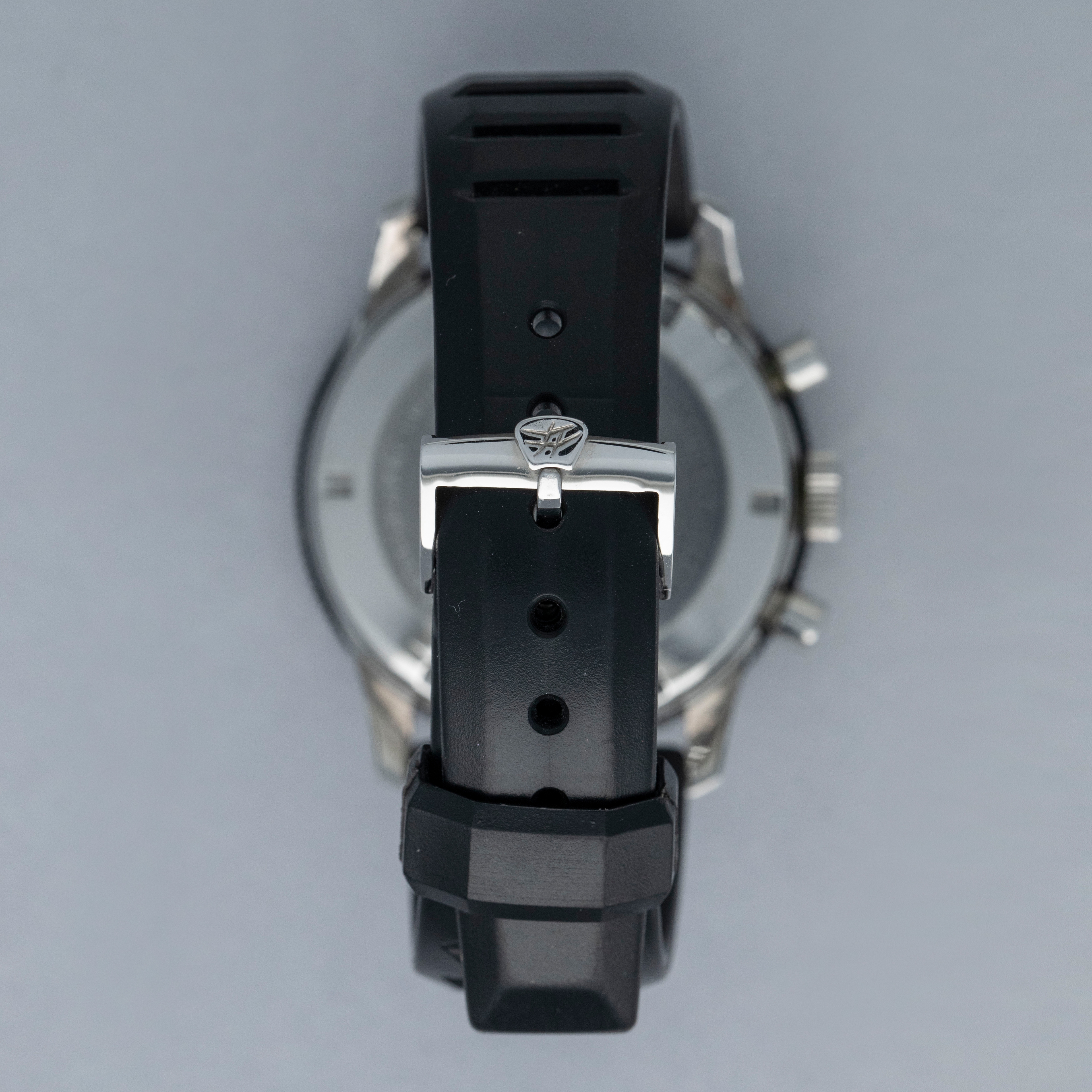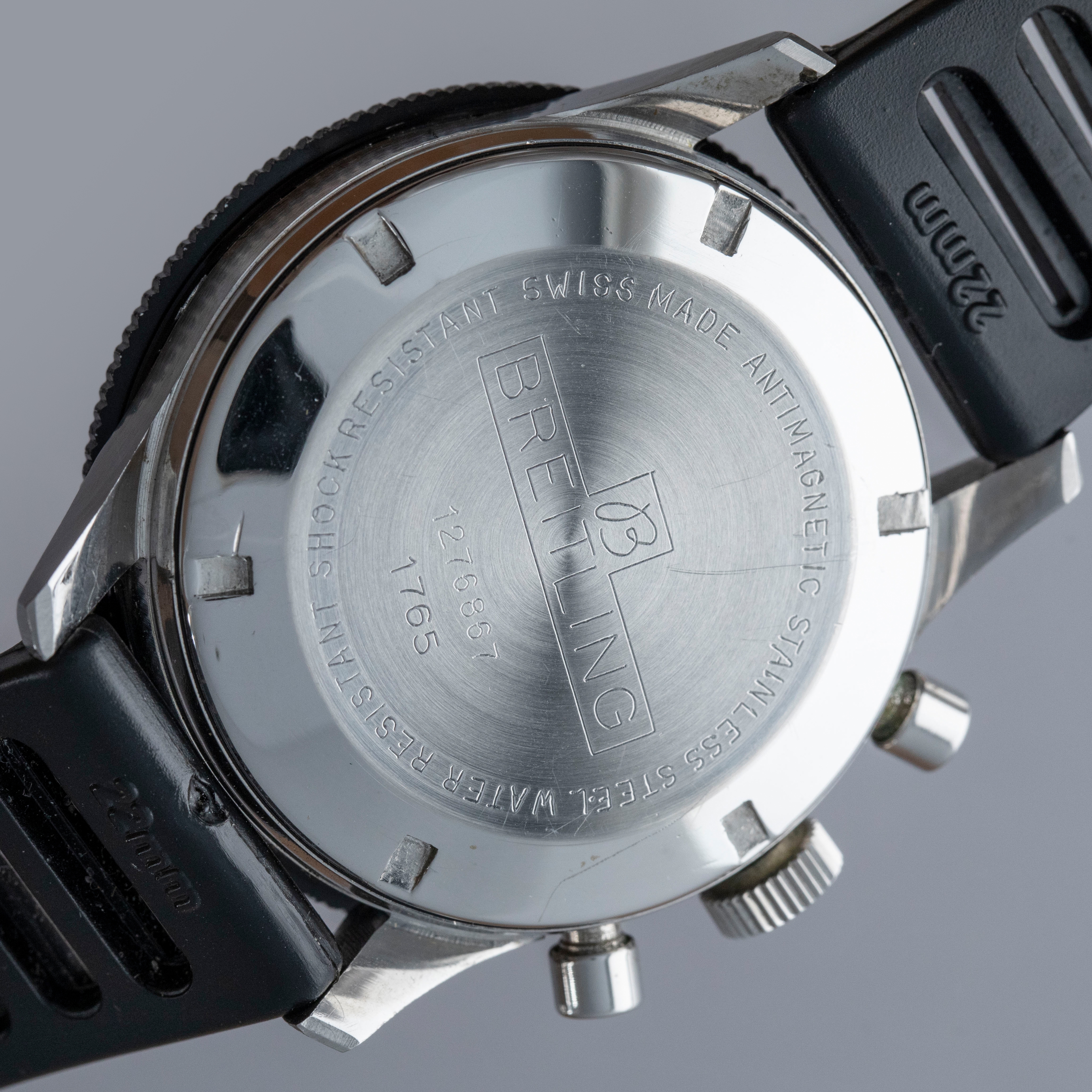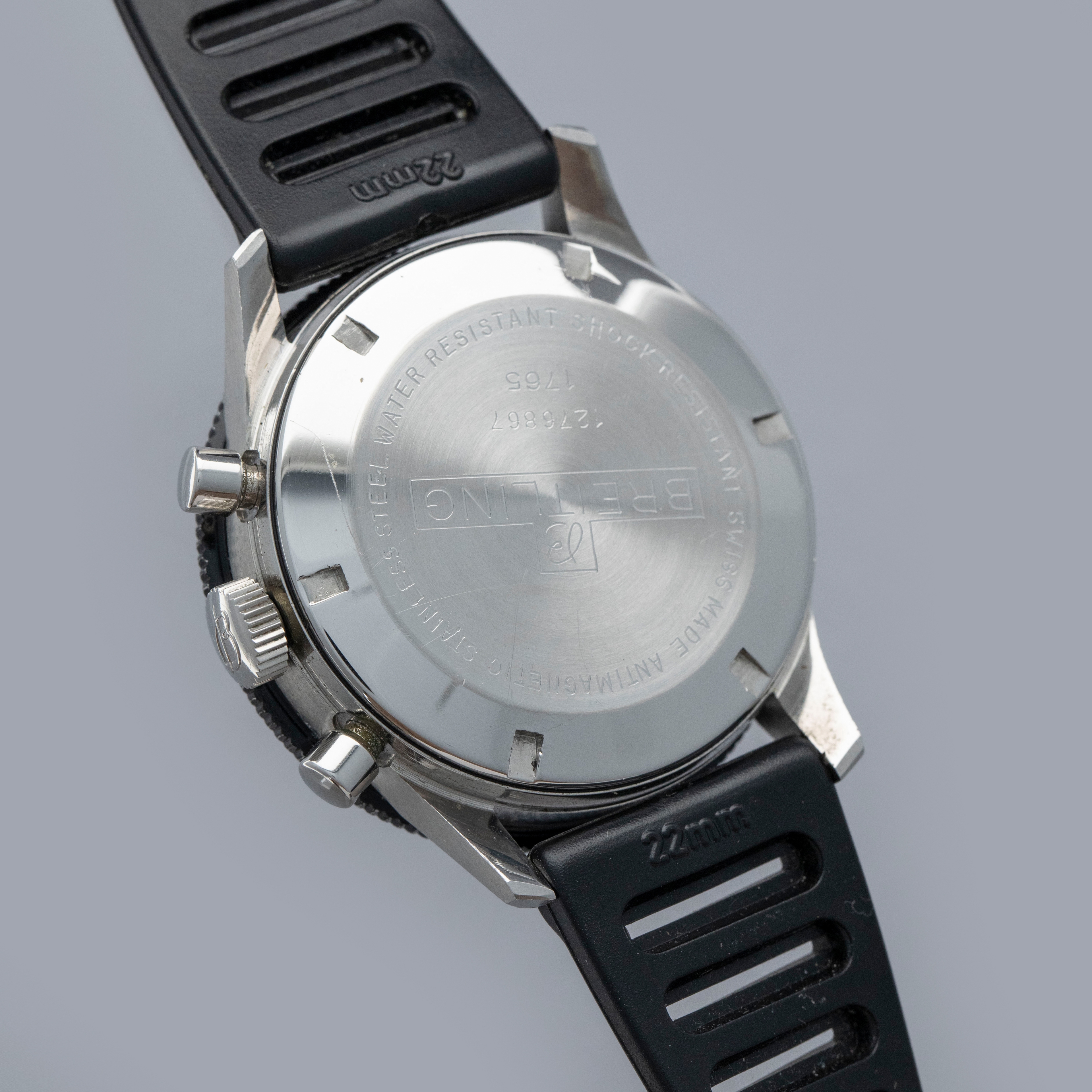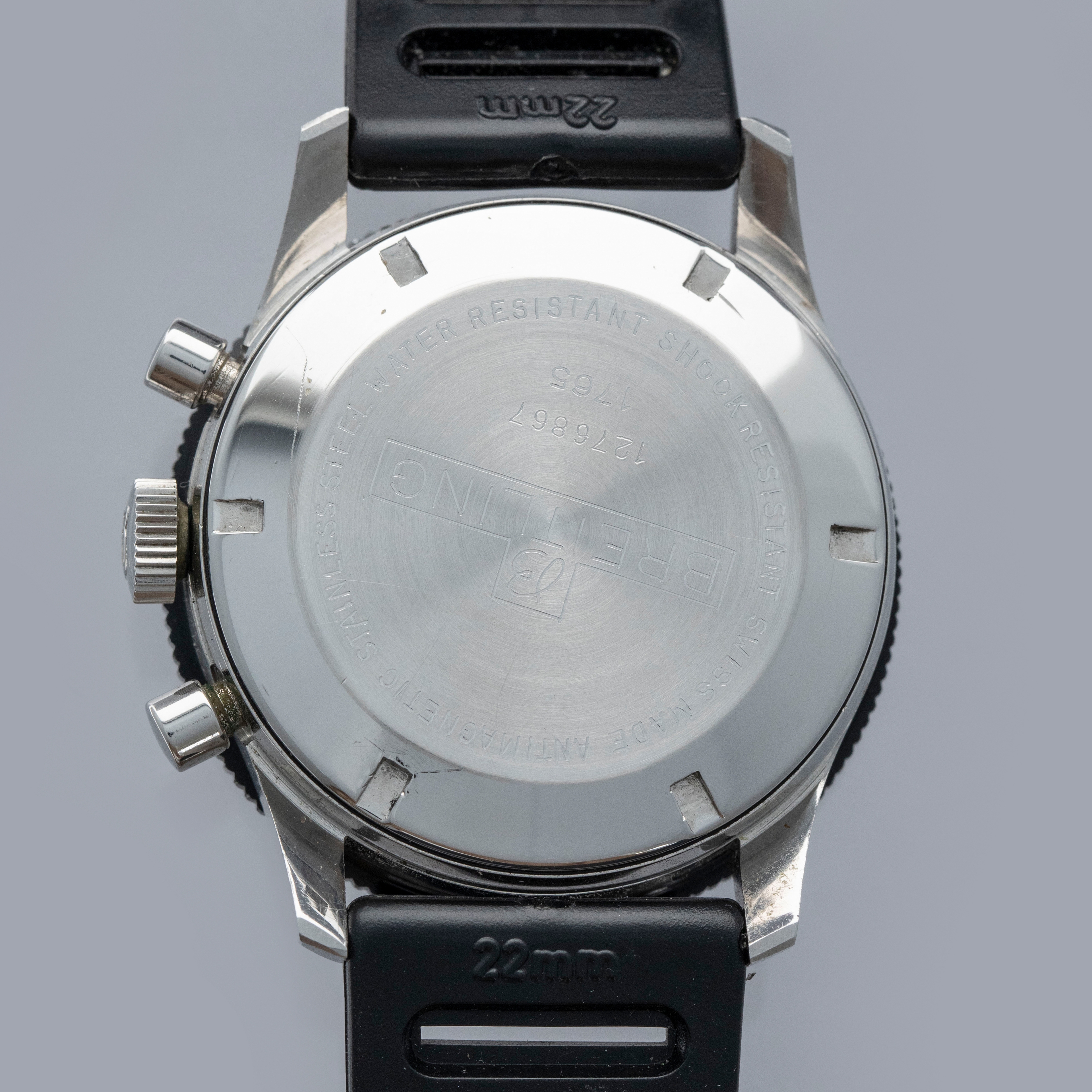 Watch is in overall excellent condition. The steel case has some light scratches and marks, including on the case back. The Breitling winged crown remains well defined and the pushers show light wear. The bezel is well defined, though some of the black coating has worn away; the insert itself is very clean. The dial is excellent, with only light surface marks visible on the sub-dials, and the white hands are very clean. It is fitted with a black rubber strap and steel pin buckle, both in excellent condition. Comes with box and open certificate booklet.