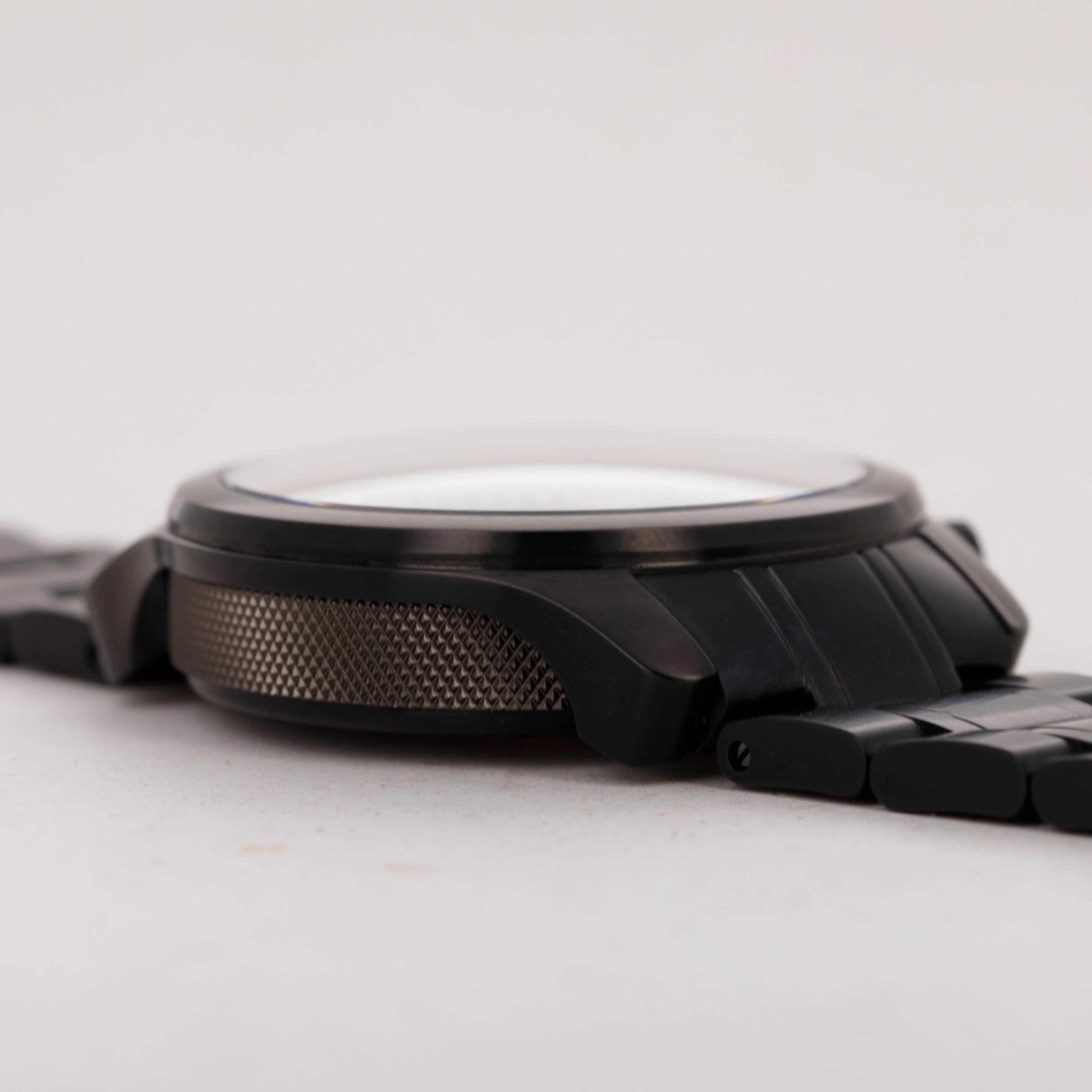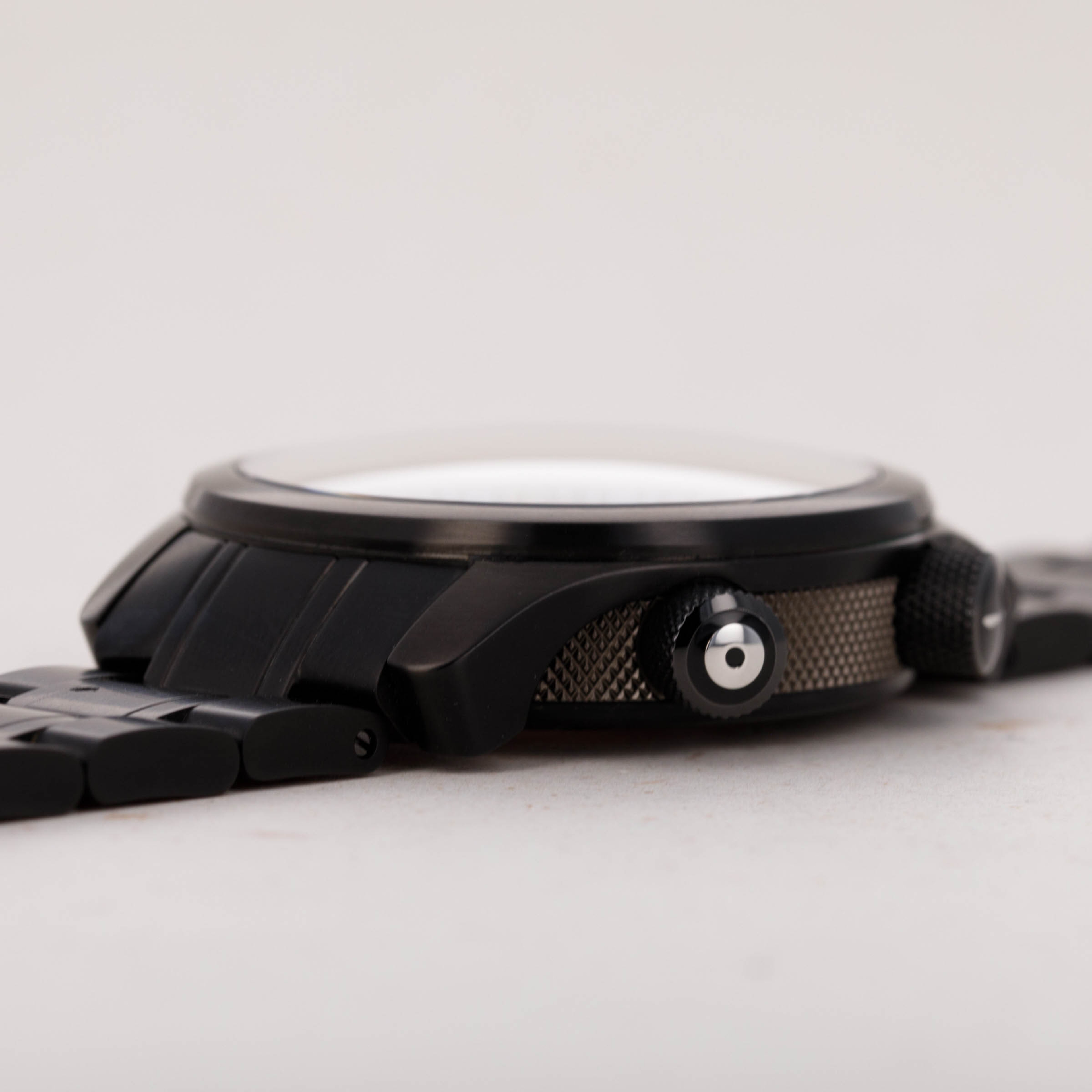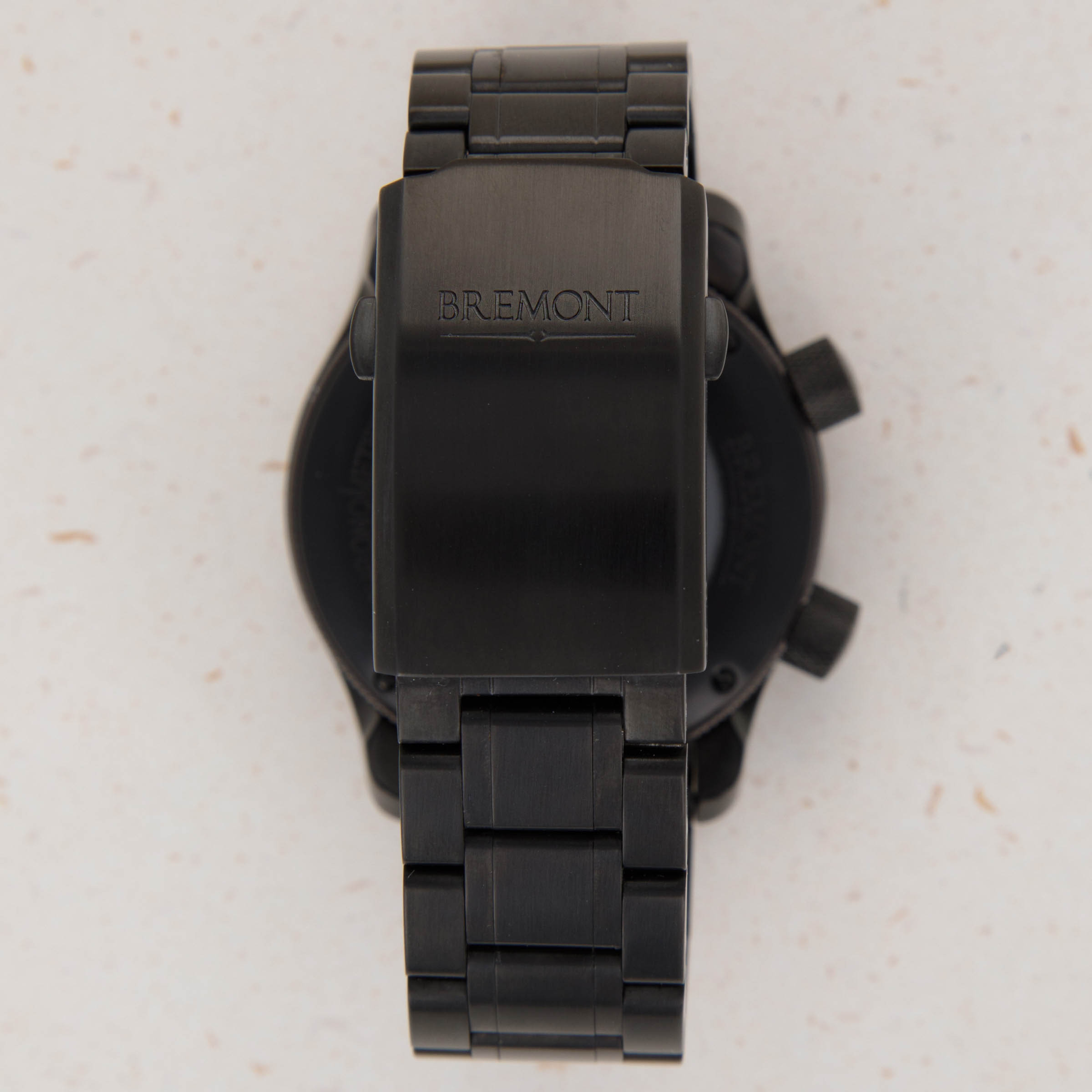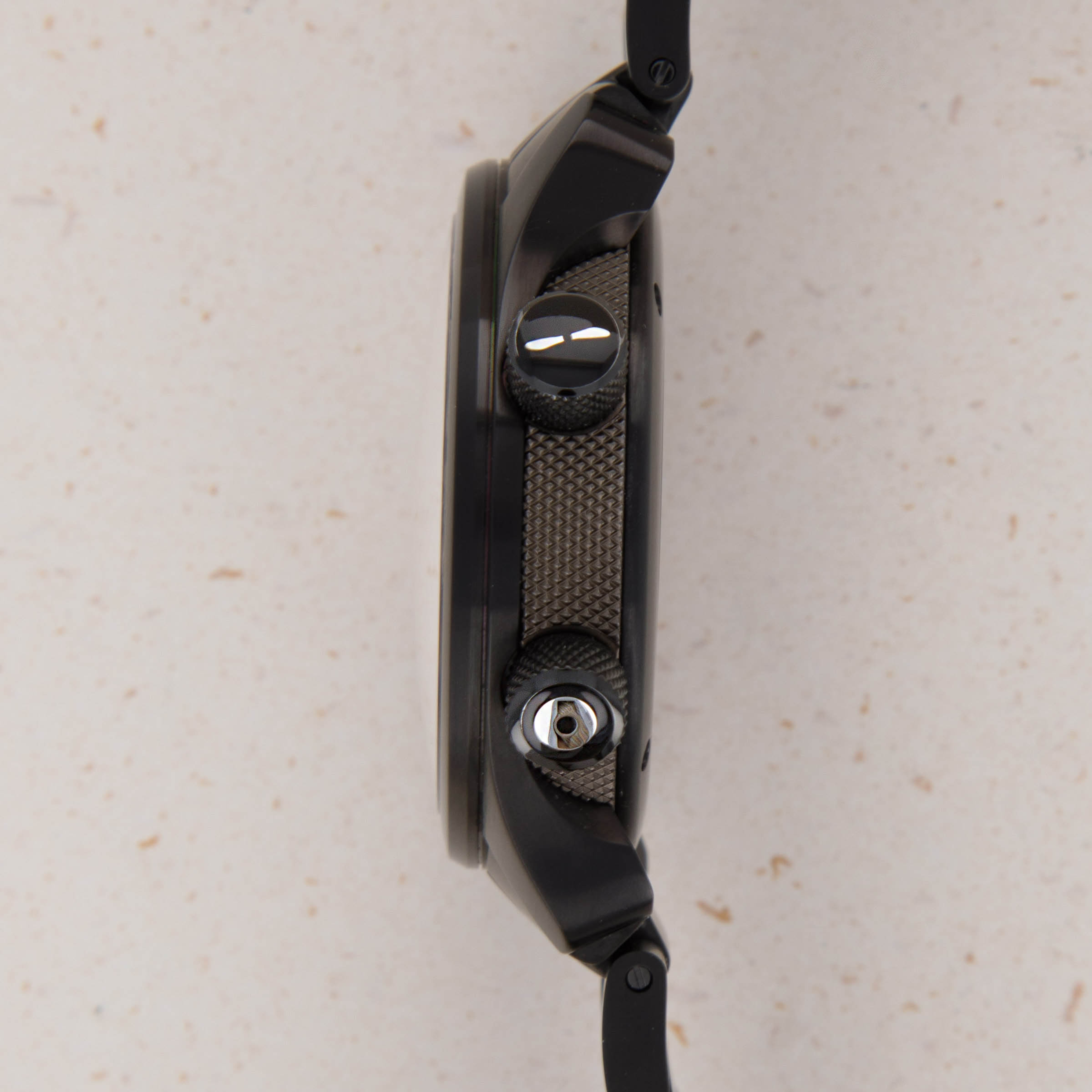 Watch is in excellent overall condition. There is minor wear visible on the DLC finish of the pushers, as well as on the backside of the bracelet center link where it attaches to the 6 o'clock case side. The bracelet was previously sized and the removed link is included with the watch.