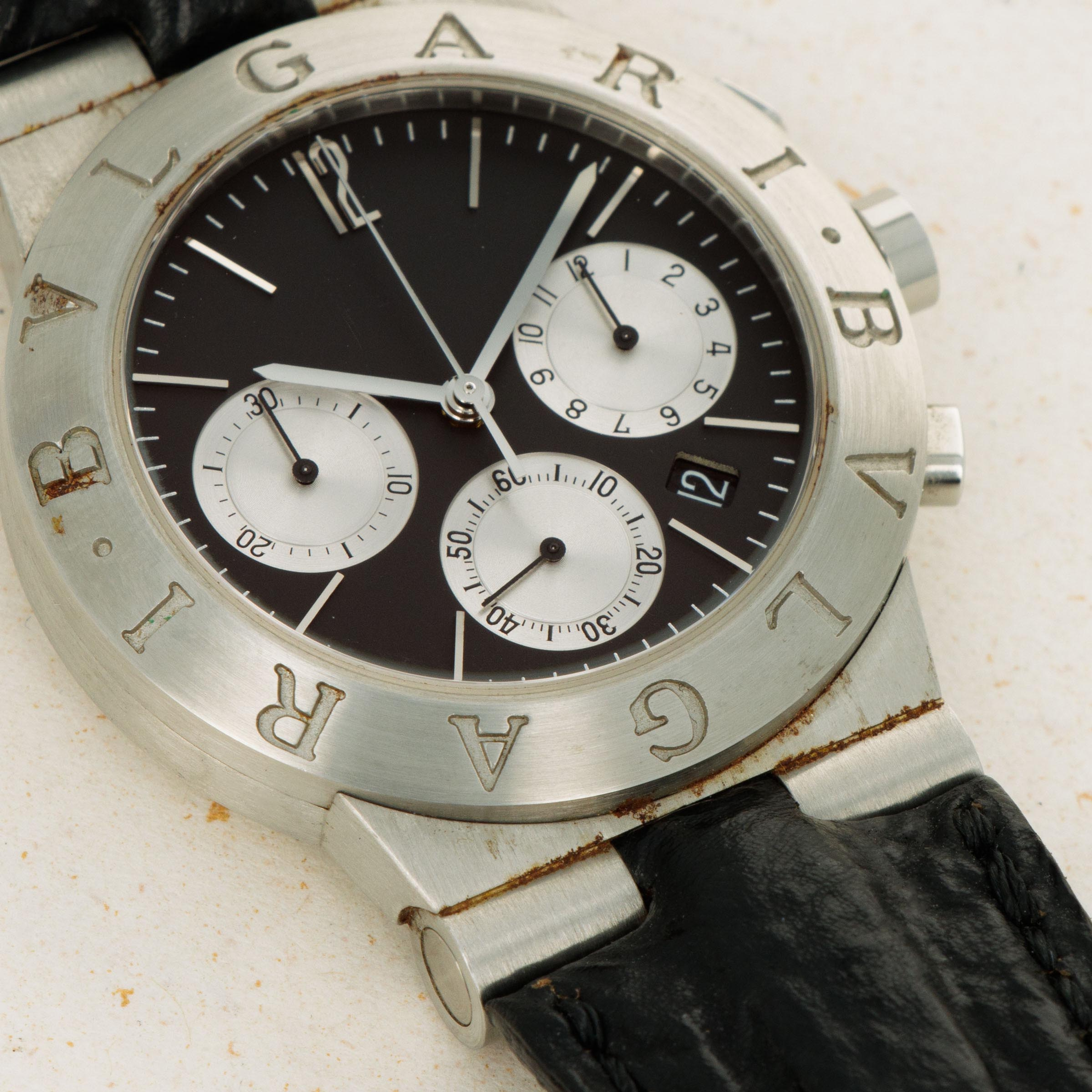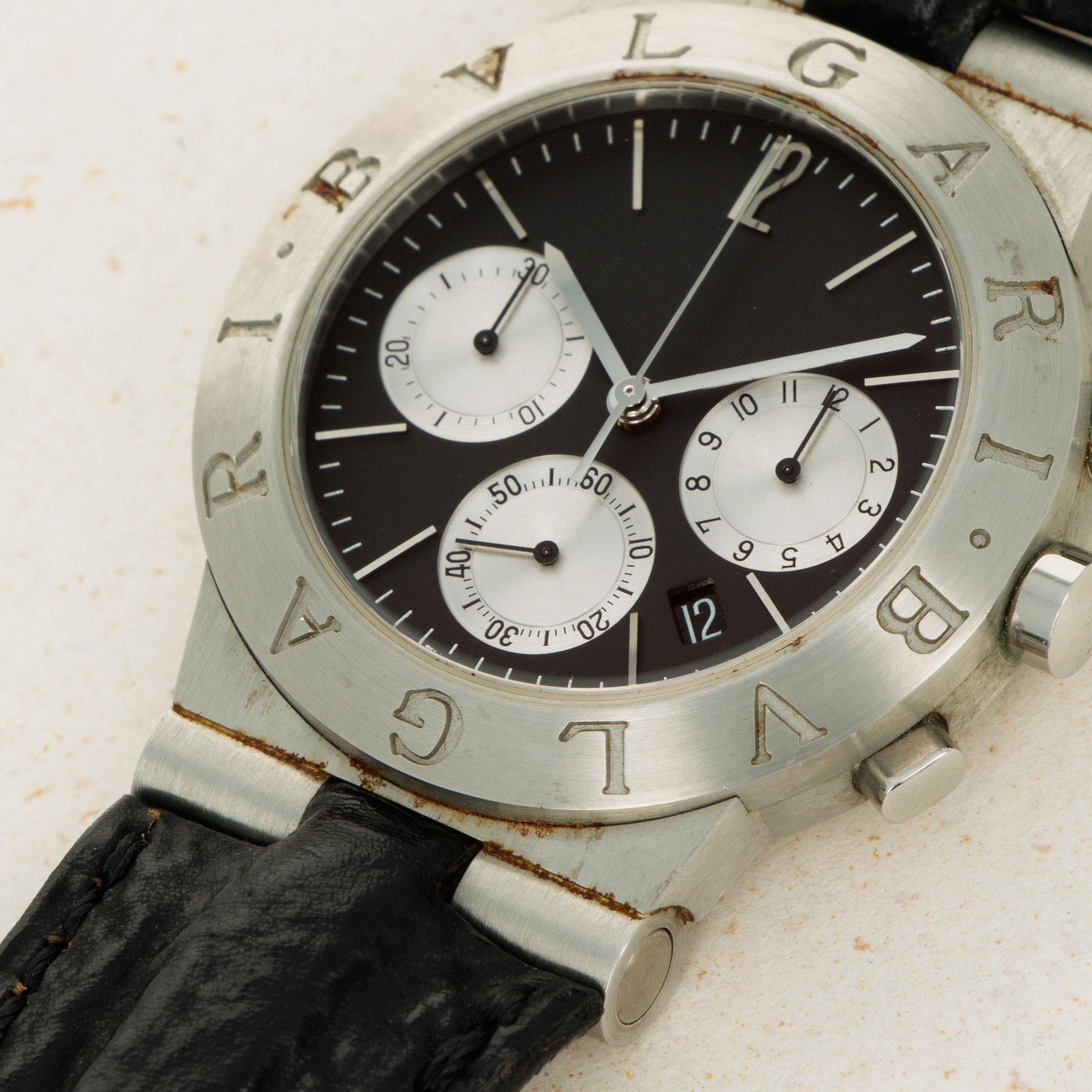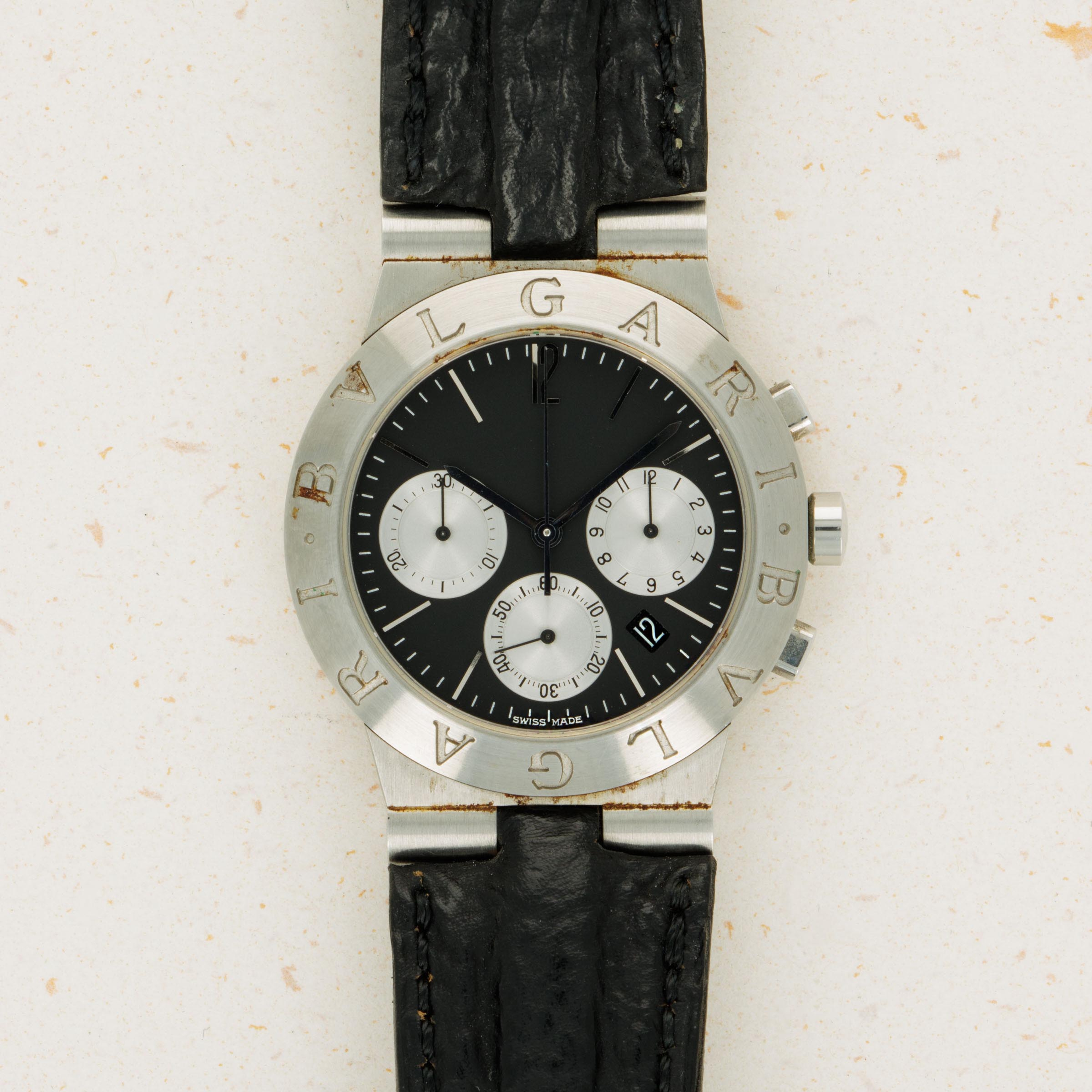 A timepiece that seamlessly blends history with contemporary design, the Bulgari Diagono embodies the essence of luxury and precision. First introduced in 1988, the Diagono marked Bulgari's first step into the world of high-end sports watches. Its name, "Diagono," pays homage to the ancient Greek word "agon," which signifies competition and performance, a testament to its sporting heritage. A harmonious fusion of classic elegance and modern aesthetics, the Diagono speaks to Bulgari’s unique aesthetic with its signature architectural case design, characterized by its unique lug system and circular bezel that features Bulgari’s name engraved deep into its surface. Over the years, the Bulgari Diagono has evolved, incorporating cutting-edge technology and innovative complications, but the example we have here is a bit more reserved, with a quartz movement and a simple black dial that lacks any script whatsoever besides “SWISS MADE” at 6 o’clock. Featuring white chronograph subdials and a date aperture, the Diagono maintains complete legibility while also retaining its signature aesthetic and unique feel on the wrist.