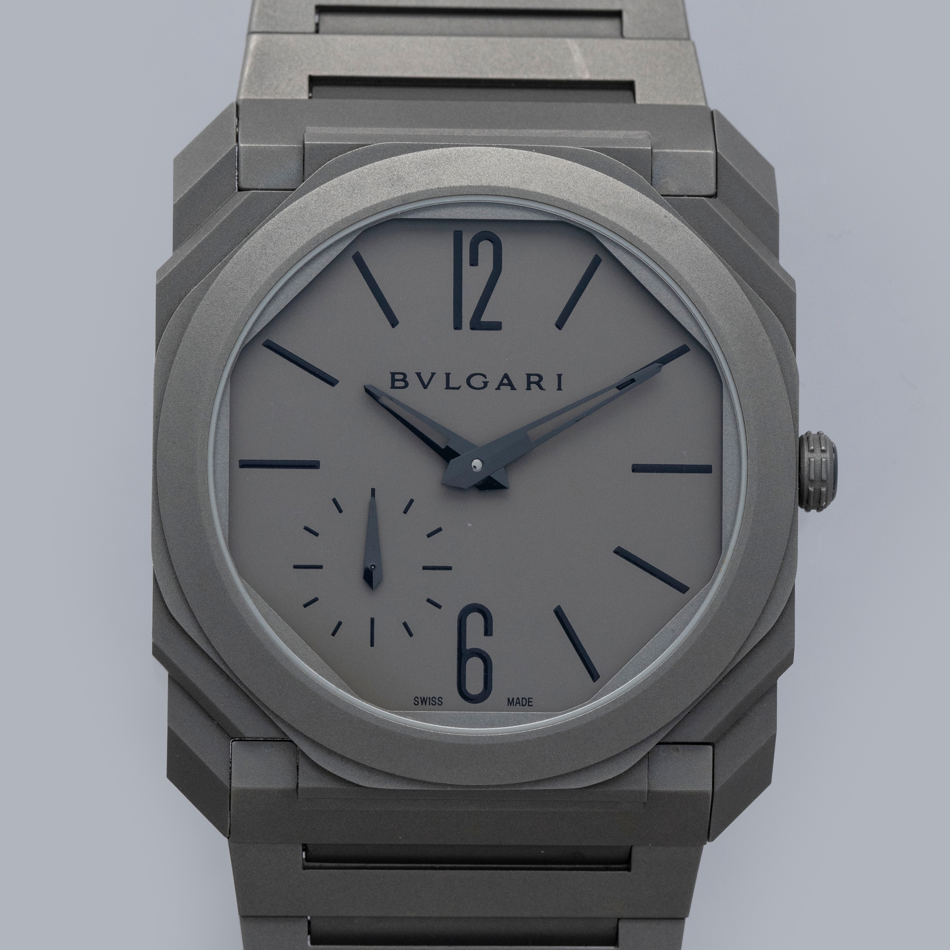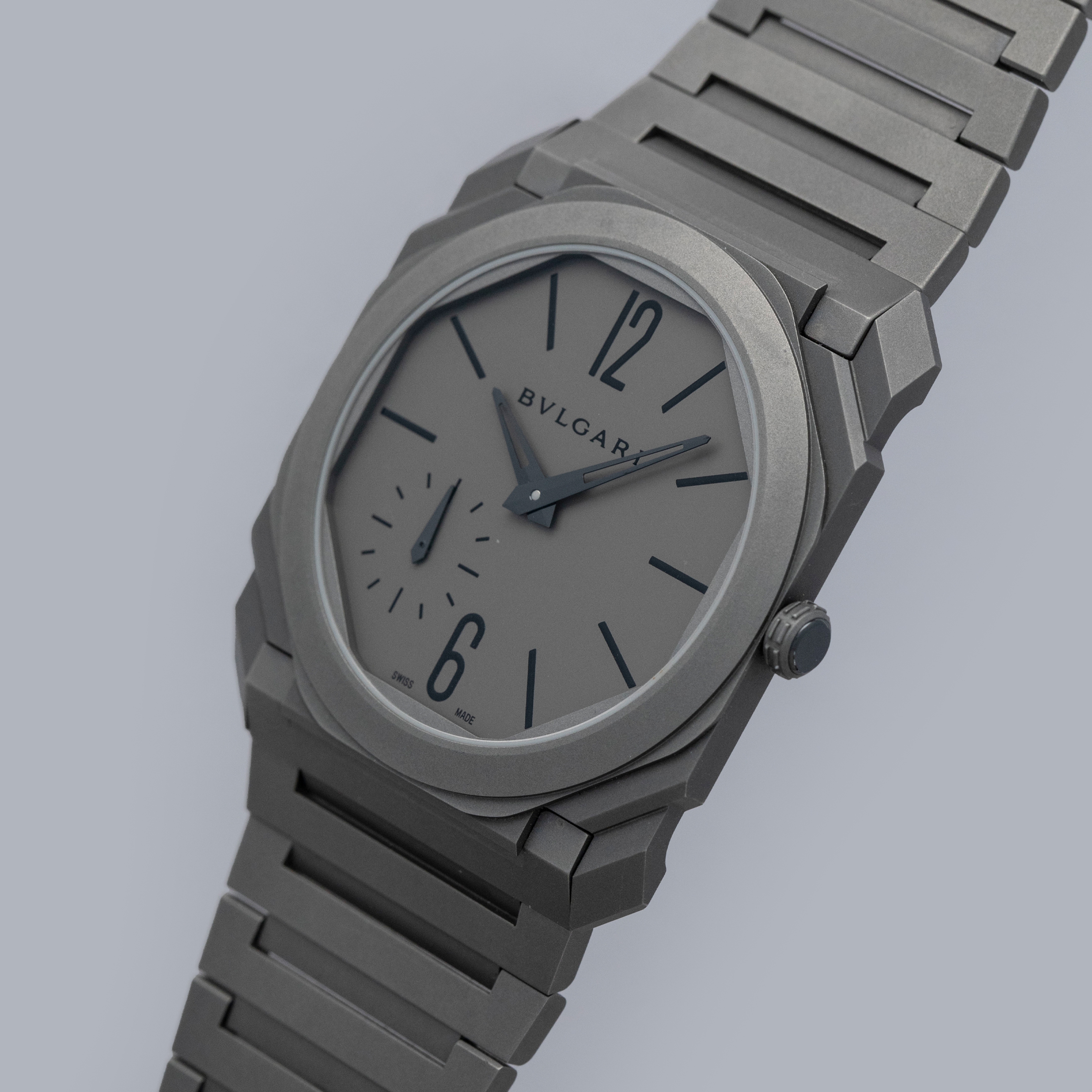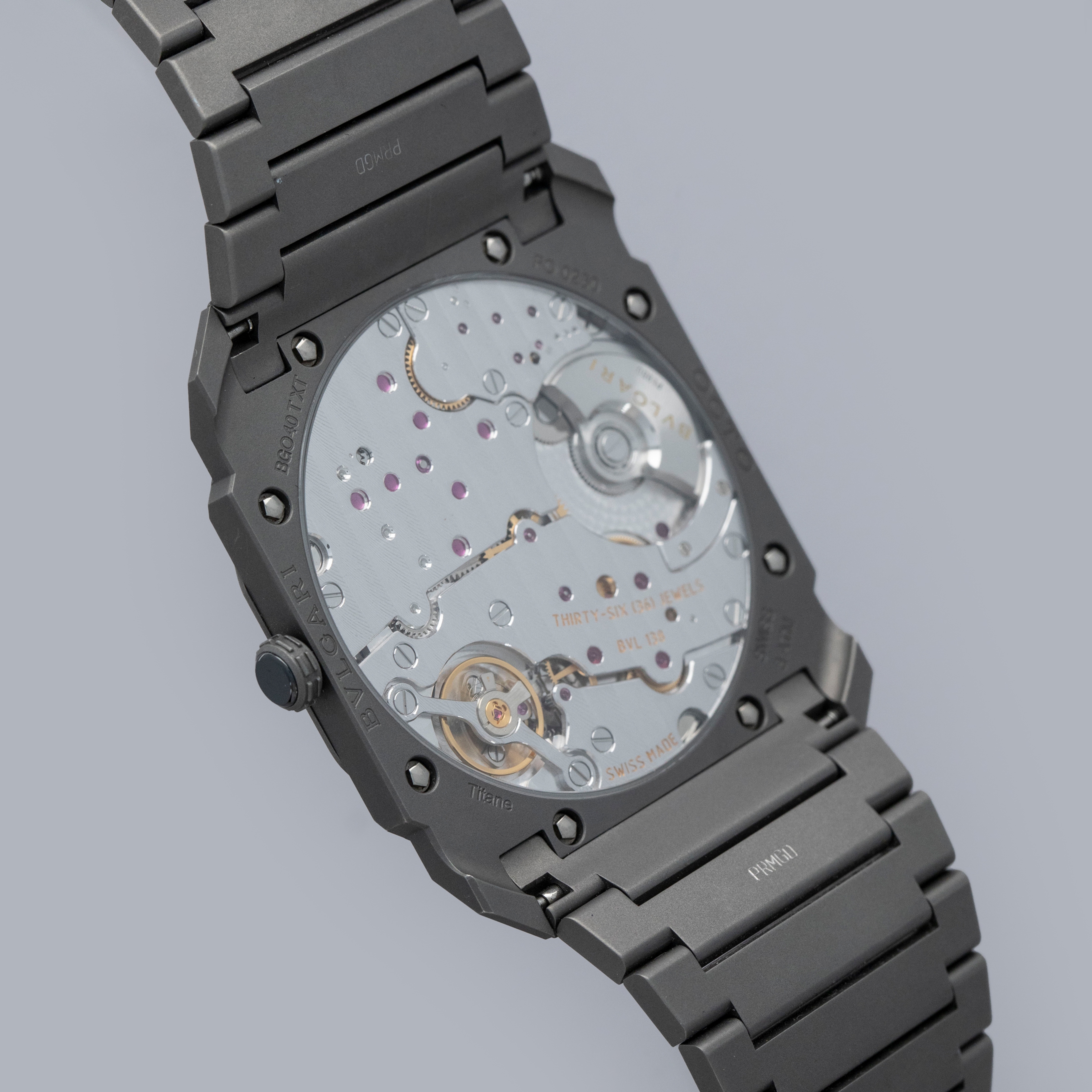 Originally released in 2014, the Bulgari Octo Finissimo burst onto the watchmaking scene as Bulgari's latest entrant into the world of angular integrated bracelet timepieces inspired by Gerald Genta's signature design language. Since then, the Octo Finissimo has been Bulgari's most often-used vehicle for horological innovation. A great display of that very horological prowess, the Octo Finissimo ref. 102713 that we have here blends a visually unique monochromatic design with an impressive titanium construction and a mesmerizingly thin BVL 138 movement that packs an impressive 60 hours of power reserve into a movement that is only 2.23mm tall. Released in 2017 as the thinnest automatic watch in the world at the time at only 5.15mm tall and boasting a stealthy grey dial to match its dark grey construction, the Octo Finissimo wears almost invisibly on the wrist, with its case and bracelet both being incredibly compact and light.