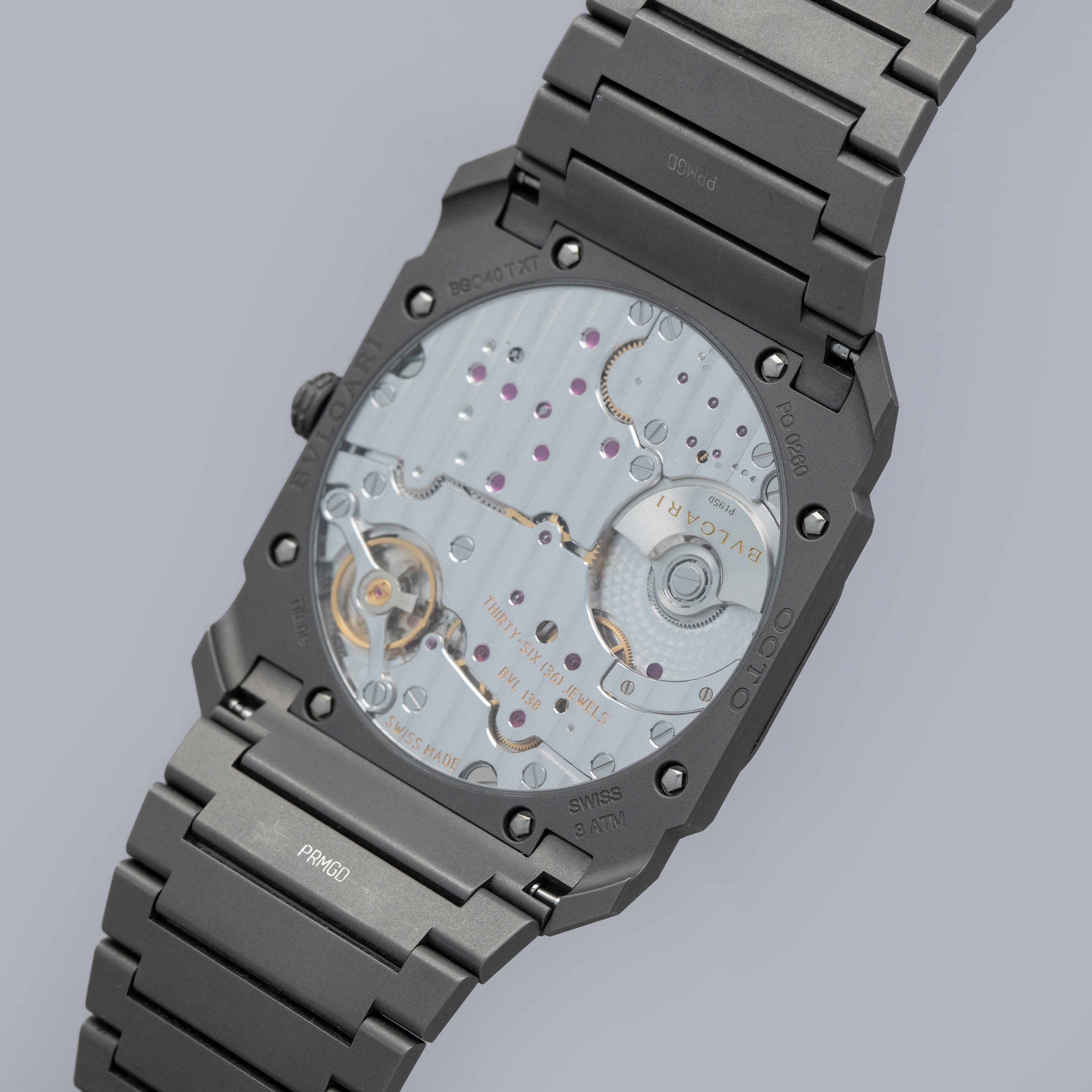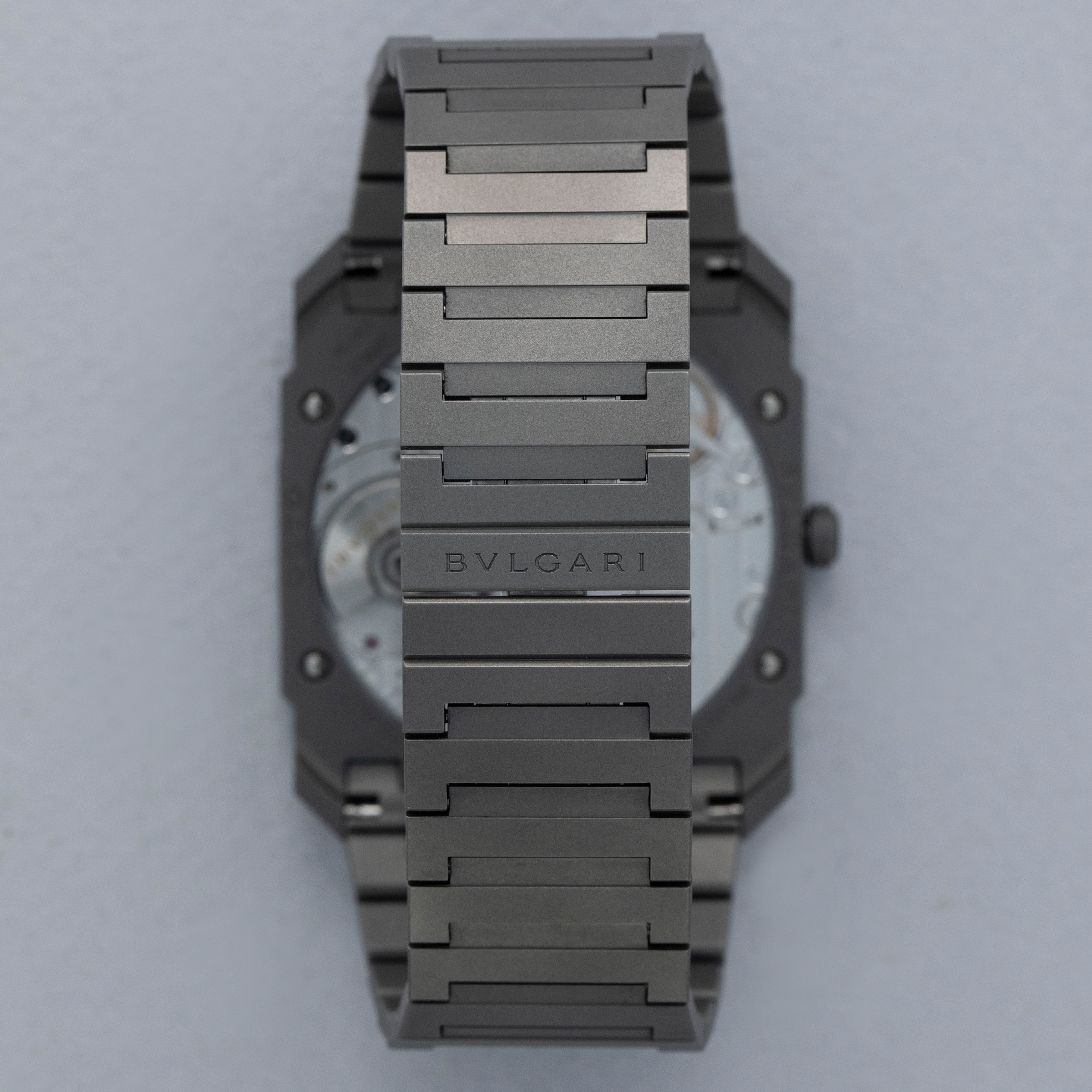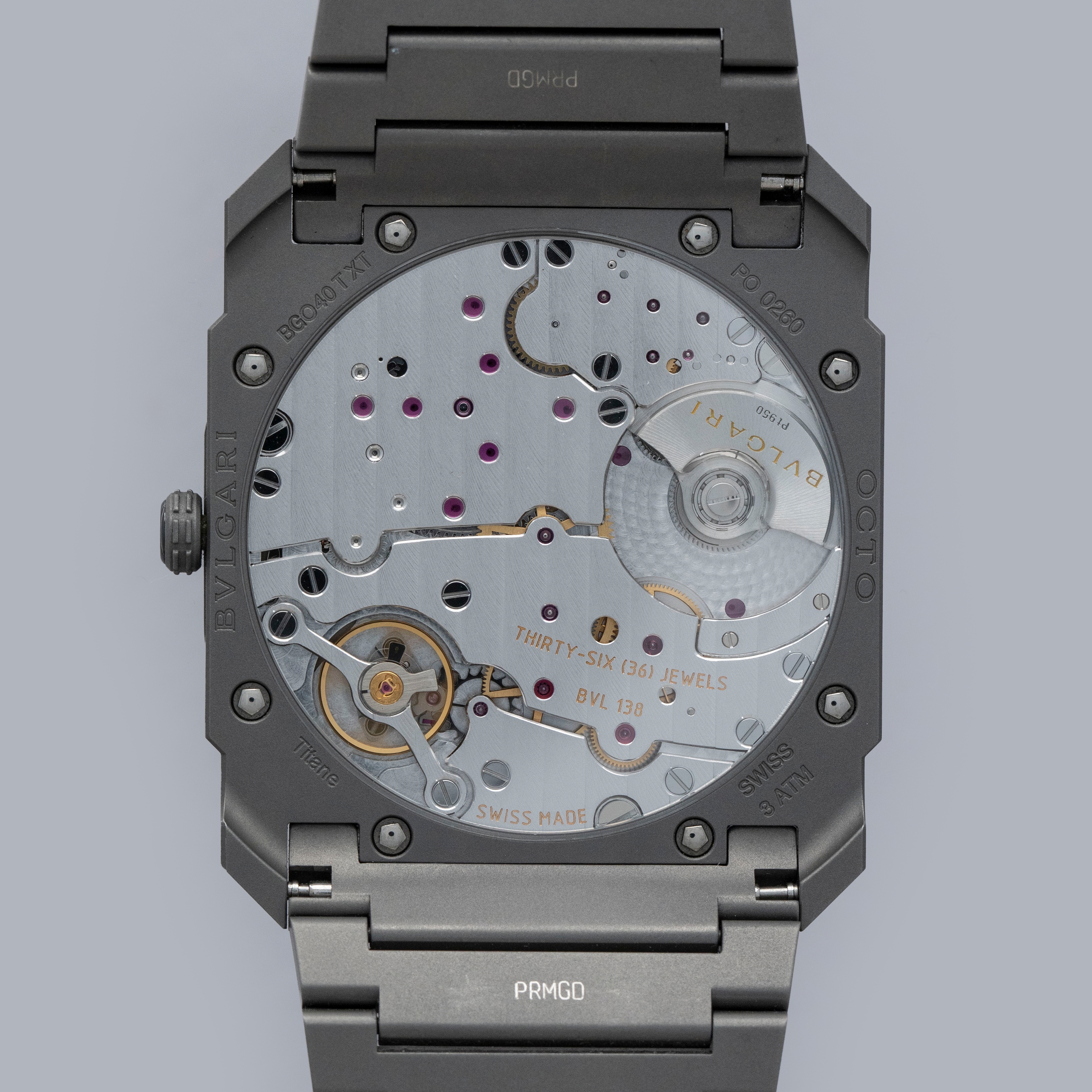 Originally released in 2014, the Bulgari Octo Finissimo burst onto the watchmaking scene as Bulgari's latest entrant into the world of angular integrated bracelet timepieces inspired by Gerald Genta's signature design language. Since then, the Octo Finissimo has been Bulgari's most often-used vehicle for horological innovation. A great display of that very horological prowess, the Octo Finissimo ref. 102713 that we have here blends a visually unique monochromatic design with an impressive titanium construction and a mesmerizingly thin BVL 138 movement that packs an impressive 60 hours of power reserve into a movement that is only 2.23mm tall. Released in 2017 as the thinnest automatic watch in the world at the time at only 5.15mm tall and boasting a stealthy grey dial to match its dark grey construction, the Octo Finissimo wears almost invisibly on the wrist, with its case and bracelet both being incredibly compact and light.
