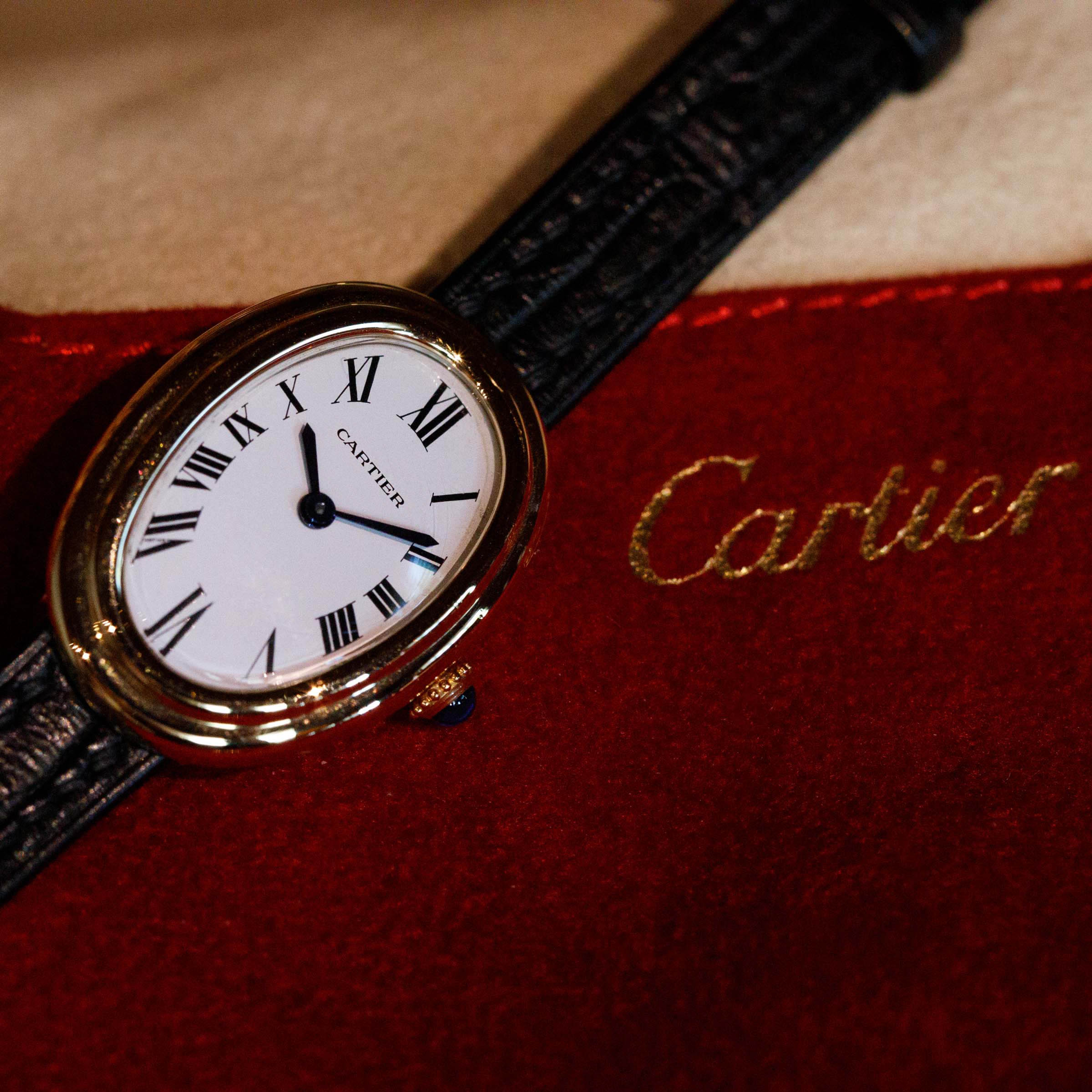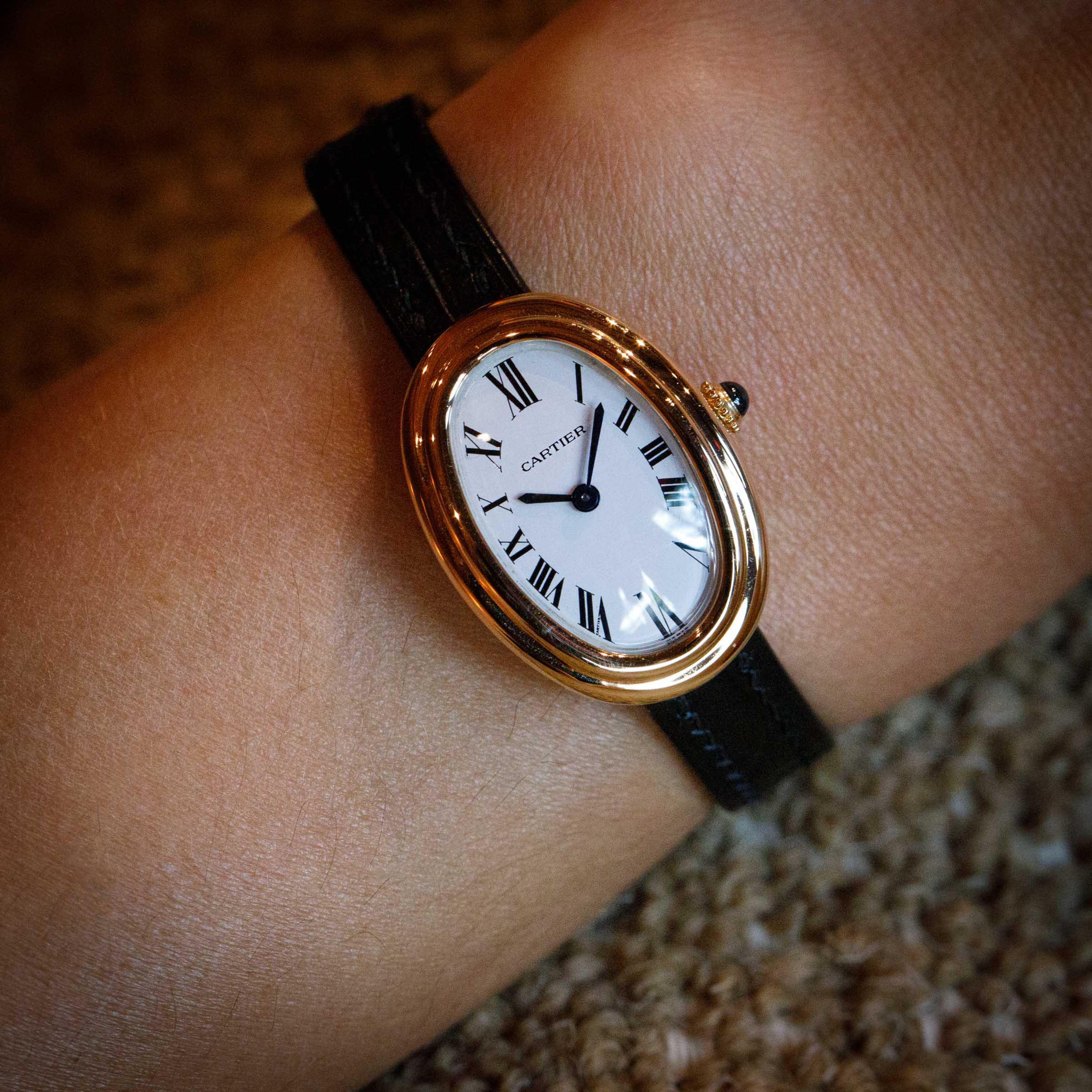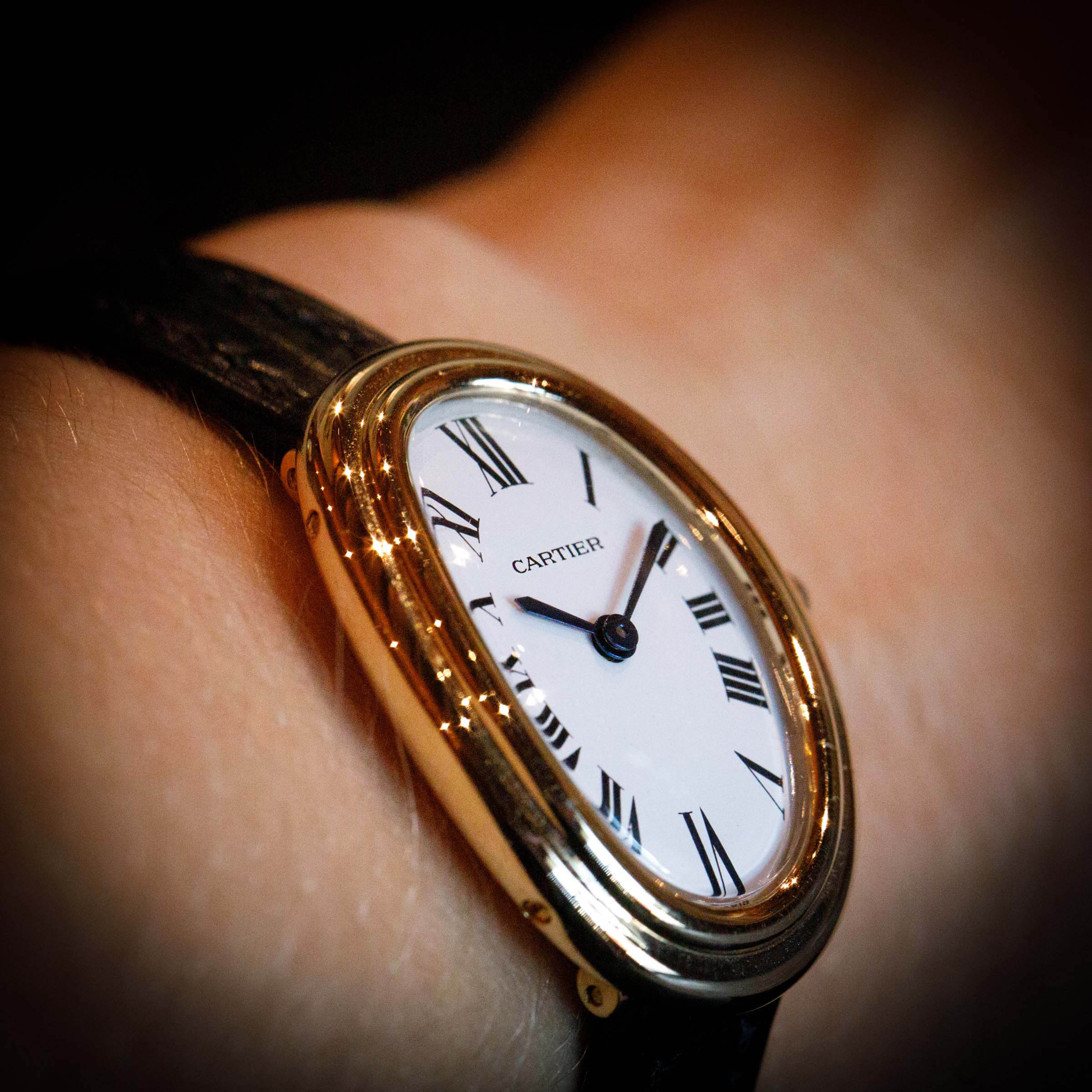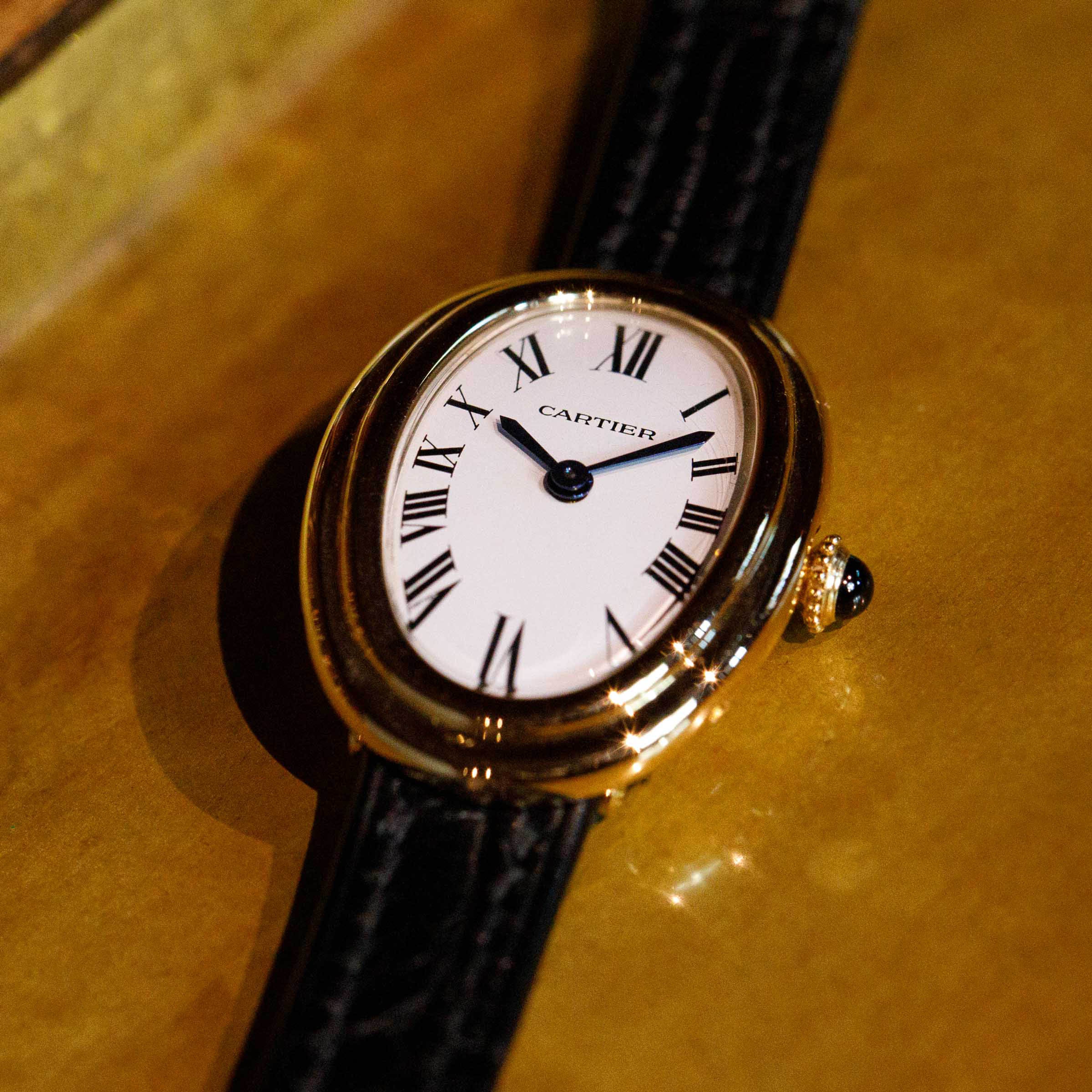 Famously named the Baignoire after its bathtub-like shape, the Baignoire's oval case bends ever so slightly, making it the perfect fit as it drapes across the wrist.