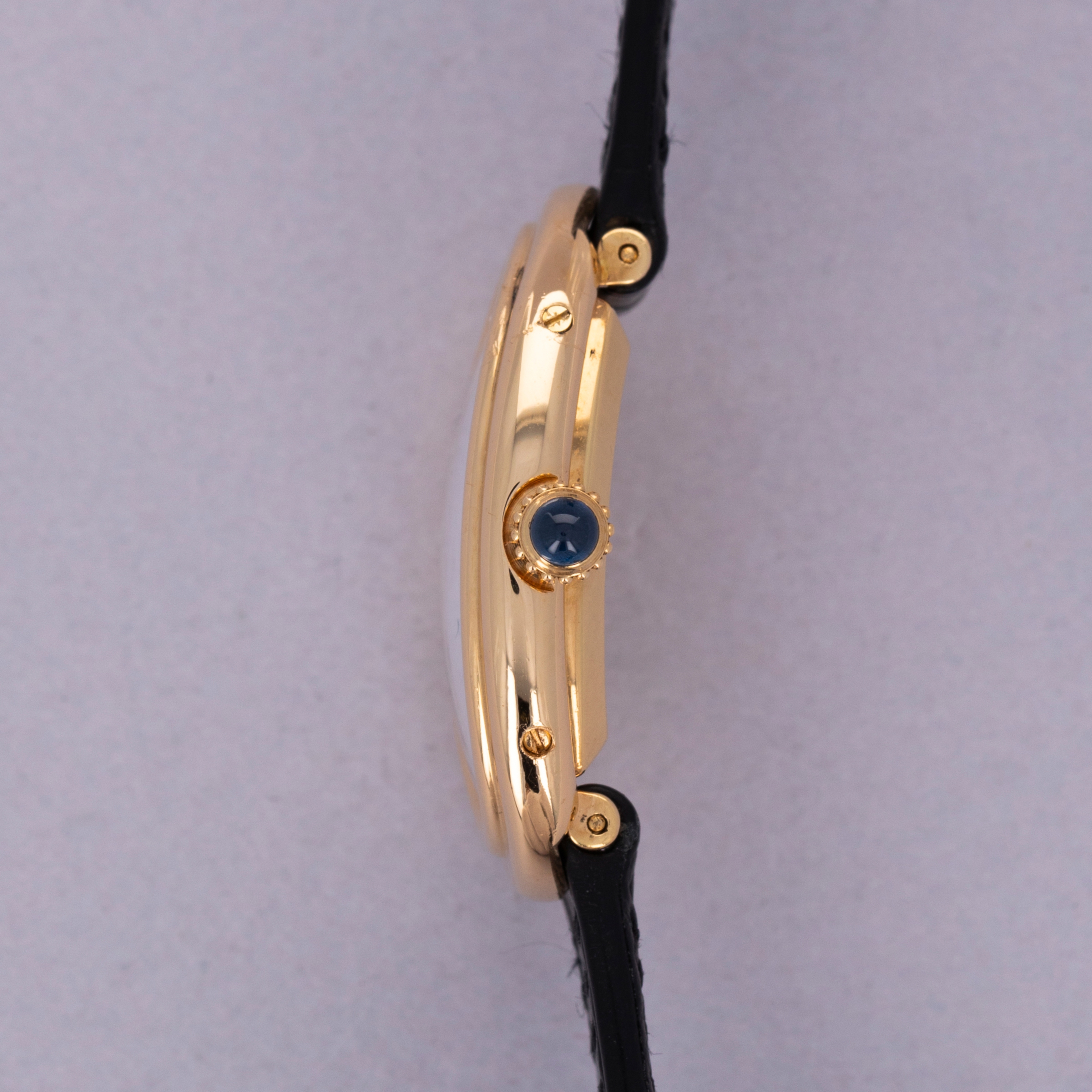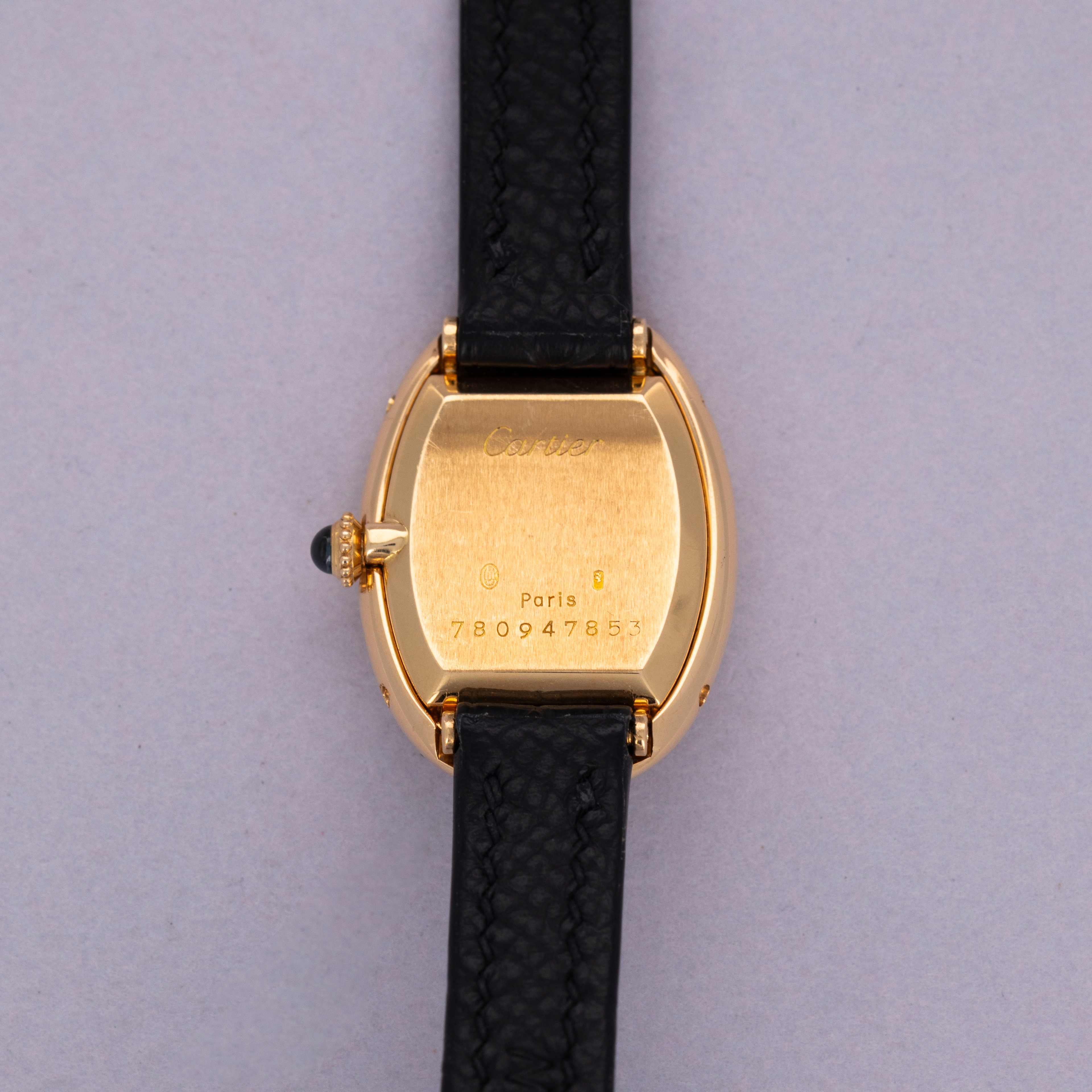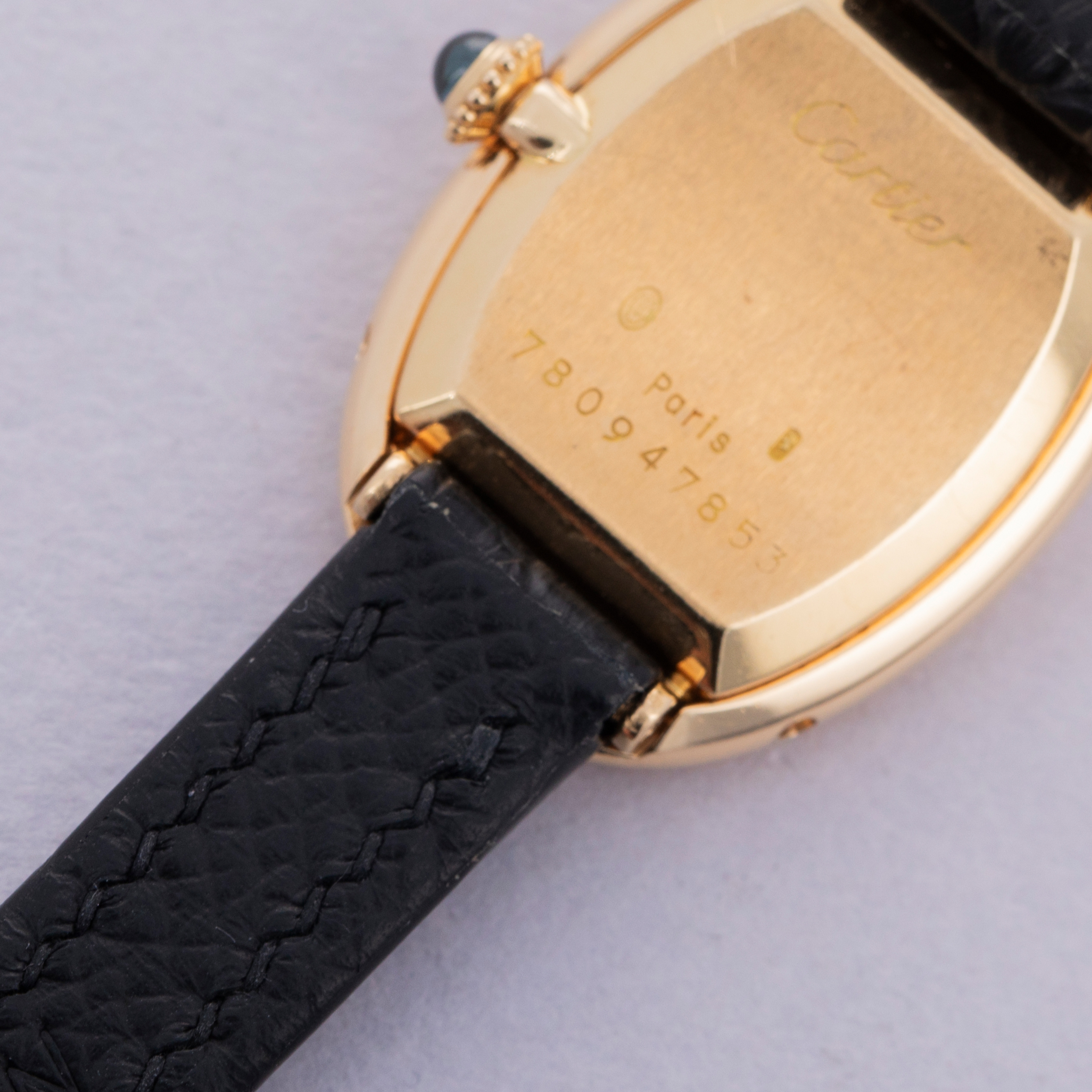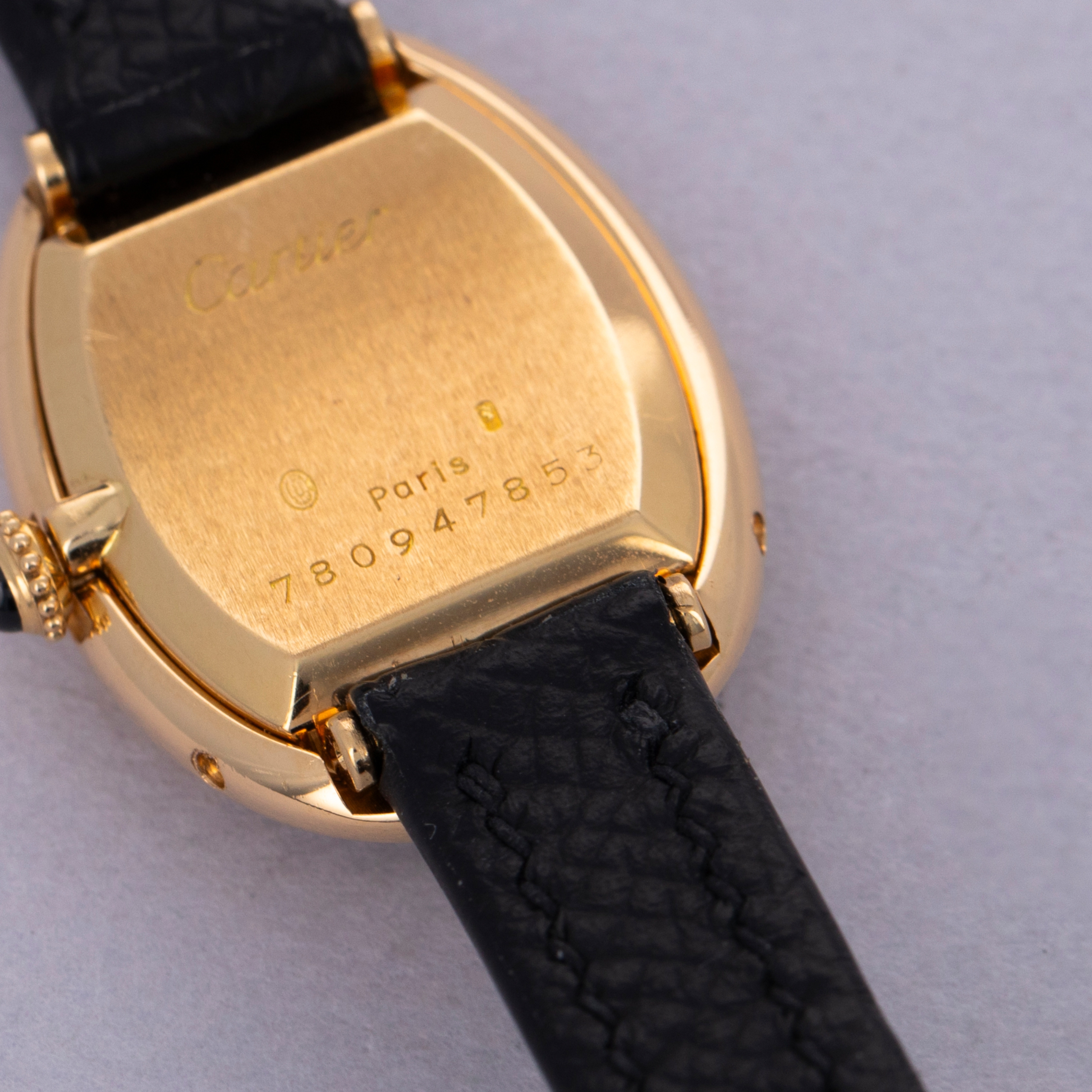 Watch is in excellent overall condition. Case shows minor wear, with some visible scratches and hairlines along the case. Hallmarks are crisp and fully legible on caseback. Minor toolmarks visible on and near the case screws. Watch comes on a third party strap an plated Cartier buckle.