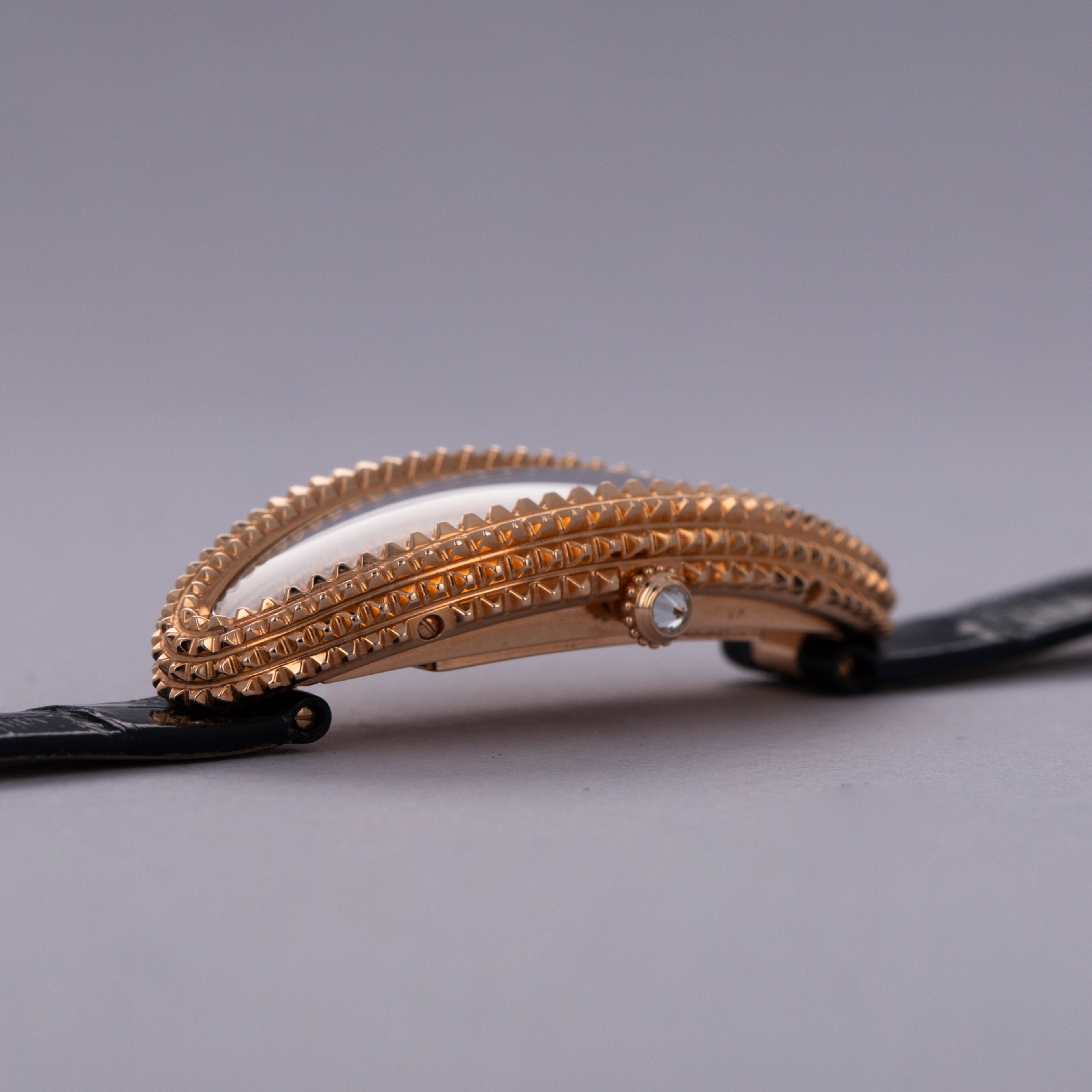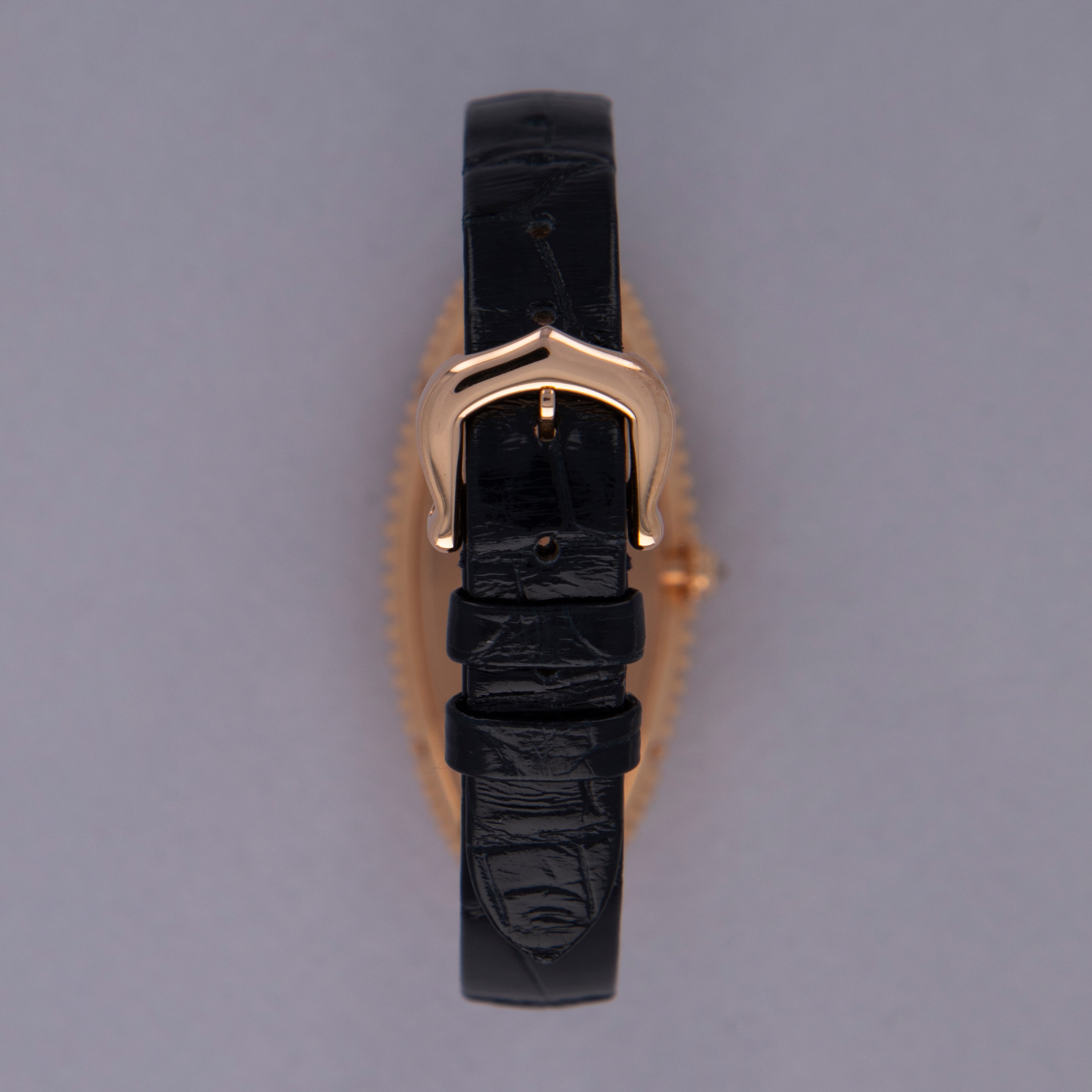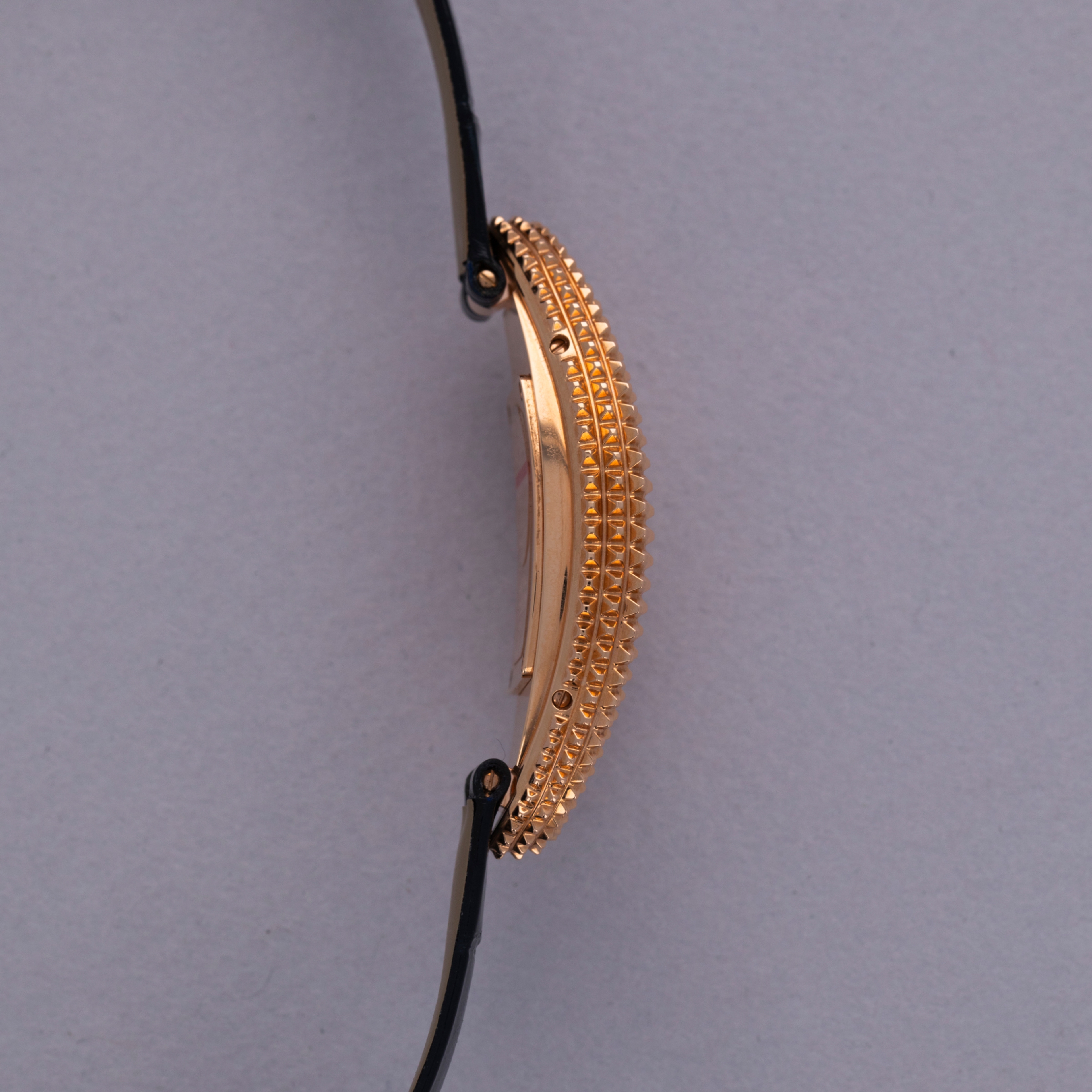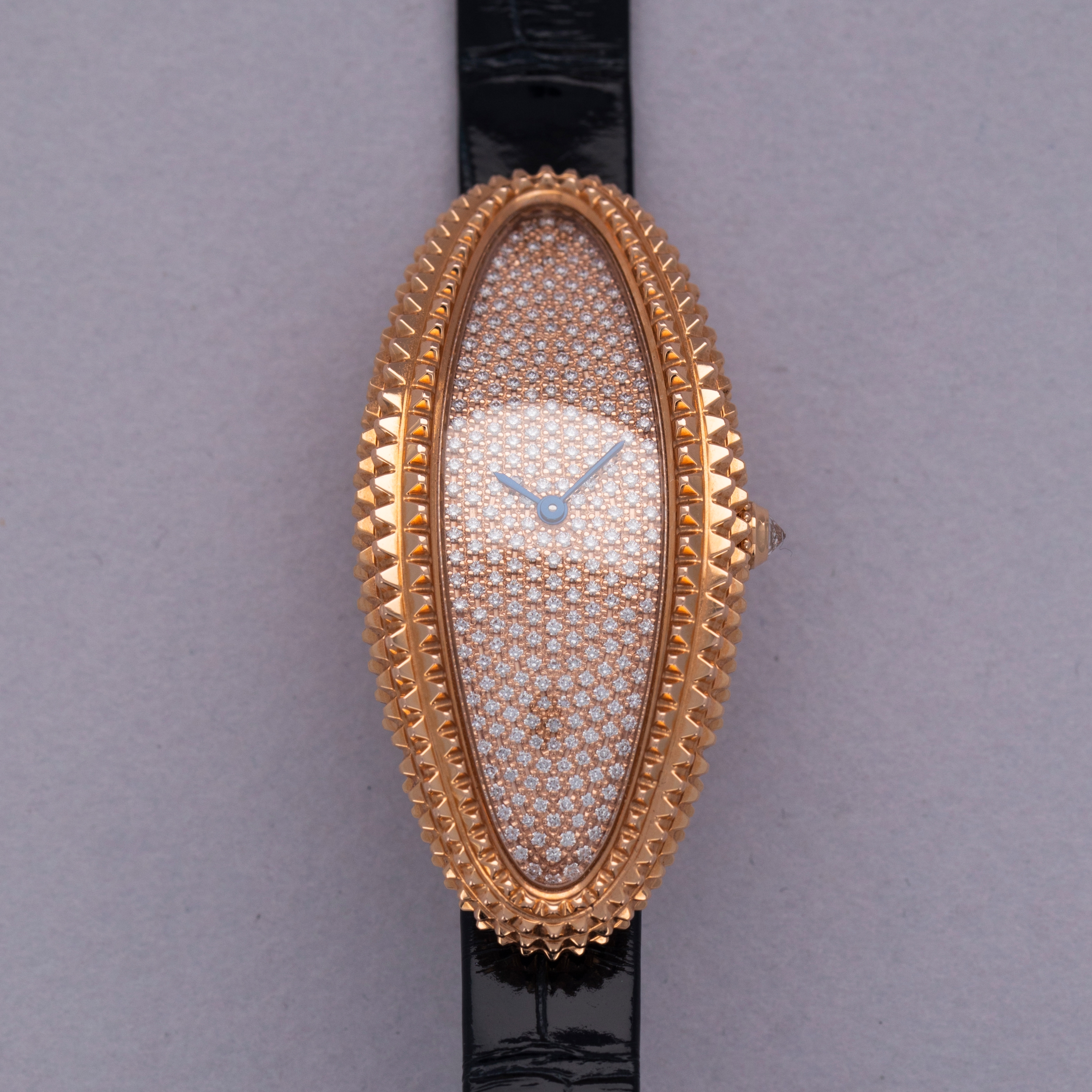 An elongated take on the Baignoire's iconic bathtub-like oval design, the Baignoire Allongee's construction wraps around the wrist elegantly, and with its uniquely textured bezel and mid-case, the example we have here is intensely elegant.