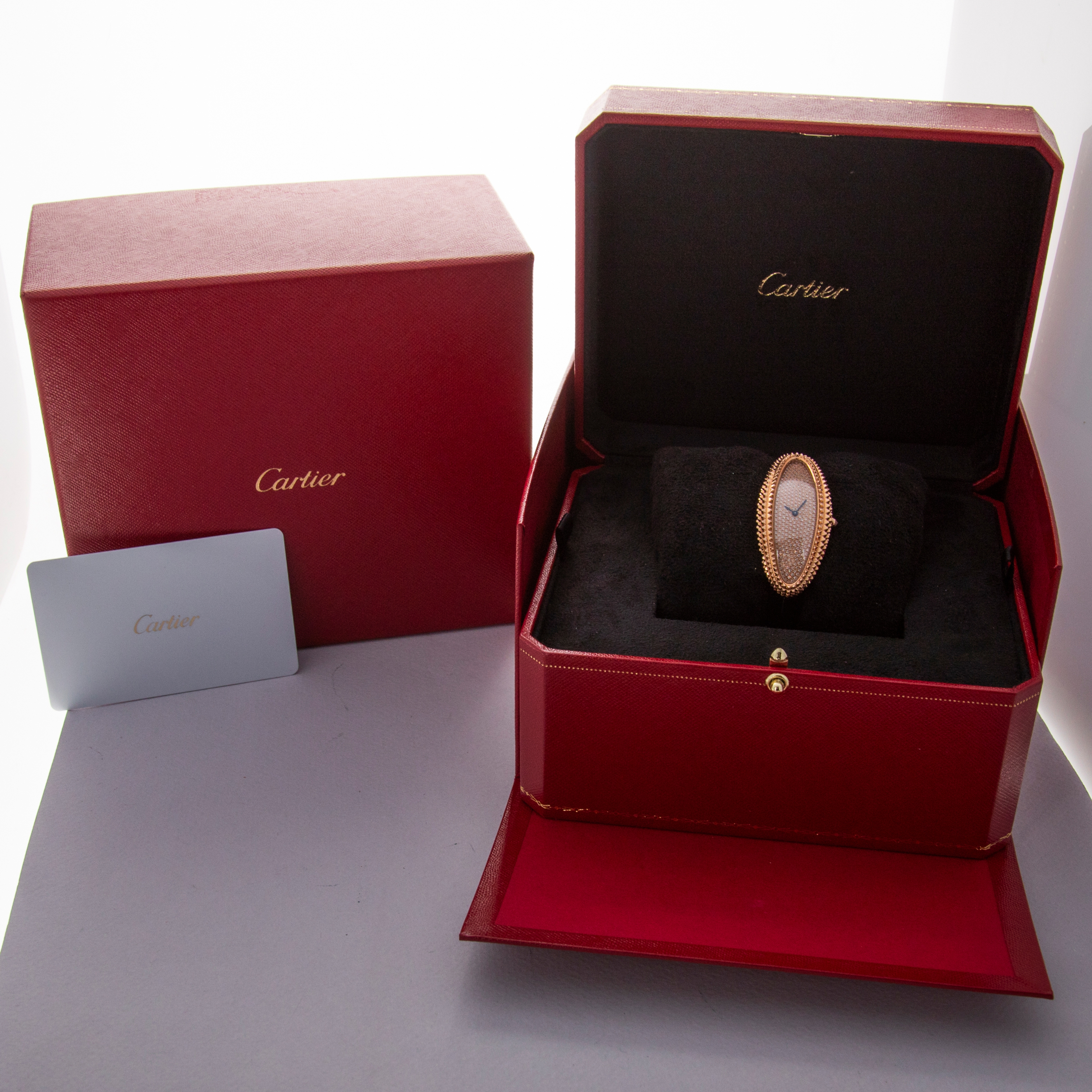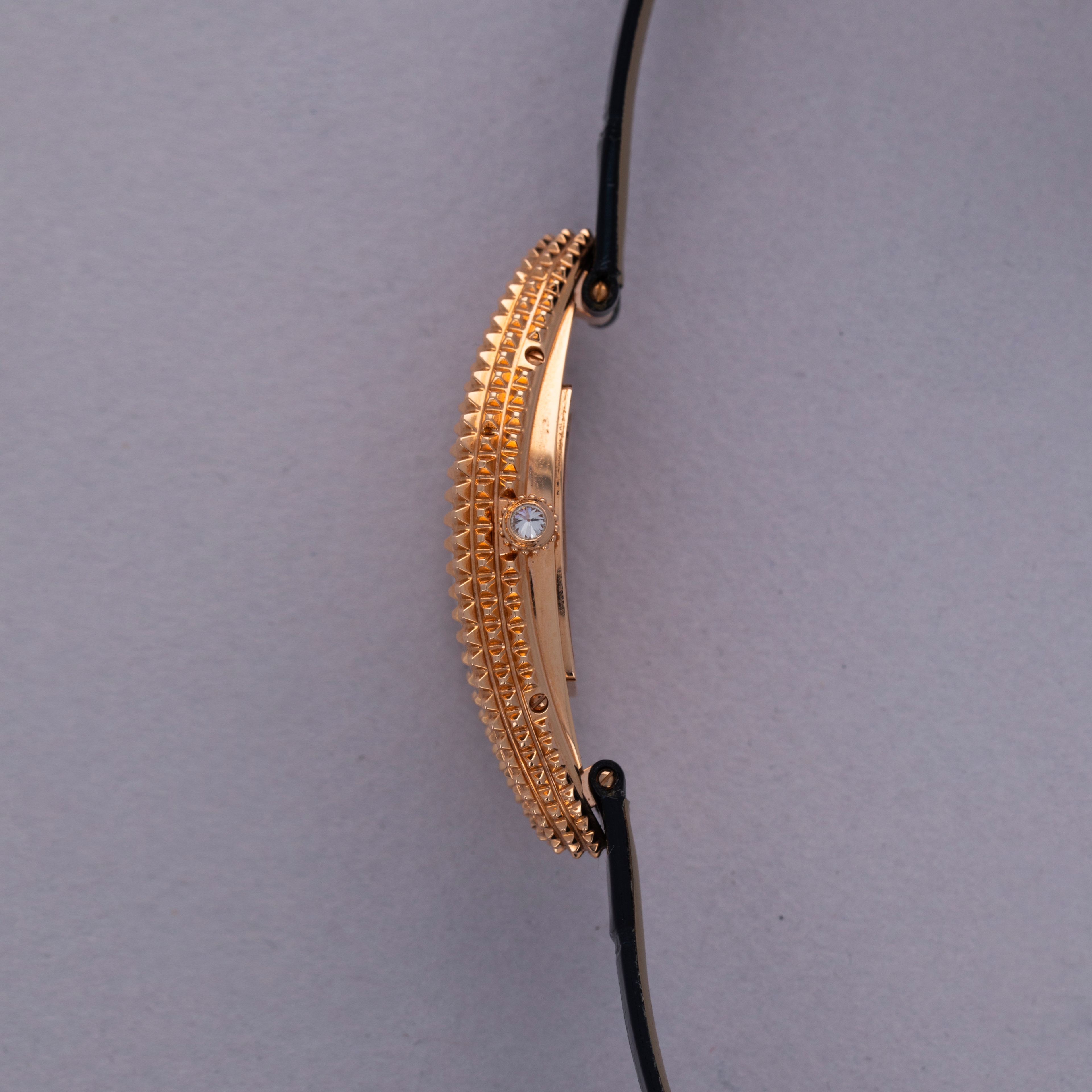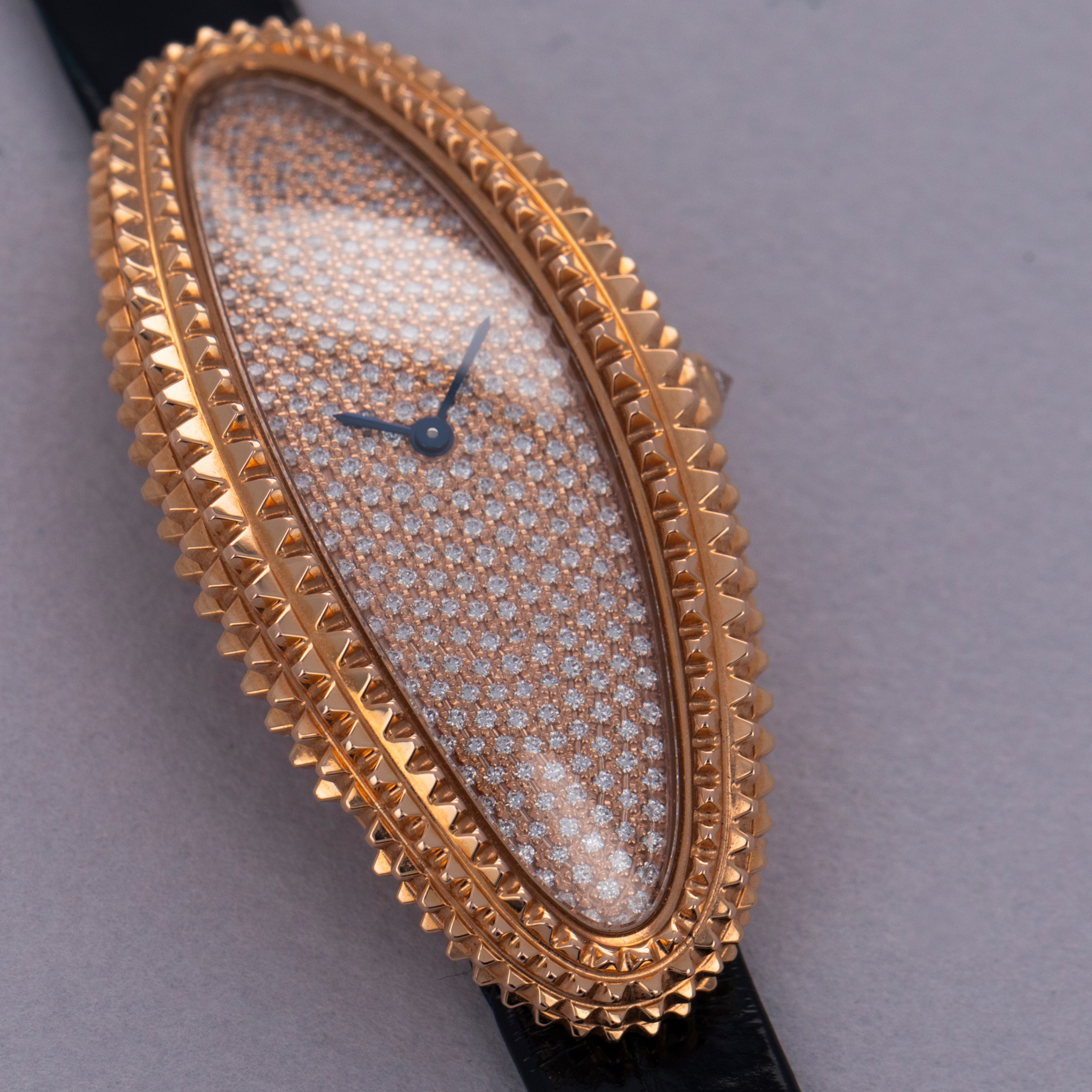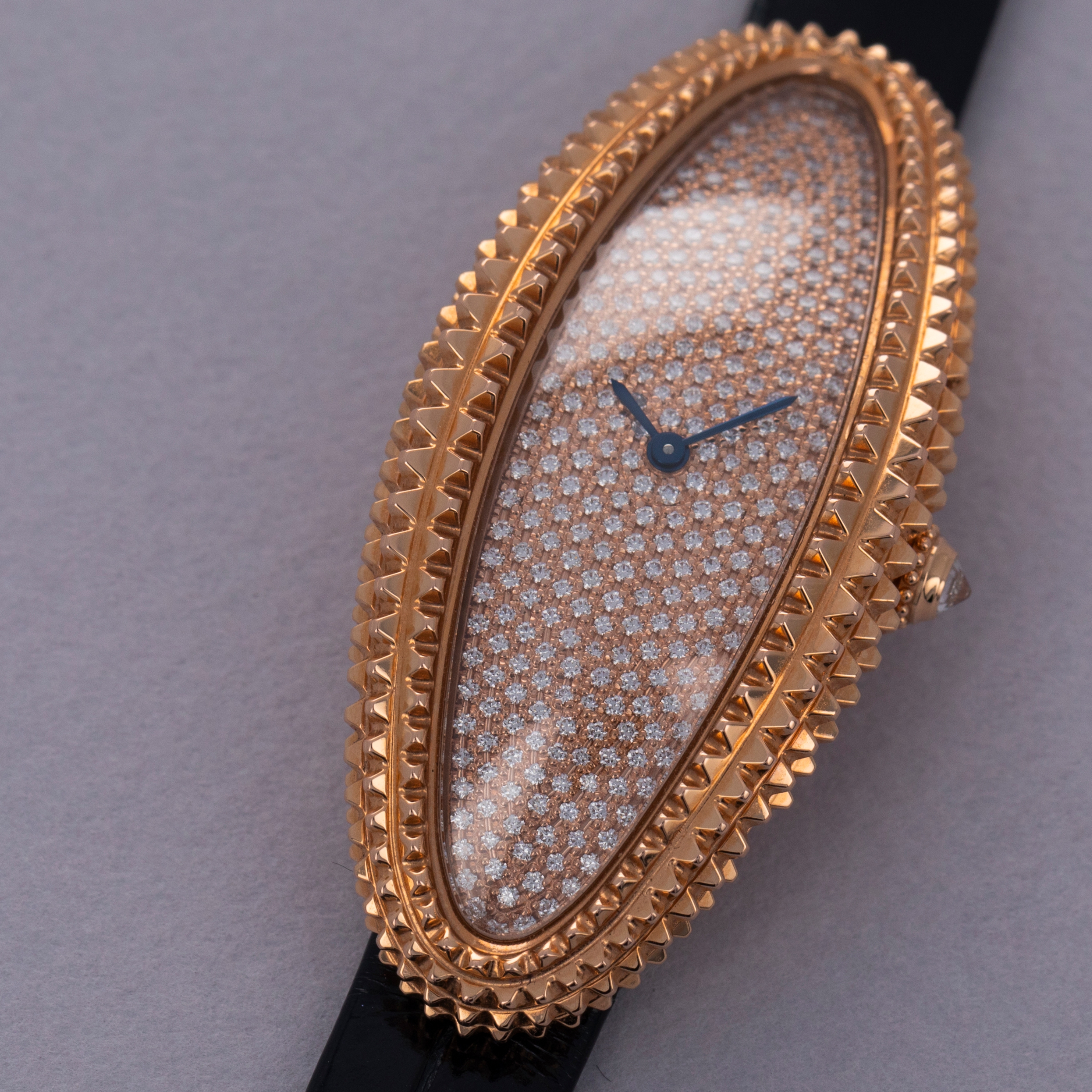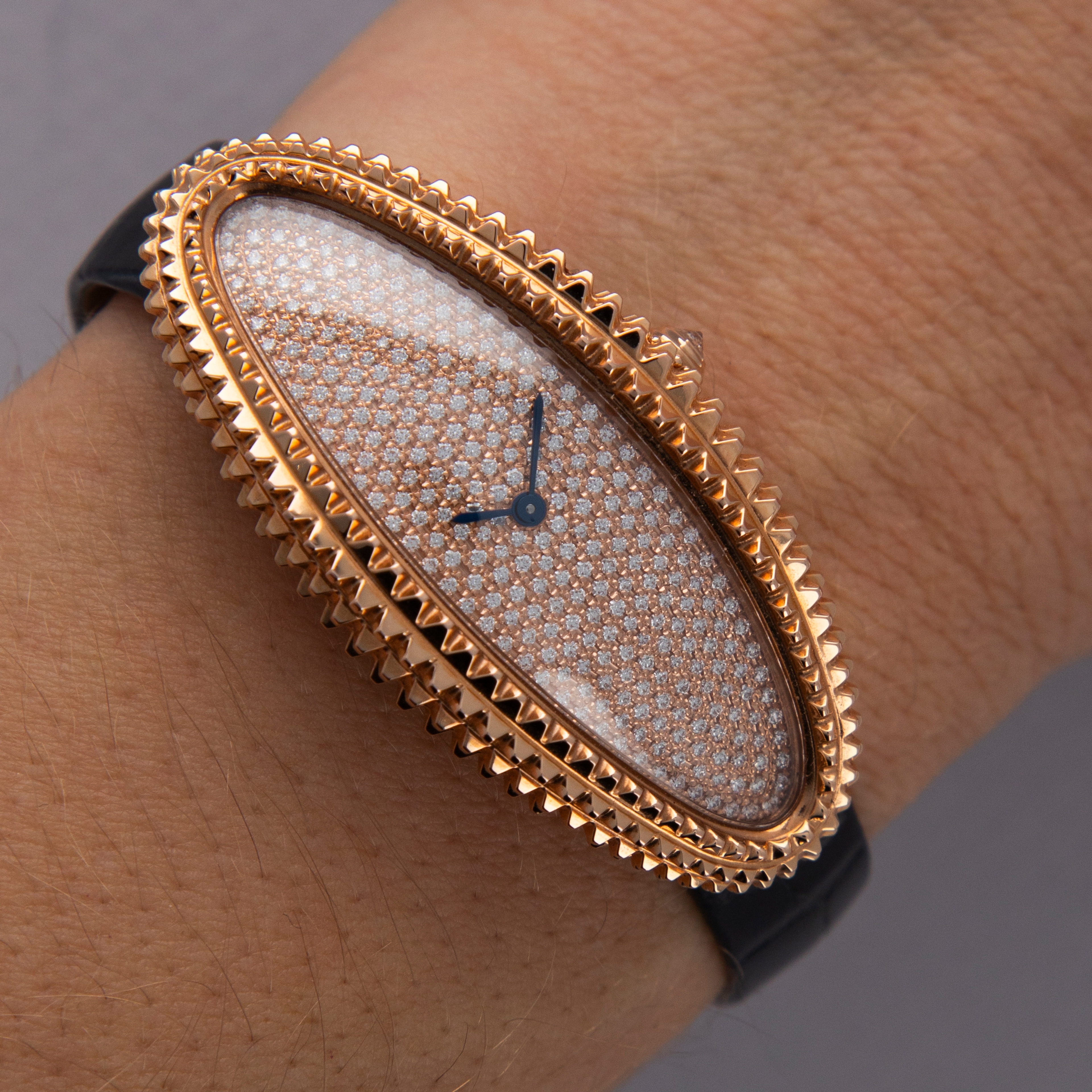 Holding a storied history that spans over a century, the Cartier Baignoire watch is a true icon in the world of luxury timepieces. Designed by Louis Cartier in 1912 specifically for the Grand Duchess Maria Pavlovna of Russia, it was the iconic brand’s first oval-shaped watch. Boasting an elliptical case design that was a departure from the traditional round and rectangular shapes of watches at the time, the Baignoire (named after the French word for “bathtub” due to its shape), or “oval-shaped watch” as it was known at the time, showcased Cartier's pioneering spirit and innovative approach to watchmaking, and watchmaking design. Initially designed as a bespoke piece for the select few, the Baignoire quickly garnered attention for its distinctive shape and refined aesthetics and finally entered regular production in 1957. In the 1960s however, the Baignoire took on a new shape as Cartier took the Baignoire and stretched, or elongated, its design into the Baignoire Allongee, like the watch that we have here, the ref. CRWJBA0016. Releasing various interpretations that highlight different facets of its design just like other models, the Baignoire Allongee’s design can go from minimalist interpretations with sleek, curved cases to opulent versions adorned with diamonds and intricate guilloché patterns just like the ref. CRWJBA0016 that we have here. Boasting a pave-set diamond dial with only its blued steel sword-shaped hands remaining as a hint to Cartier’s hand in its design, this Baignoire Allongee features an engraved 18kt rose gold case that measures a long 47mm tall and a slim 21mm wide that elegantly wraps around the wrist. However, touching on a more avant-garde aesthetic than Cartier is typically known for, this Allongee’s case features pyramid-tipped case with its bevel and mid-case completely covered in a large Clous de Paris-like texture whereby an aggressive knurling has been used to create the look of a diamond-set case that perfectly matches the look of its pave-set diamond dial, creating a cohesive and luxurious look.