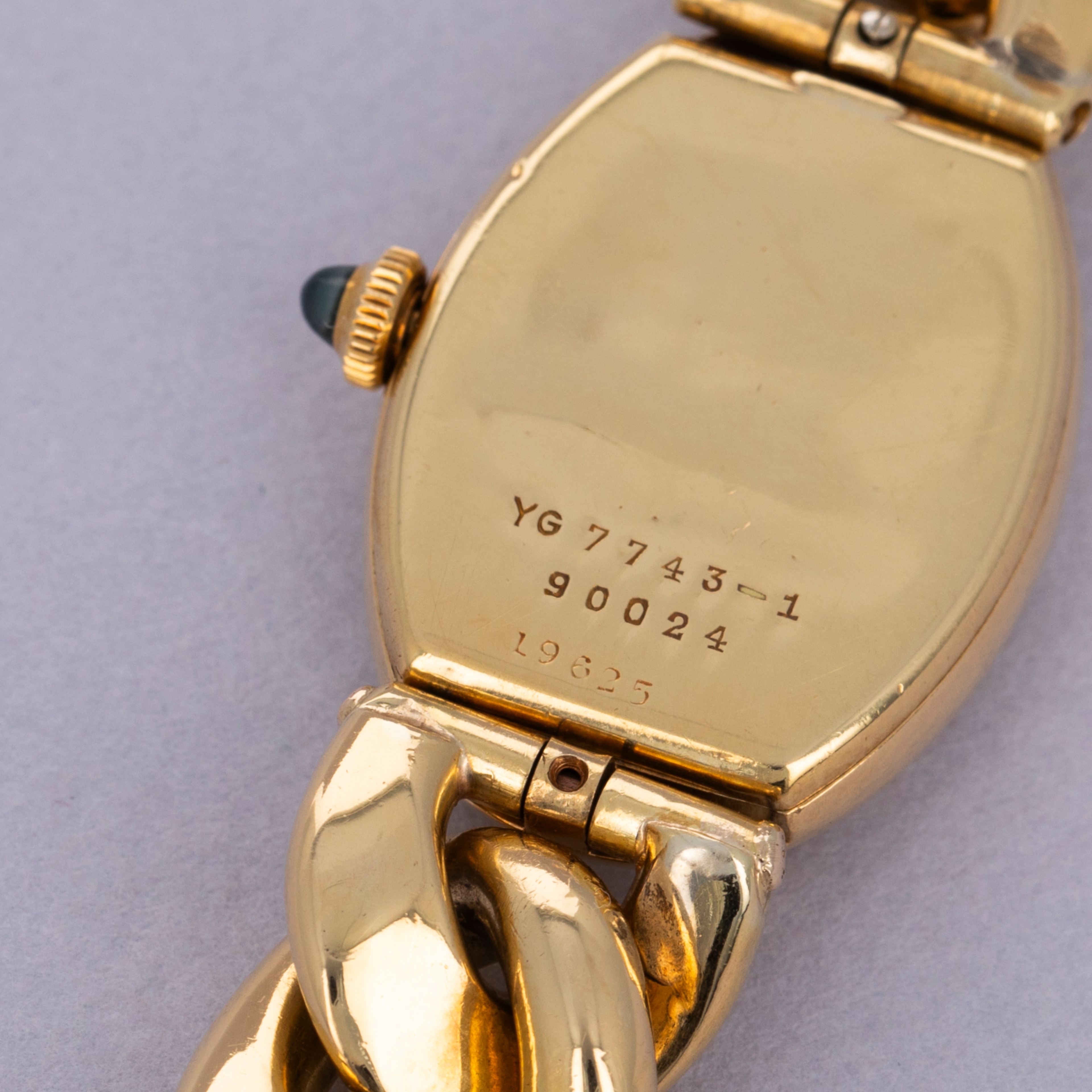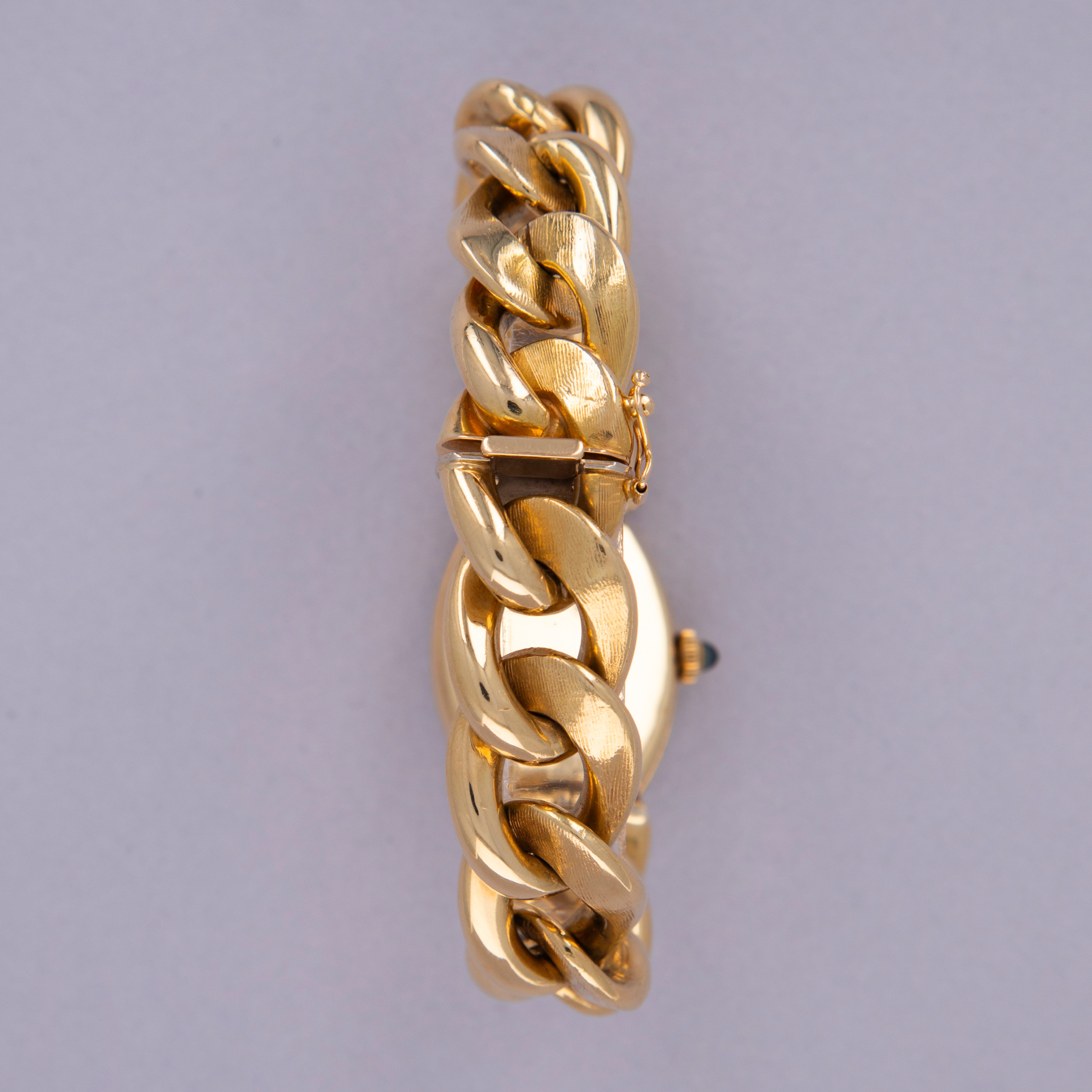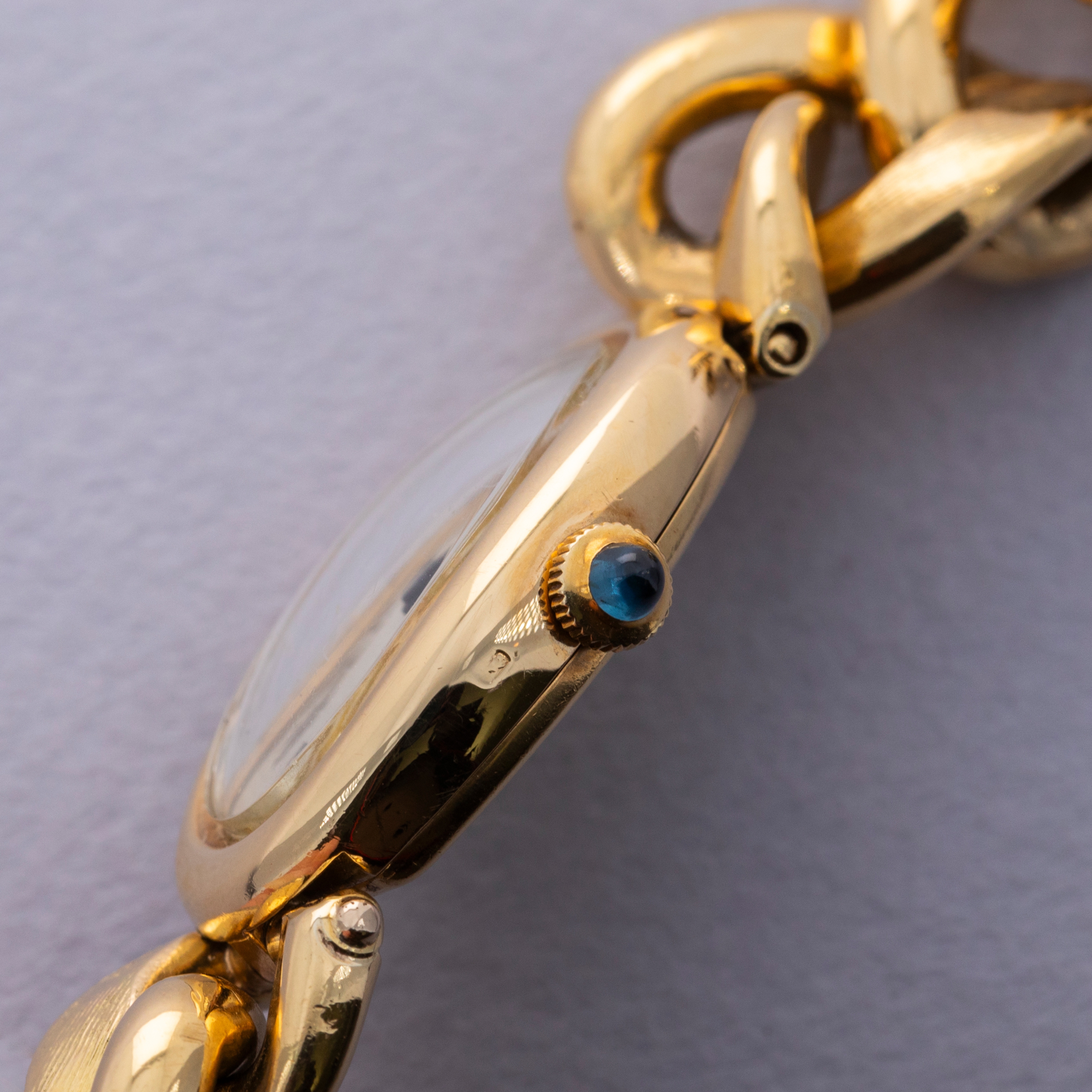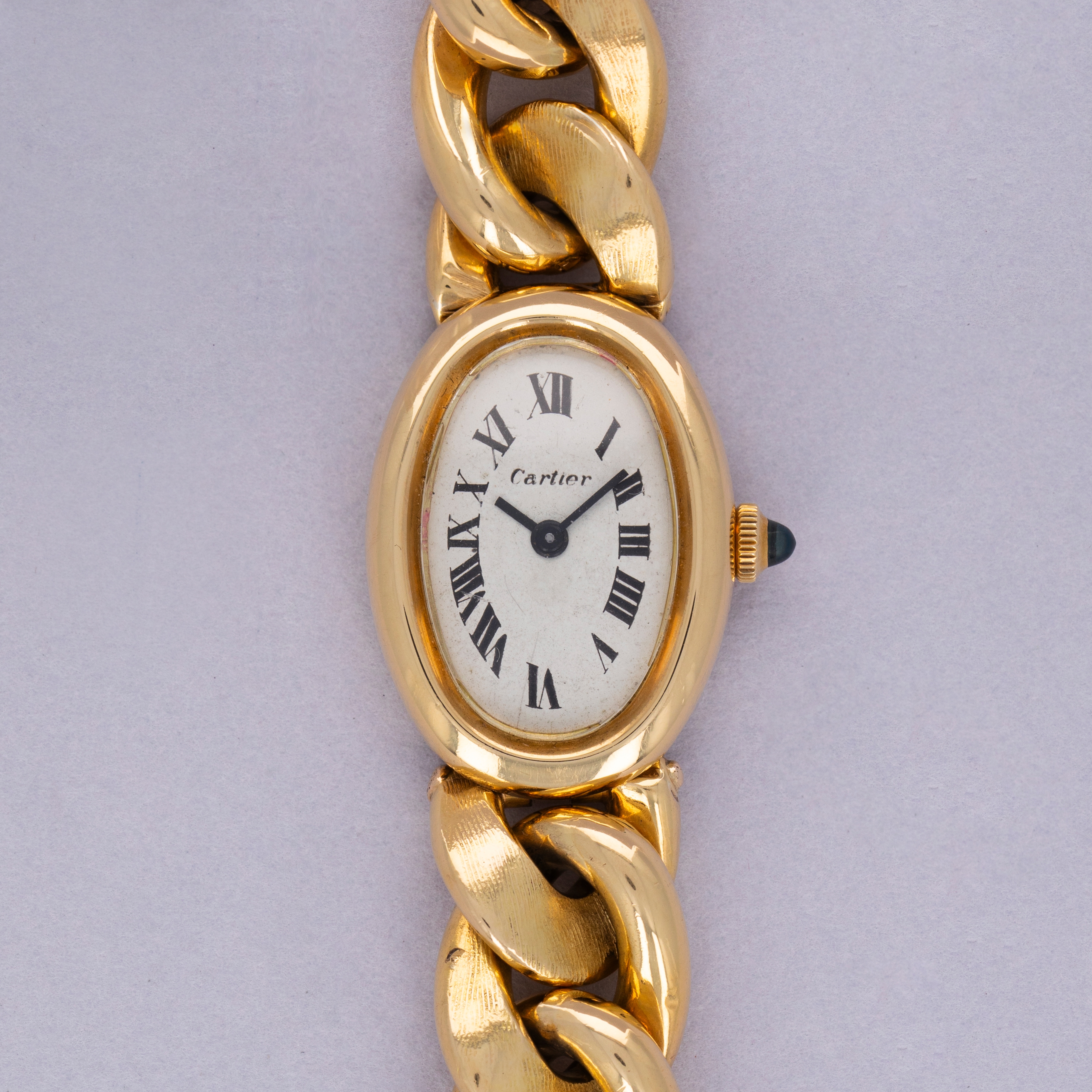 Celebrating Cartier's storied heritage of luxury and elegance and tracing its design roots back to 1912 when Louis Cartier crafted an unnamed watch for Grand Duchess Pavlovna of Russia, the Cartier Baignoire was officially released to the public in 1957 as the "Baignoire," French for "bathtub”. Embodying the brand’s daring reinterpretation of the traditional round watch, the Baignoire that we have here captures the Baignoire’s iconic silhouette with a luxurious twist with its unique 18k yellow gold Cuban link bracelet. Twisting around and attaching to the Baignoire through its hidden lugs, the bracelet’s unique design contrasts that of the Baignoire’s curvy oval silhouette. Measuring 21.8mm x 30.5mm, the Baignoire’s aesthetic is entirely removed from the typically restrained design language that the Baignoire follows when offered on a leather strap, as is typical for the model. Sold by Cartier New York, this example features the relevant stock number engraved on its caseback, and features the correct Cartier typeface for Cartier NY on its white dial. As was normal for Cartier NY at the time, they would retail watches made by other brands, with this example being made by Bueche Girod, a relatively small watchmaker founded in 1947 by a husband and wife team whose watches quickly became quite desirable. Thanks to their craftsmanship, Bueche Girod would go on to supply watches to the likes of Cartier, Universal Geneve, Bulova and others.