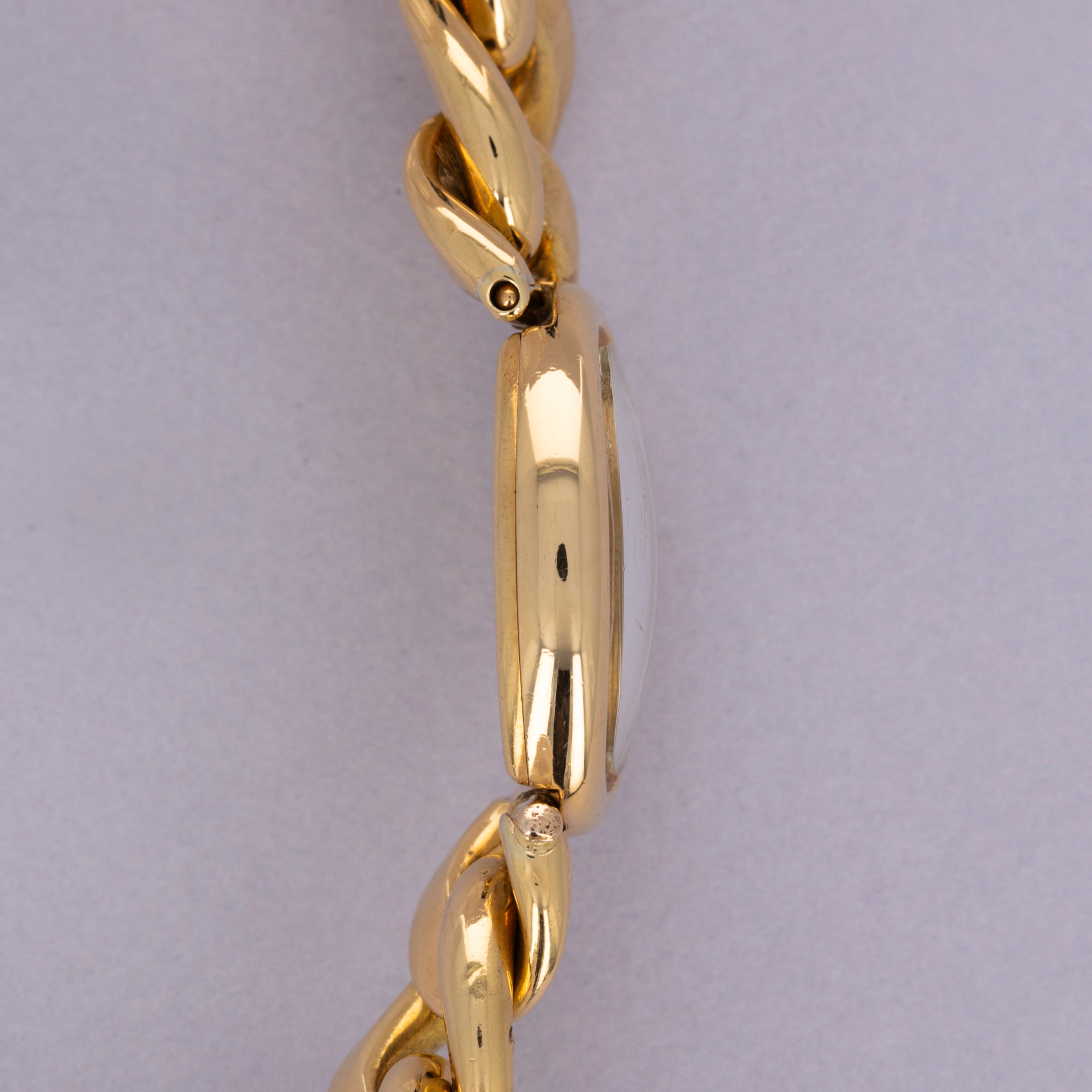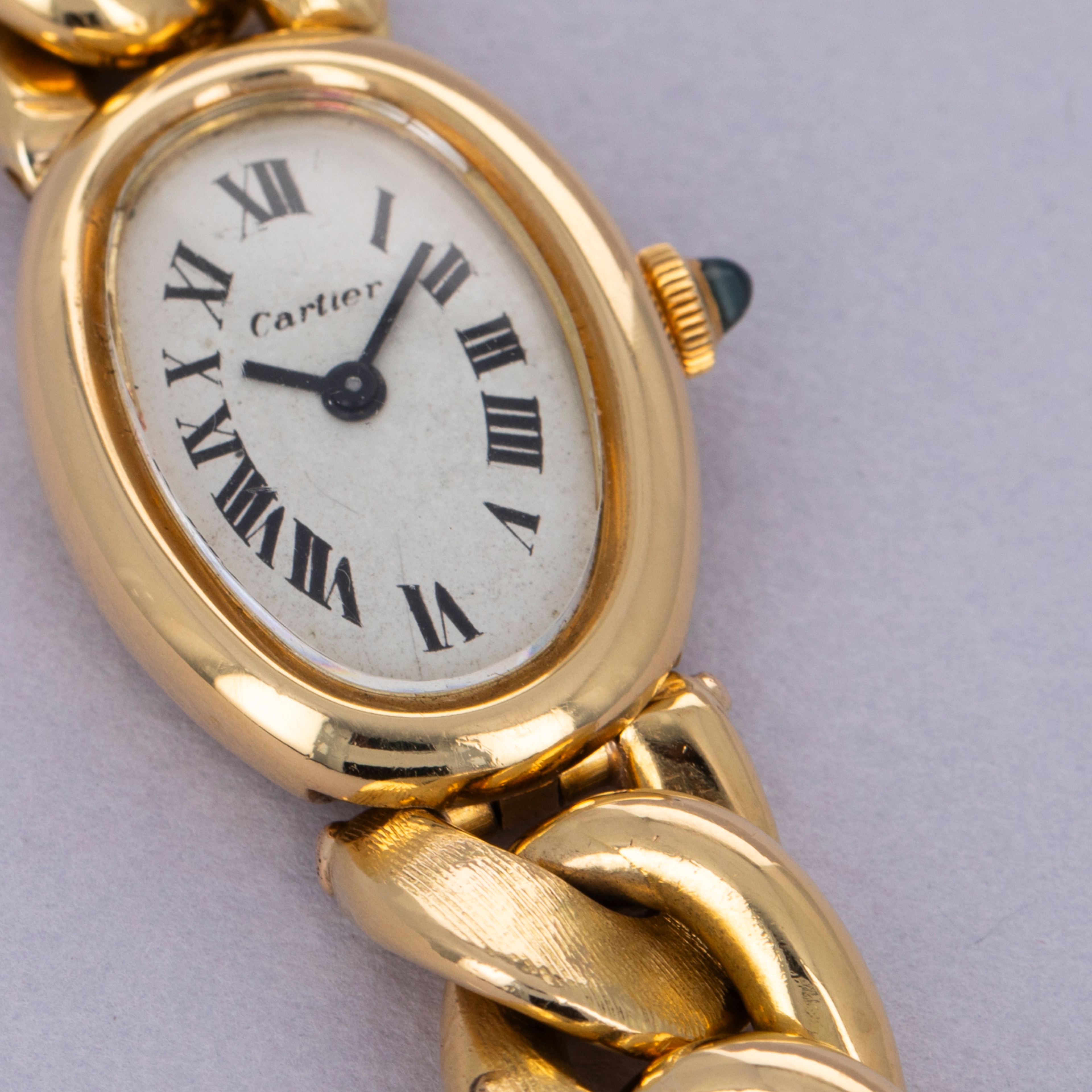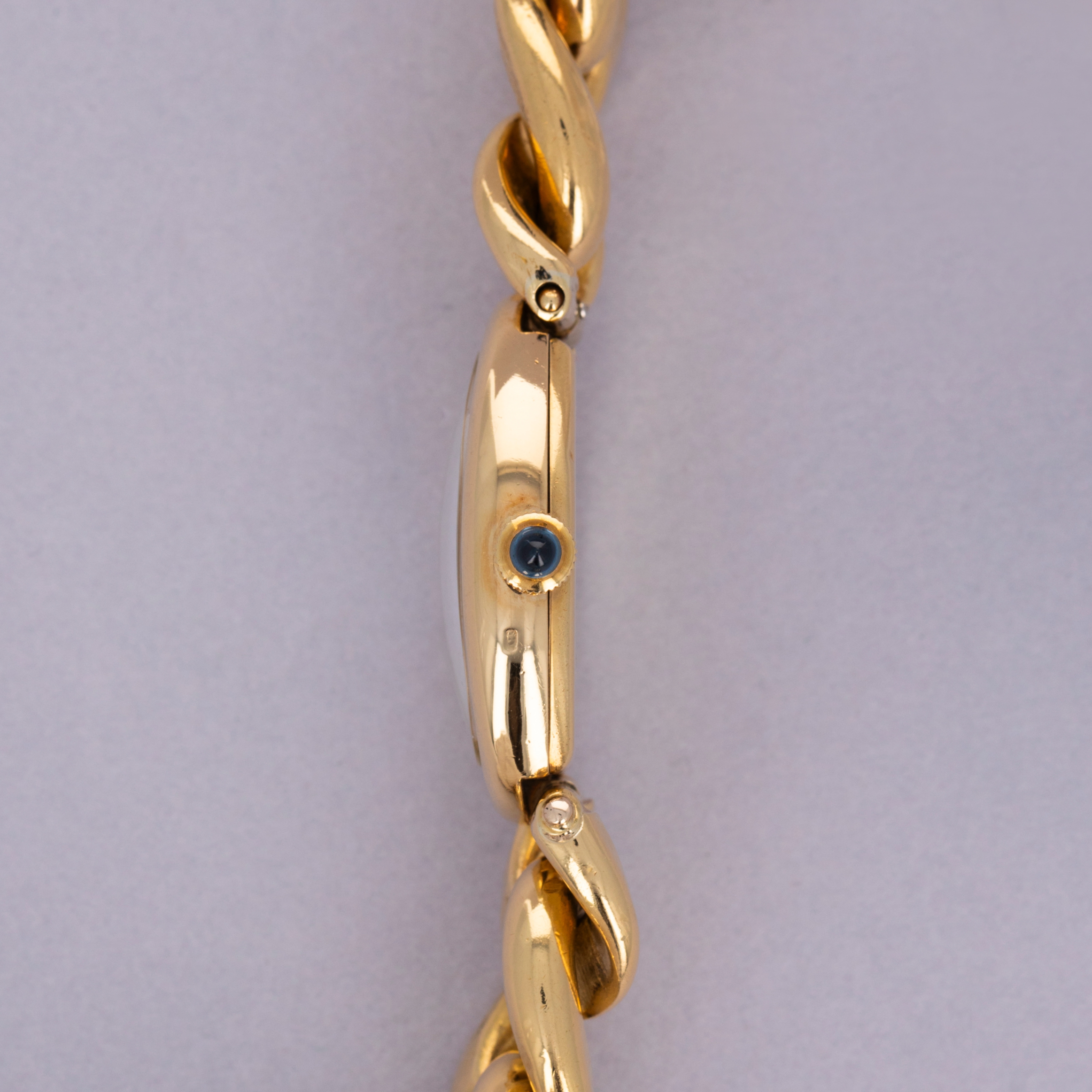 Watch is in very good overall condition. Case is soft but numbers on caseback (including the Cartier NY stock numbers) are all fully visible. Helvetia hallmark on side of case is gently worn but visible. Cartier signed dial is in very good condition. Dial has spotting and surface wear as seen in the images. Crystal has some surface scratches. Bracelet has 11 links total, and fits an approx 6 3/4" wrist. Links are 18k gold but are hollow, and total weight of the watch is approx 64 grams. Please note that the watch winds and is running, but timekeeping is poor and a service is recommended.