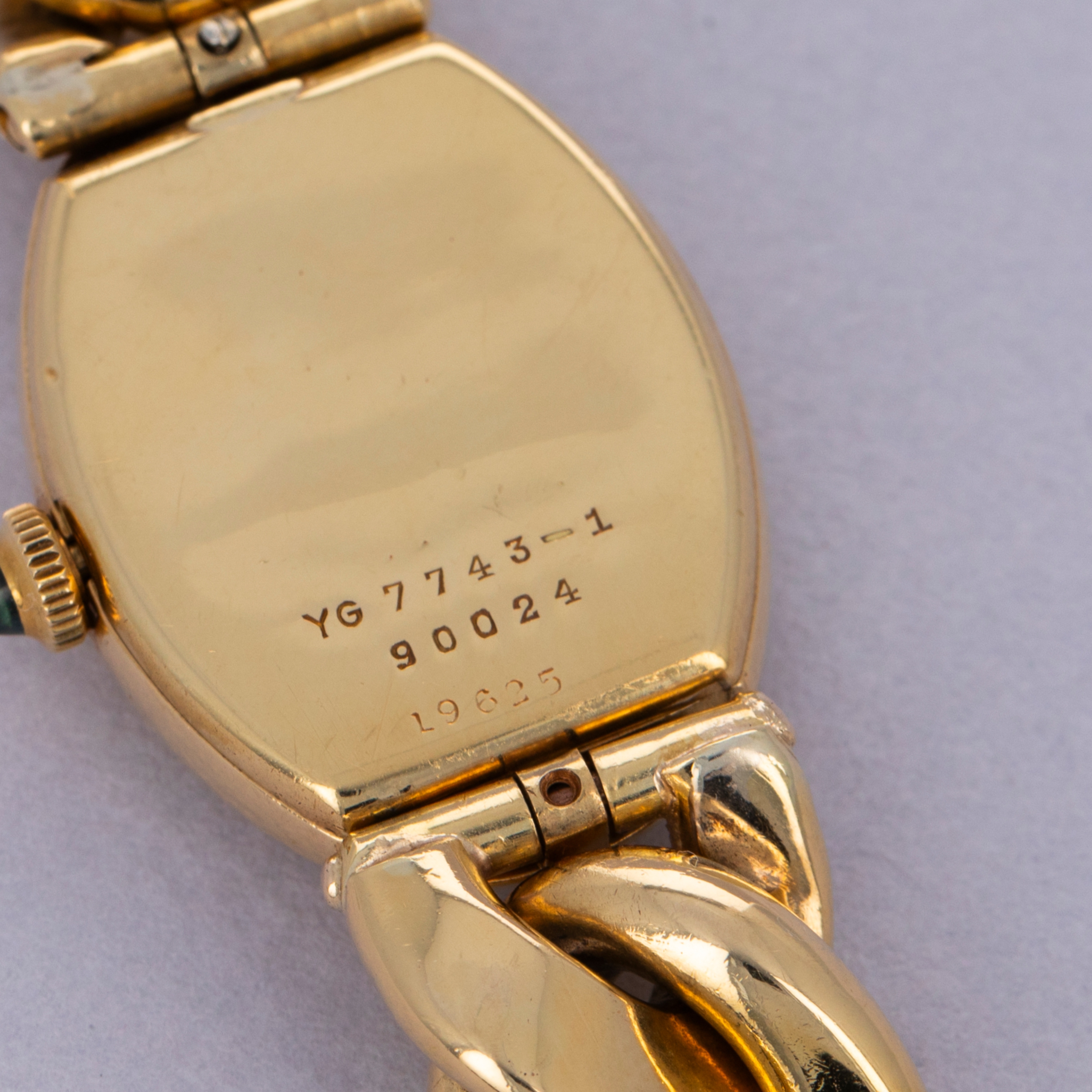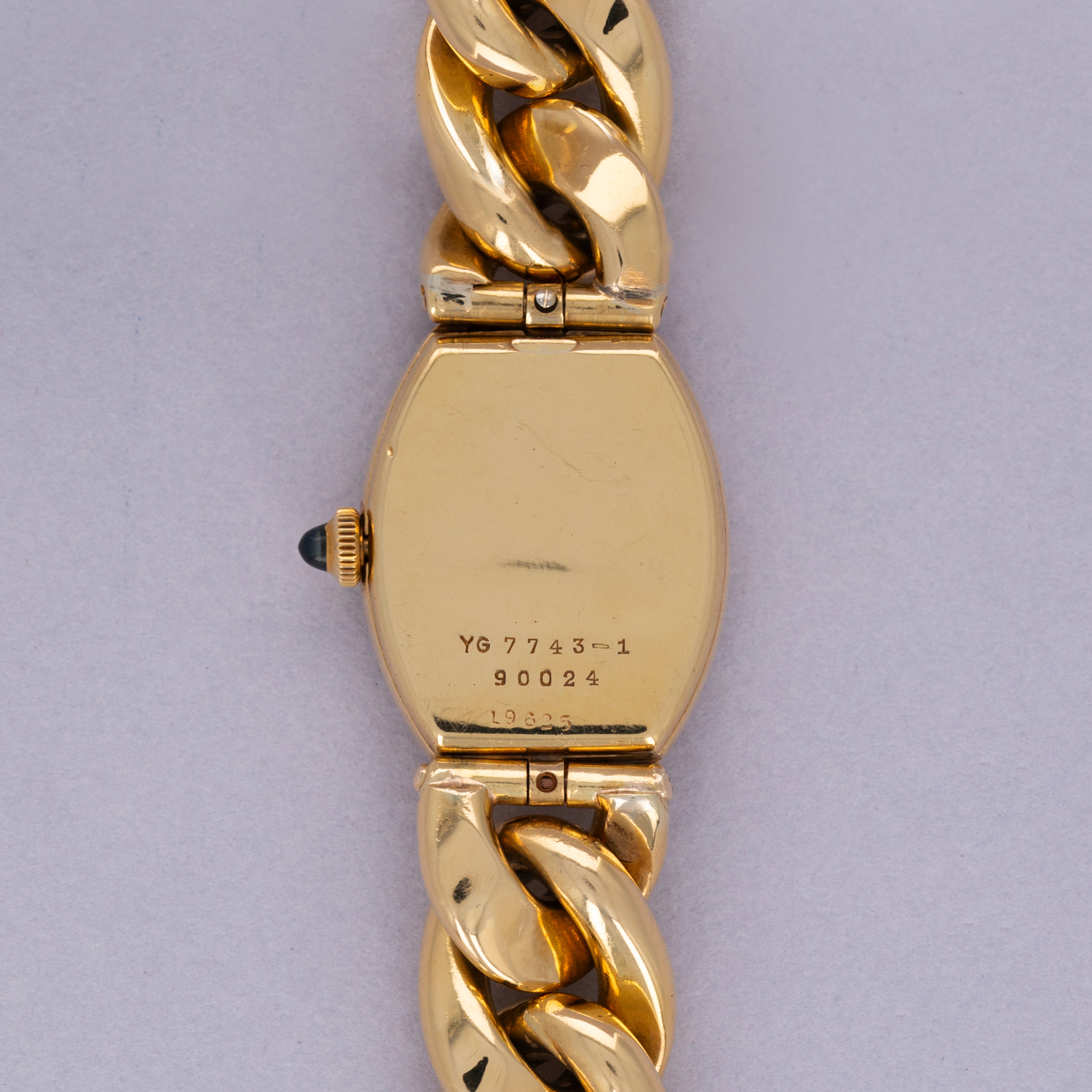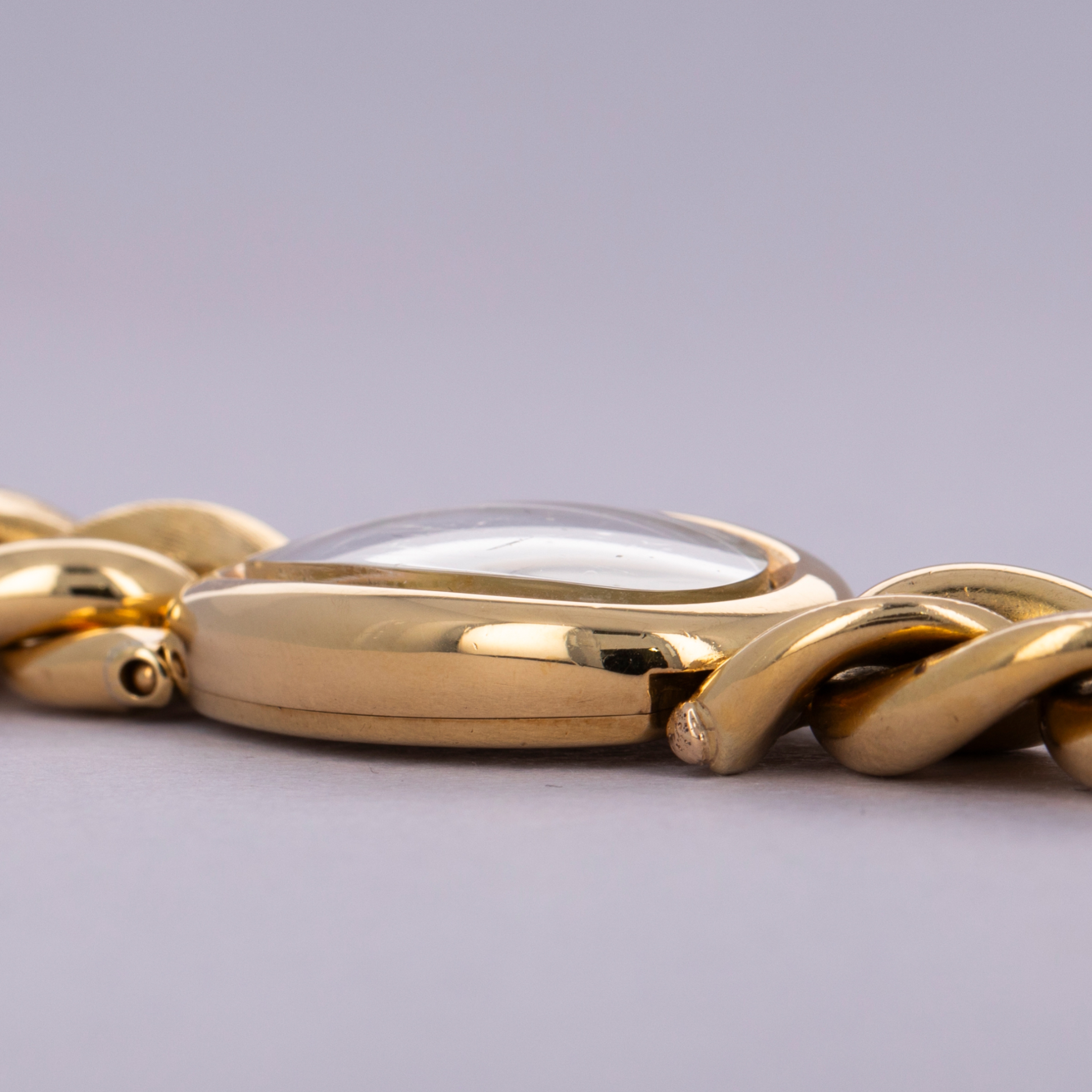 Watch is in very good overall condition. Case is soft but numbers on caseback (including the Cartier NY stock numbers) are all fully visible. Helvetia hallmark on side of case is gently worn but visible. Cartier signed dial is in very good condition. Dial has spotting and surface wear as seen in the images. Crystal has some surface scratches. Bracelet has 11 links total, and fits an approx 6 3/4" wrist. Links are 18k gold but are hollow, and total weight of the watch is approx 64 grams. Please note that the watch winds and is running, but timekeeping is poor and a service is recommended.