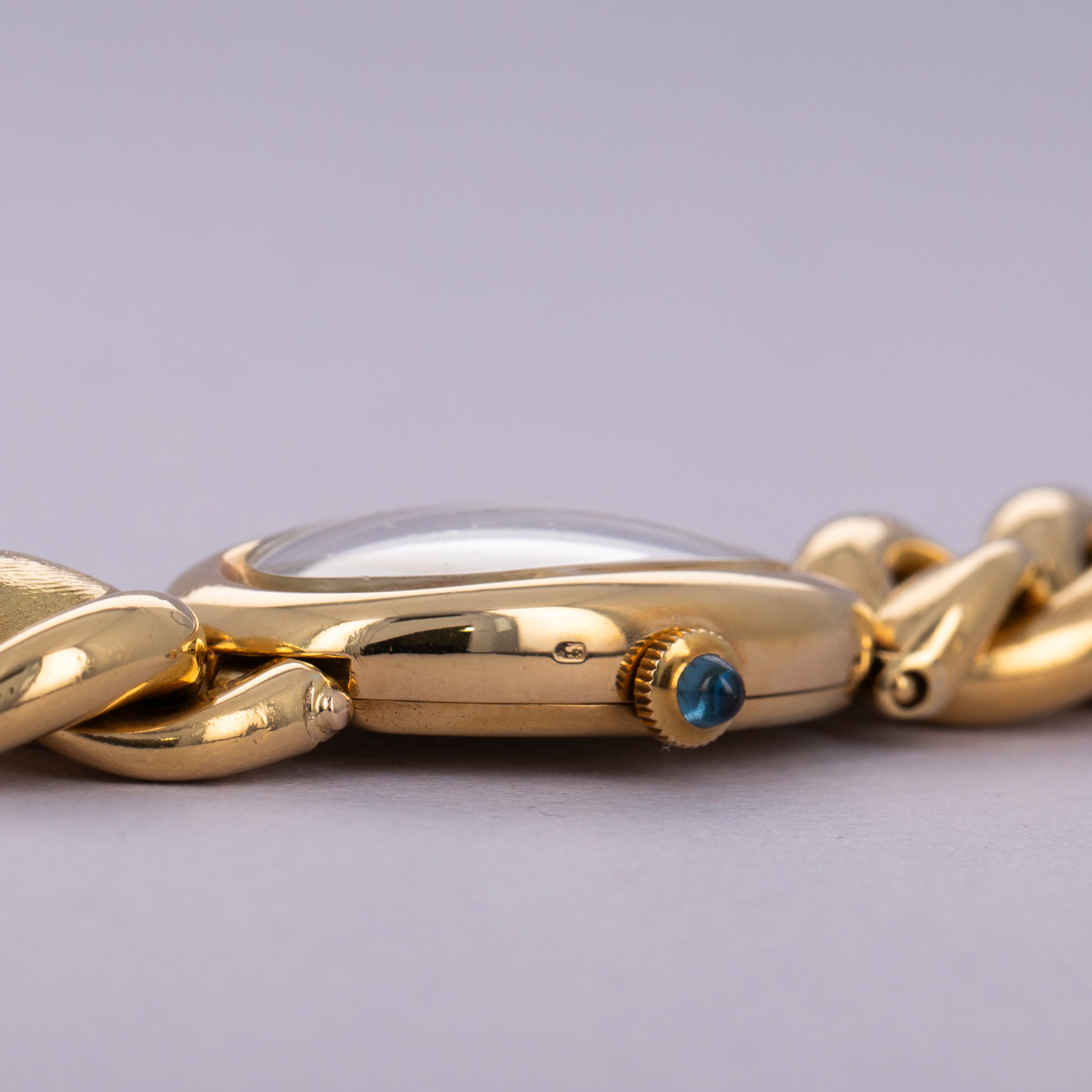 Offering a completely new aesthetic for the Baignoire, this example's Cuban link bracelet swaps the Baignoire's understated elegance for a louder and more opulent design.