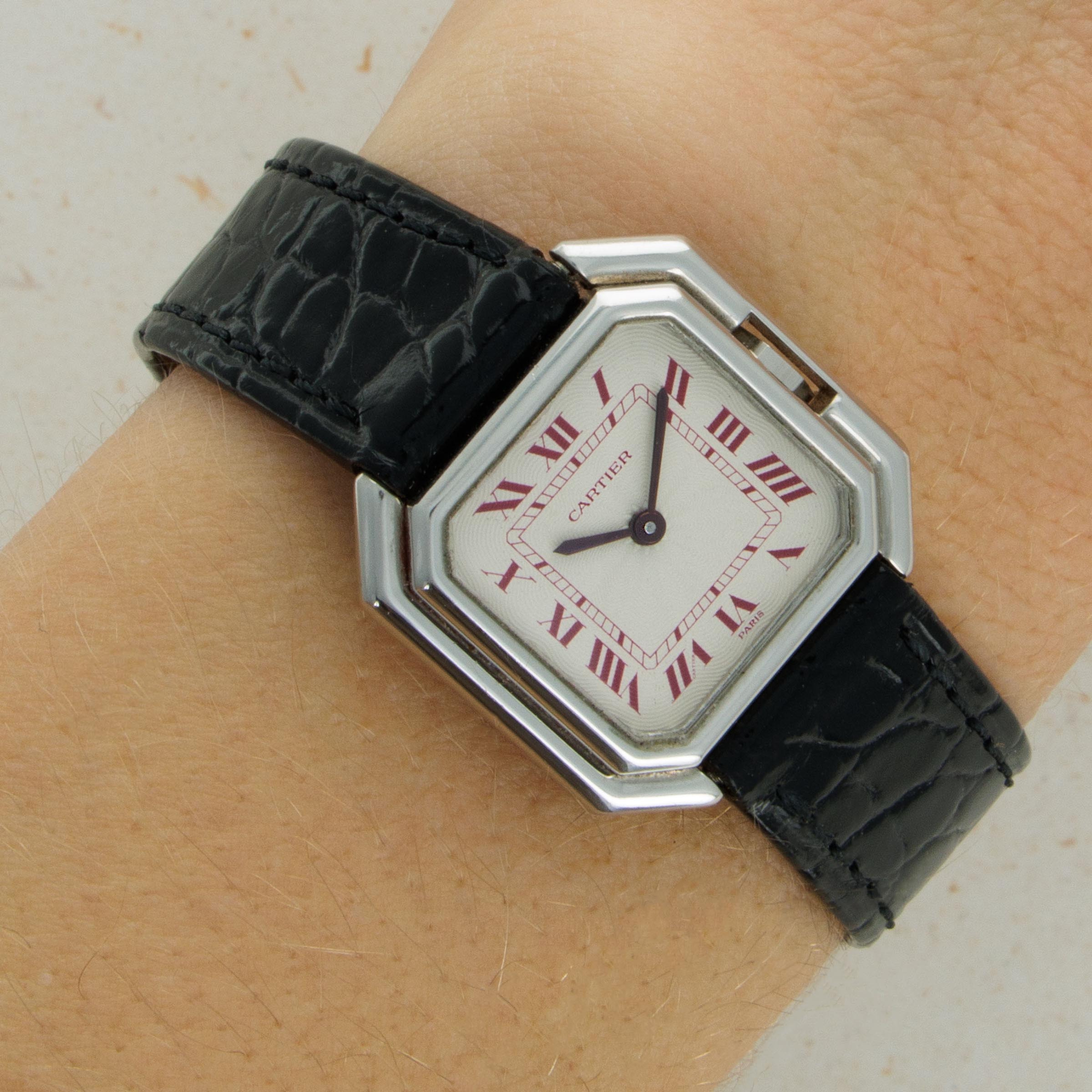 Famed for their iconic collections and classical styling, French jeweller and watchmaker Cartier hold a vital position within the horology industry. However, one such collection that flies under the radar is the Ceinture, first launched in 1927 but reintroduced to Cartier's line-up in the early 1970s, around 1973. First offered in two case sizes, 25mm and 27mm, until a larger 31mm variant was introduced, the Ceinture is a dynamic timepiece known for its unique twist on the Tank’s design. Powered by the manual wind cal. 78.1 movement, the Ceinture that we have here is a wonderful twist on Cartier’s signature design language. Housed within a platinum case, this 25mm variant is admittedly understated and thus flies under the radar as a watch that only those in the know would appreciate. In keeping with this ethos, this example also boasts a white rosette-textured dial with red Roman numerals and dial inscriptions, which is a large departure from Cartier’s typical use of black Roman numerals and dial inscriptions, thus providing the timepiece with a unique aesthetic. Of course, the Ceinture's most distinctive element has always been its unusual octagonal case. Somewhat reminiscent of a belt's buckle ('ceinture' means 'belt' in French afterall), the Ceinture resembles a square that has had its corners cut, which in turn allows the watch to wear more prominently on the wrist than one would assume judging solely on its rather svelte proportions. With its deep-stepped bezel design, the Ceinture is truly an interesting timepiece on the wrist. Feeding into this intrigue is the Ceinture's octagonal crown, which sits within its case and acts as an extension of the stepped bezel. Cartier also decided to forgo their signature sapphire cabochon crown so that the Ceinture's crown could sit within the bezel, a feature that Cartier calls "remontoir imperdable" (captive winding).