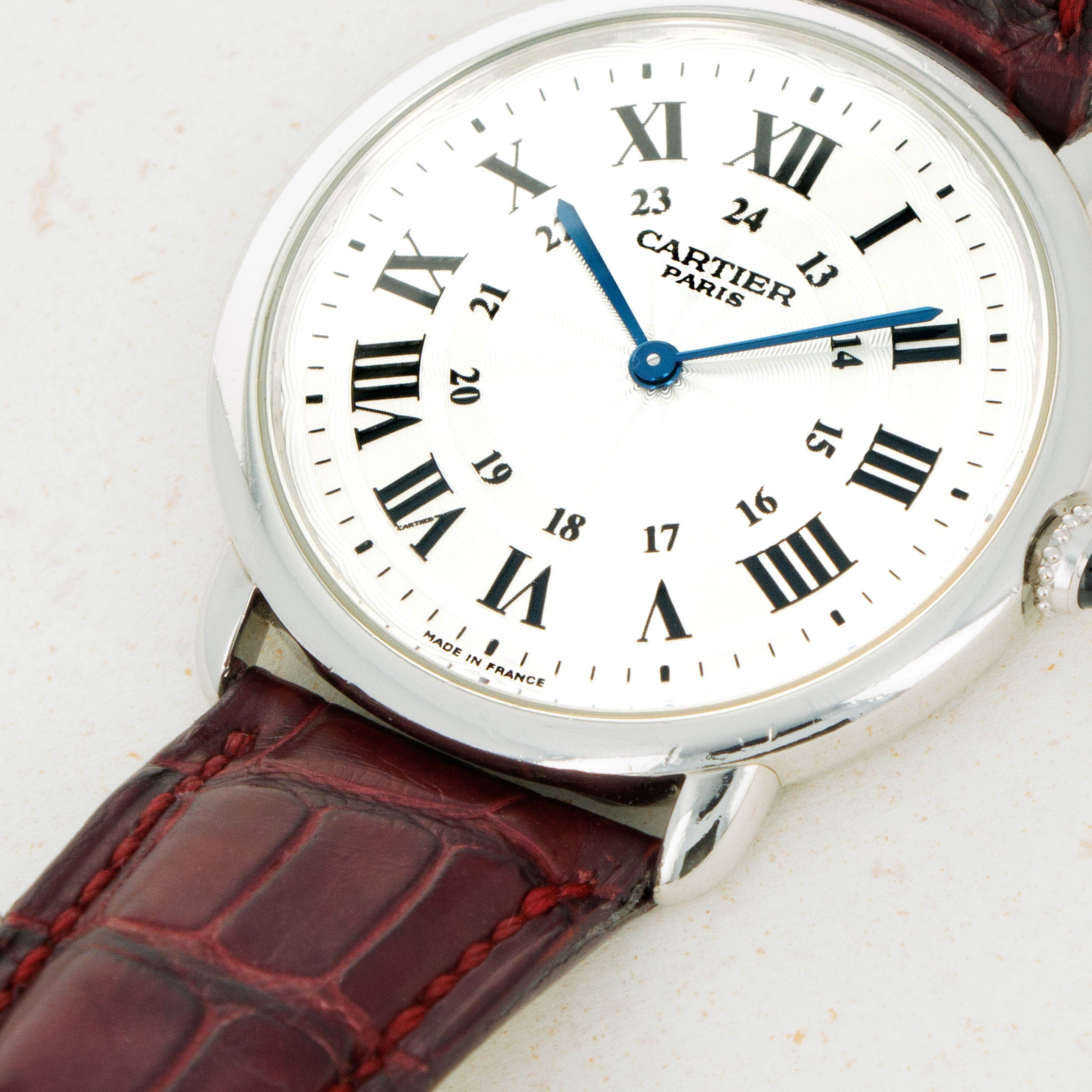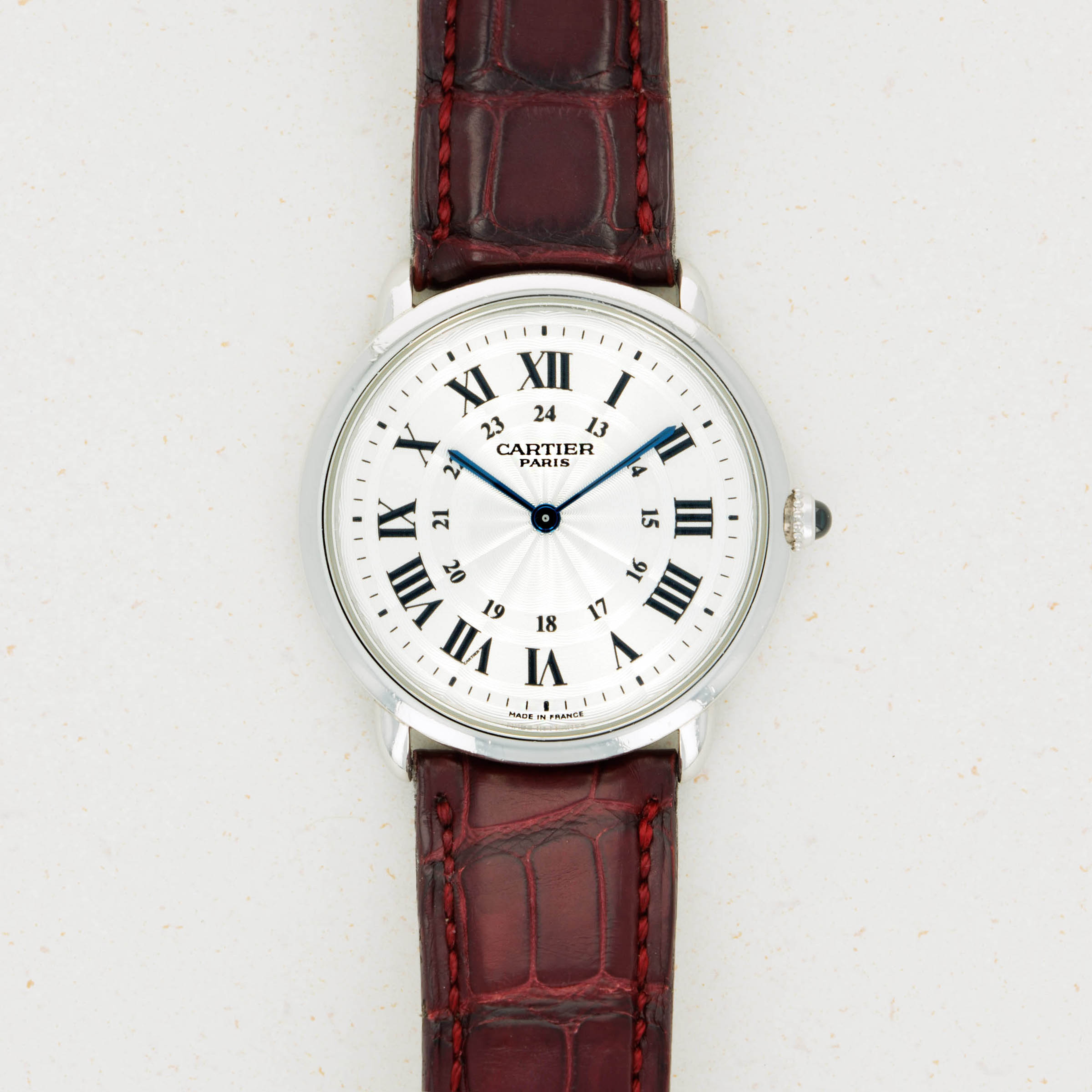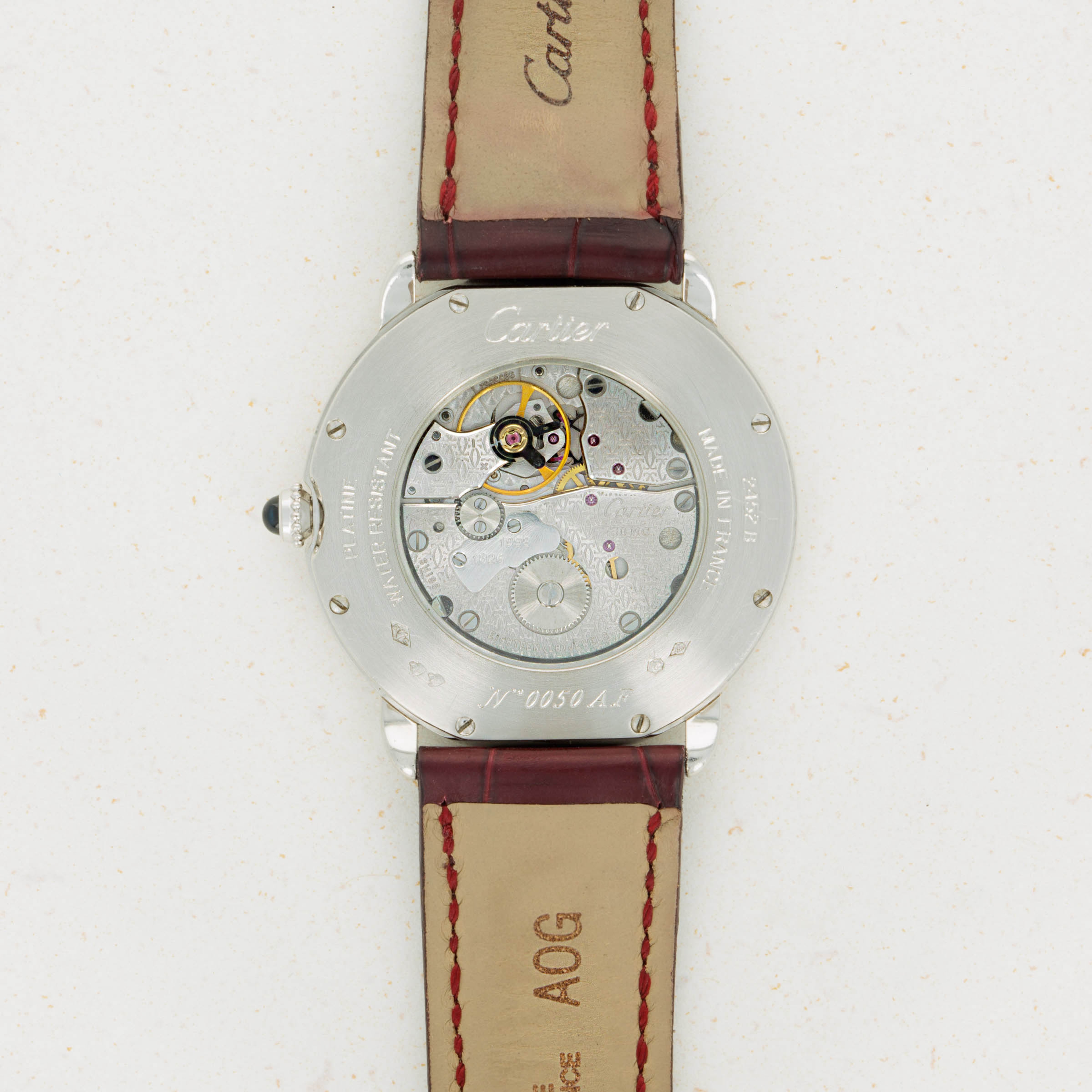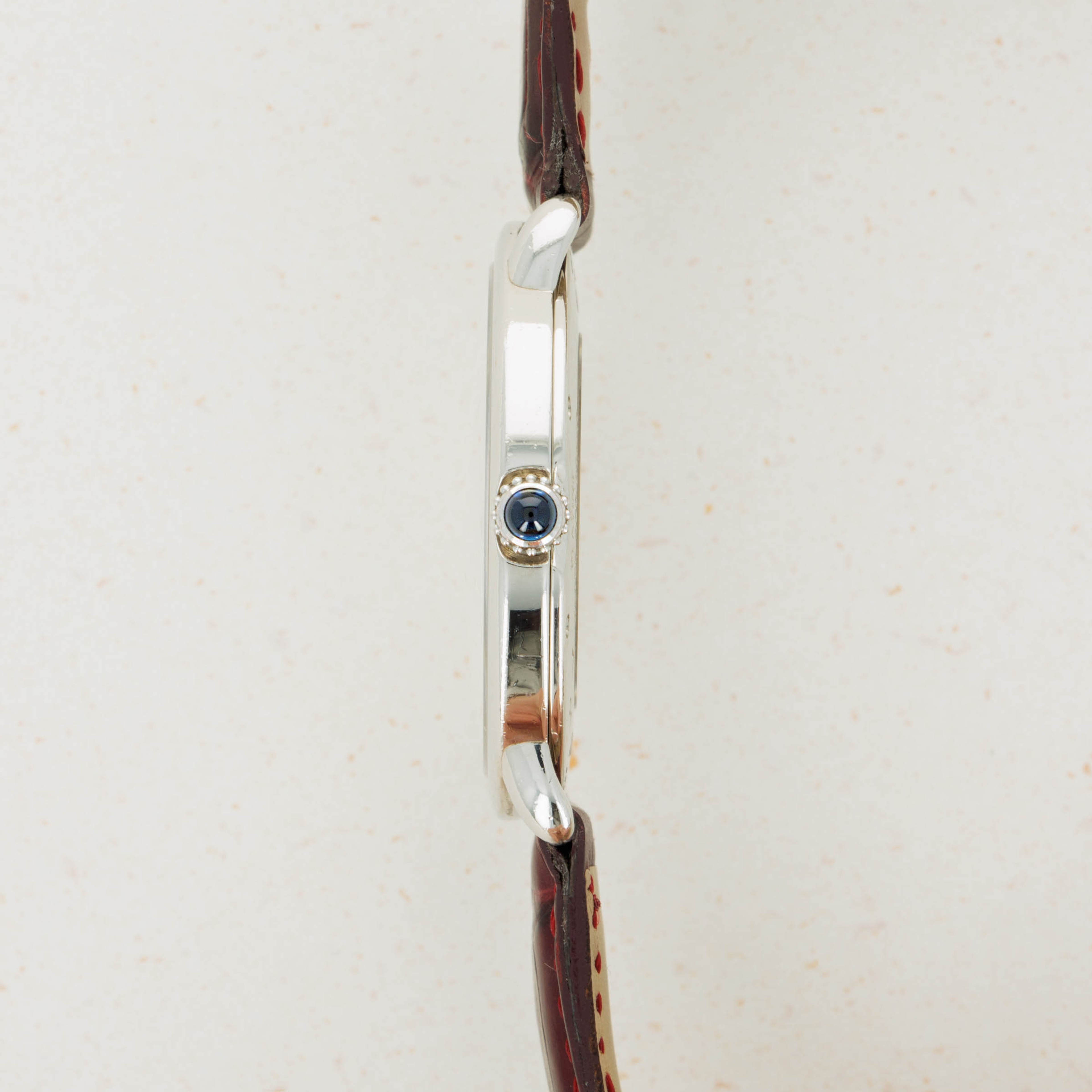 Elegantly reserved like so many of Cartier's iconic designs, the ref. 2452B's 34mm platinum case wears close to the wrist thanks to its thin profile resulting from its manual-wind cal. 430 MC movement. Unlike most of Cartier's creations made in Switzerland, the 2452B was made in a special workshop in France, where the firm's finest creations are born.