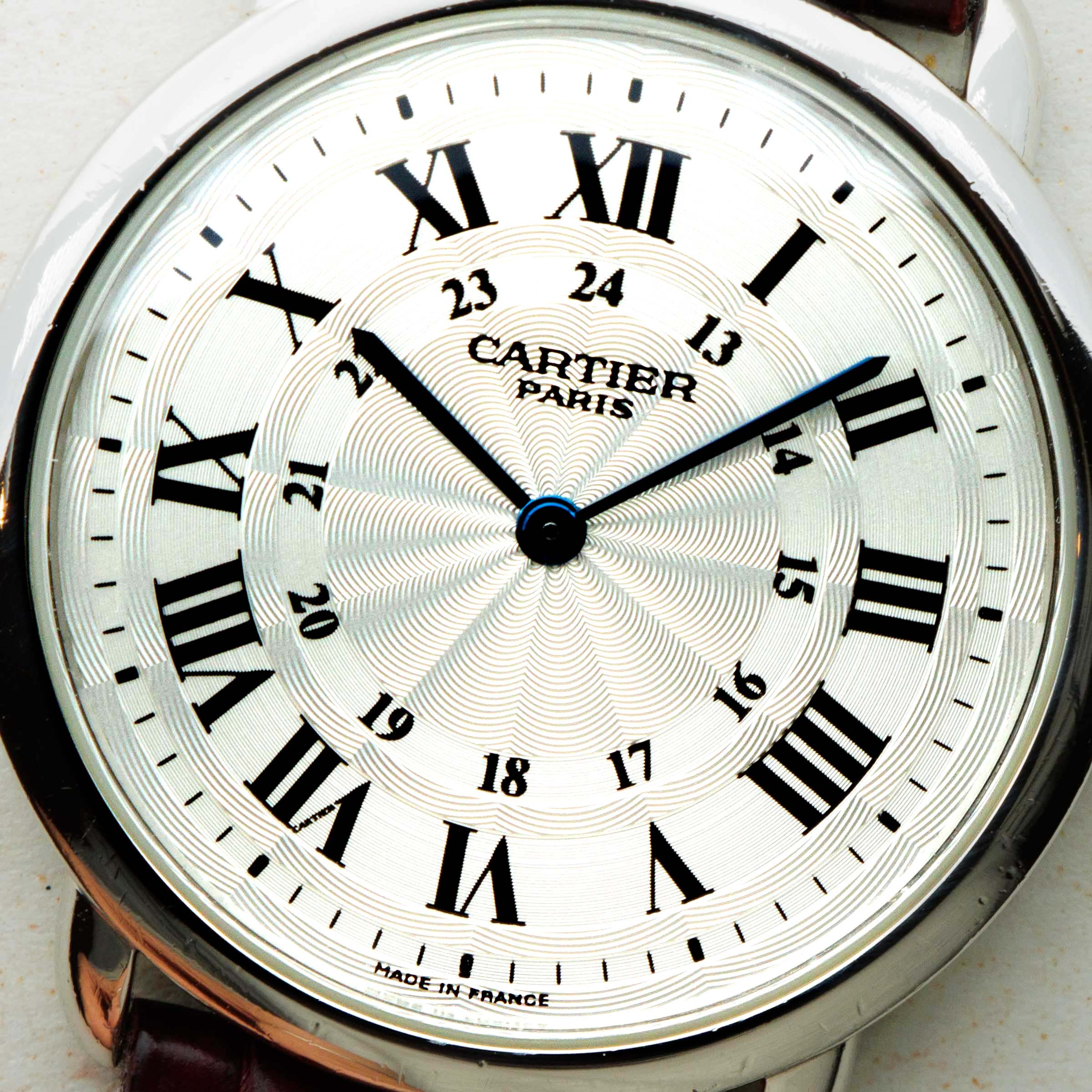 Launched in 1937, the Cartier Ronde Louis Cartier was one of the most elegant and modern timepieces of its generation. Featuring its characteristic round profile, short downturned lugs, and large dial contrasting its thin flat bezel, the Ronde’s design was truly ahead of its time, considering just how modern and timeless its design has remained to this day. Often produced in limited edition runs, it has quickly become a Cartier collector favorite over the decades. Belonging to one of those limited edition runs, this ref. 2542B that we have here hails from Cartier's esteemed high-horology program that began in 1998 and ran until 2008, the Collection Privée Cartier Paris (CPCP). As such, this example features some finer details that examples from outside of the CPCP lack, such as a wonderfully finished manual-wind cal. 430 MC movement on display behind a sapphire crystal caseback and an exquisitely decorated silver rosette guilloche dial with blued steel hands and black Roman numerals encircling a 24-hour scale. Sitting on a leather strap with a platinum Cartier folding clasp, this example is remarkably luxurious and understated as a result of its monochromatic aesthetic – a truly Cartier-esque combination indeed.