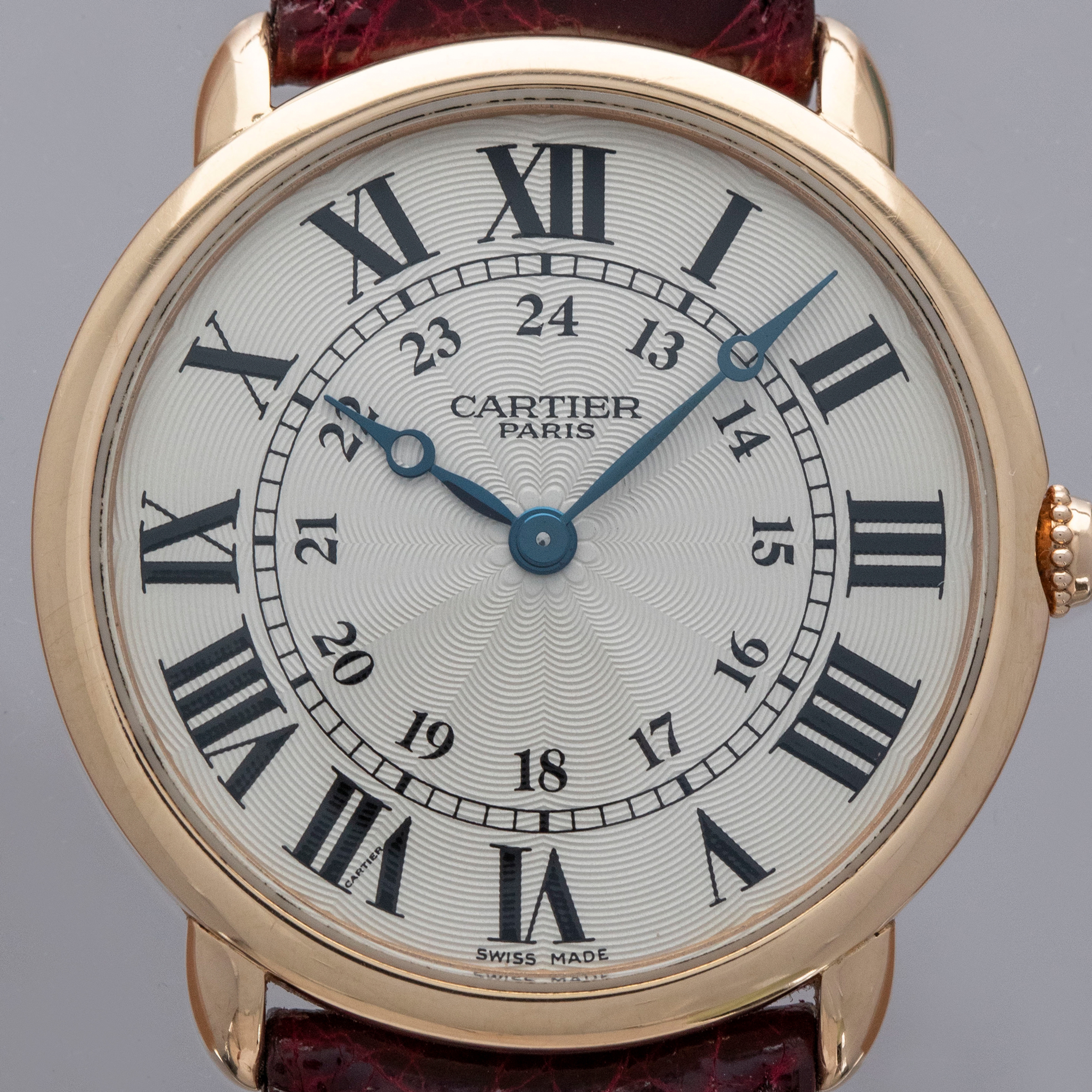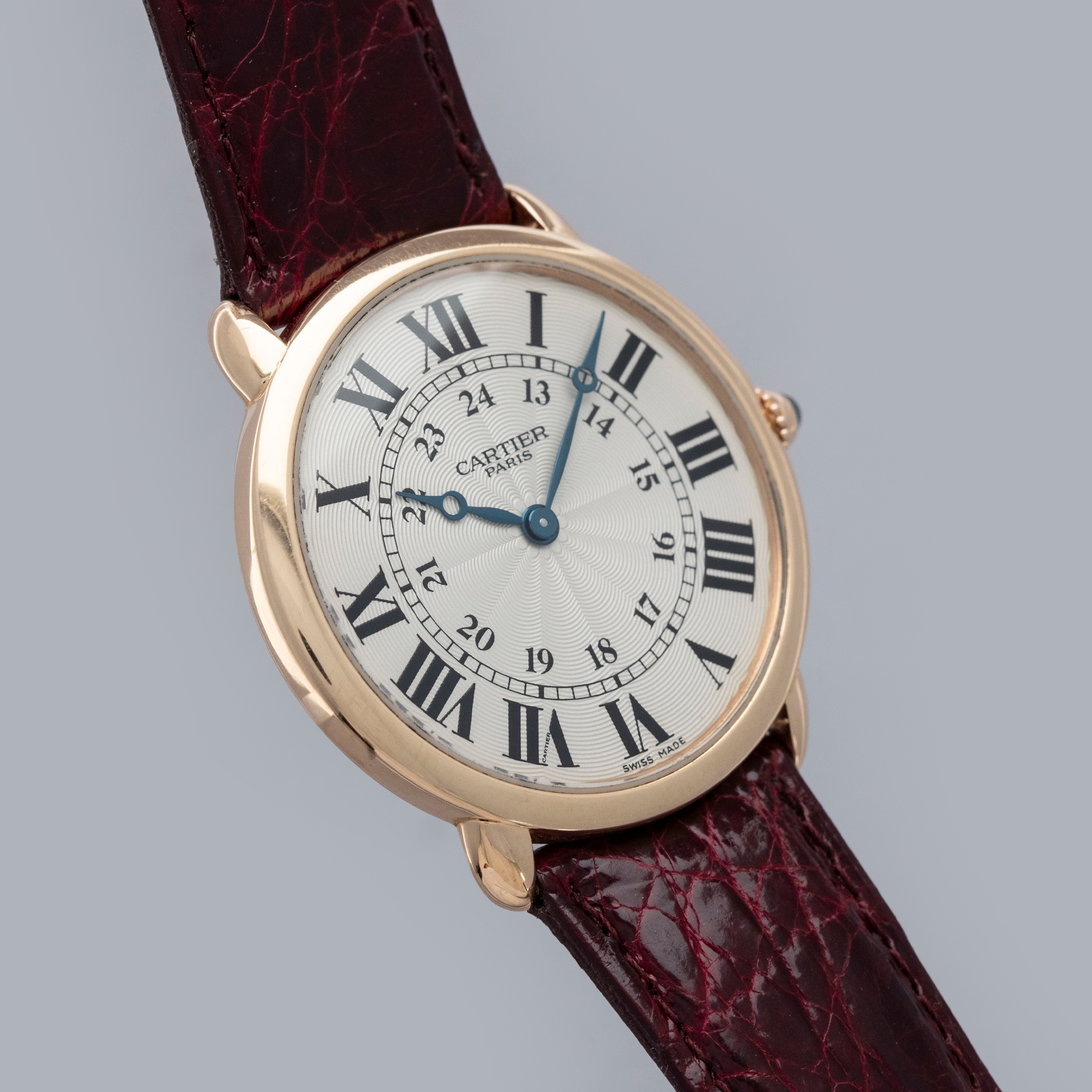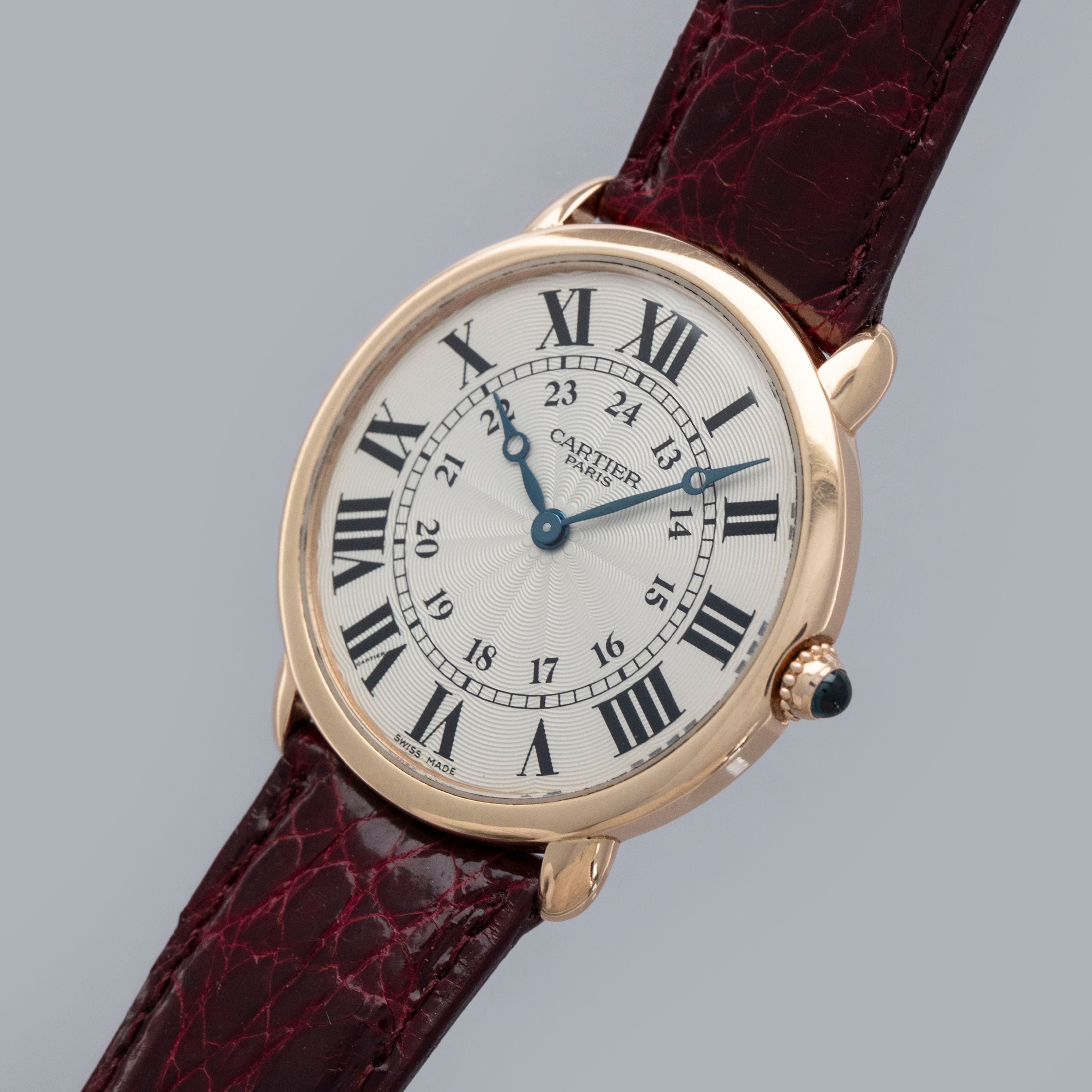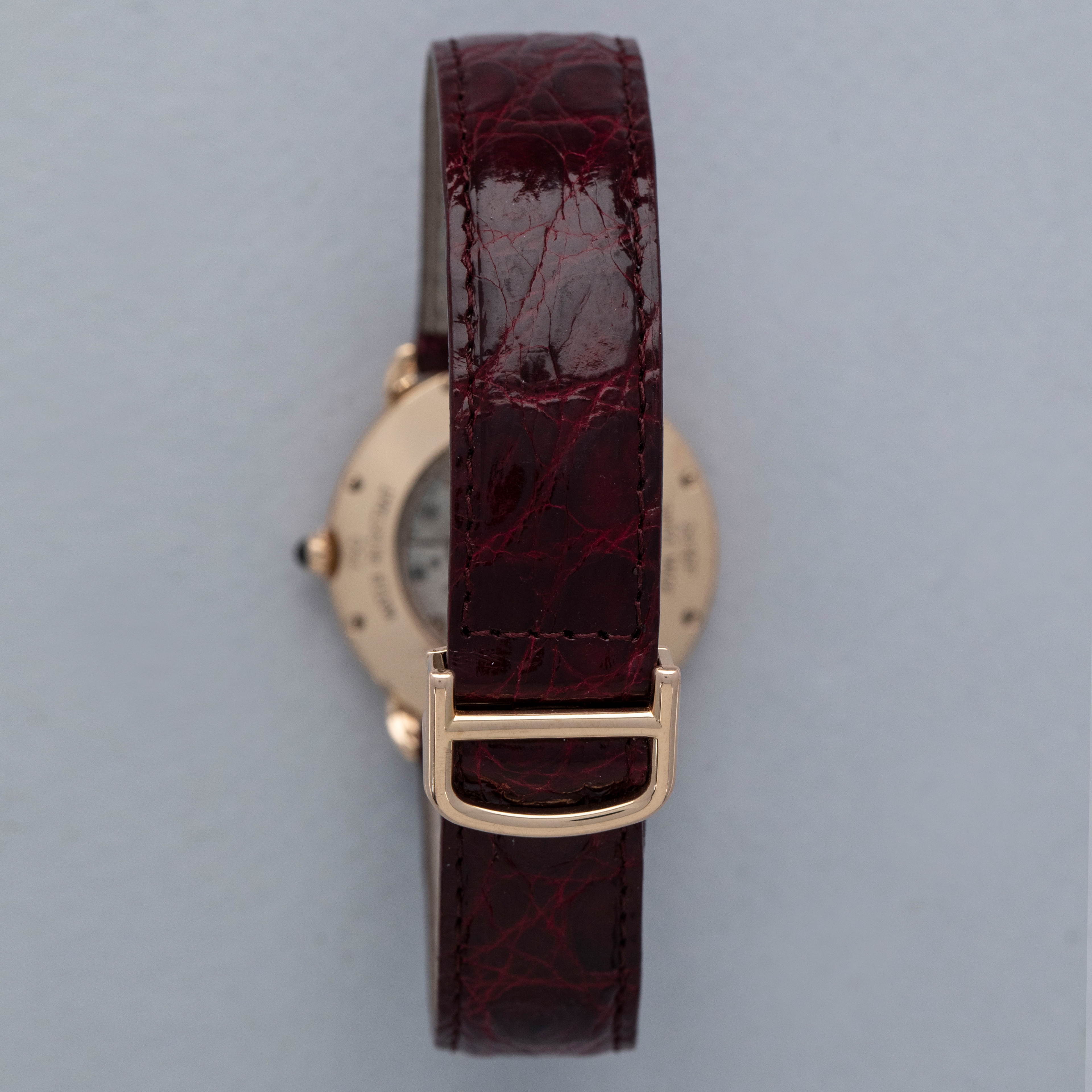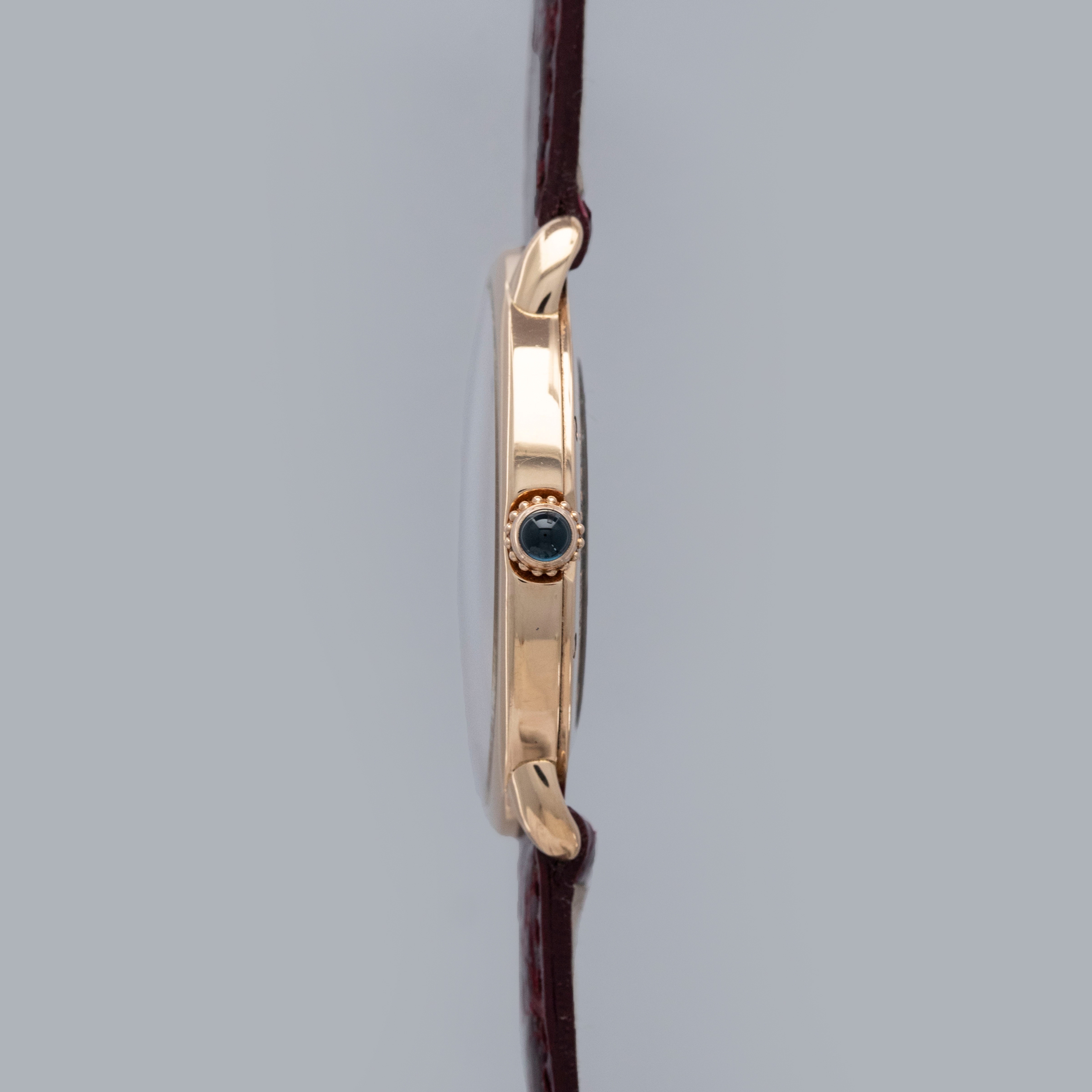 The watch is in overall excellent condition. The rose gold case shows some light scratches and marks on the bezel and case sides. The display case back has well-defined engravings, though the hallmarks show light wear. The cabochon winding crown is in excellent condition. The guilloché dial and blued hands are near mint. The watch is fitted with a Cartier burgundy alligator strap with a yellow gold deployant clasp, both in excellent condition.