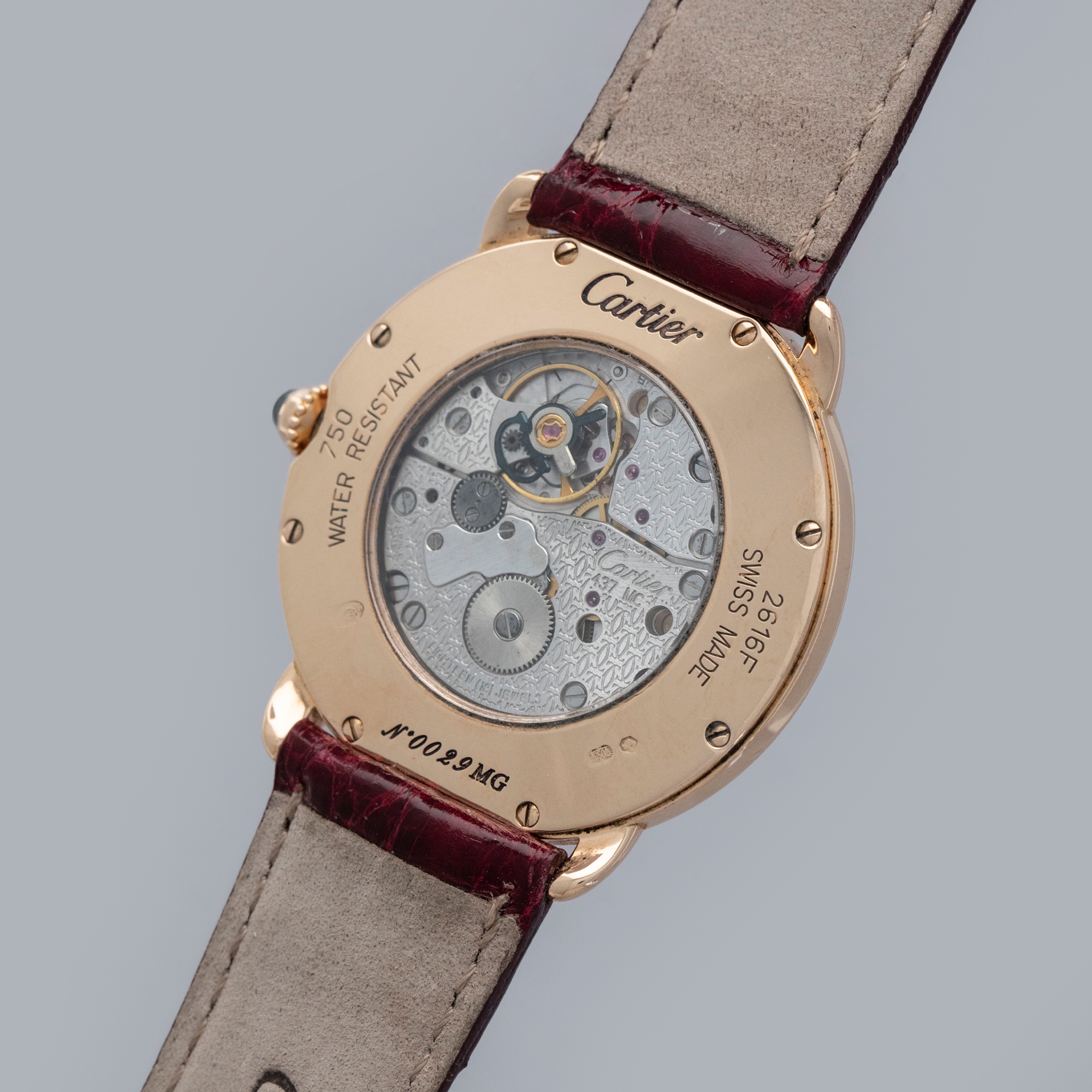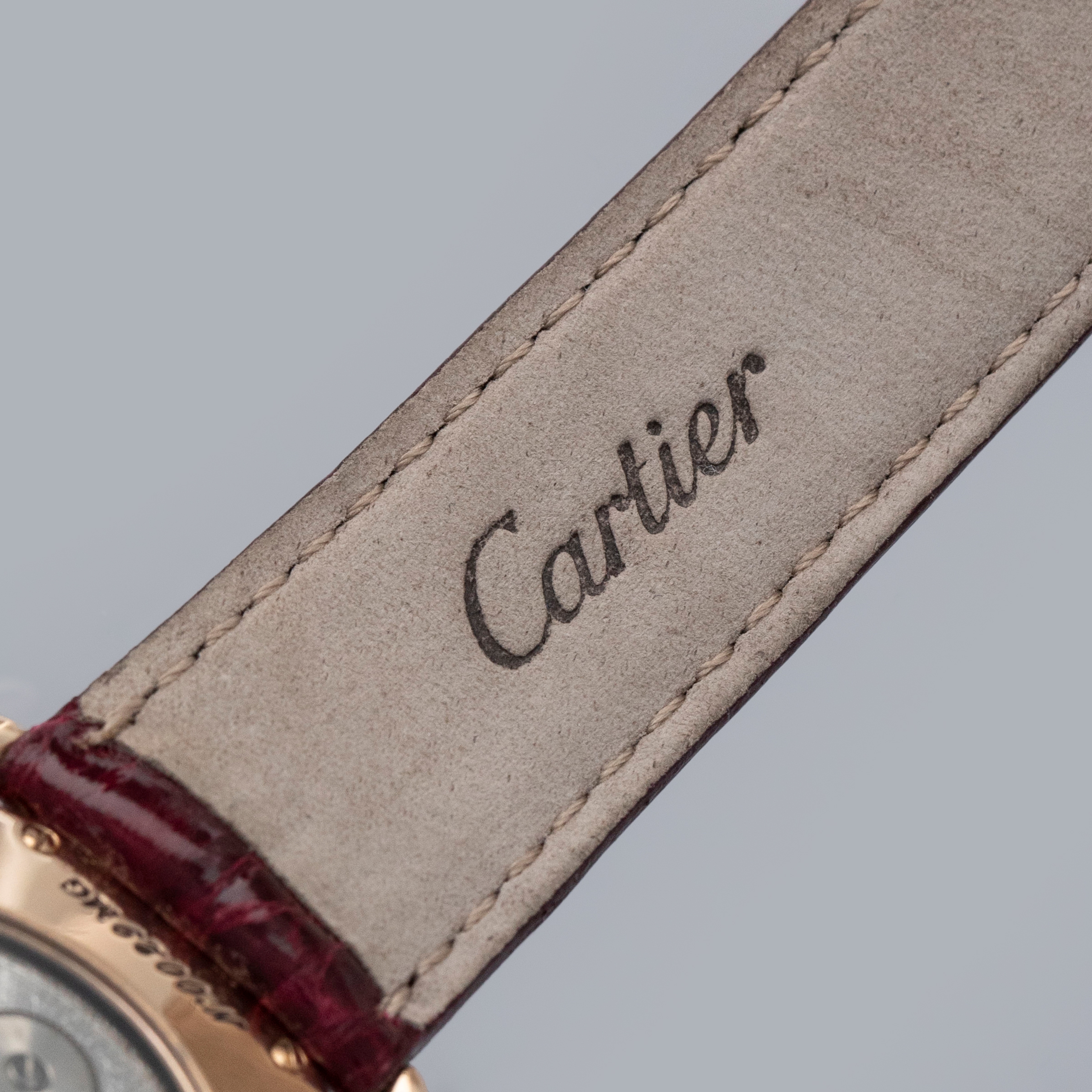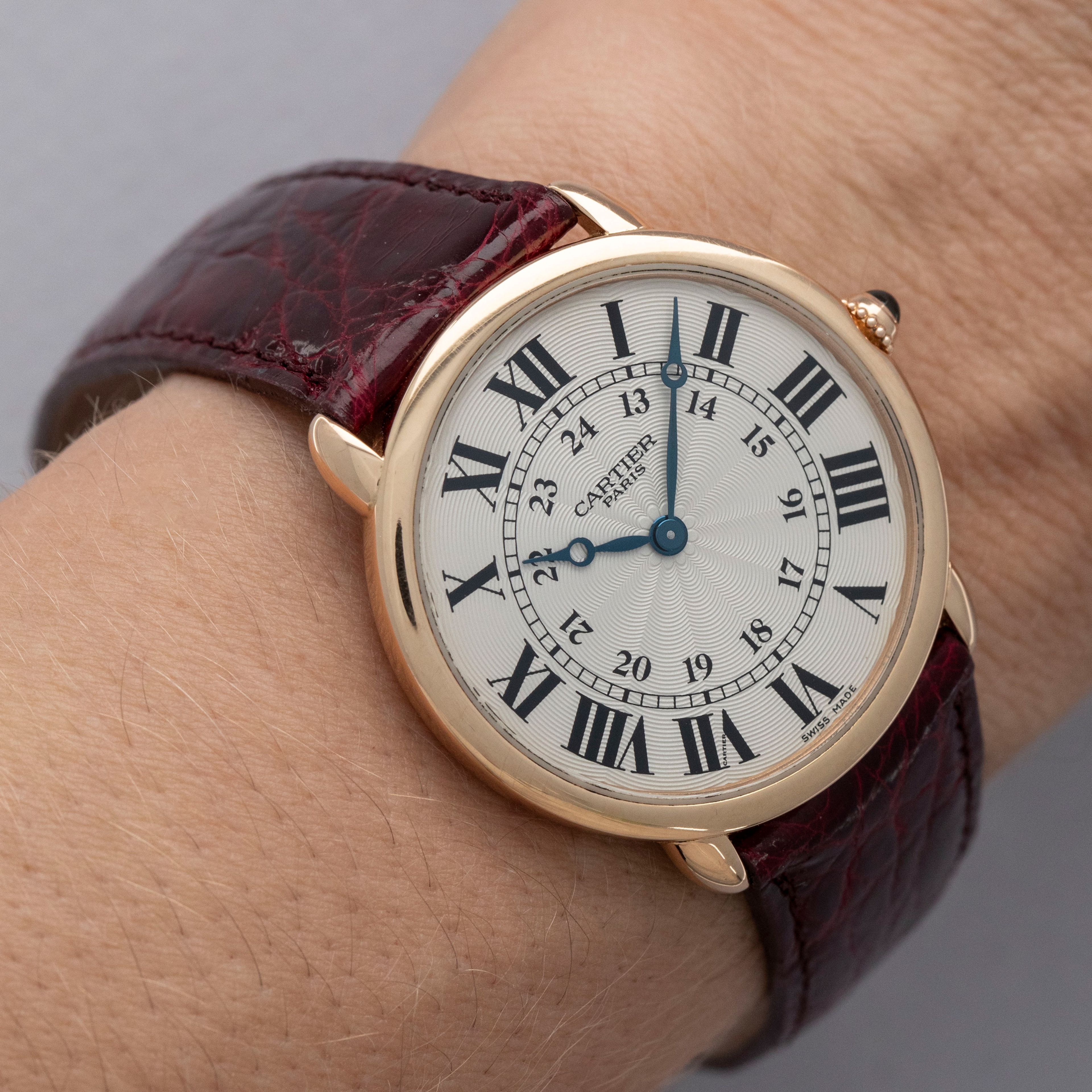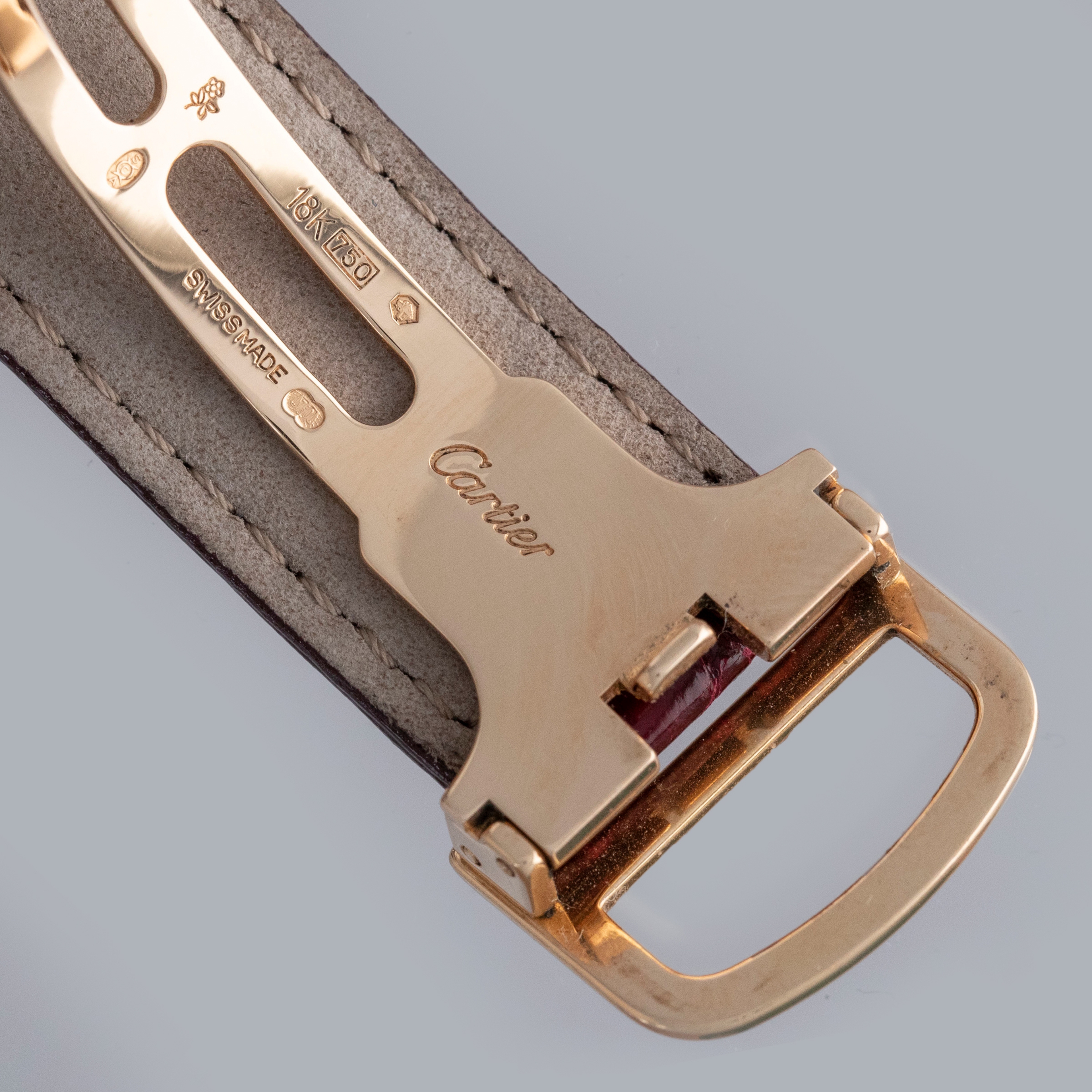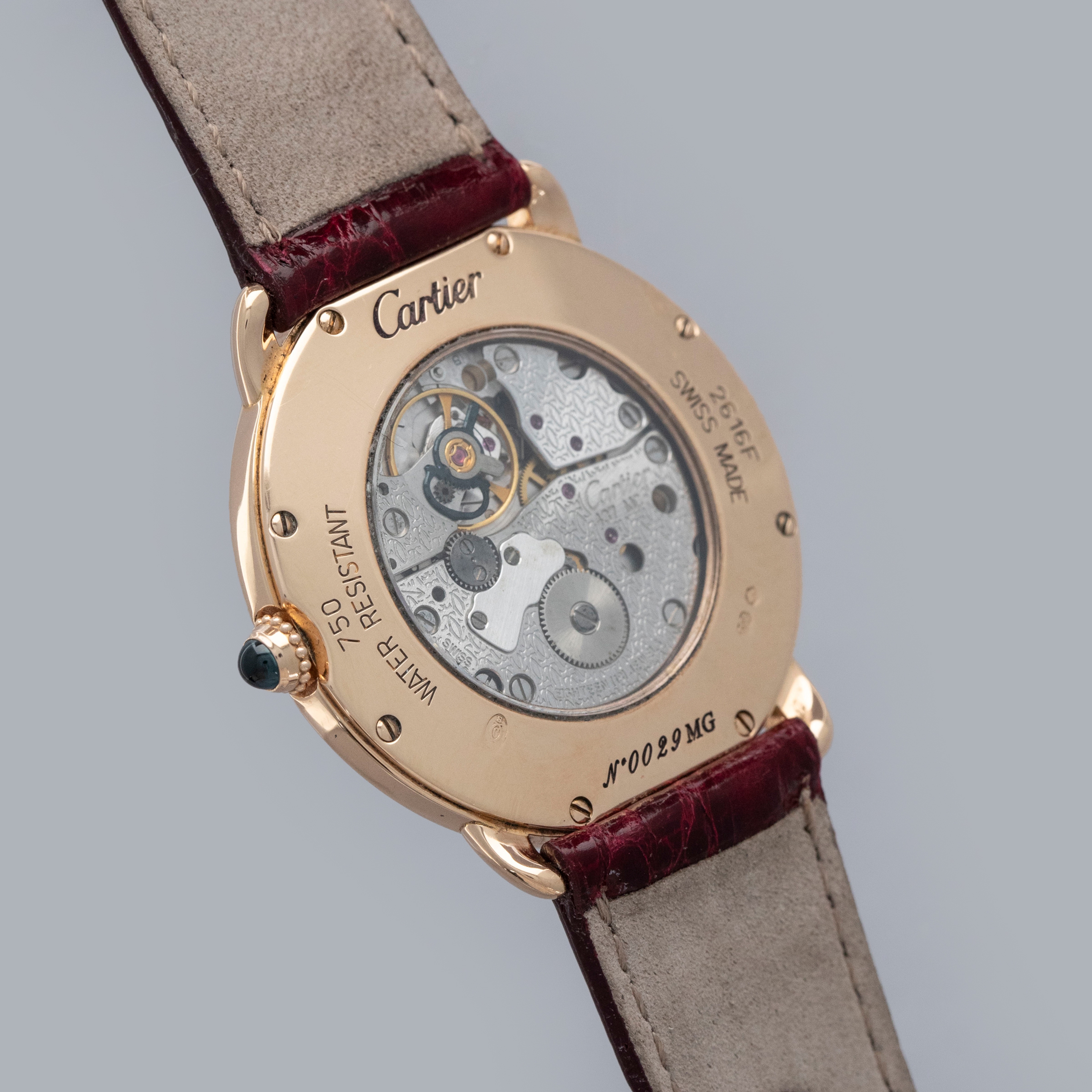 The watch is in overall excellent condition. The rose gold case shows some light scratches and marks on the bezel and case sides. The display case back has well-defined engravings, though the hallmarks show light wear. The cabochon winding crown is in excellent condition. The guilloché dial and blued hands are near mint. The watch is fitted with a Cartier burgundy alligator strap with a yellow gold deployant clasp, both in excellent condition.