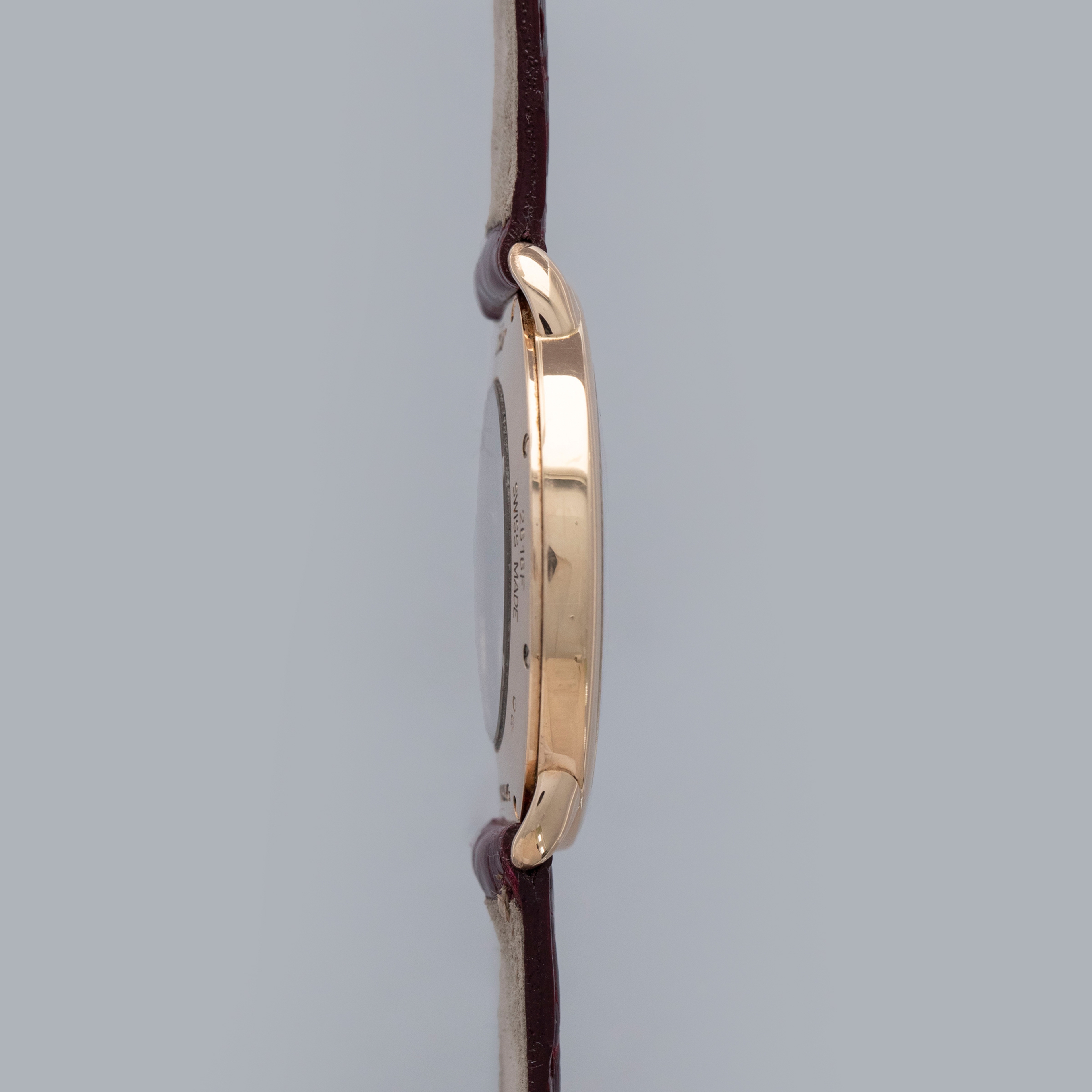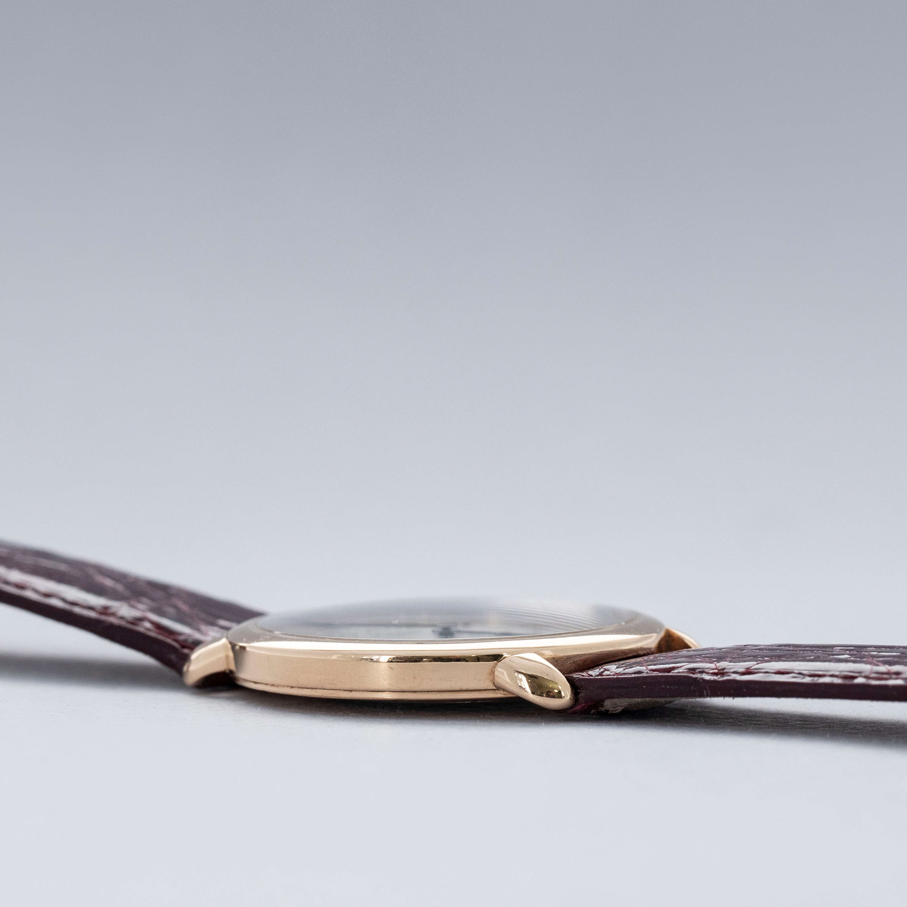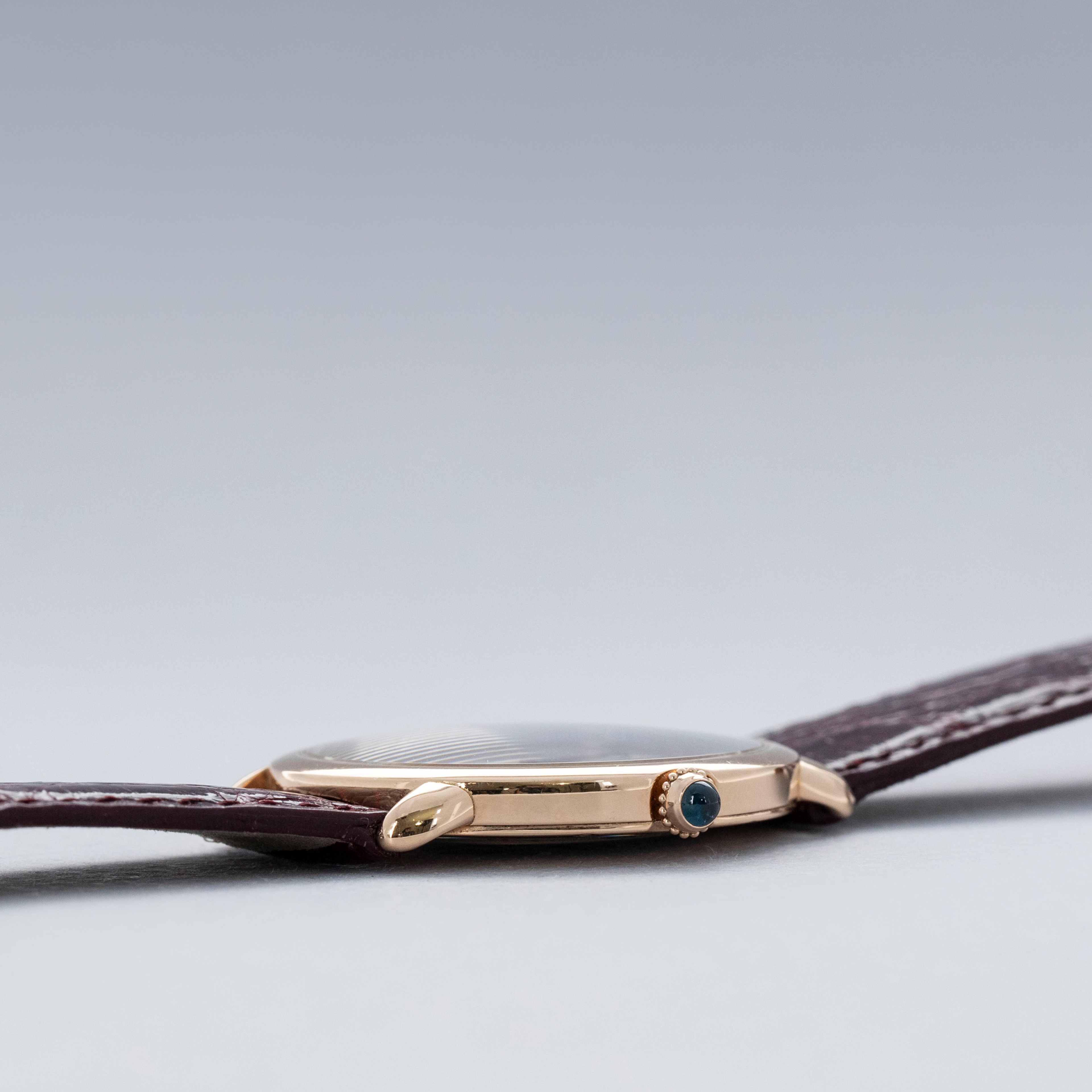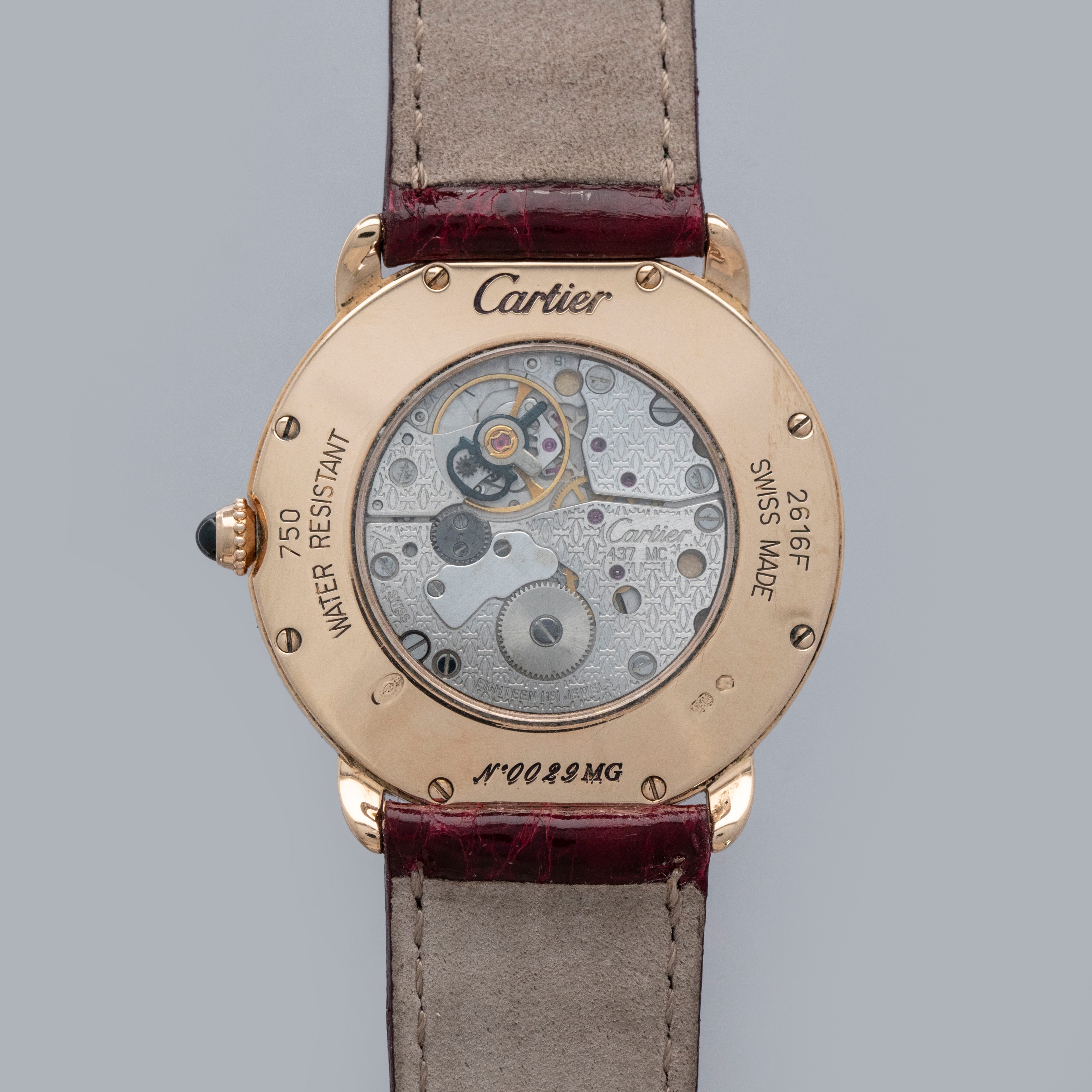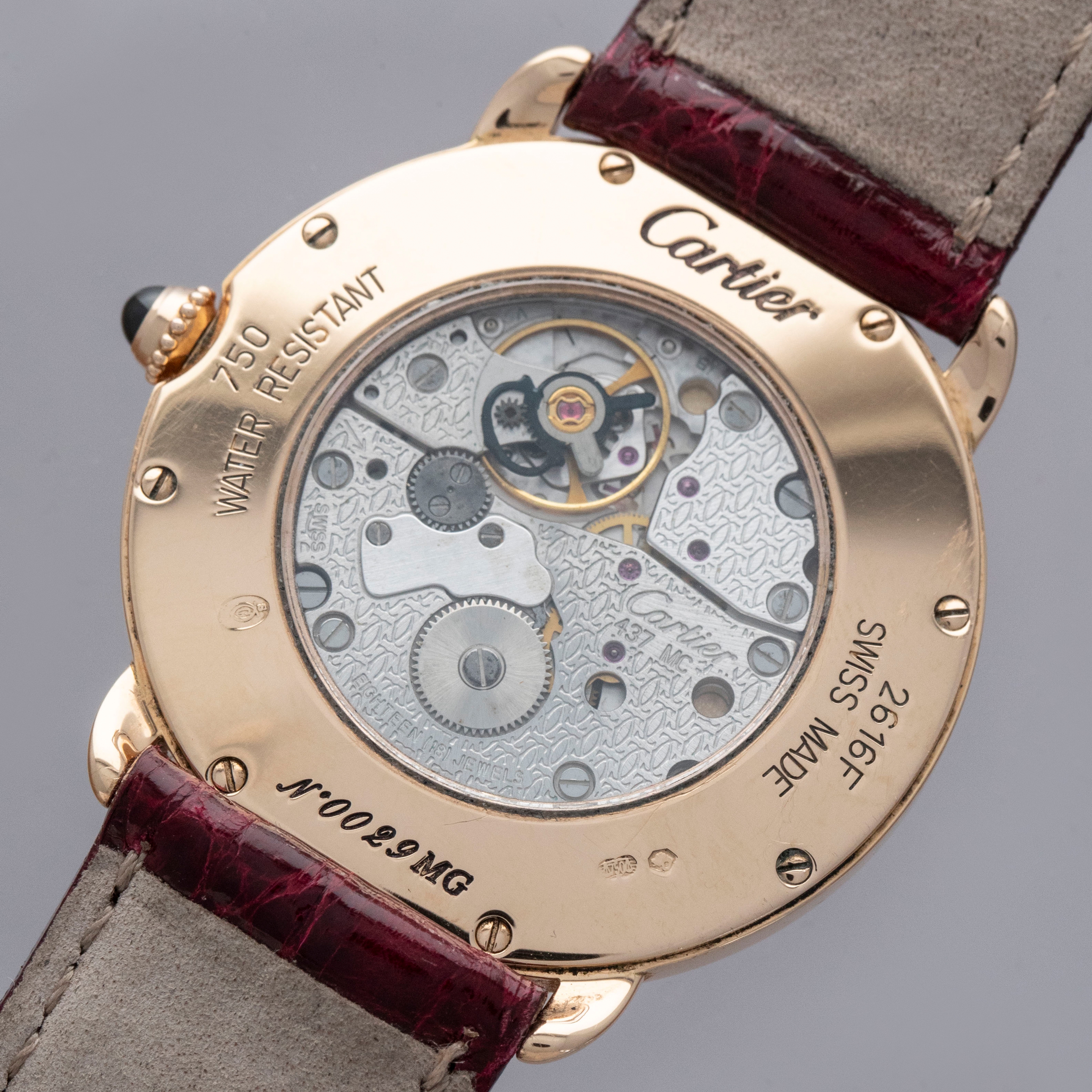 The watch is in overall excellent condition. The rose gold case shows some light scratches and marks on the bezel and case sides. The display case back has well-defined engravings, though the hallmarks show light wear. The cabochon winding crown is in excellent condition. The guilloché dial and blued hands are near mint. The watch is fitted with a Cartier burgundy alligator strap with a yellow gold deployant clasp, both in excellent condition.