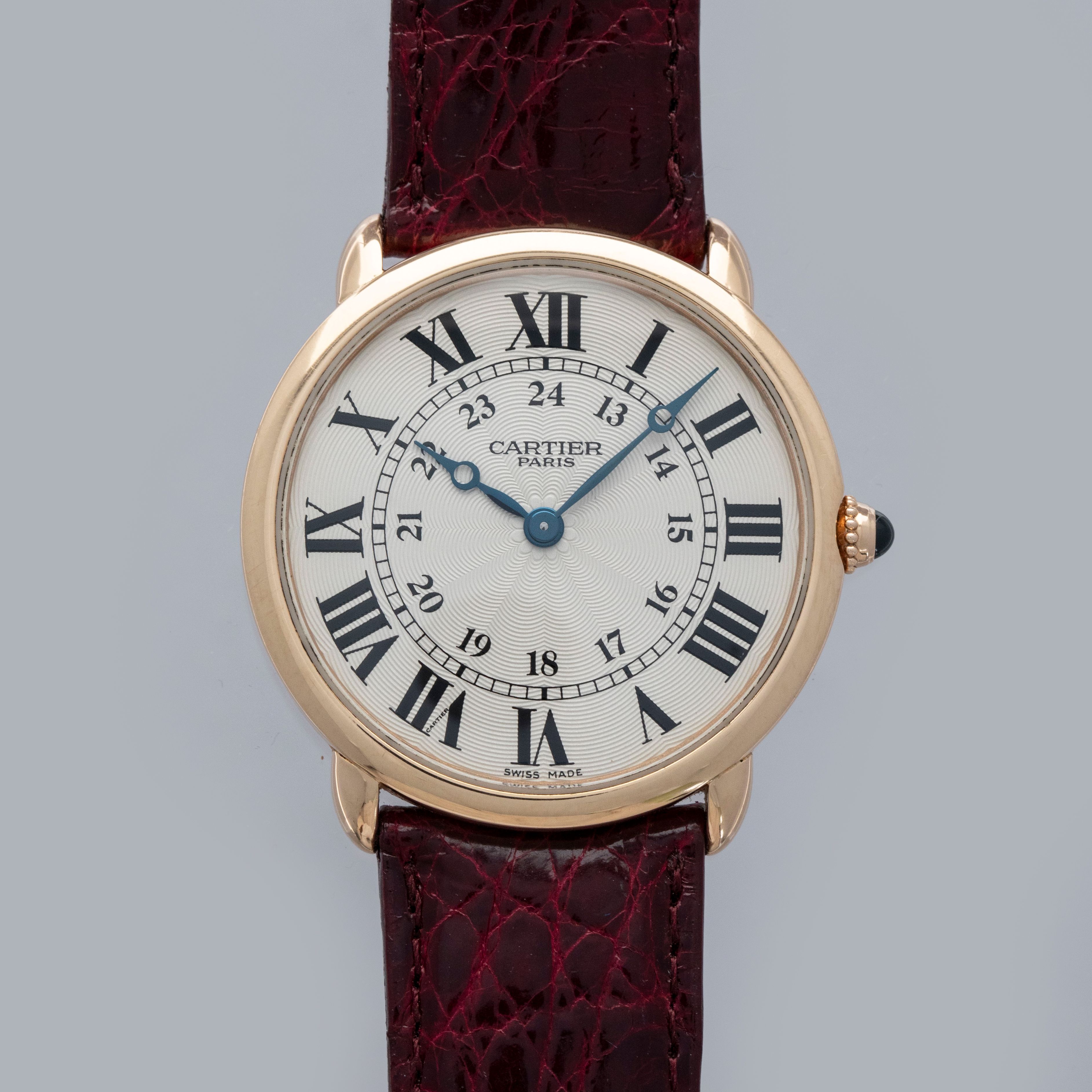 Launched in 1937, the Cartier Ronde Louis Cartier was one of the most elegant and modern timepieces of its generation. Featuring its characteristic round profile, short downturned lugs, and large dial contrasting its thin flat bezel, the Ronde’s design was truly ahead of its time, considering just how modern and timeless its design has remained to this day. Often produced in limited edition runs, it has quickly become a Cartier collector favorite over the decades. Belonging to one of those limited edition runs, this ref. 2616F that we have here hails from Cartier's esteemed high-horology program that began in 1998 and ran until 2008, the Collection Privée Cartier Paris (CPCP). As such, this example features some finer details that examples from outside of the CPCP lack, such as a wonderfully finished manual-wind cal. 437 MC movement on display behind a sapphire crystal caseback and an exquisitely decorated silver rosette guilloche dial with blued steel hands and black Roman numerals encircling a 24-hour scale. Sitting on a leather strap with a case-matching 18kt rose gold Cartier deployant buckle, this example is remarkably luxurious and understated as a result of its monochromatic aesthetic – a truly Cartier-esque combination indeed.