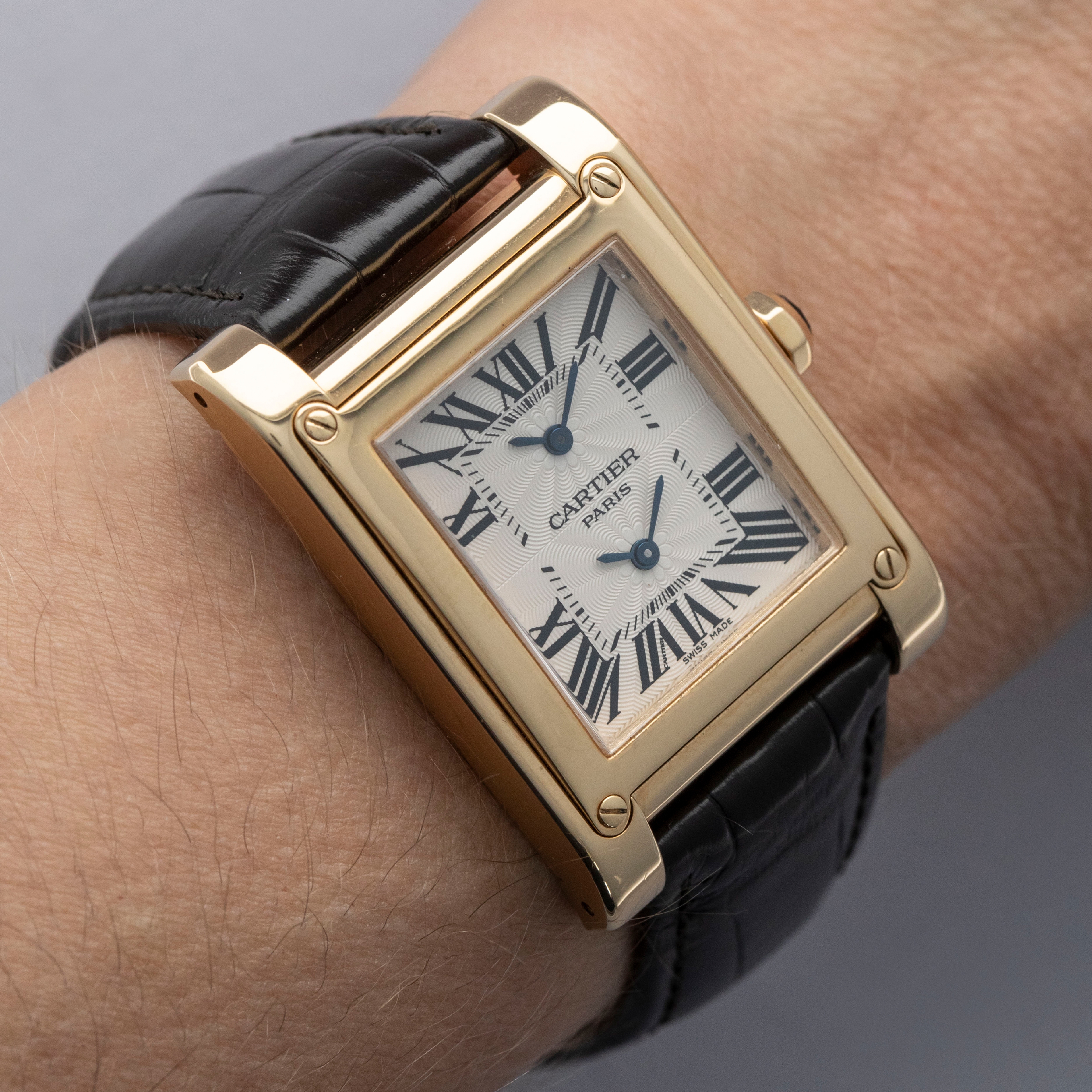 Throughout their history, Cartier has developed a powerful history as a revered watchmaker. While their reputation waned in the 80s and 90s due to producing jewelry-oriented quartz timepieces, they made a conscious effort to turn things around in 1998 by launching the Collection Privée Cartier Paris, or CPCP, at SIHH to demonstrate their horological prowess. By partnering with THA Èbauche, a collaborative movement manufacture made up of Vianney Halter, Denis Flageollet (founder of De Bethune), and François-Paul Journe, Cartier began to challenge the horological heavyweights with truly spectacular timepieces, much like this Tank A Vis ref. 2551. Featuring the Tank’s signature rectangular construction in 18k yellow gold, a stunningly finished manual-wind movement, and an elaborately decorated silver dual time dial, the Tank A Vis ref. 2551 lives up to the CPCP’s deserved status as one of Cartier’s finer creations. With its elegant dial and wonderfully luxurious precious metal construction, the Tank A Vis signified Cartier’s return to watchmaking form with a watch that emphasized their iconic design while also showcasing their watchmaking prowess. With its two displays, silver CPCP rosette engraved dial, and enlarged 28mm x 40mm case, the Tank A Vis is a wonderfully wearable timepiece that still retains Cartier's elegant design language while exercising some horological muscles in a rather elegant manner.