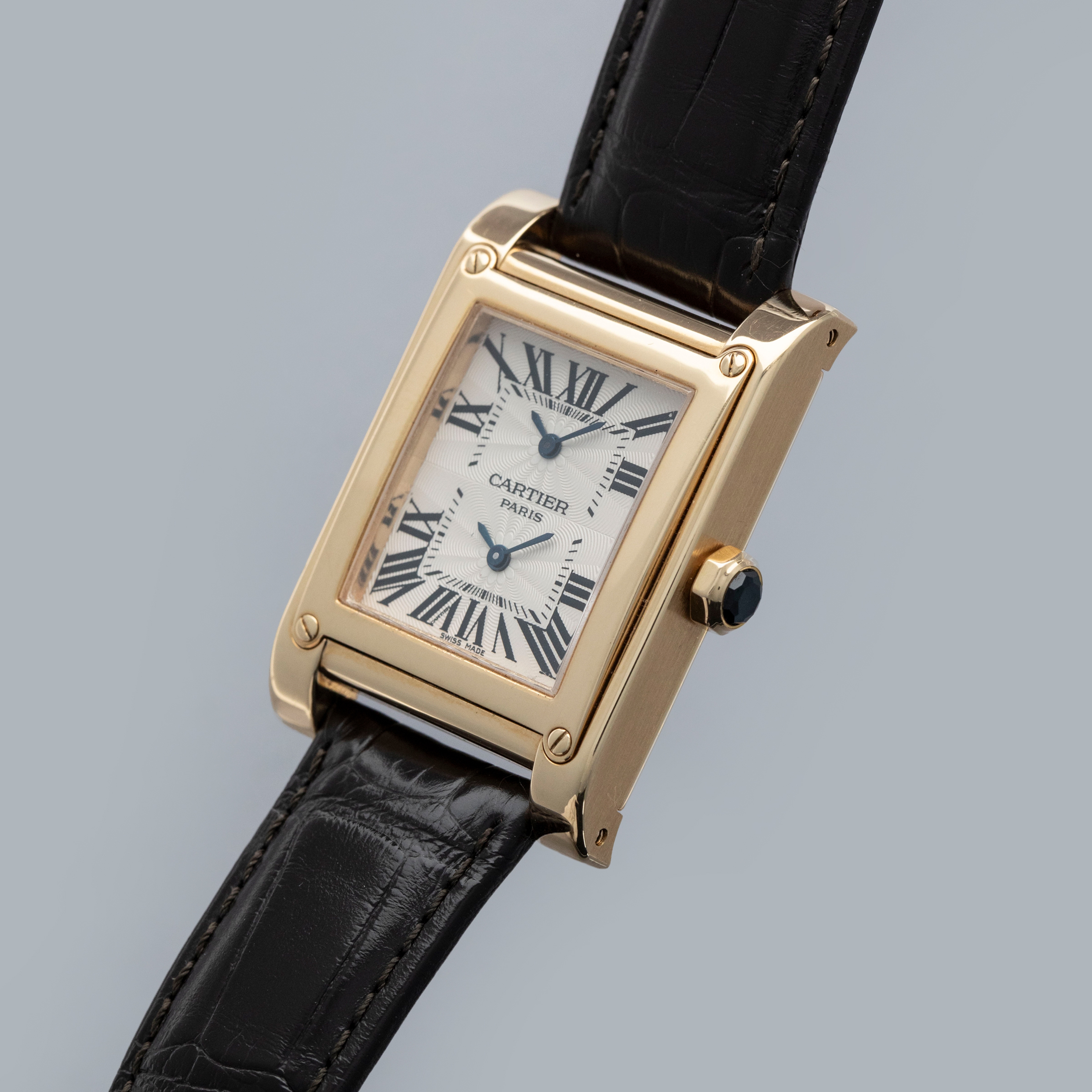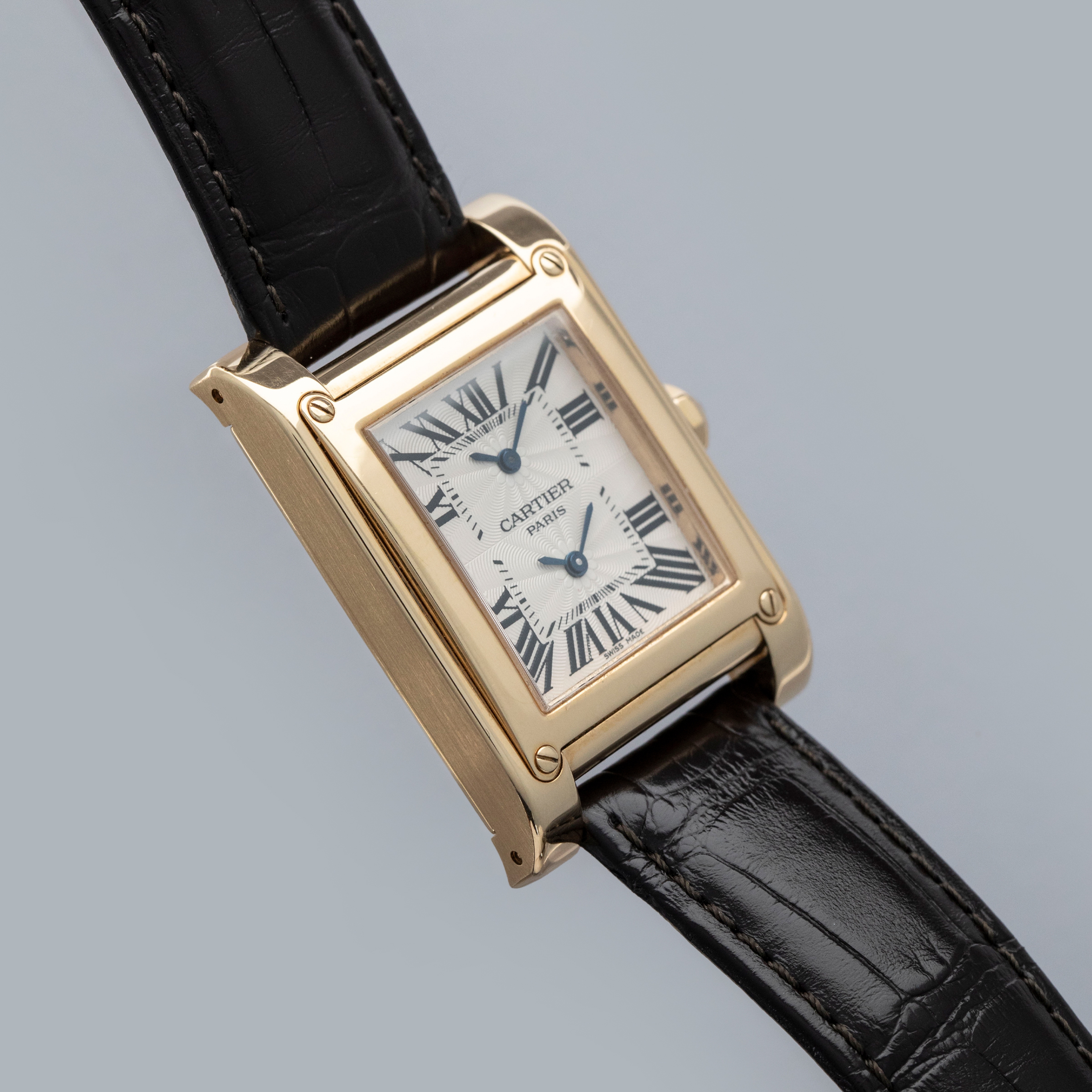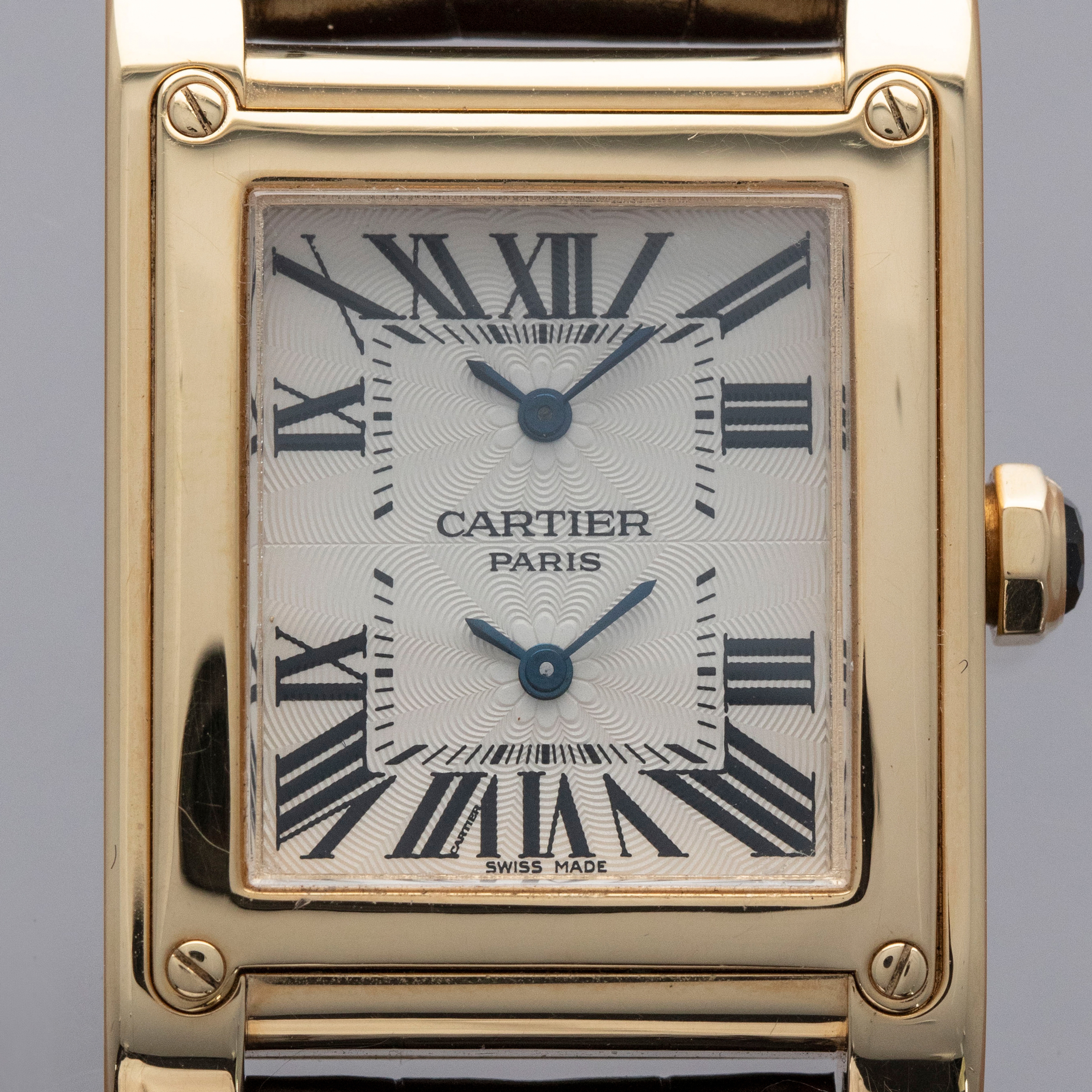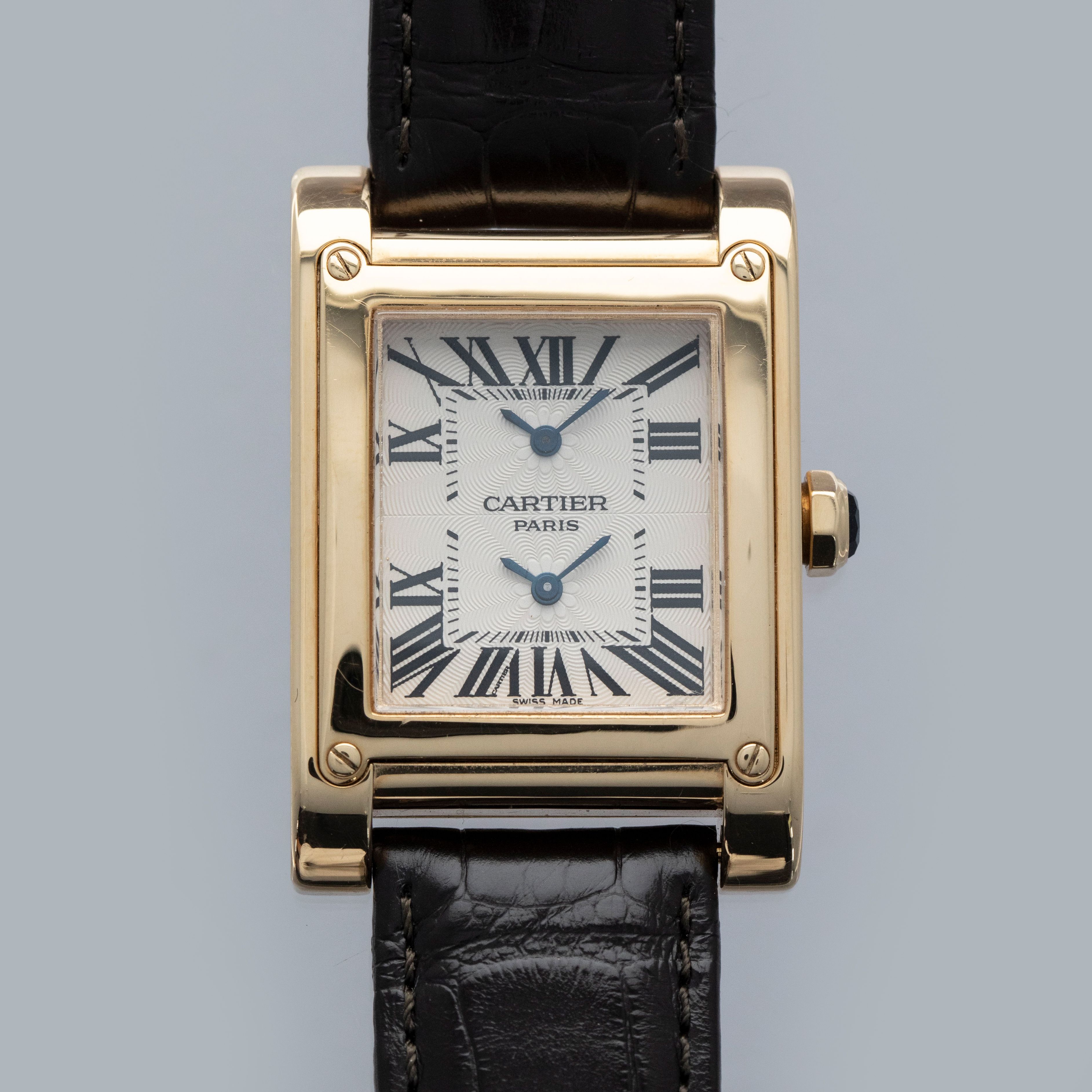 Containing the CPCP's signature rosette guilloche pattern alongside blued steel hands and black Roman numerals, this Tank À Vis ref. 2551's silver dual-time dial wonderfully showcases Cartier's incredibly iconic design language across its two timezones.