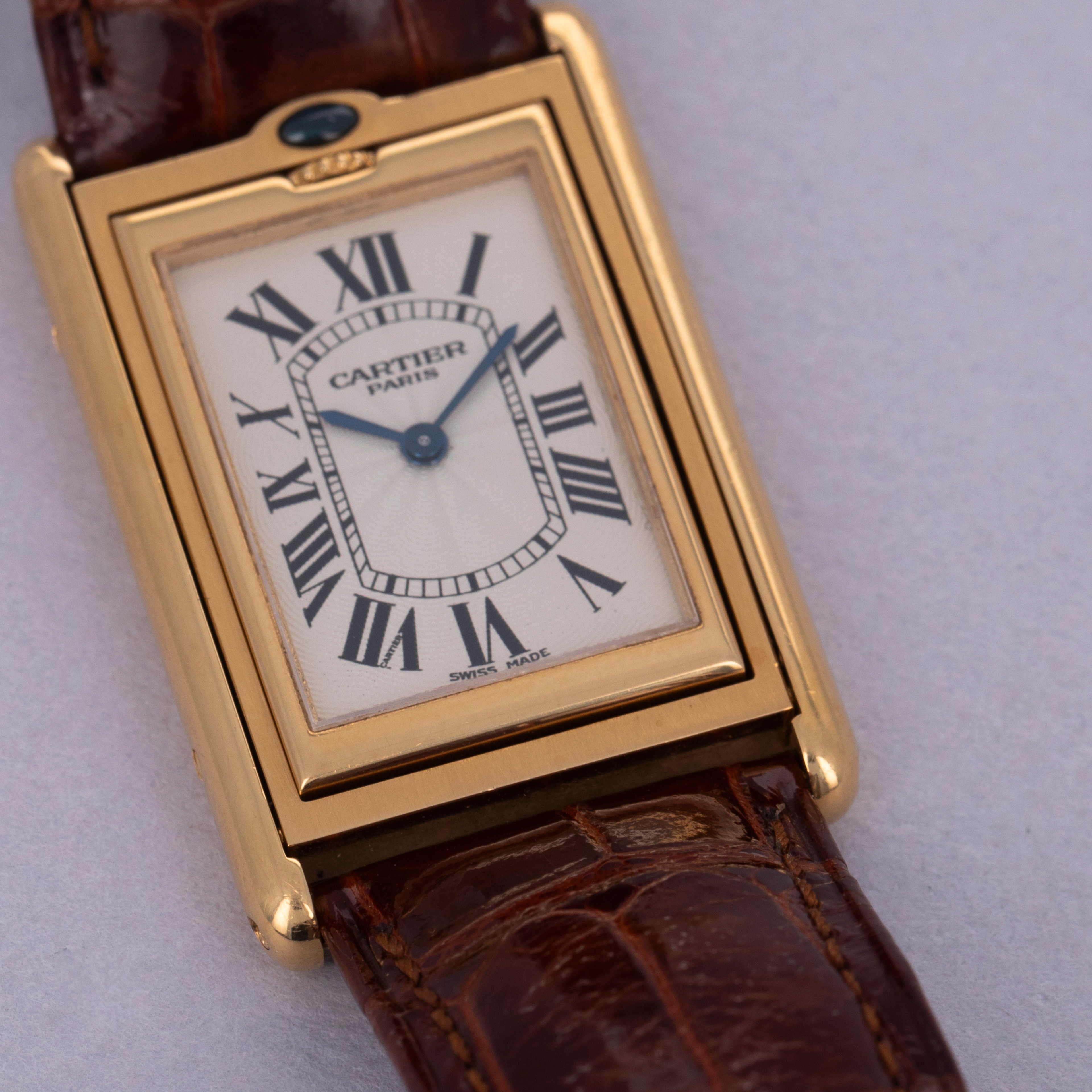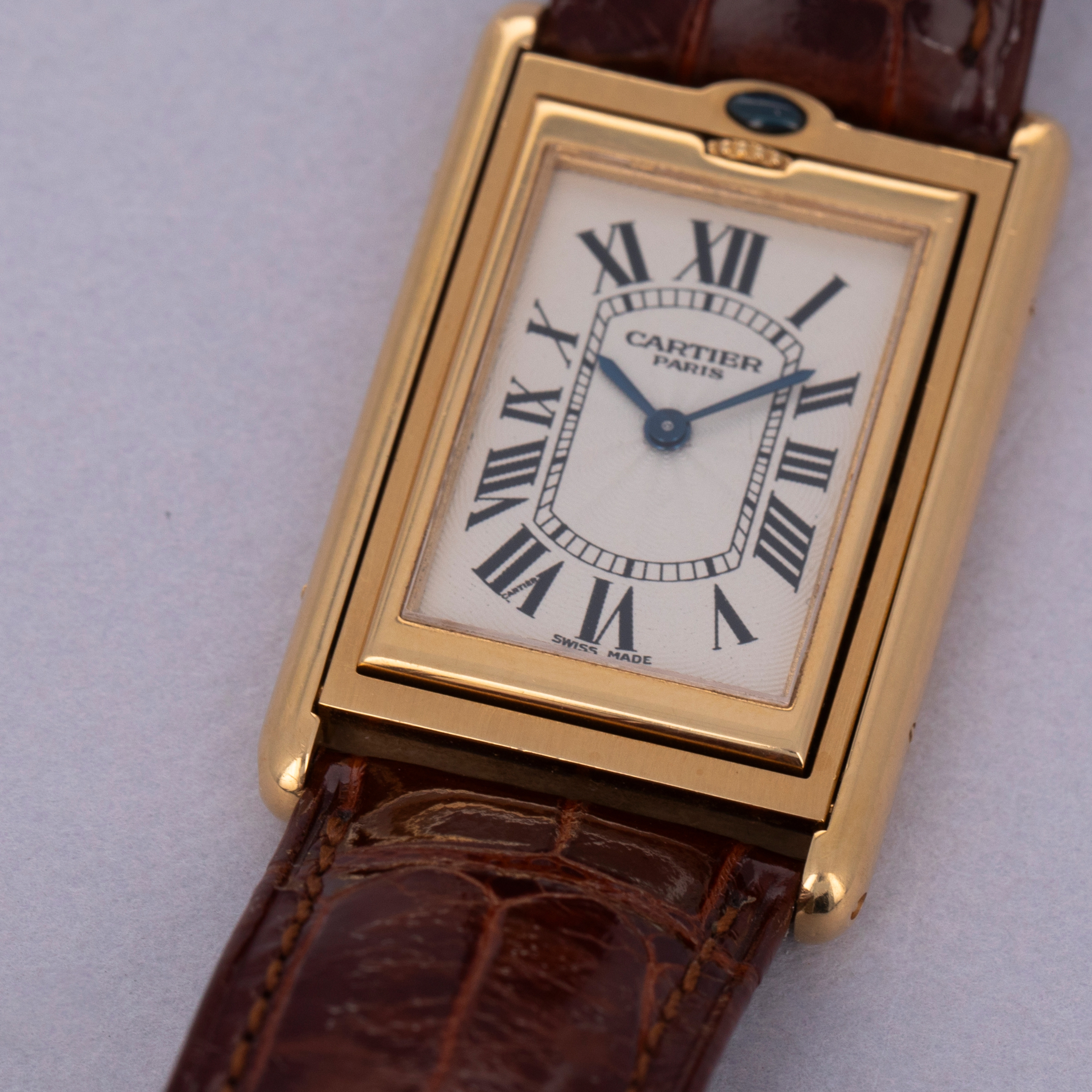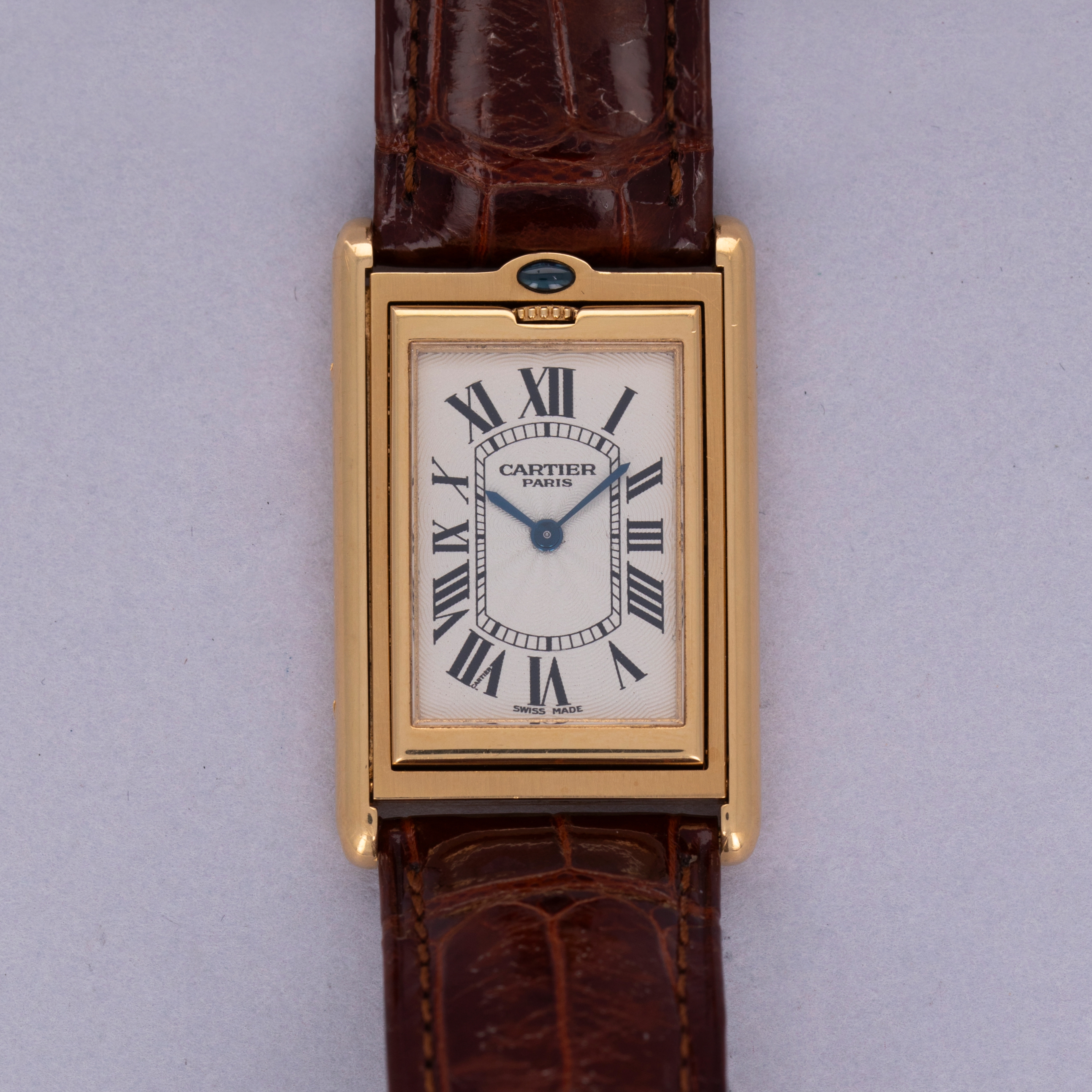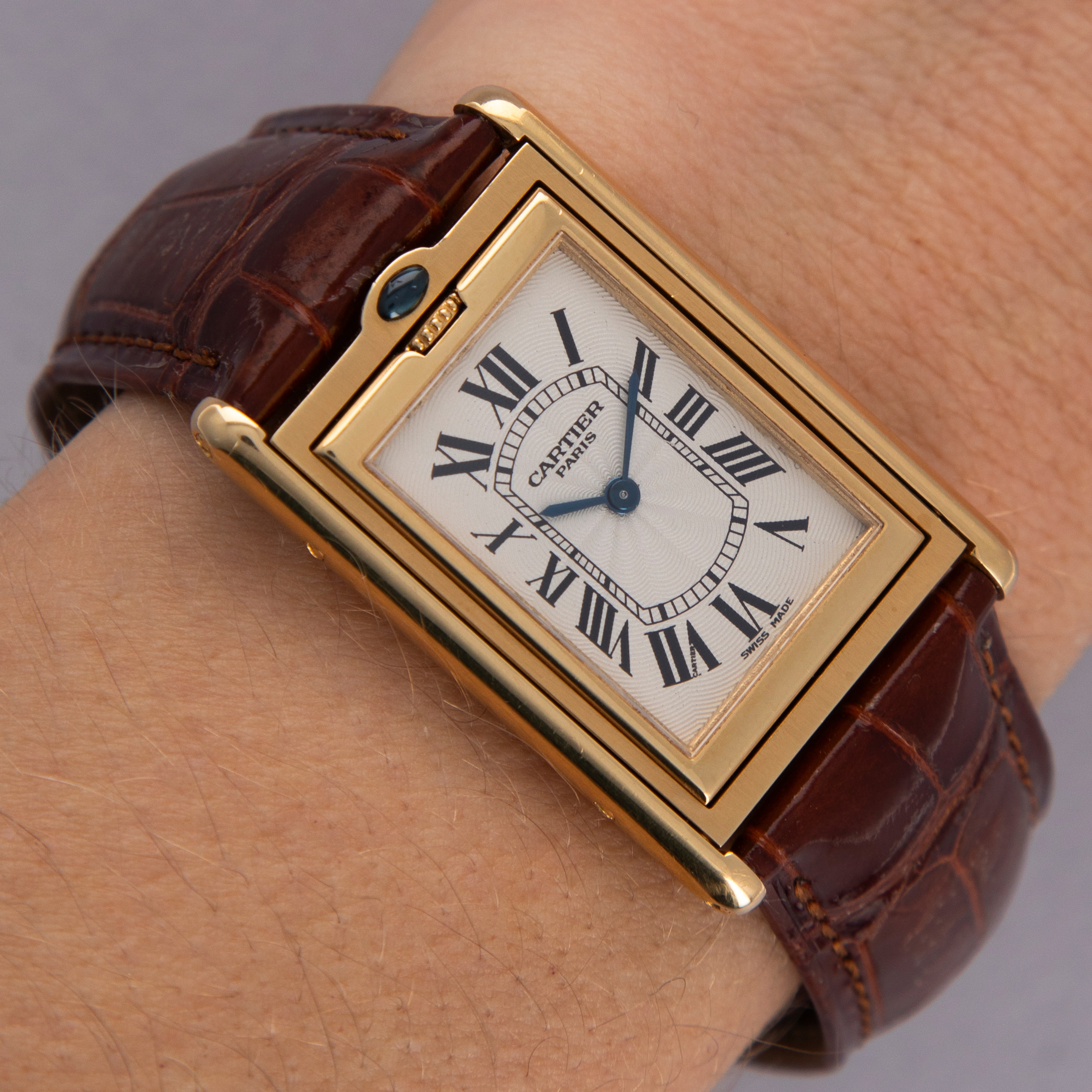 An incredibly iconic timepiece, the Cartier Tank features one of the most easily recognizable watch designs of all time. With its thin rectangle-shaped case and elegant dial, it remains as classical a timepiece today as when it was first released in 1917. Inspired by the Renault FT-17 Tank, the Cartier Tank is, somewhat ironically, a dress watch. Recognizing the need for a more robust variant, Cartier released the Tank Basculante. Launched in 1933, Cartier took inspiration from the JLC Reverso, another classically styled early sports watch that would rotate within its case, to create the Tank Basculante, a watch that would also turn in its case. As such, the Basculante rotates vertically along the 12 to 6 axis within its case to protect its dial from damage caused during sports, and enabling it to double as a table clock if you so wished. With its historical place amongst Cartier’s catalogue, Cartier decided to re-issue the Basculante in 1999 as part of their CPCP collection, with the ref. 2391 example that we have here belonging to that limited edition release of 365 pieces. Measuring 38mm x 26mm and featuring a stunning silver guilloche dial, this timepiece celebrates Cartier at their very best.