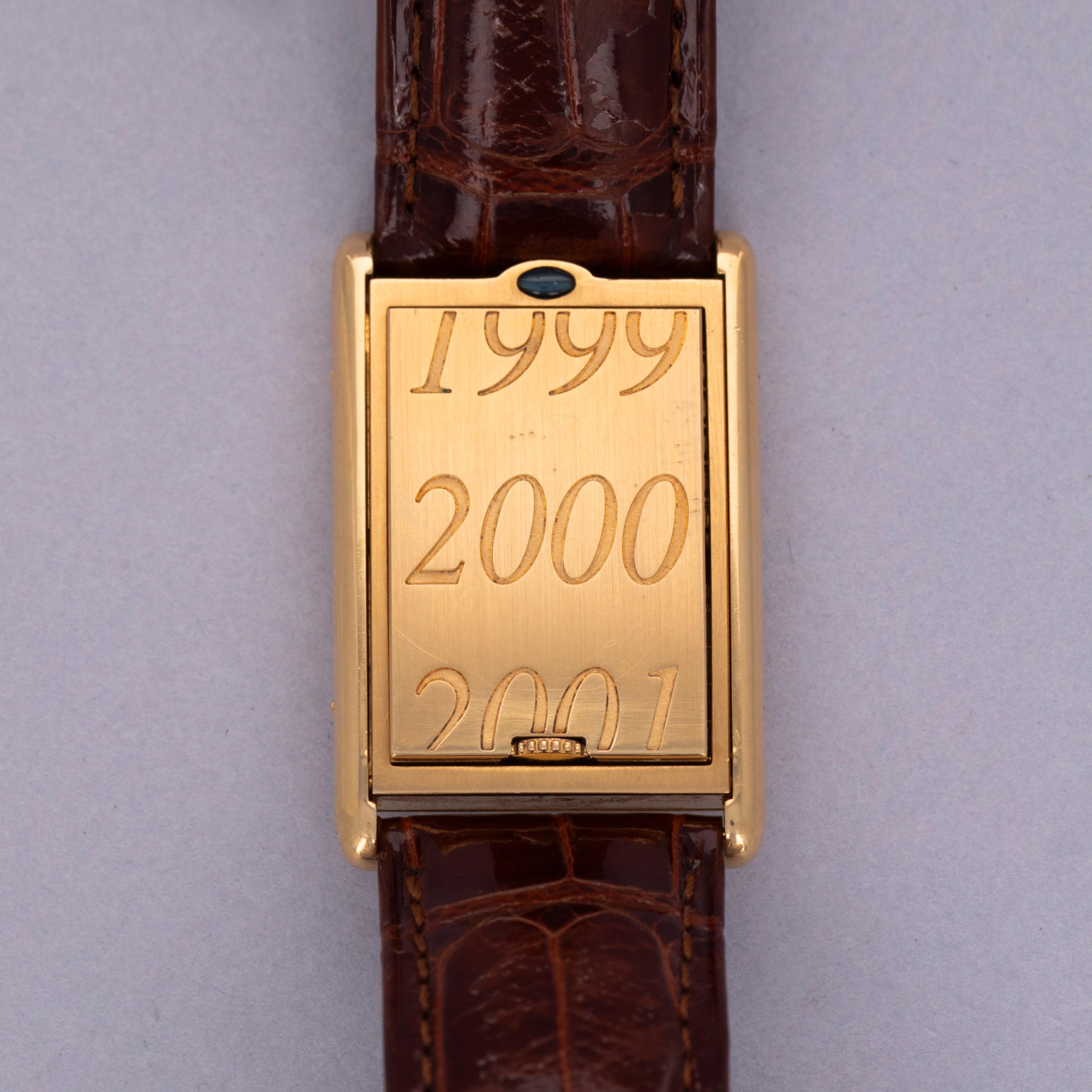 Watch is in very good overall condition. Case shows moderate signs of wear, with some scratches visible on the millennium motif cuvette, along the lugs and caseback. The engravings and hallmarks are crisp and full, with the excehption of the outer 750 scale hallmark which is only partially visible. Original guilloche pattern dial in excellent condition, with only minor signs of aging. Watch comes with original deployant buckle in 18k YG.