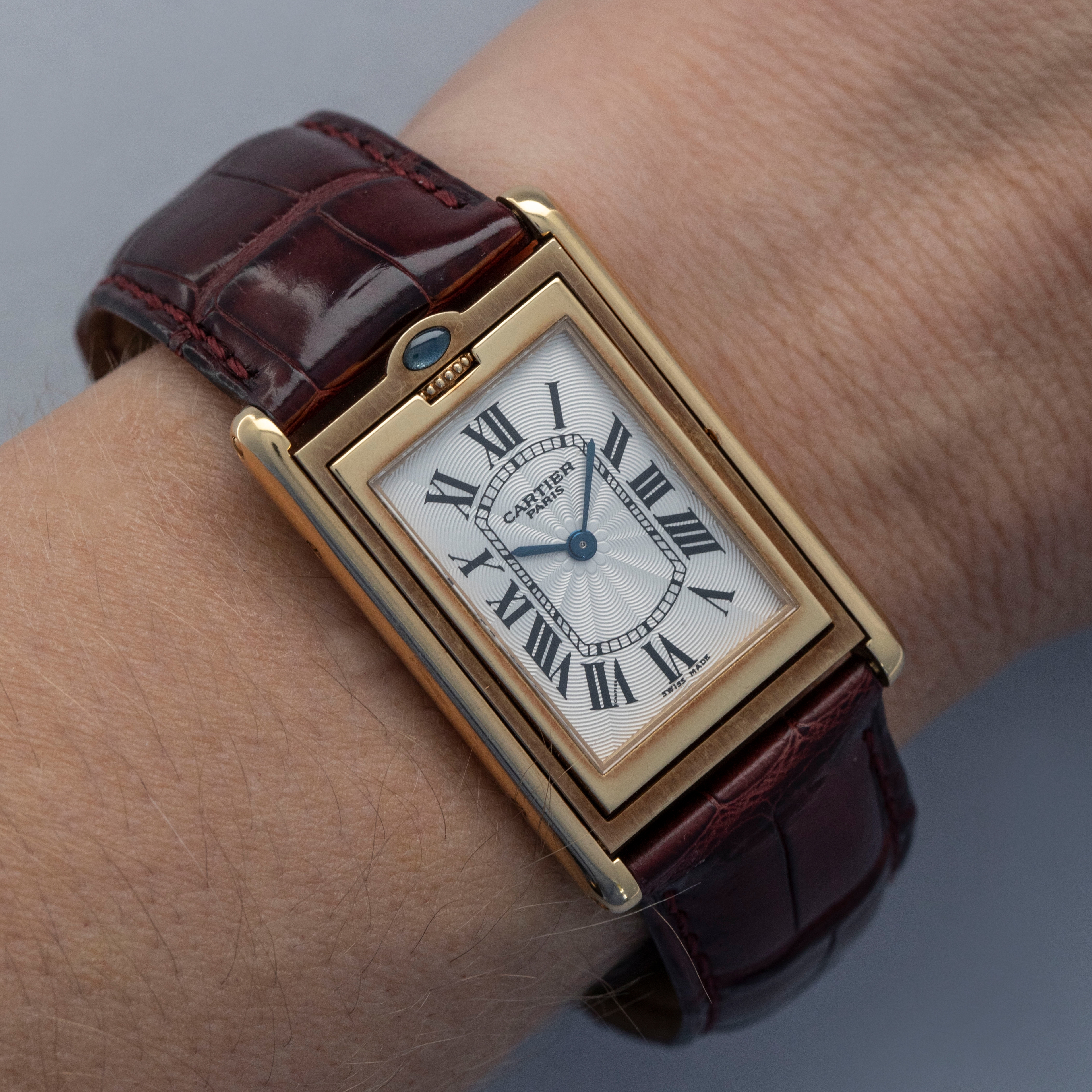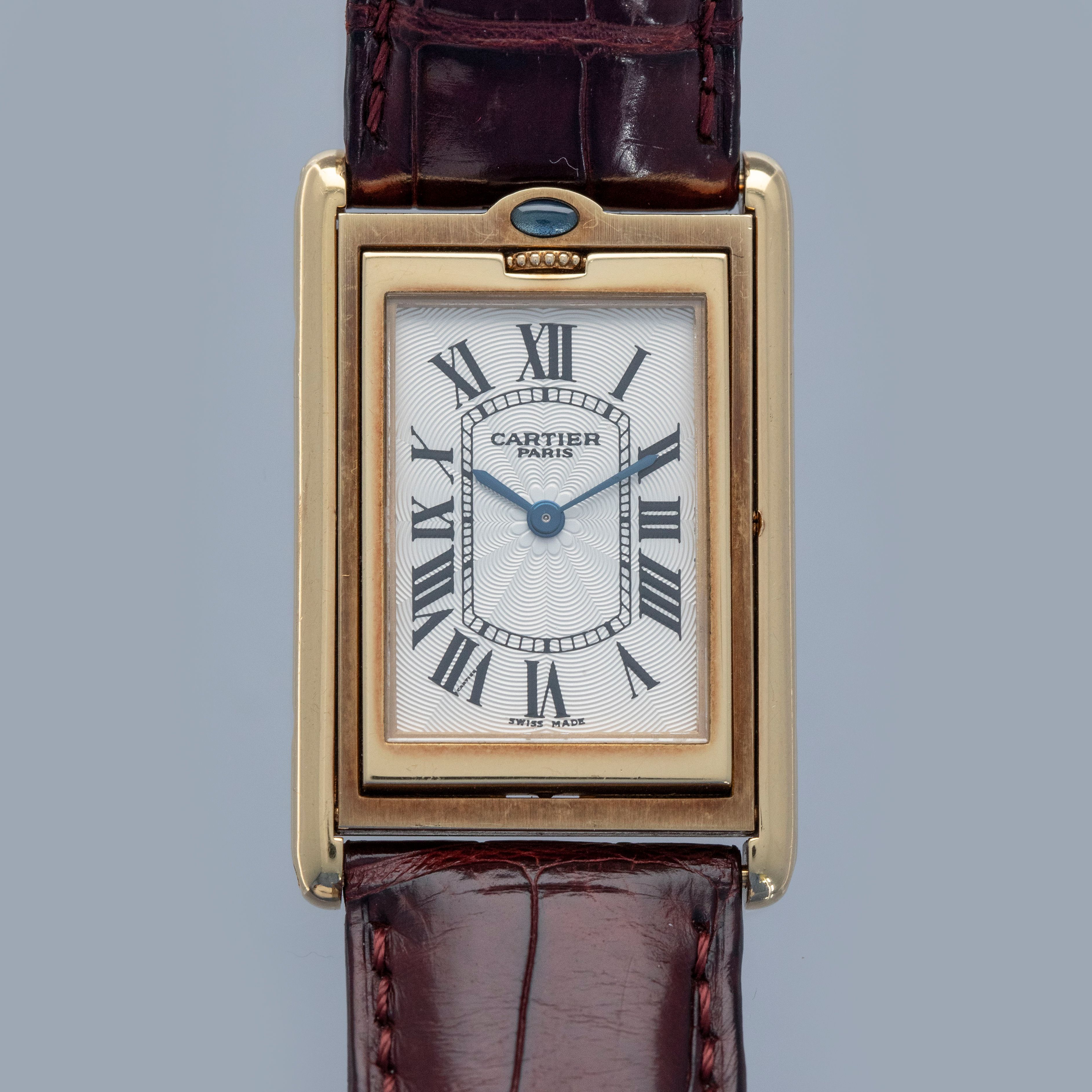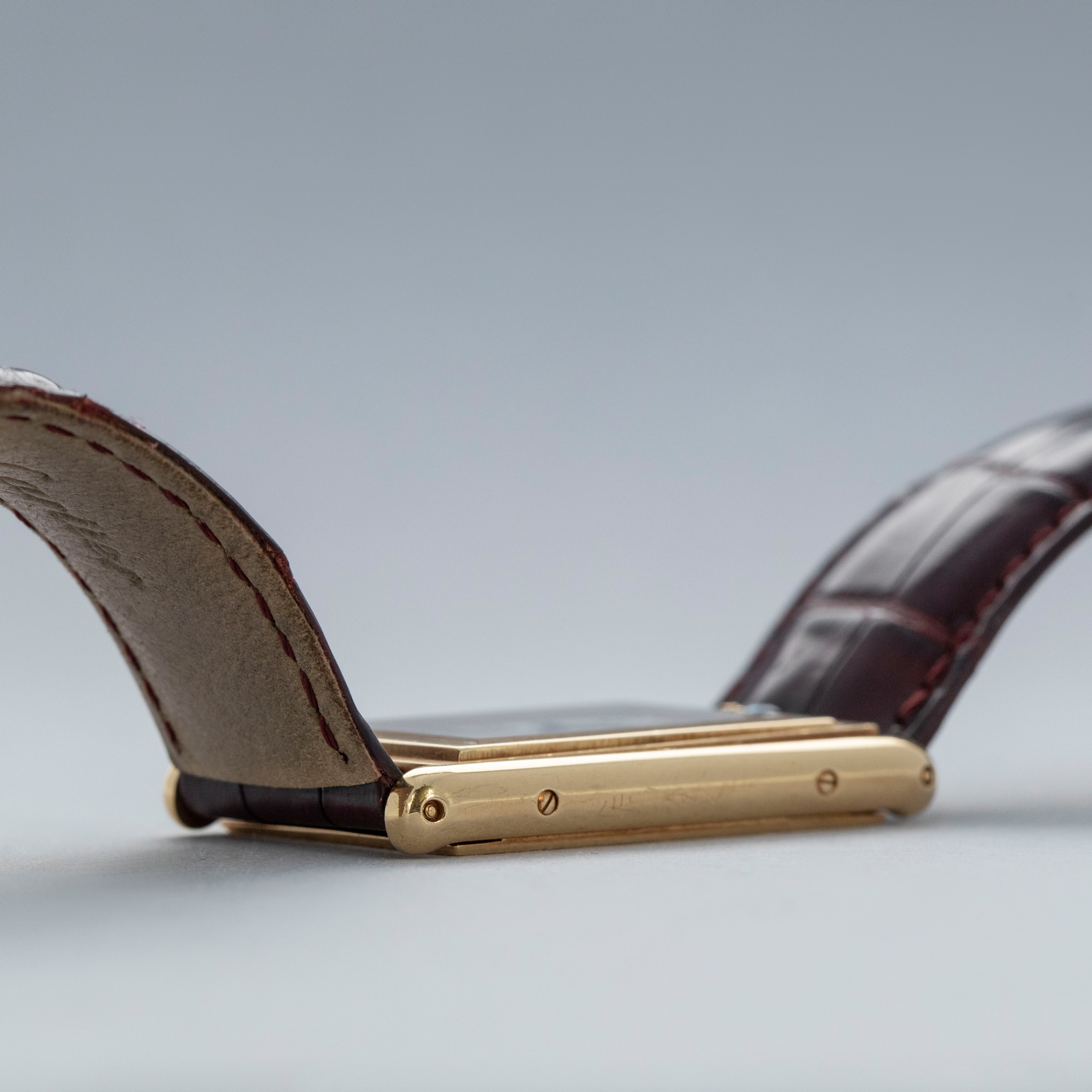An incredibly iconic timepiece, the Cartier Tank features one of the most easily recognizable watch designs of all time. With its thin rectangle-shaped case and elegant dial, it remains as classical a timepiece today as when it was first released in 1917. Inspired by the Renault FT-17 Tank, the Cartier Tank is, somewhat ironically, a dress watch. Recognizing the need for a more robust variant, Cartier released the Tank Basculante. Launched in 1933, Cartier took inspiration from the JLC Reverso, another classically styled early sports watch that would rotate within its case, to create the Tank Basculante, a watch that would also turn in its case. As such, the Basculante rotates vertically along the 12 to 6 axis within its case to protect its dial from damage caused during sports, and enabling it to double as a table clock if you so wished. With its historical place amongst Cartier’s catalogue, Cartier decided to re-issue the Basculante in 1999 as part of their CPCP collection, with the ref. 2399C example that we have here launched as part of that collection. Measuring 39mm x 25mm and featuring a stunning silver guilloche dial and an exhibition window in its caseback this timepiece celebrates Cartier at their very best.