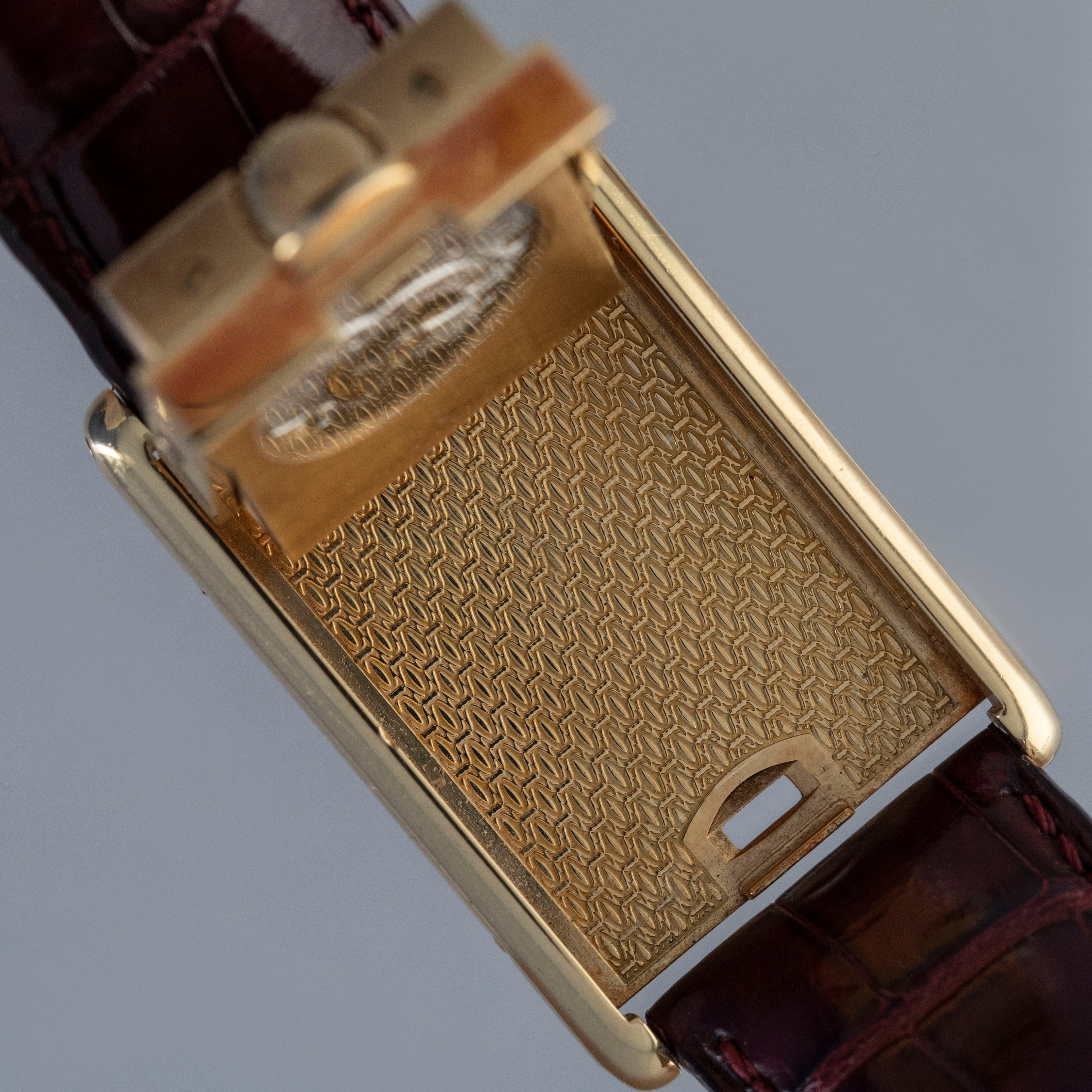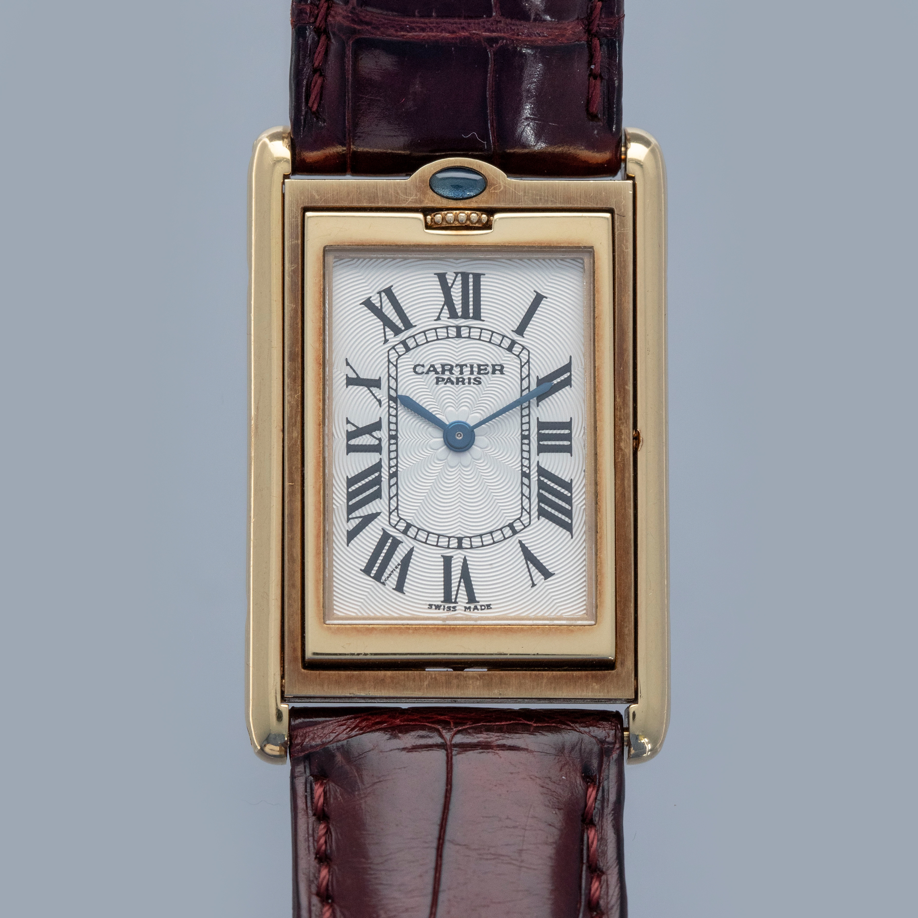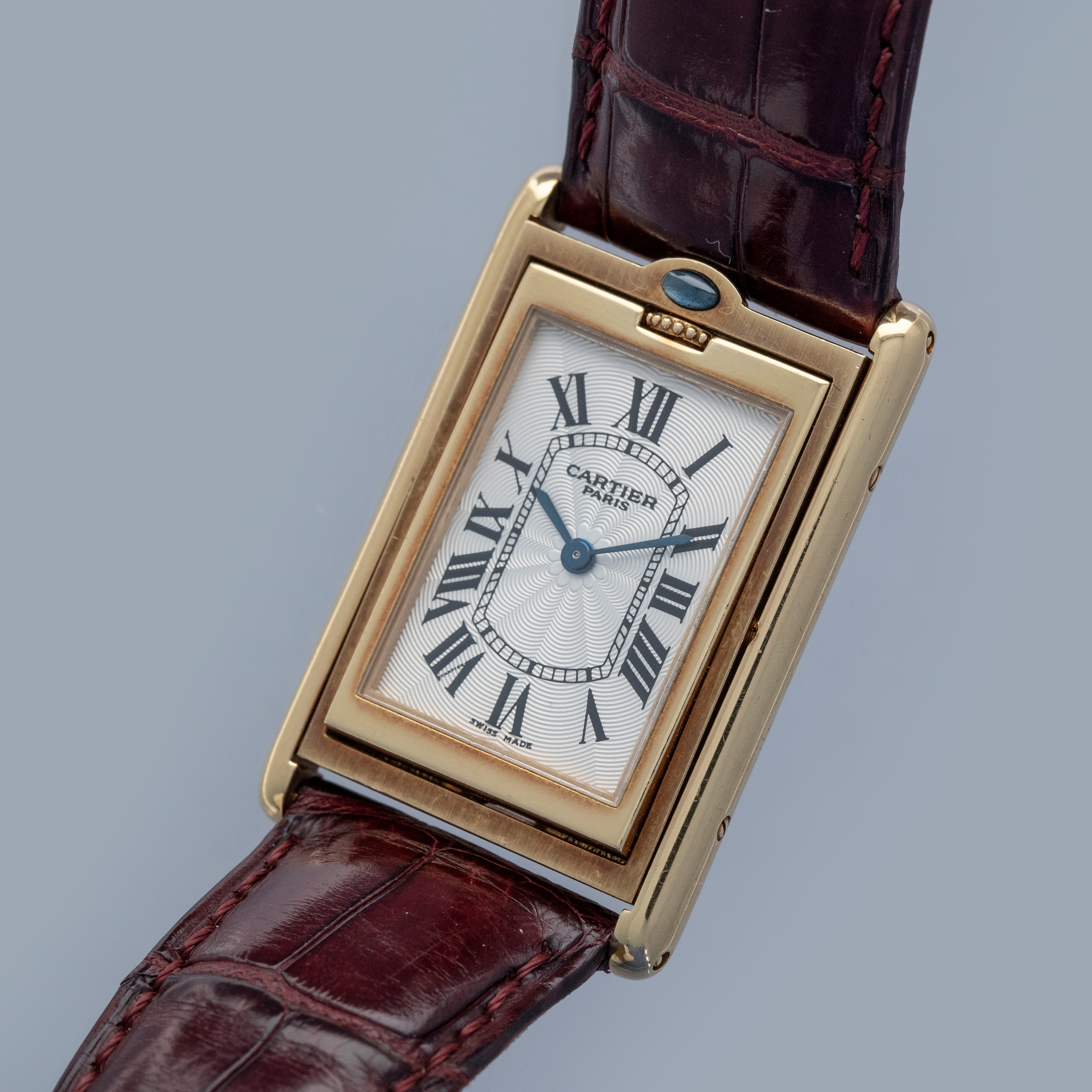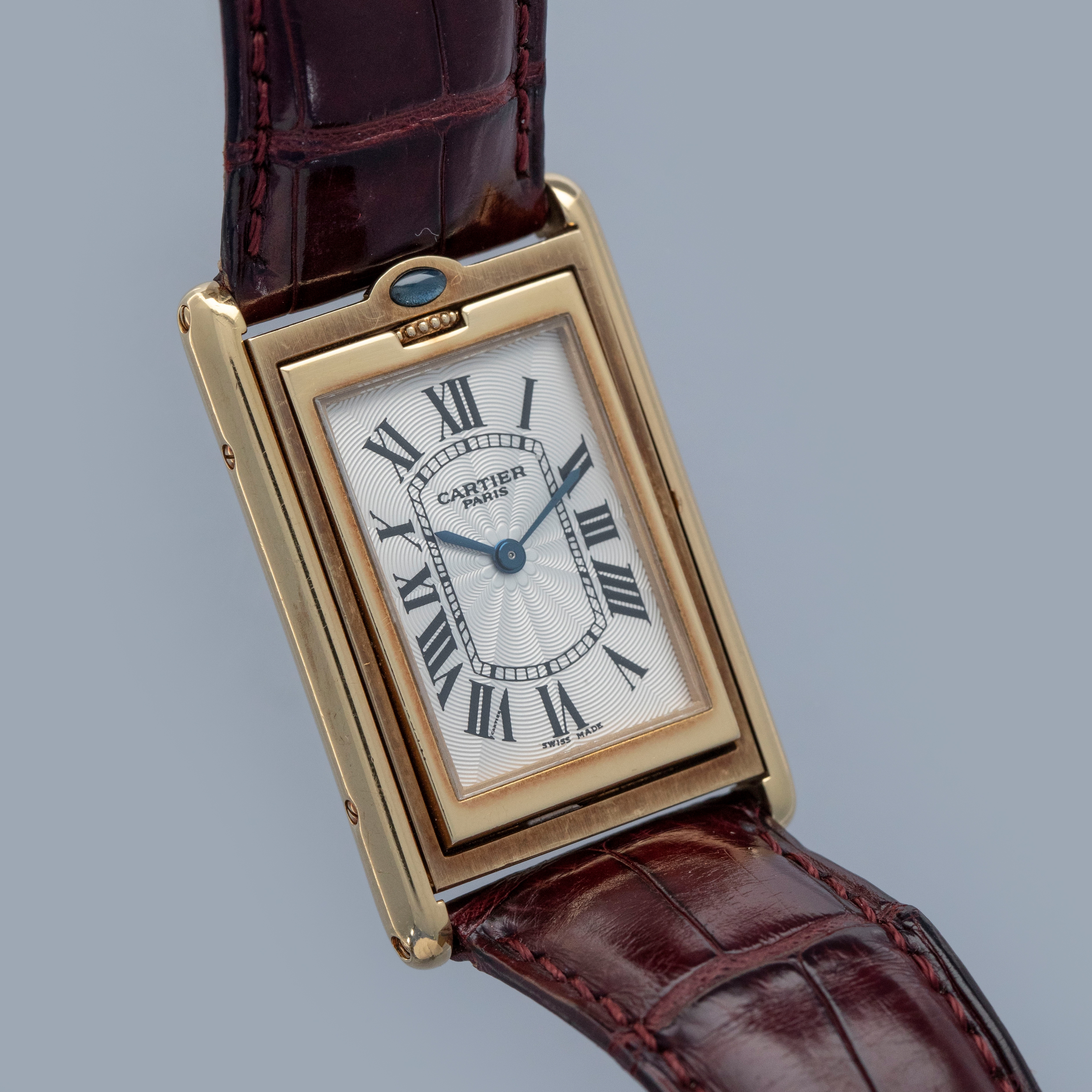 An incredibly iconic timepiece, the Cartier Tank features one of the most easily recognizable watch designs of all time. With its thin rectangle-shaped case and elegant dial, it remains as classical a timepiece today as when it was first released in 1917. Inspired by the Renault FT-17 Tank, the Cartier Tank is, somewhat ironically, a dress watch. Recognizing the need for a more robust variant, Cartier released the Tank Basculante. Launched in 1933, Cartier took inspiration from the JLC Reverso, another classically styled early sports watch that would rotate within its case, to create the Tank Basculante, a watch that would also turn in its case. As such, the Basculante rotates vertically along the 12 to 6 axis within its case to protect its dial from damage caused during sports, and enabling it to double as a table clock if you so wished. With its historical place amongst Cartier’s catalogue, Cartier decided to re-issue the Basculante in 1999 as part of their CPCP collection, with the ref. 2399C example that we have here launched as part of that collection. Measuring 39mm x 25mm and featuring a stunning silver guilloche dial and an exhibition window in its caseback this timepiece celebrates Cartier at their very best.