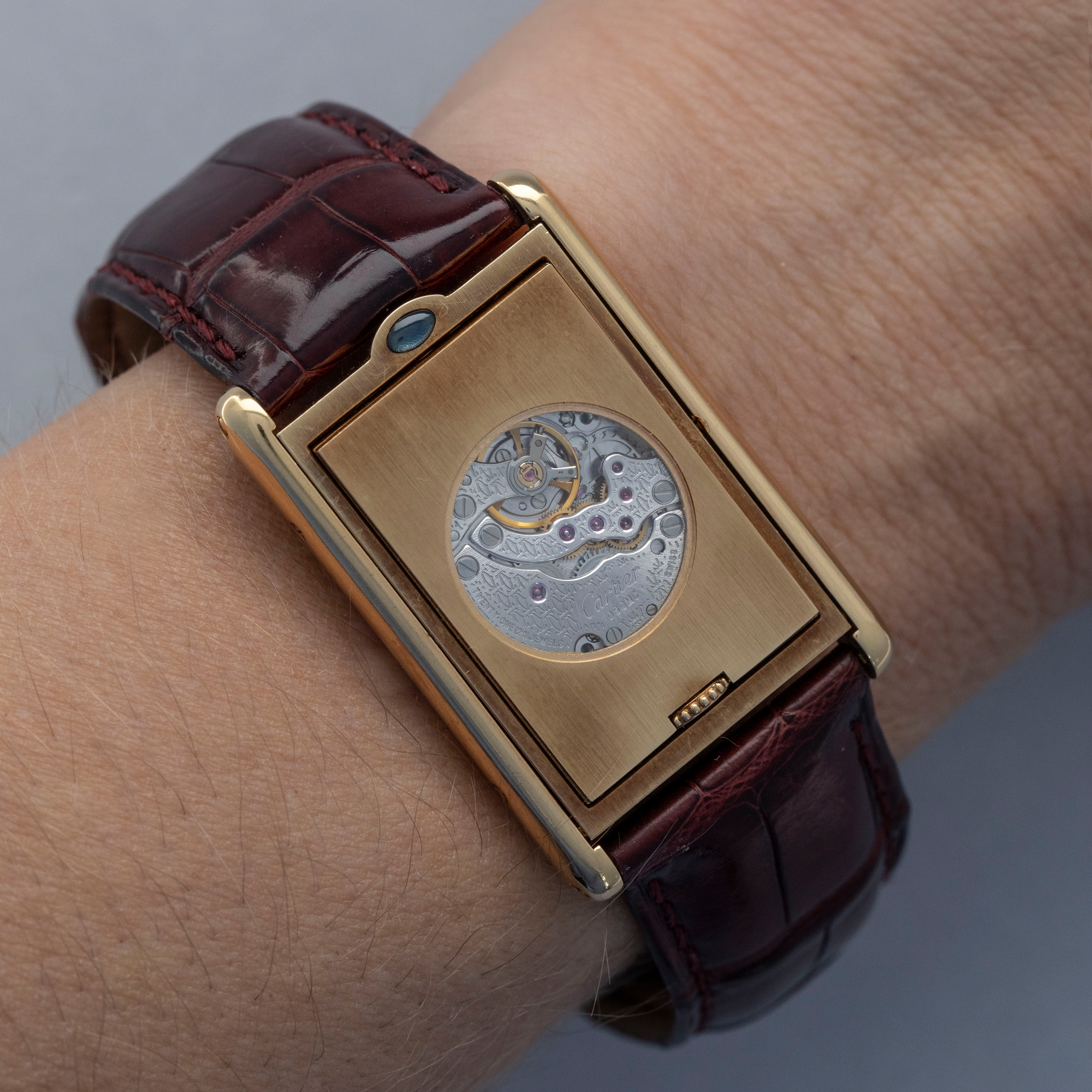 Fitted with an exhibition window to showcase its movement, the ref. 2499C showcases its CPCP cal. 060MC movement with its signature Cartier logo engraving throughout.