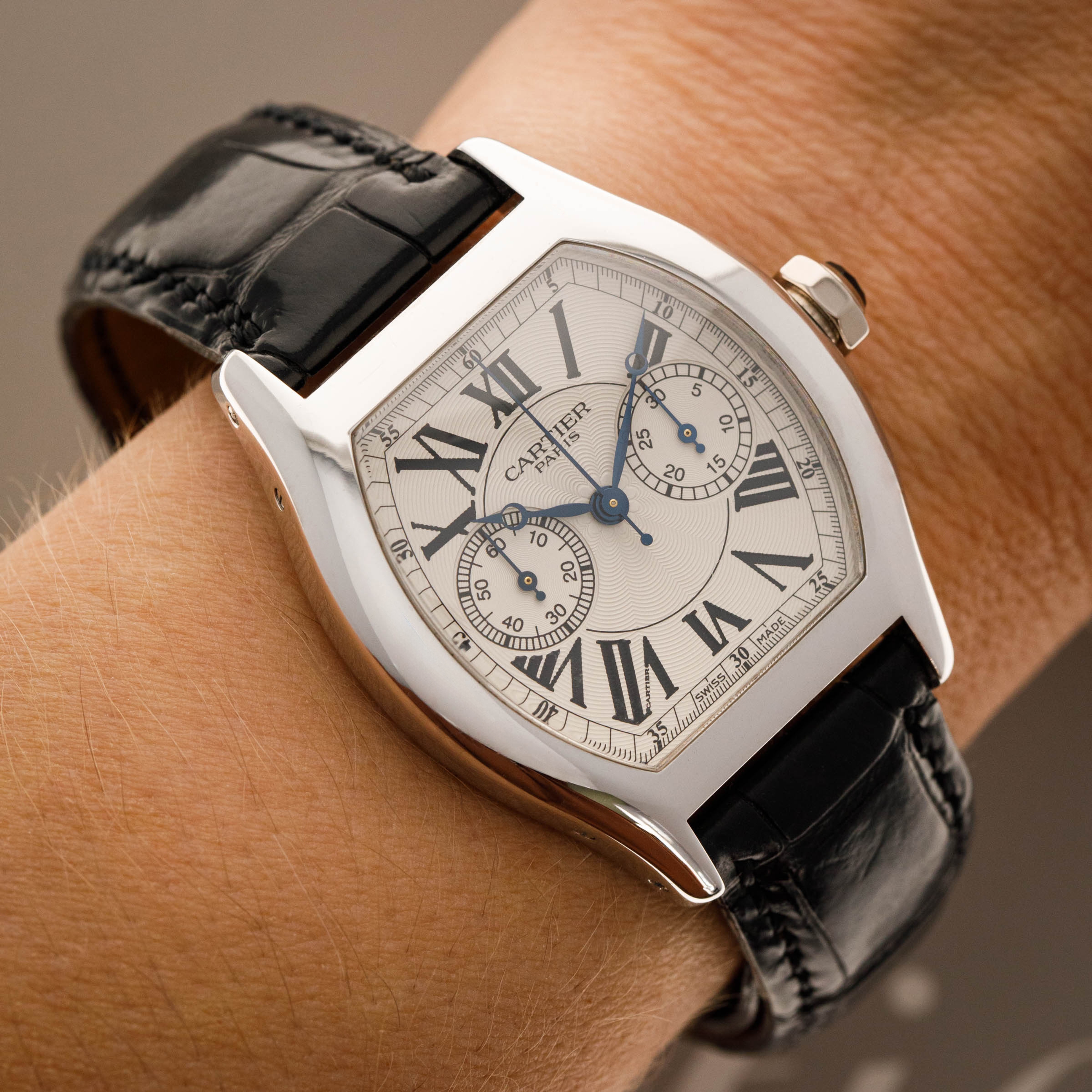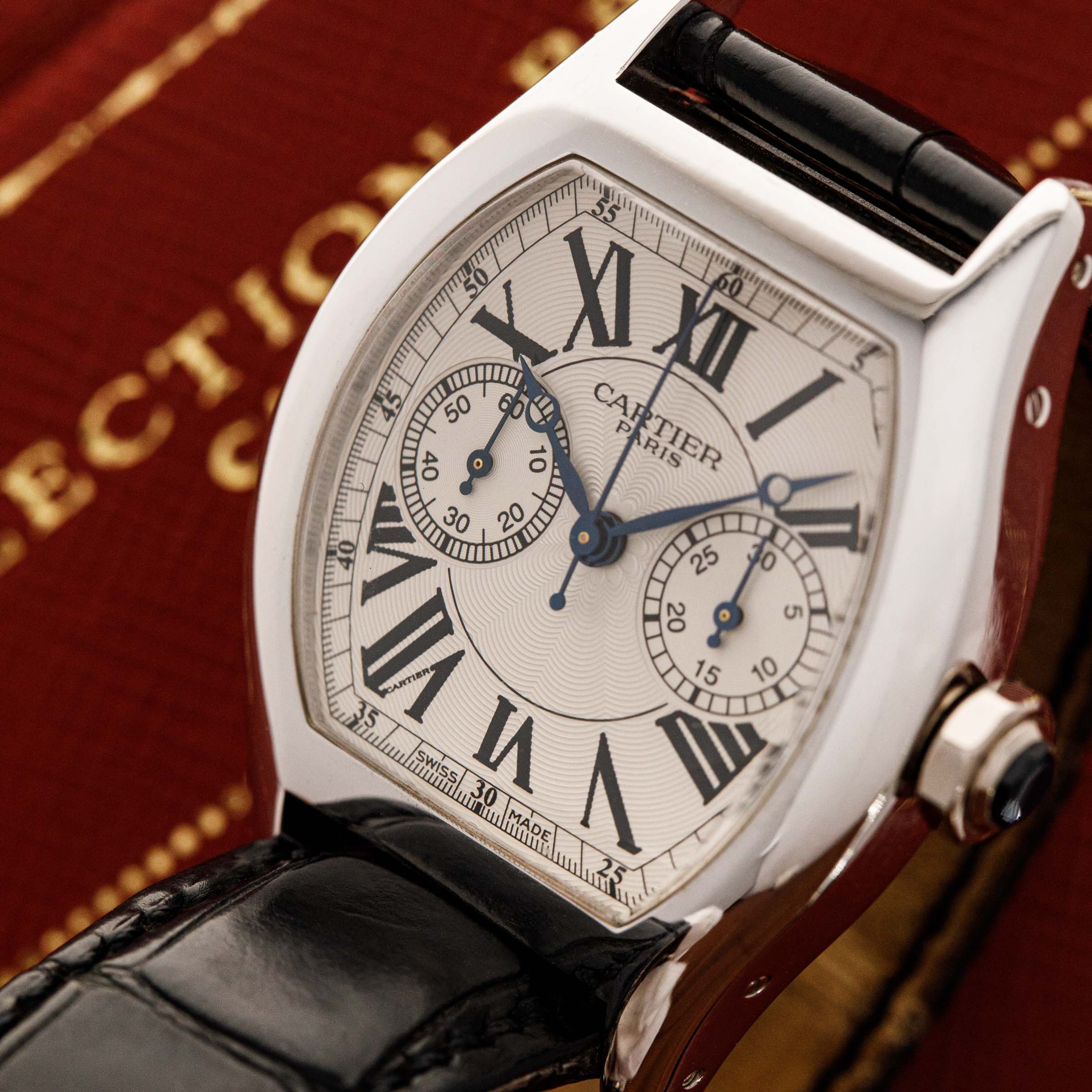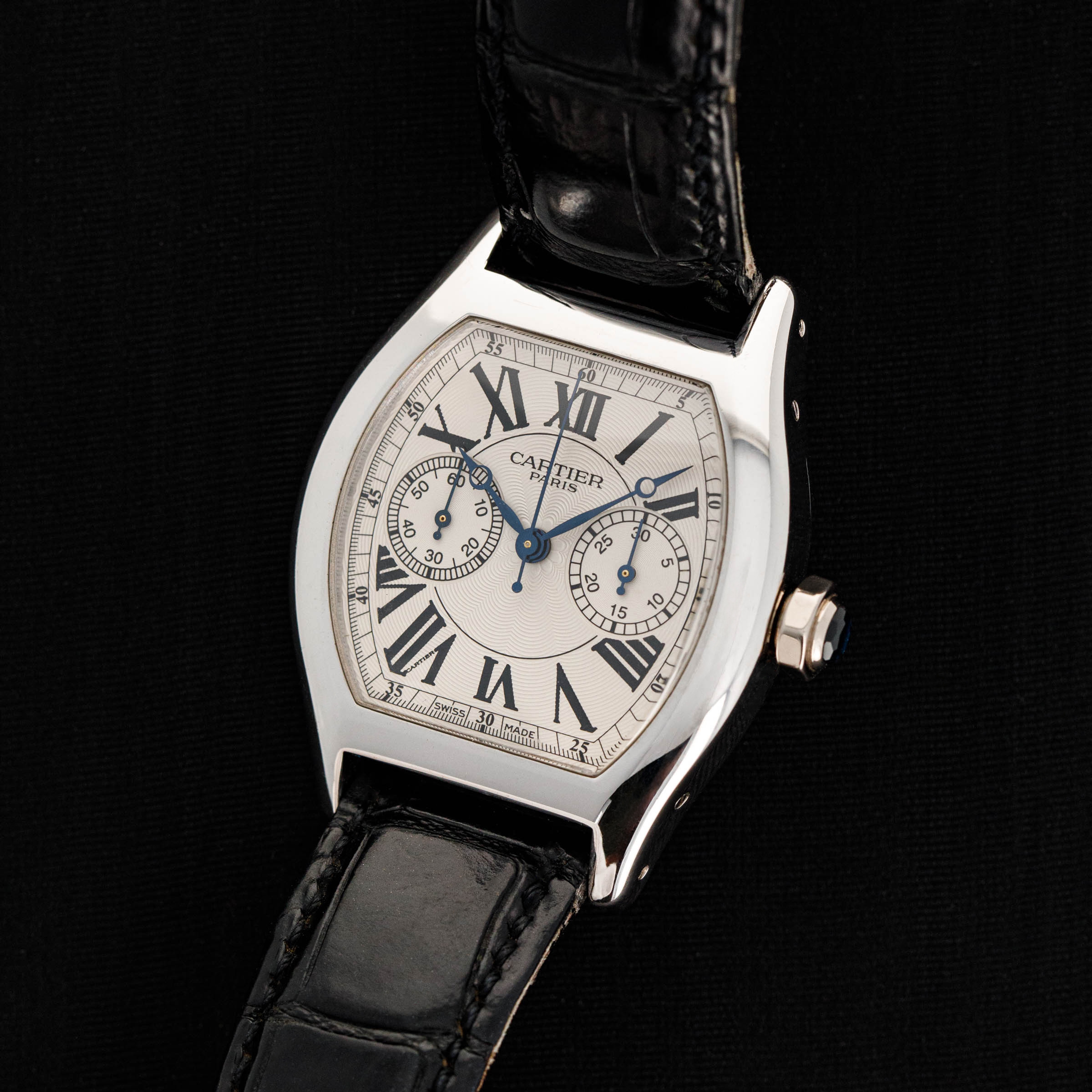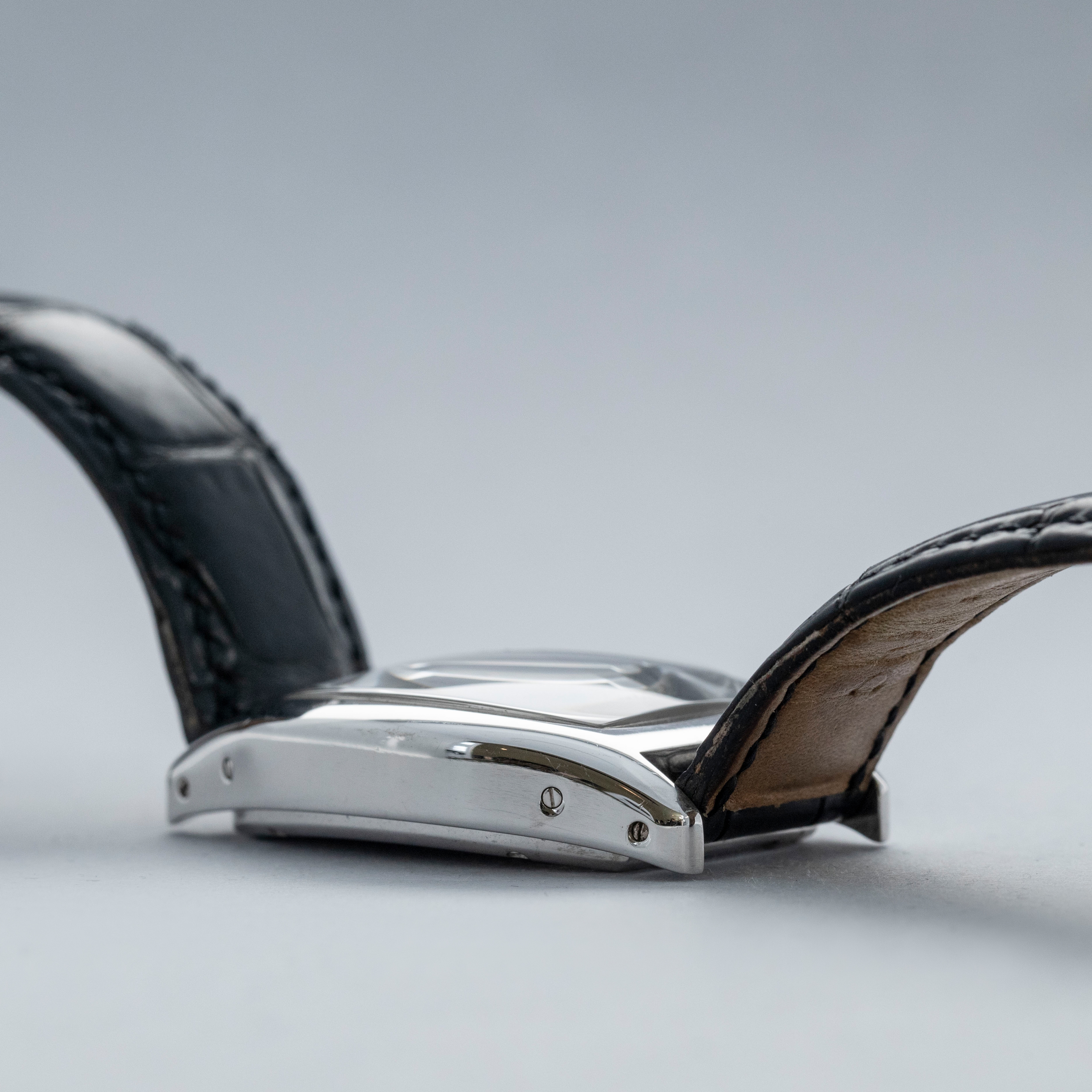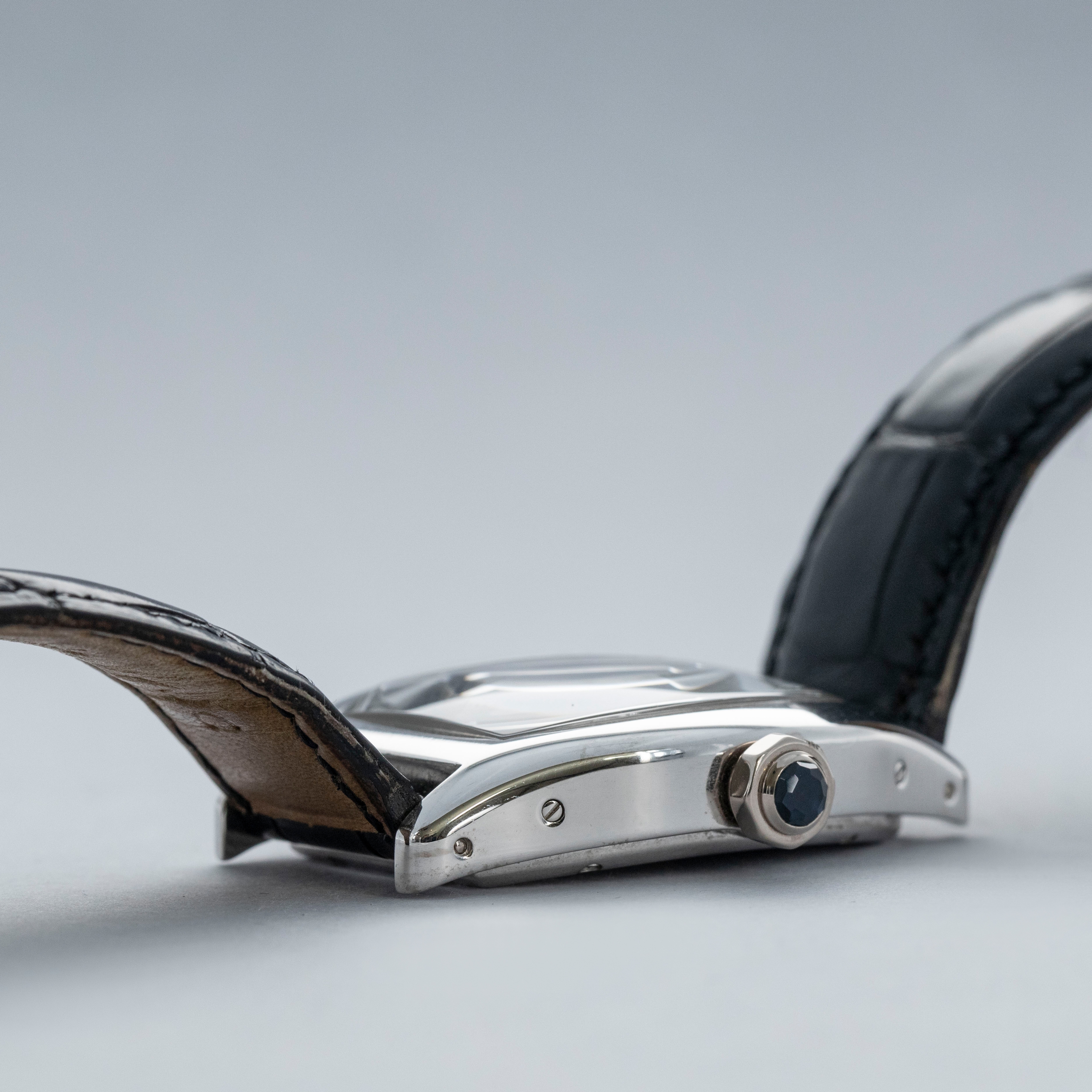 Launched at SIHH (now Watches and Wonders) in 1998, the Collection Privée Cartier Paris (CPCP) was Cartier's attempt to bolster their horological might following their loss of watchmaking prowess after they decided to push quartz-powered timepieces in the Must de Cartier collection. To remedy this, Cartier joined forces with THA Èbauche - a collaborative movement manufacture headed by Vianney Halter, Denis Flageollet, and François-Paul Journe, to create a movement that would stand up to brands like Patek and AP. The resulting cal. 045MC found within the Tortue Monopouissor was the result of that very partnership. In addition to the higher standard of watchmaking that the CPCP brought about, Cartier also decided to revive the use of signing their dials with "Paris" in a bid to speak to collectors who valued the link to the brand's history as a Paris-based watchmaker and jeweler. With this, the CPCP re-established Cartier’s watchmaking credentials and created what are now some of the brand's most sought-after watches on the collector’s market. Ultimately, the CPCP merged Cartier’s revered eye for design with their genuine watchmaking heritage through the use of some of the most influential names in modern horology, just like Cartier’s strategy from the early 1900s when they partnered with Edmond Jaeger, amongst others. Based on Louis Cartier’s 3rd ever design, a watch from 1912, the Cartier Tortue Monopouissor was released as part of the CPCP in 1999, like their other throwback designs to Cartier's earliest days. Powered by the beautifully finished manually wound cal. 045 MC movement, the Cartier Tortue Monopouissor is a technically astute timepiece. With its gorgeous silver dial, it is a modern rendition of the original models that it calls back to. With its elegant curved 18kt white gold case hugging the wrist comfortably and its black Roman numeral-adorned dial’s general aesthetic matching that of the iconic French Maison's designs of old, this piece stands as a monolith of Cartier's engineering prowess, iconic design, and longstanding heritage.