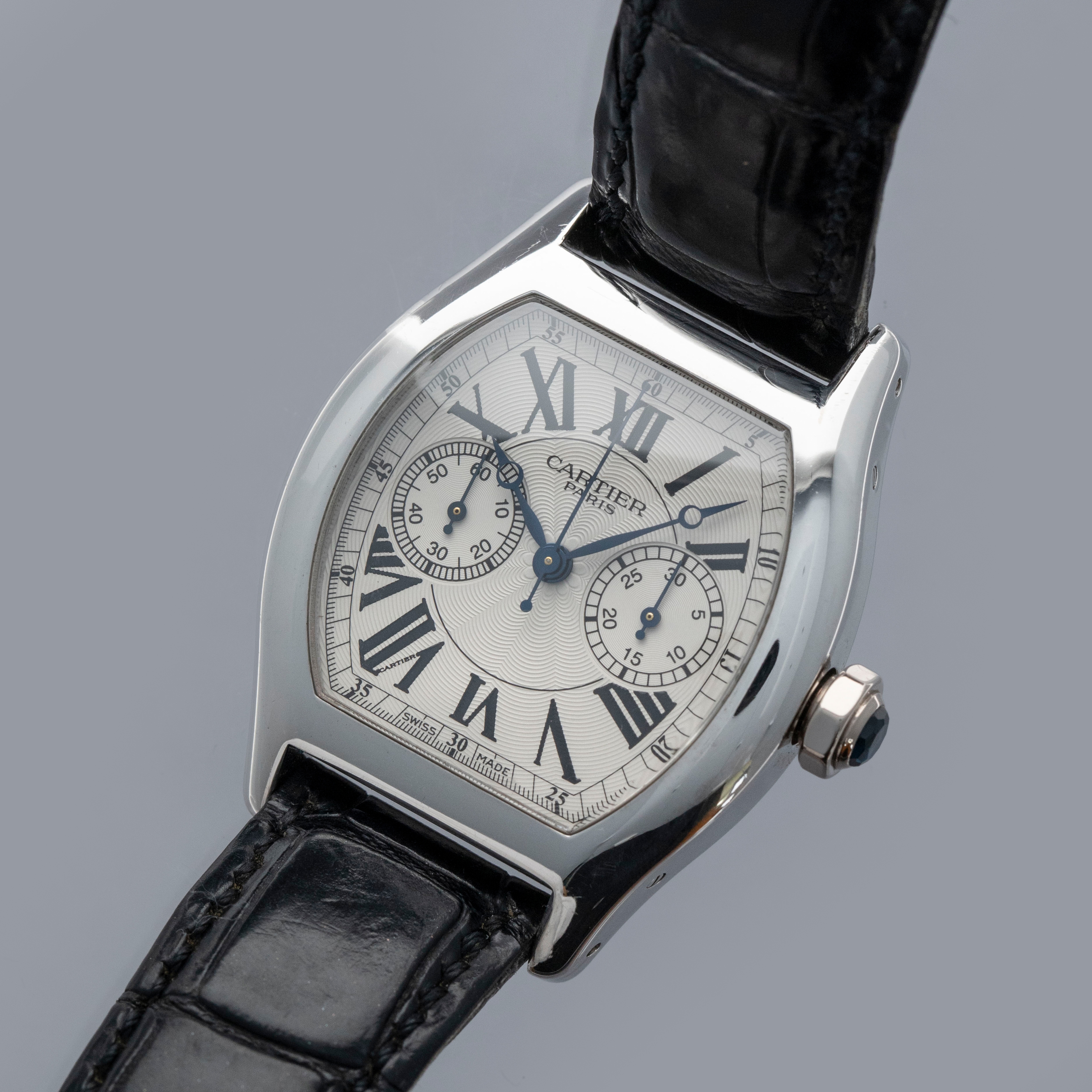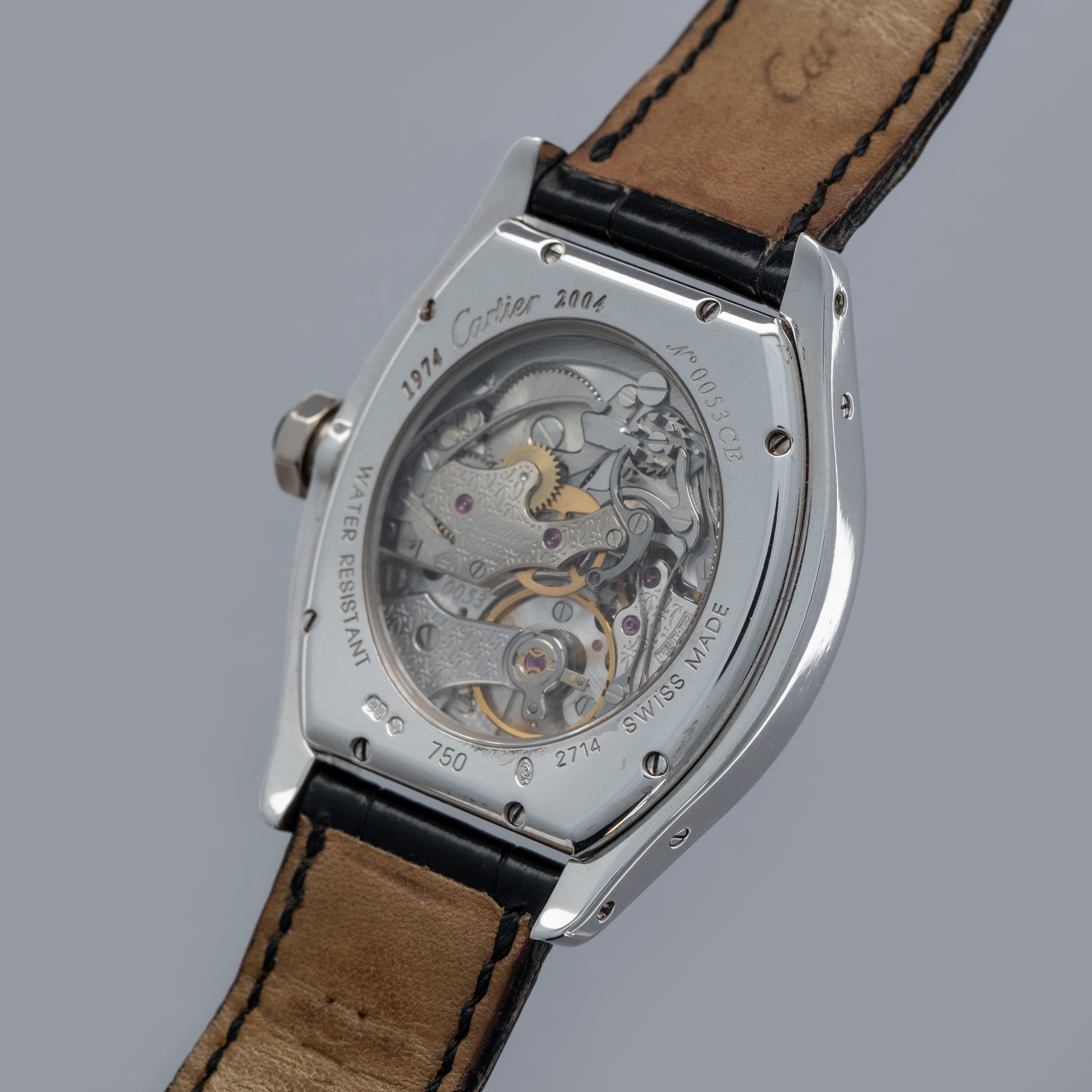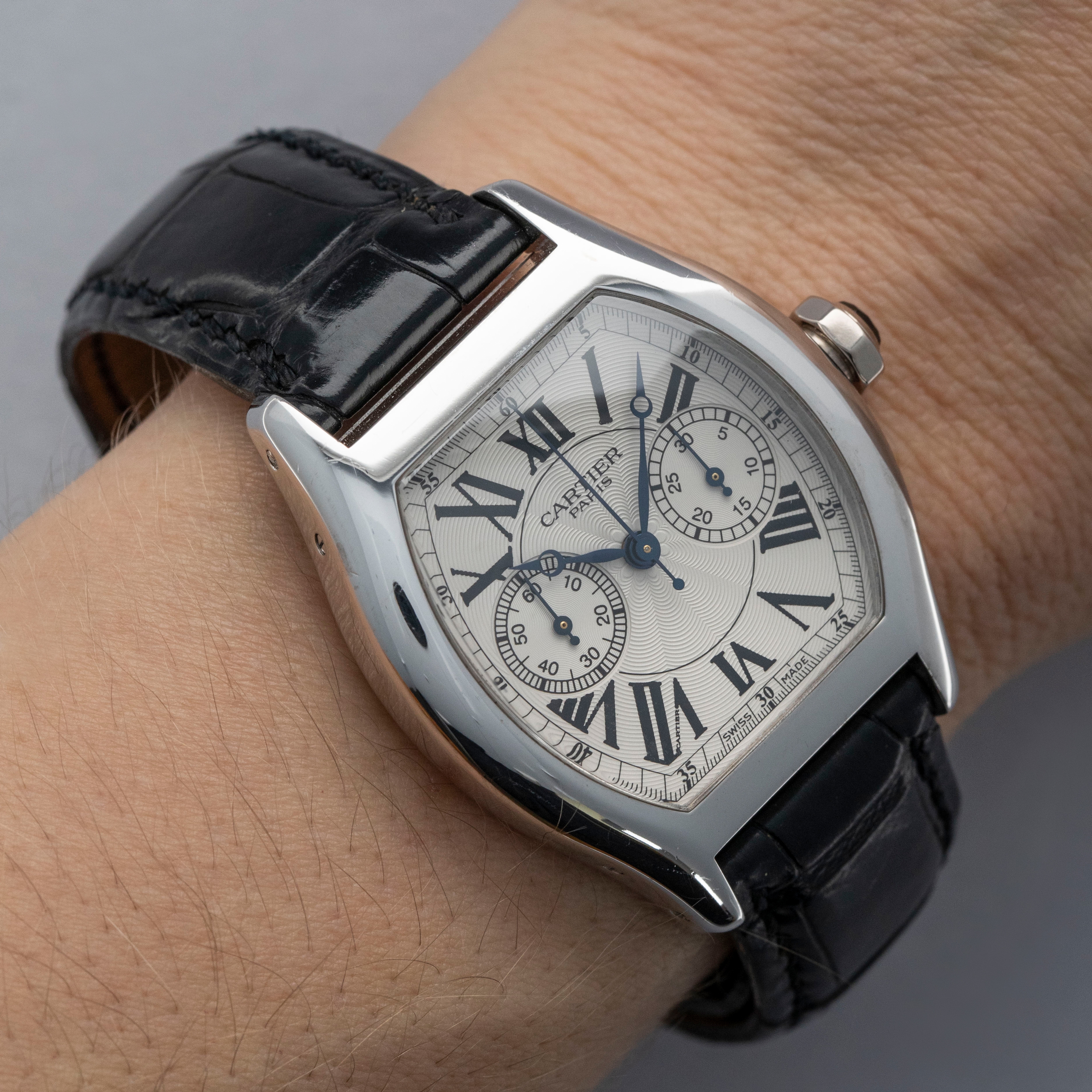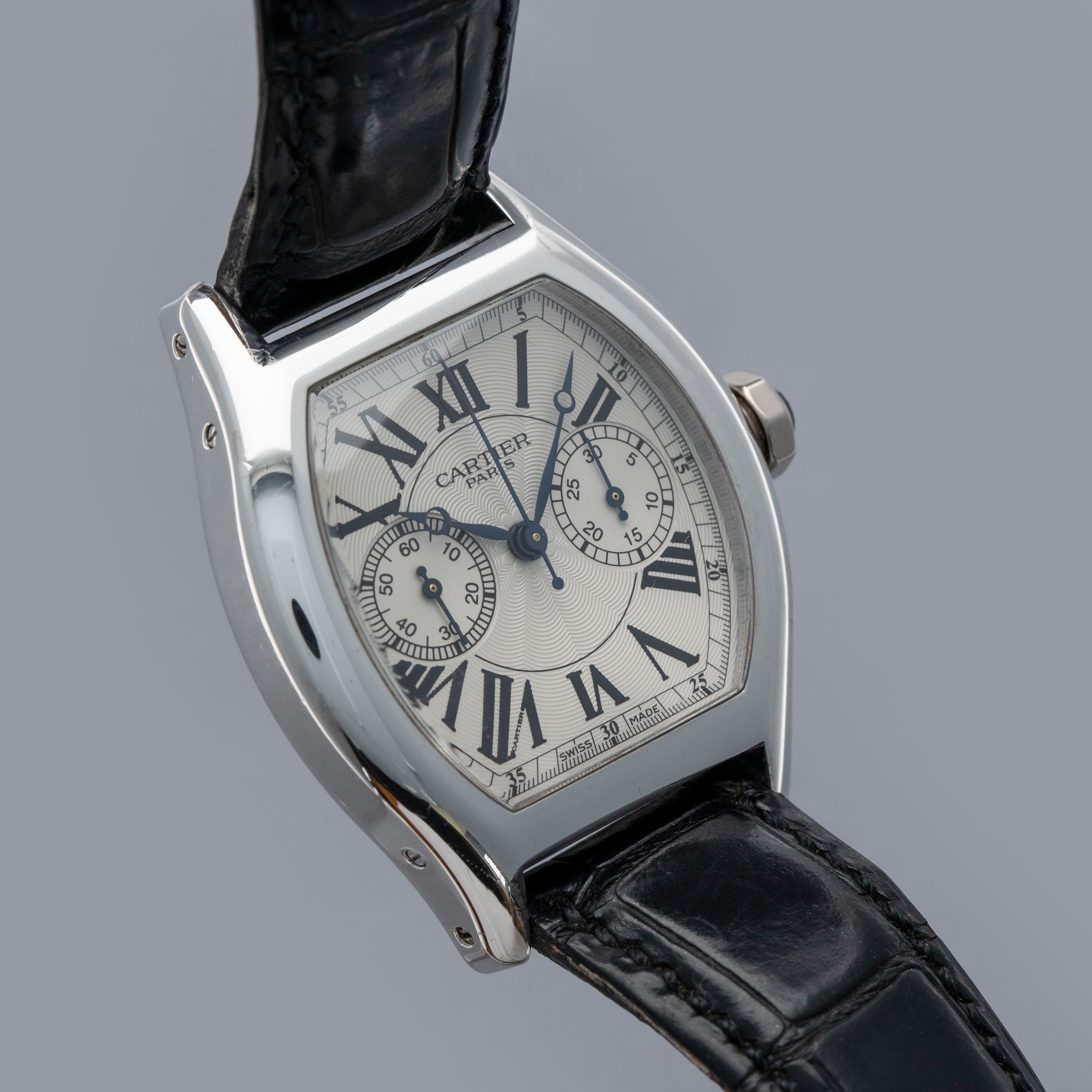 Launched at SIHH (now Watches and Wonders) in 1998, the Collection Privée Cartier Paris (CPCP) was Cartier's attempt to bolster their horological might following their loss of watchmaking prowess after they decided to push quartz-powered timepieces in the Must de Cartier collection. To remedy this, Cartier joined forces with THA Èbauche - a collaborative movement manufacture headed by Vianney Halter, Denis Flageollet, and François-Paul Journe, to create a movement that would stand up to brands like Patek and AP. The resulting cal. 045MC found within the Tortue Monopouissor was the result of that very partnership. In addition to the higher standard of watchmaking that the CPCP brought about, Cartier also decided to revive the use of signing their dials with "Paris" in a bid to speak to collectors who valued the link to the brand's history as a Paris-based watchmaker and jeweler. With this, the CPCP re-established Cartier’s watchmaking credentials and created what are now some of the brand's most sought-after watches on the collector’s market. Ultimately, the CPCP merged Cartier’s revered eye for design with their genuine watchmaking heritage through the use of some of the most influential names in modern horology, just like Cartier’s strategy from the early 1900s when they partnered with Edmond Jaeger, amongst others. Based on Louis Cartier’s 3rd ever design, a watch from 1912, the Cartier Tortue Monopouissor was released as part of the CPCP in 1999, like their other throwback designs to Cartier's earliest days. Powered by the beautifully finished manually wound cal. 045 MC movement, the Cartier Tortue Monopouissor is a technically astute timepiece. With its gorgeous silver dial, it is a modern rendition of the original models that it calls back to. With its elegant curved 18kt white gold case hugging the wrist comfortably and its black Roman numeral-adorned dial’s general aesthetic matching that of the iconic French Maison's designs of old, this piece stands as a monolith of Cartier's engineering prowess, iconic design, and longstanding heritage.