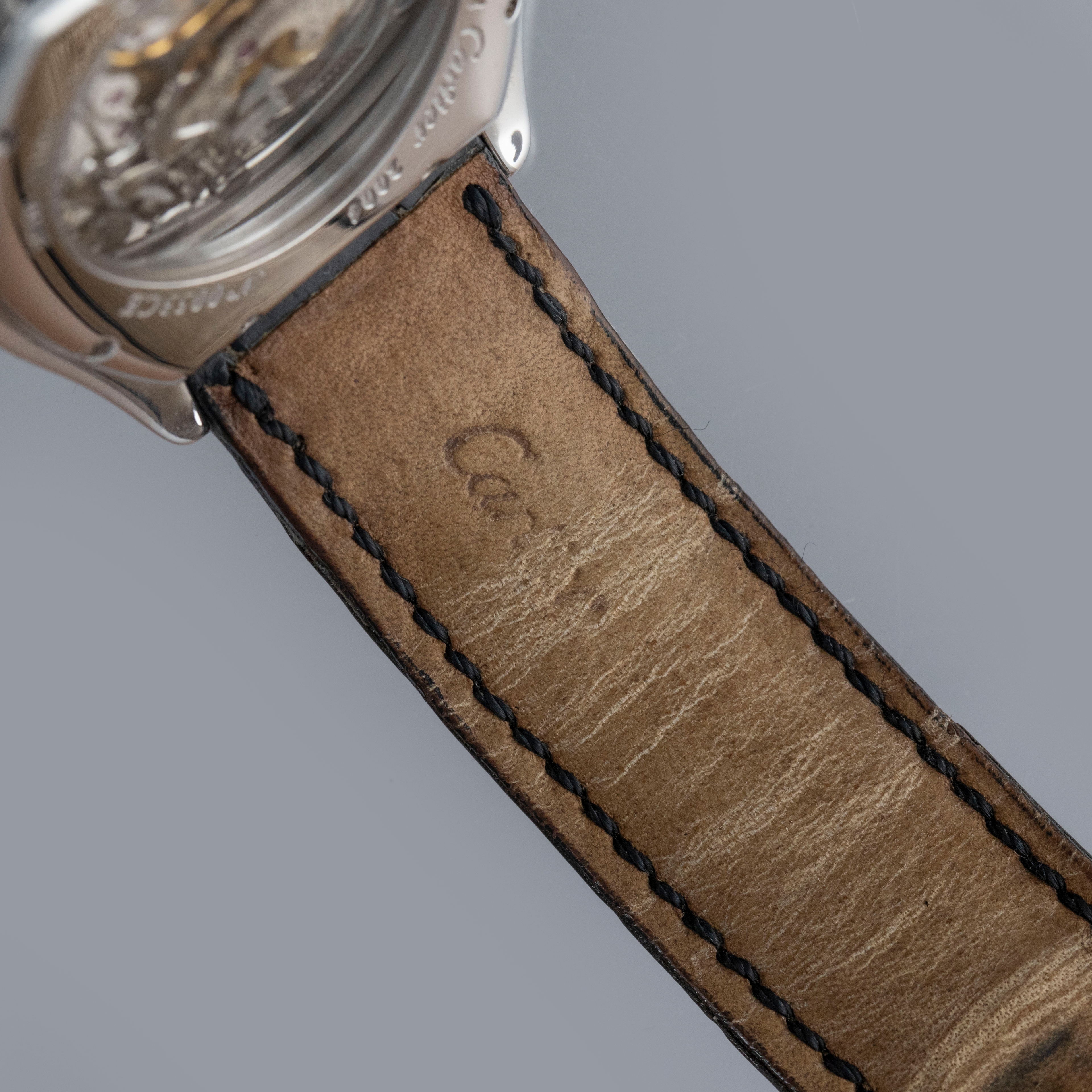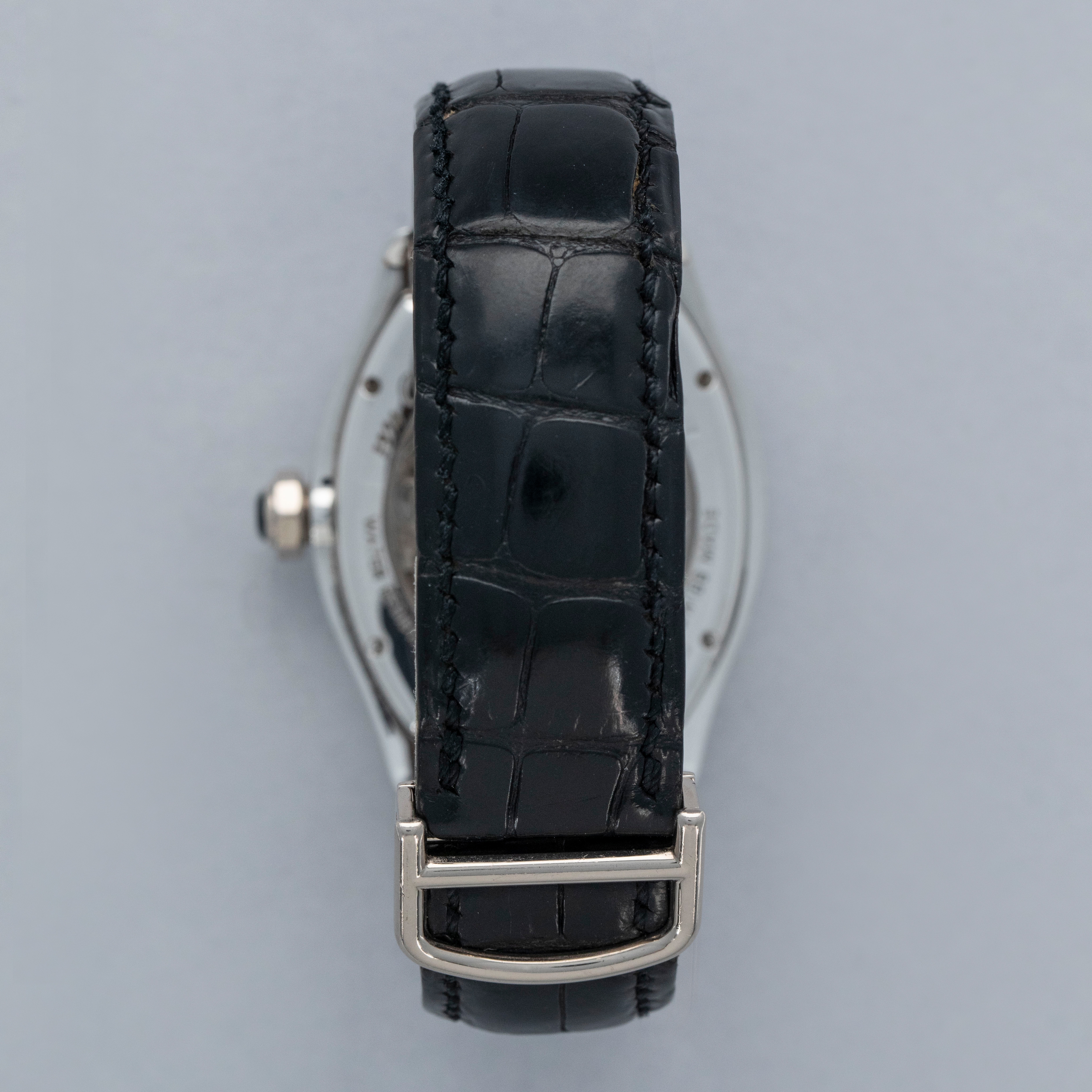 Watch is in overall near-mint condition. The white gold case shows some superficial surface scratches along with light signs of wear, while the display case back retains well-defined engravings and hallmarks around the edge. The dial and blued hands remain like new. It is fitted with a black alligator strap that has some wear and a white gold deployant clasp showing light surface scratches. Comes complete with box and warranty booklet.