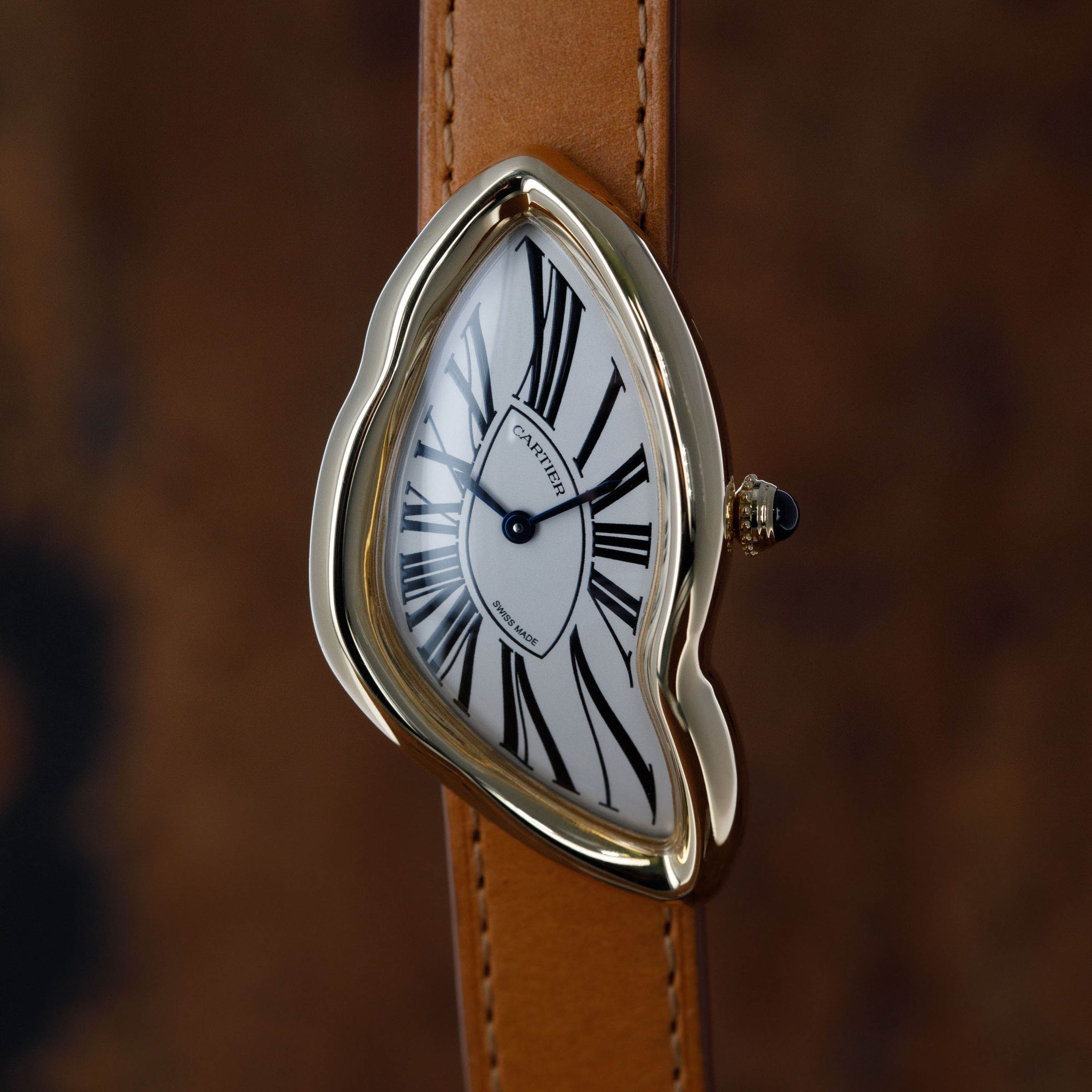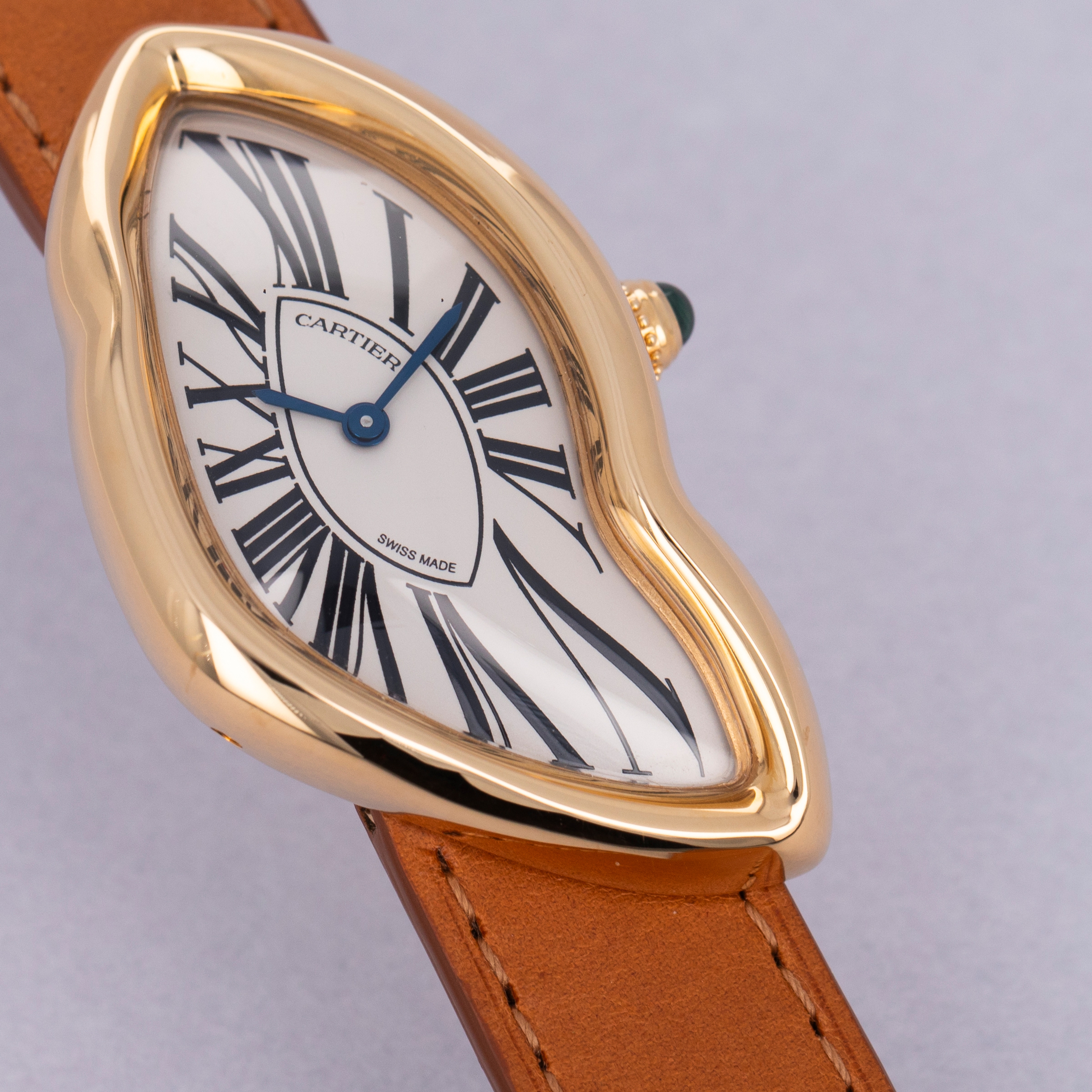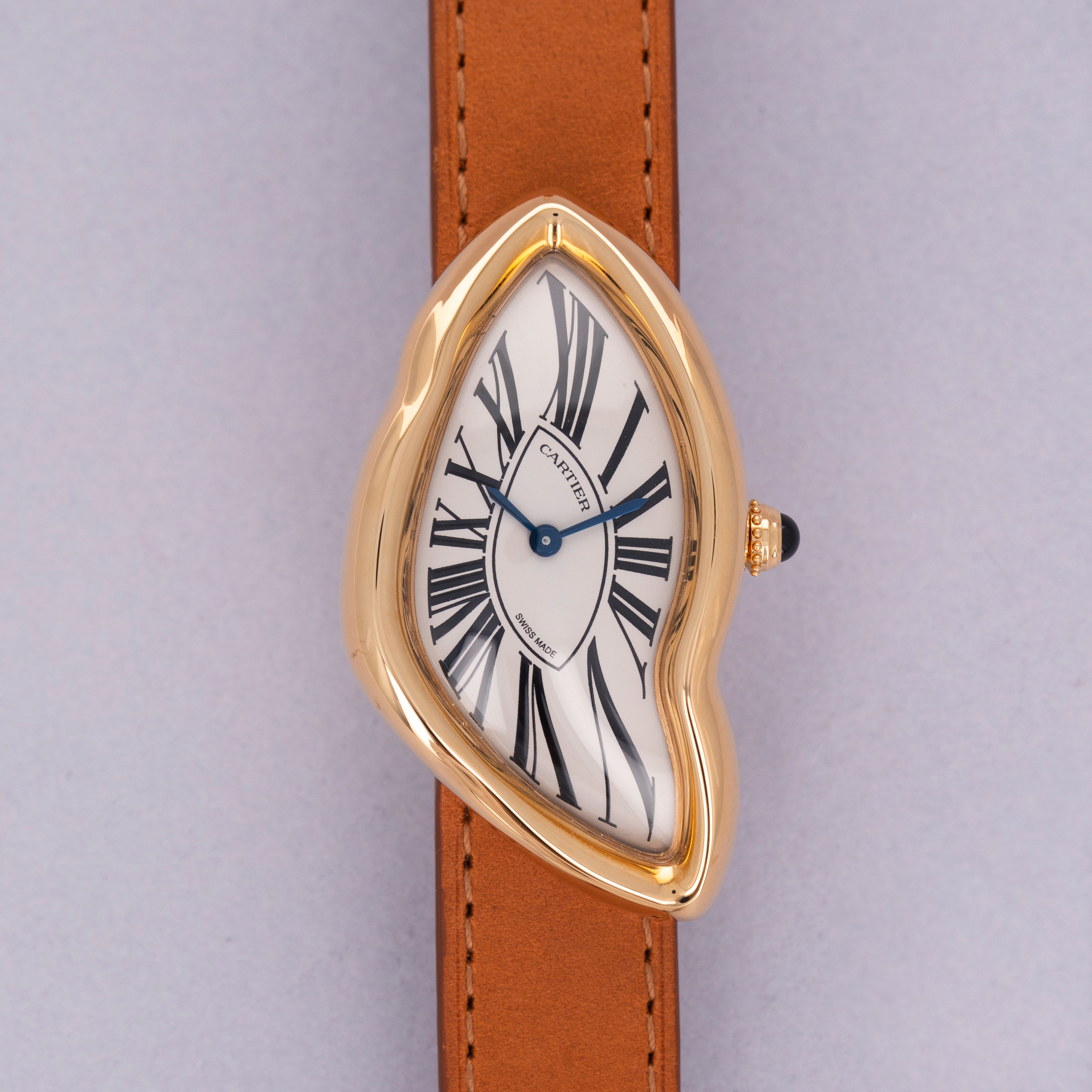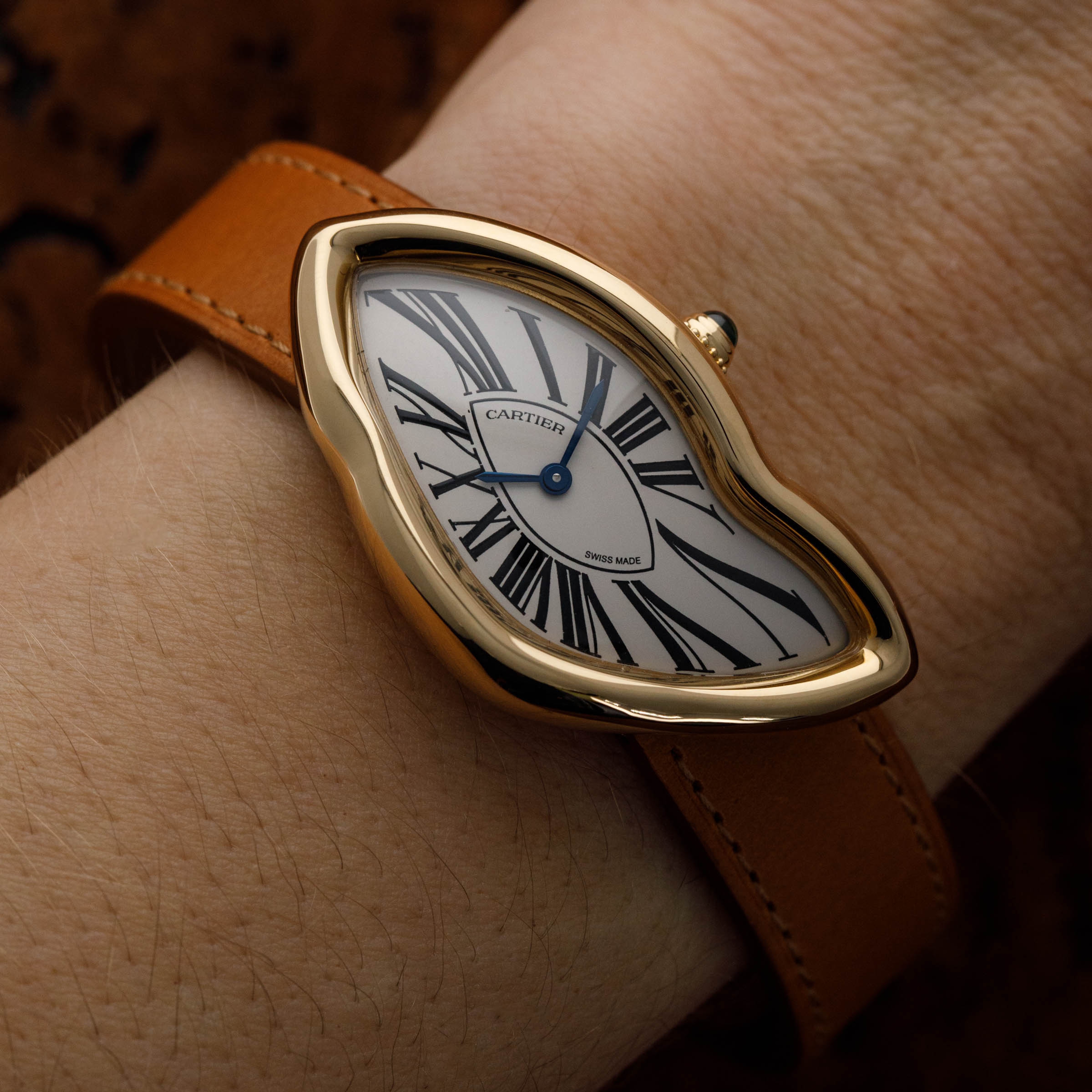 Perhaps one of Cartier's most consistent pieces of design is their dial, which the Crash remains consistent with. While its misshapen dial might appear to be melting, its exploding black Roman numerals, blued steel hands, and off-white backdrop remain entirely grounded as part of Cartier's DNA.