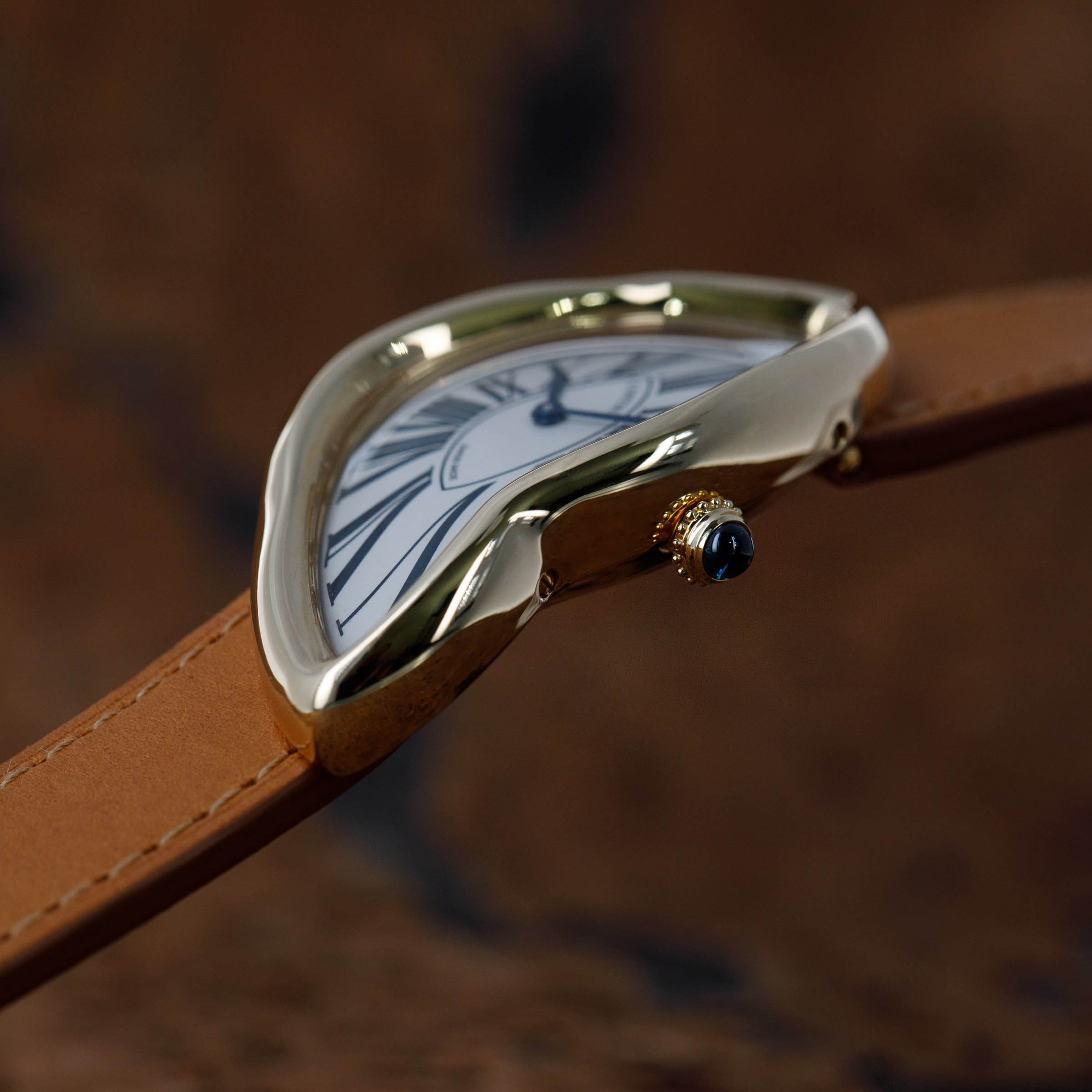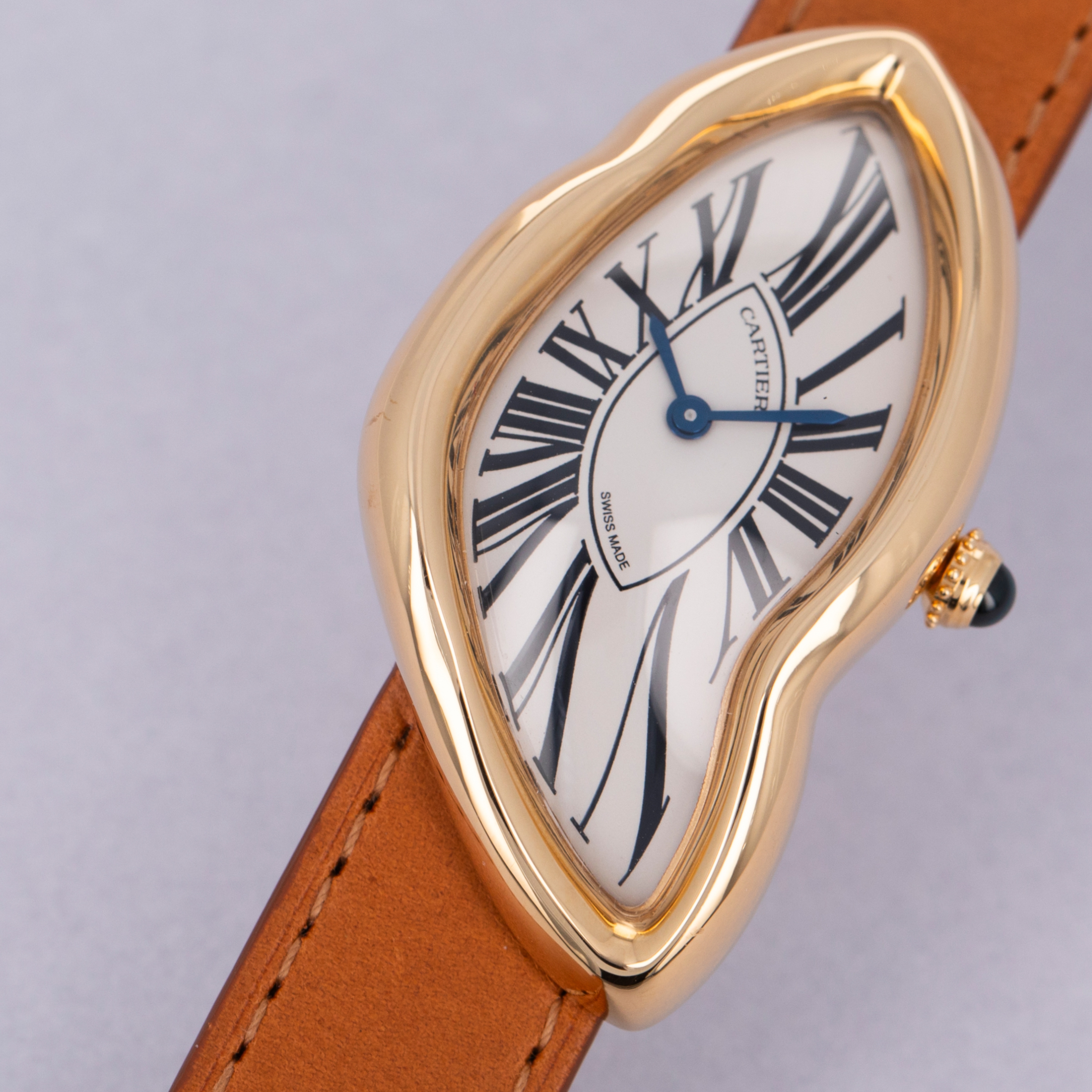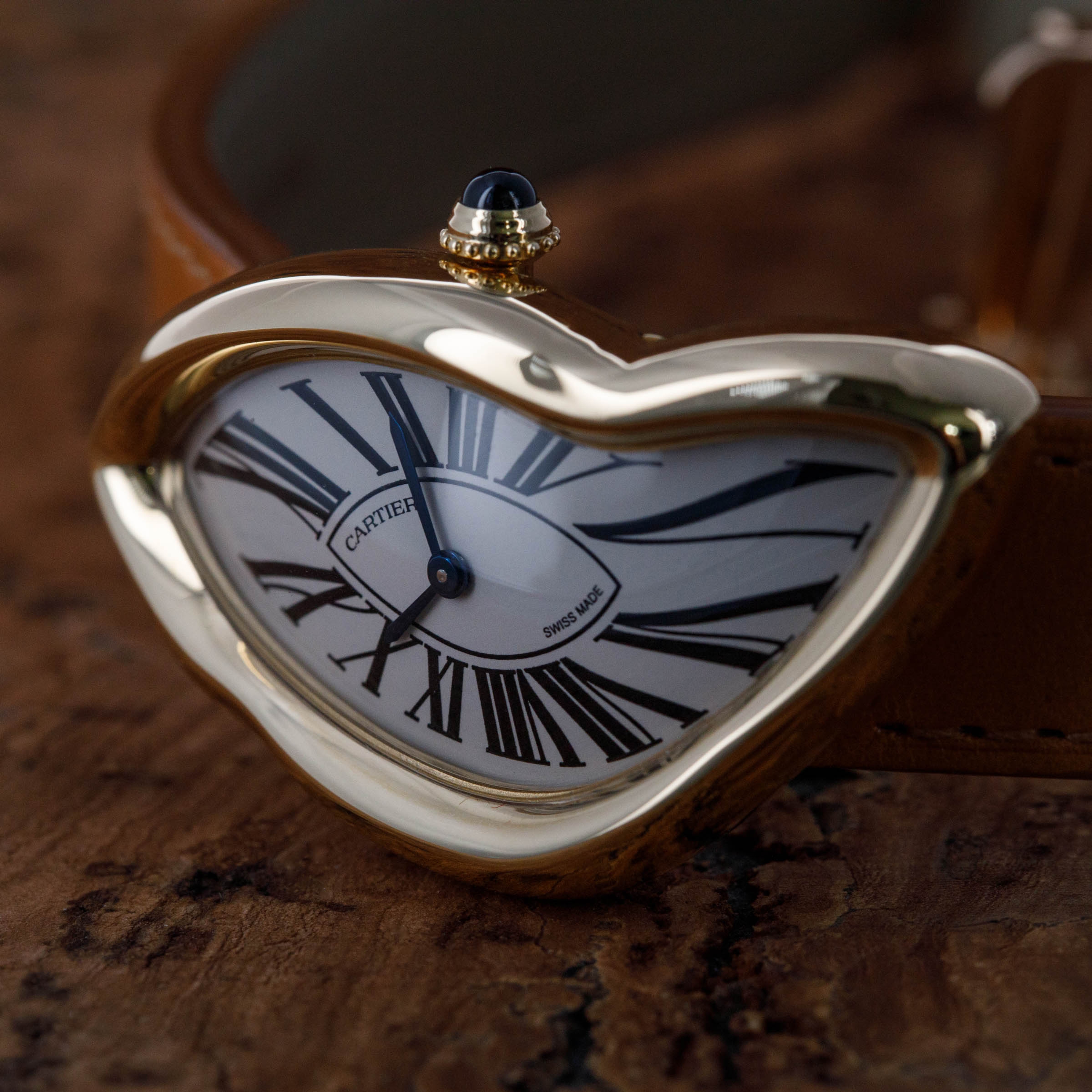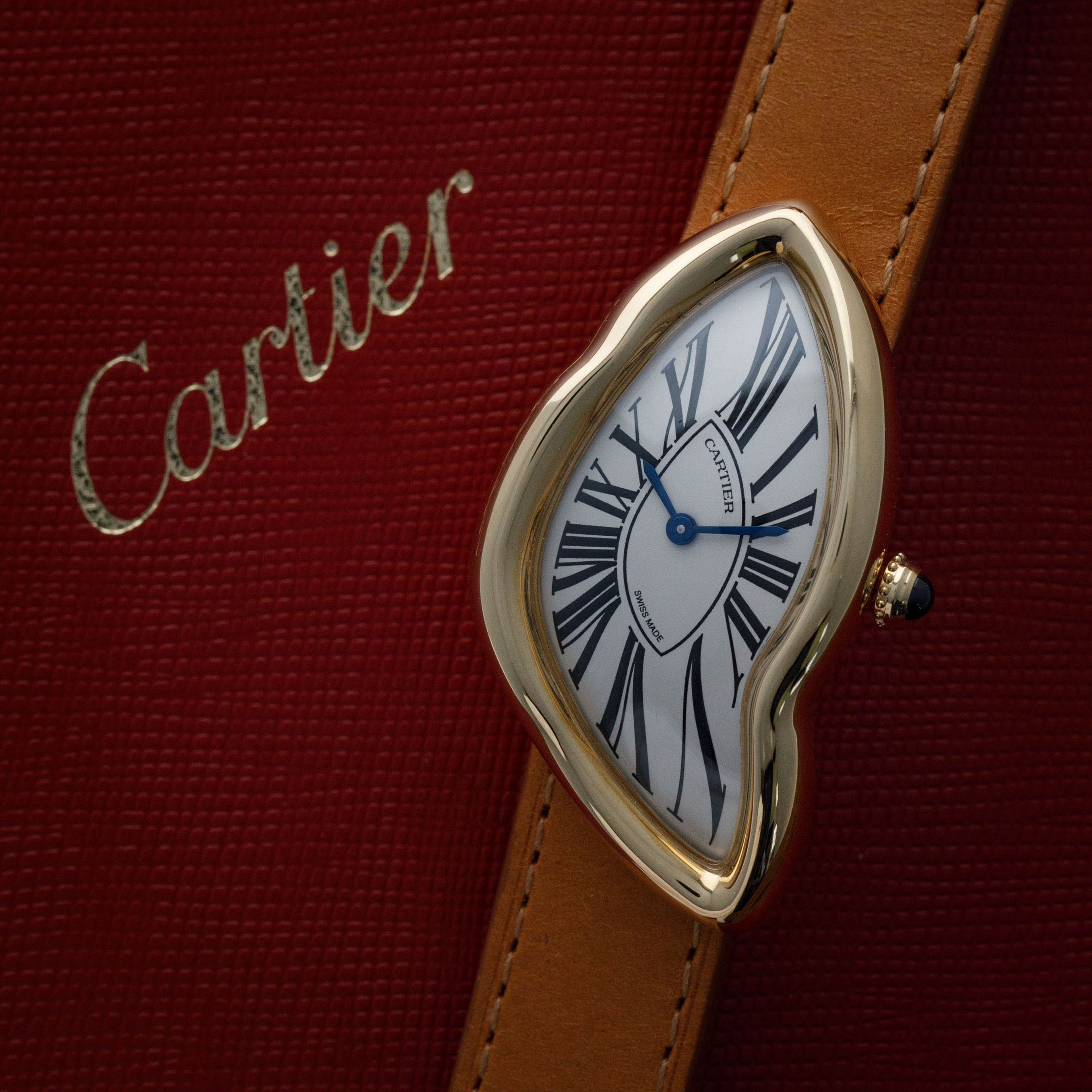 Perhaps one of Cartier's most consistent pieces of design is their dial, which the Crash remains consistent with. While its misshapen dial might appear to be melting, its exploding black Roman numerals, blued steel hands, and off-white backdrop remain entirely grounded as part of Cartier's DNA.