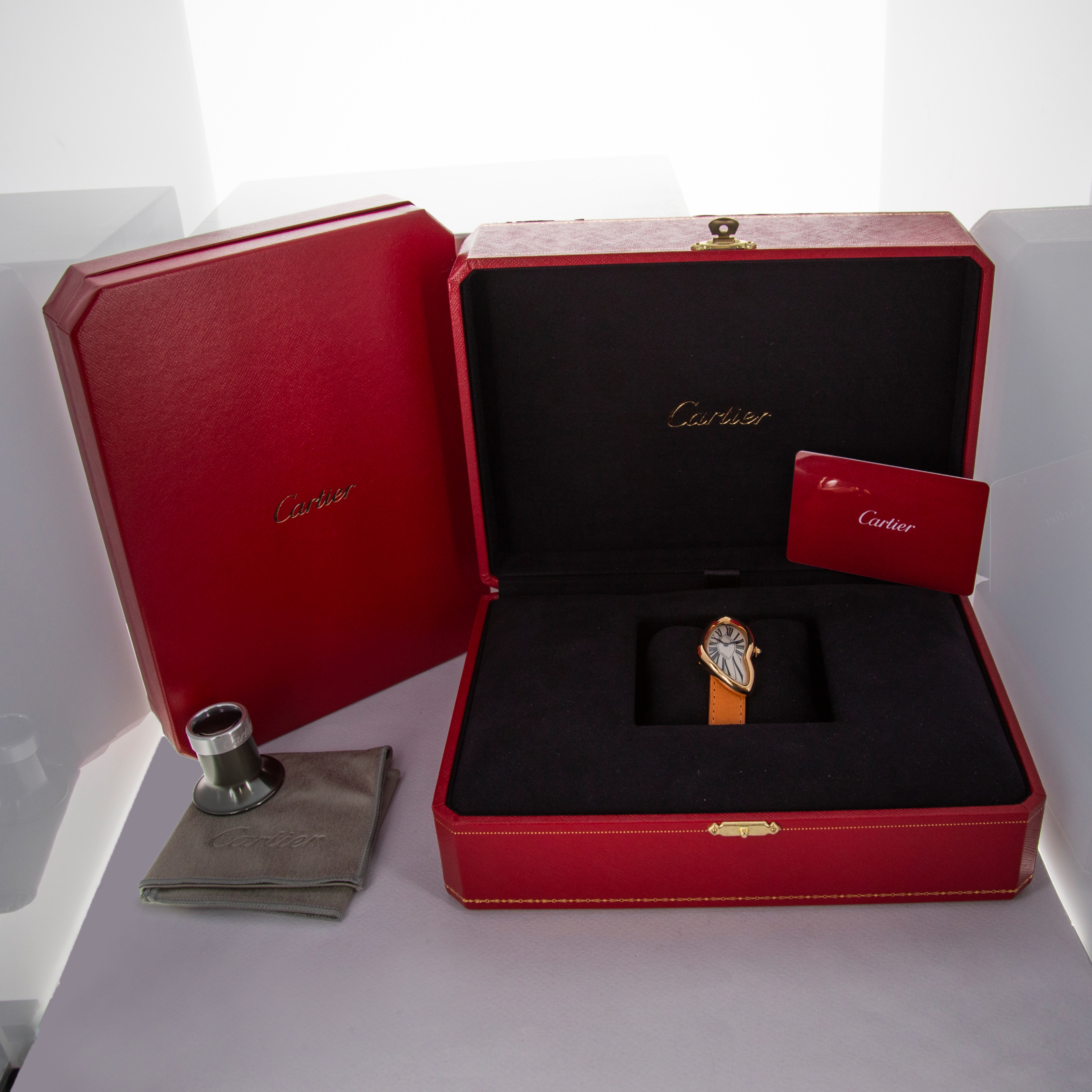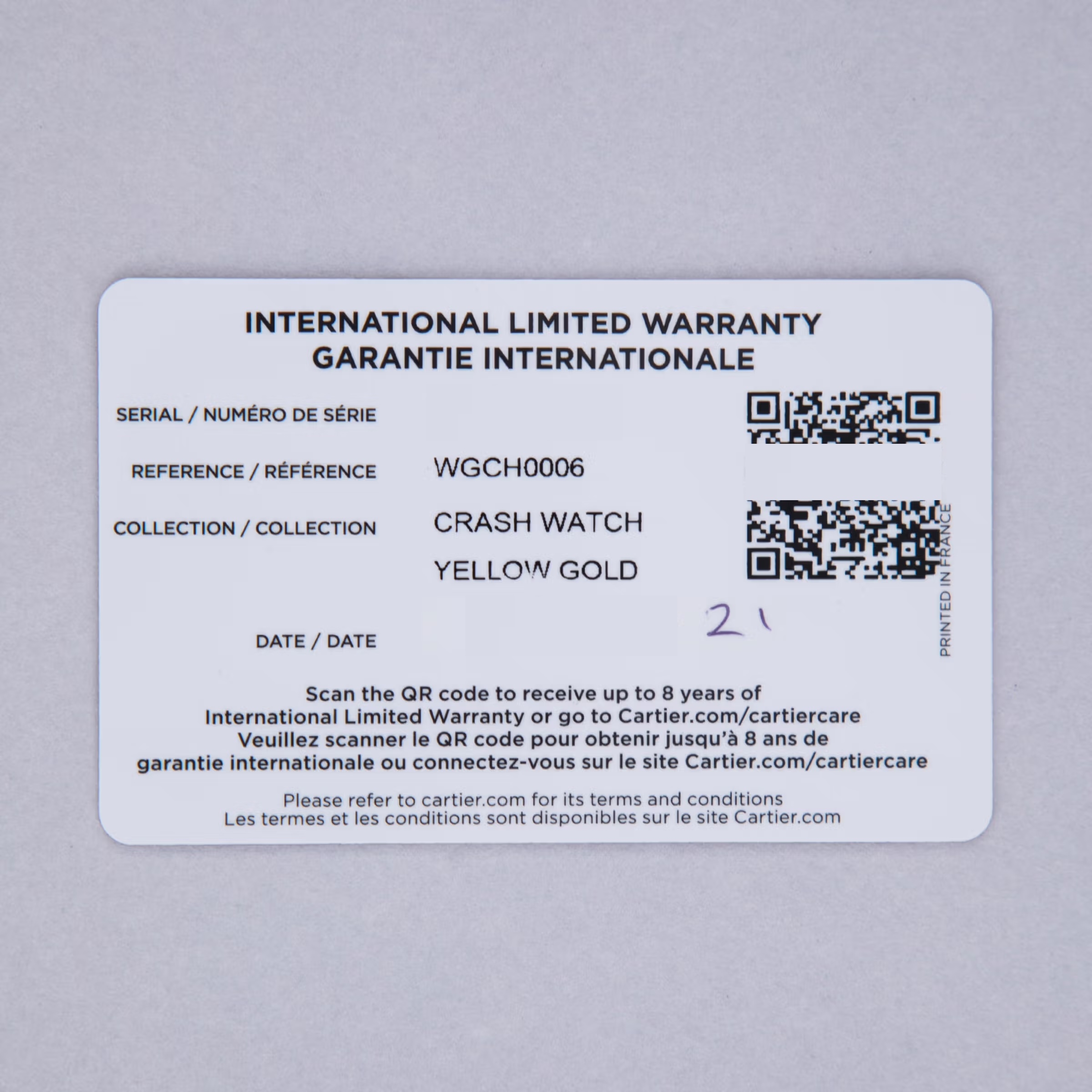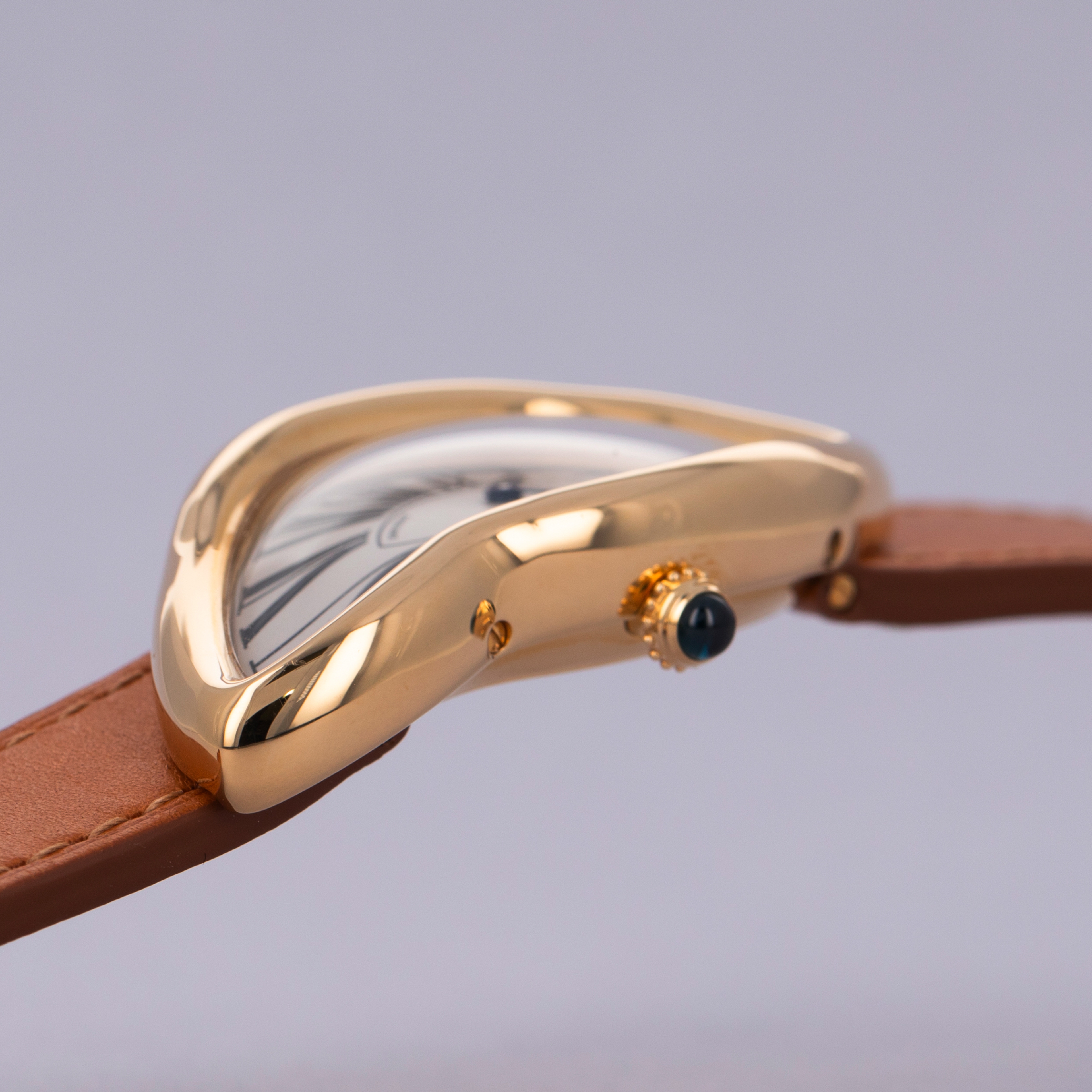 The Cartier Crash is a legendary timepiece with multiple spurious origin stories detailing things from fiery car crashes in central London to spontaneous inspiration following the arrival of a badly damaged watch in for service to Cartier’s London location. No matter its origin, the Cartier Crash is wrapped in mystique, and London is widely acknowledged as its spiritual, and literal, home due to its production being the brainchild of Jean-Jacques Cartier, the head of Cartier London at the time, and famed designer Rupert Emmerson. Jean-Jacques had decided in the mid-60s that it was time for Cartier London to create their own watches, and so, London-signed variants of the Cartier Crash are some of the most highly collected, given they were first produced there. Designed by Cartier and Emmerson to reflect the surrealist design culture that was popular during the '60s, the Crash is entirely recognizable by its unconventional case shape reminiscent of Salvador Dali's melting clocks in his 1931 painting 'The Persistence of Memory' and its warped dial layout. The design was conceived as a Cartier Oval with "twisted ends". Launched in 2019 as a re-issue of the London Crash, the ref. WGCH0006 that we have here is constructed of 18kt yellow gold and boasts the Crash’s signature white dial featuring black exploded Roman numerals and blue steel hands. Reduced from the Crash’s larger size of 43mm tall to 38.5mm, the ref. WGCH0006 is extremely wearable and speaks to the popularization of smaller watches that we are currently experiencing. Powered by a manual-wind movement and only 8.4mm tall, this Crash is intensely elegant and simply a stunning piece of horological history.