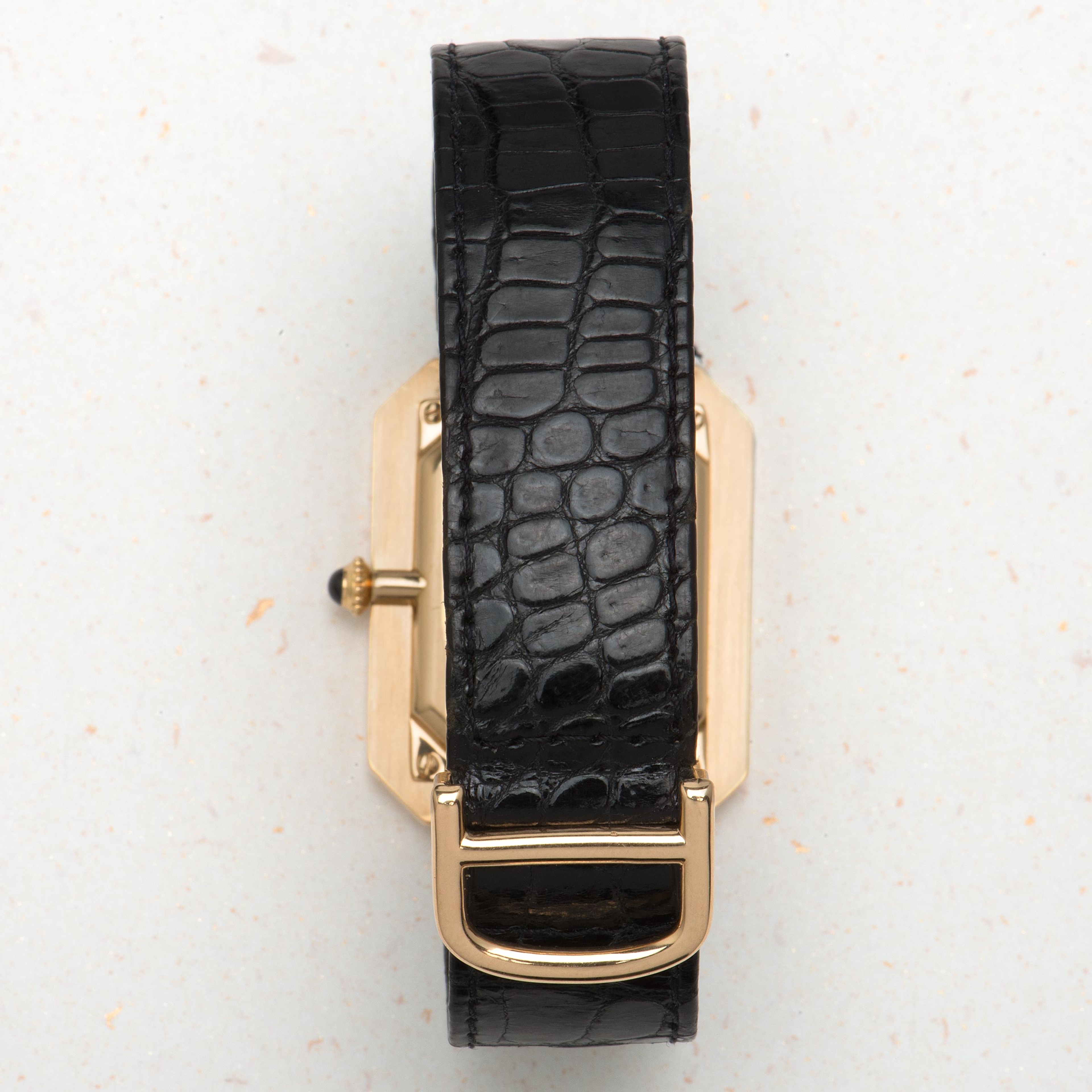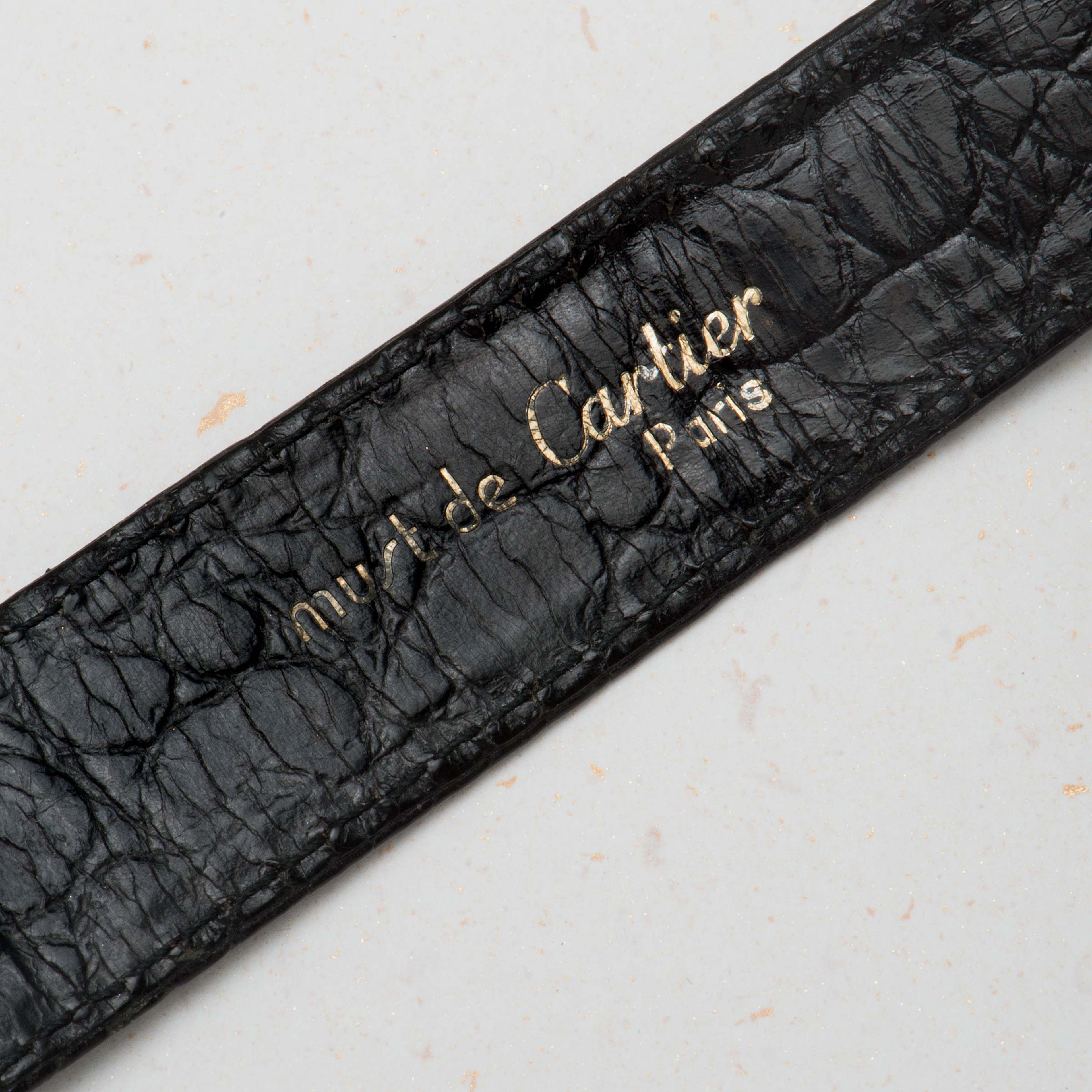 In very well preserved condition. The watch has tremendous character. The dial is very well preserved with some light tarnishing towards the very edge where the dial meets the bezel. The overall finish to the dial has aged to a lovely egg-sell. The case is crisp with nicely defined steps and case lines. Only very minor surface wear. The case back with very clear and crisp inscriptions. The screw heads are also in very nice condition. Overall, a great example of this uber rare reference. The Cartier Deployant buckle in equally well preserved condition.