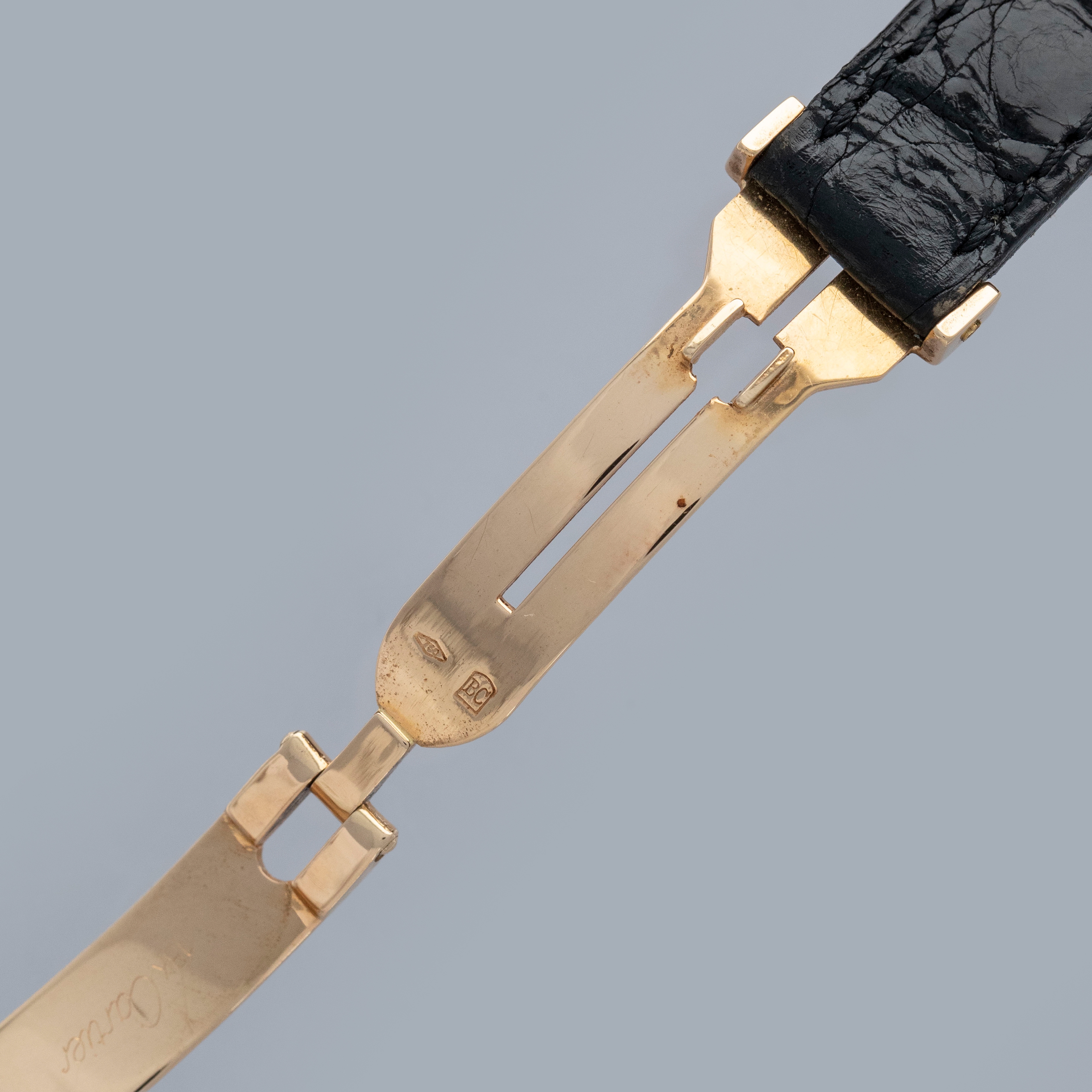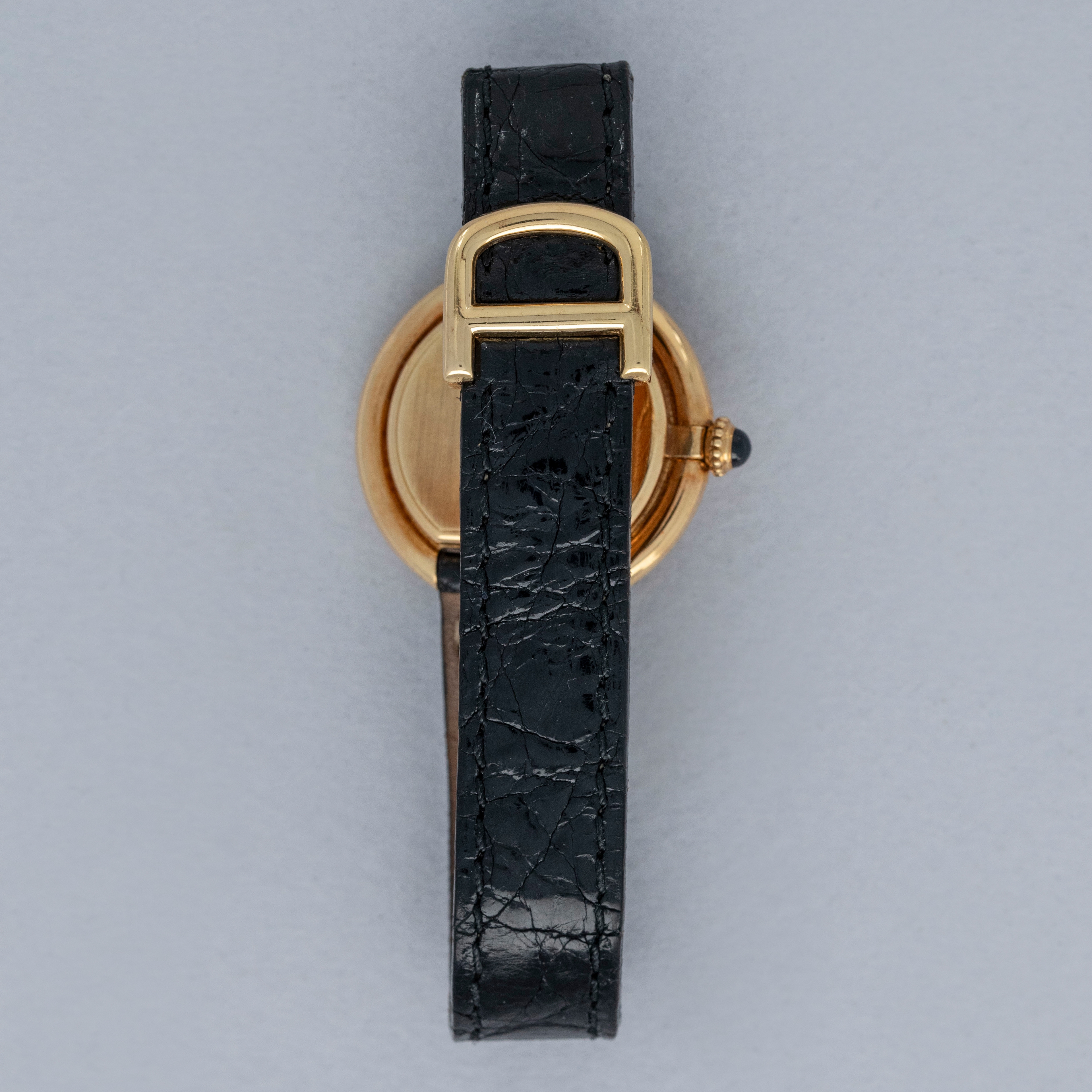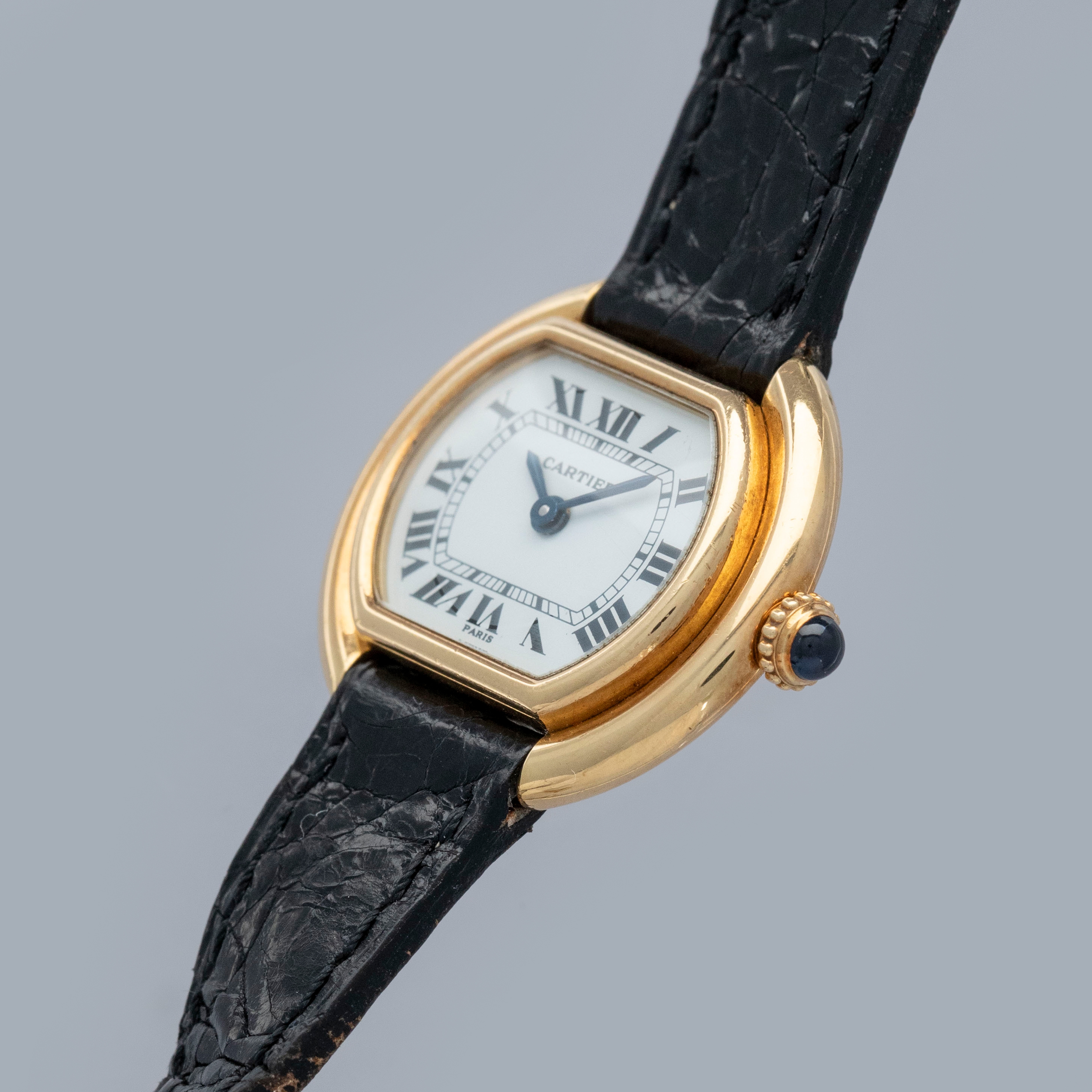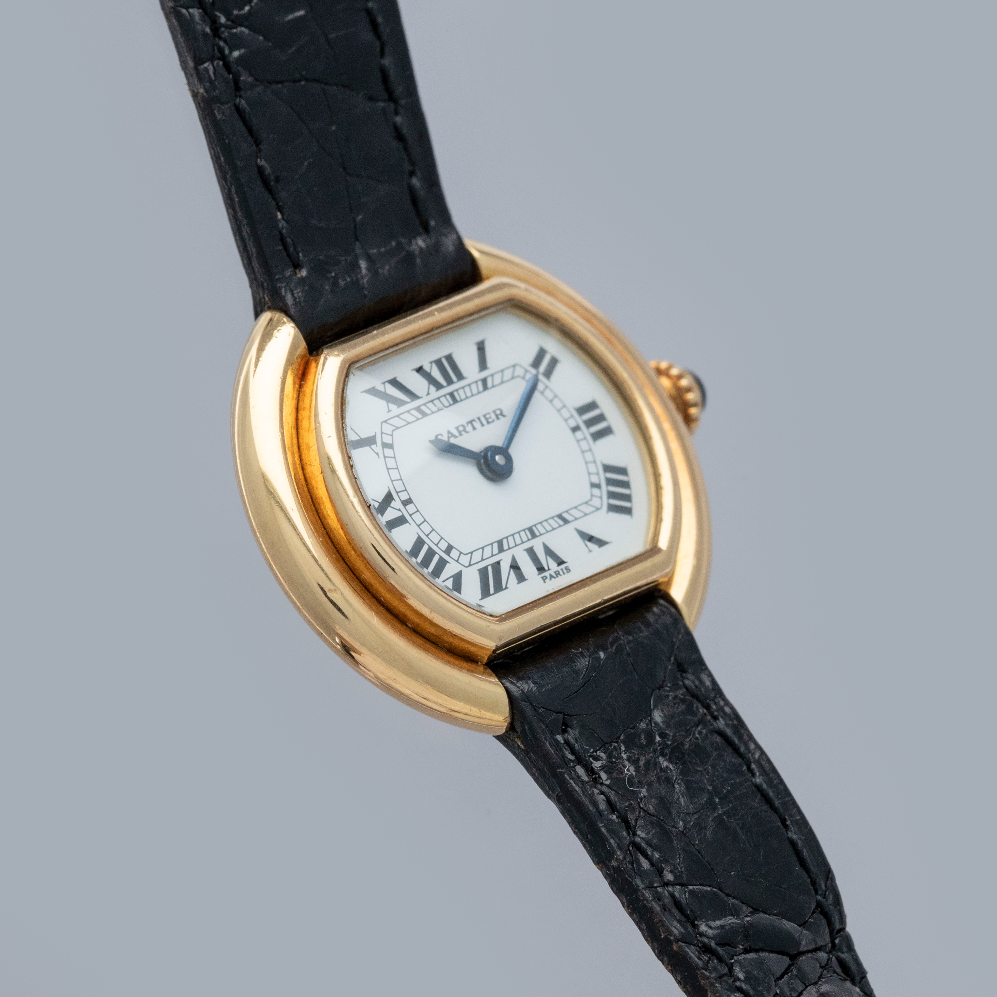 The watch is in overall excellent condition. The yellow gold case has some scratches and light nicks, but remains well defined. The case back features crisp engravings and hallmarks, and the cabochon winder is in excellent condition. The dial is very good, with some fine hairline cracks in the enamel, while the blued hands are very clean. Fitted with a black alligator strap and yellow gold deployant clasp in excellent condition. Please note the watch ticks at time of cataloging, but timekeeping is poor and a service is recommended.