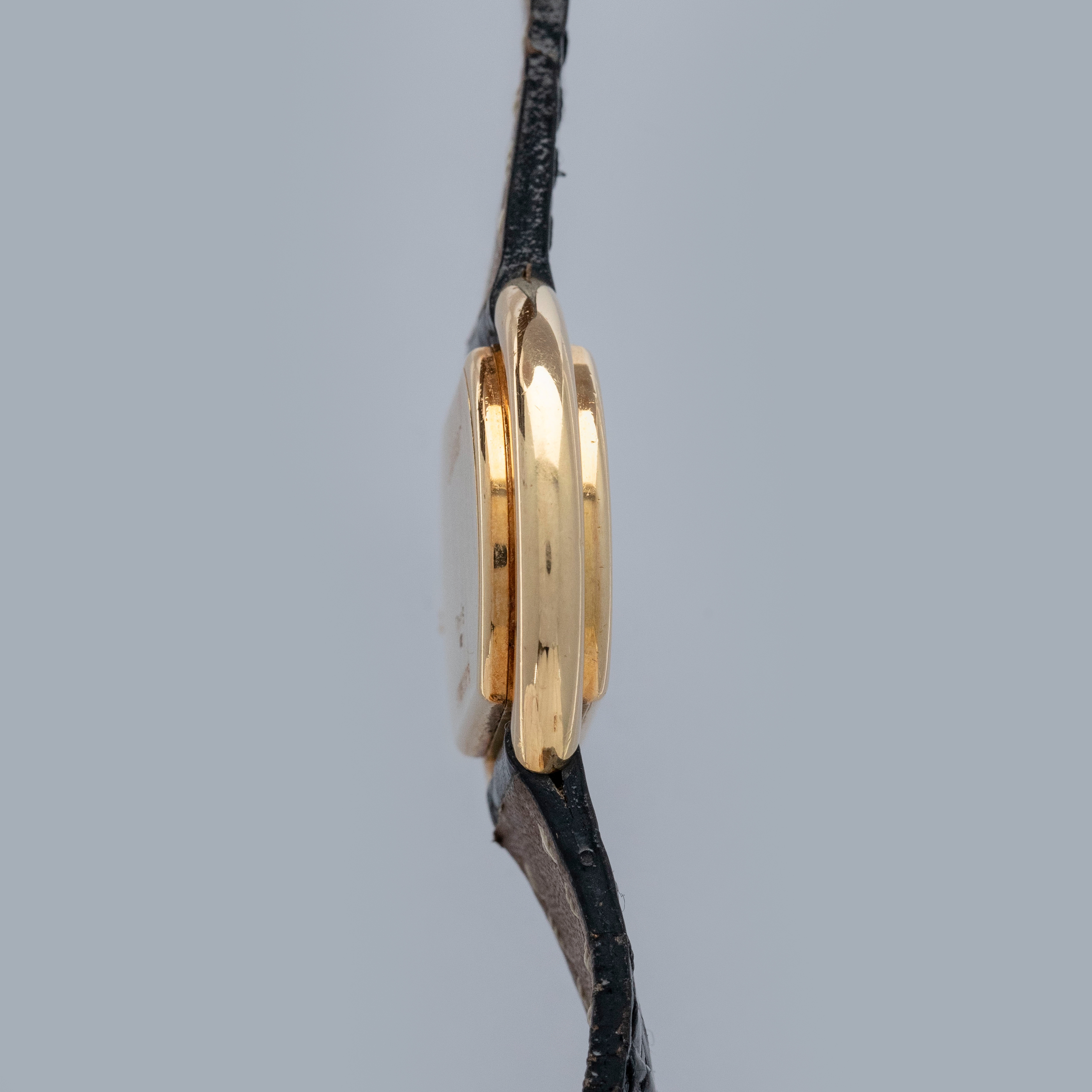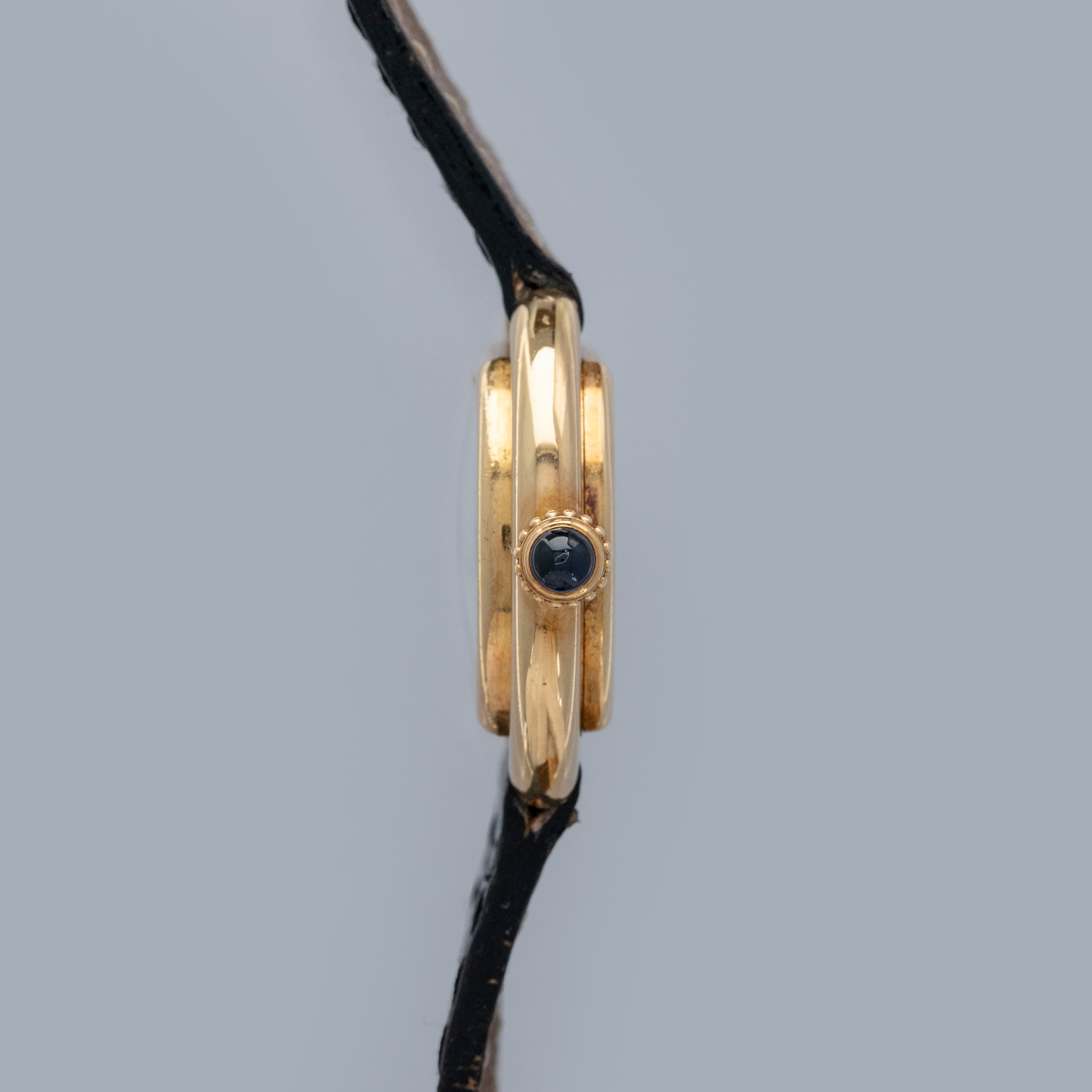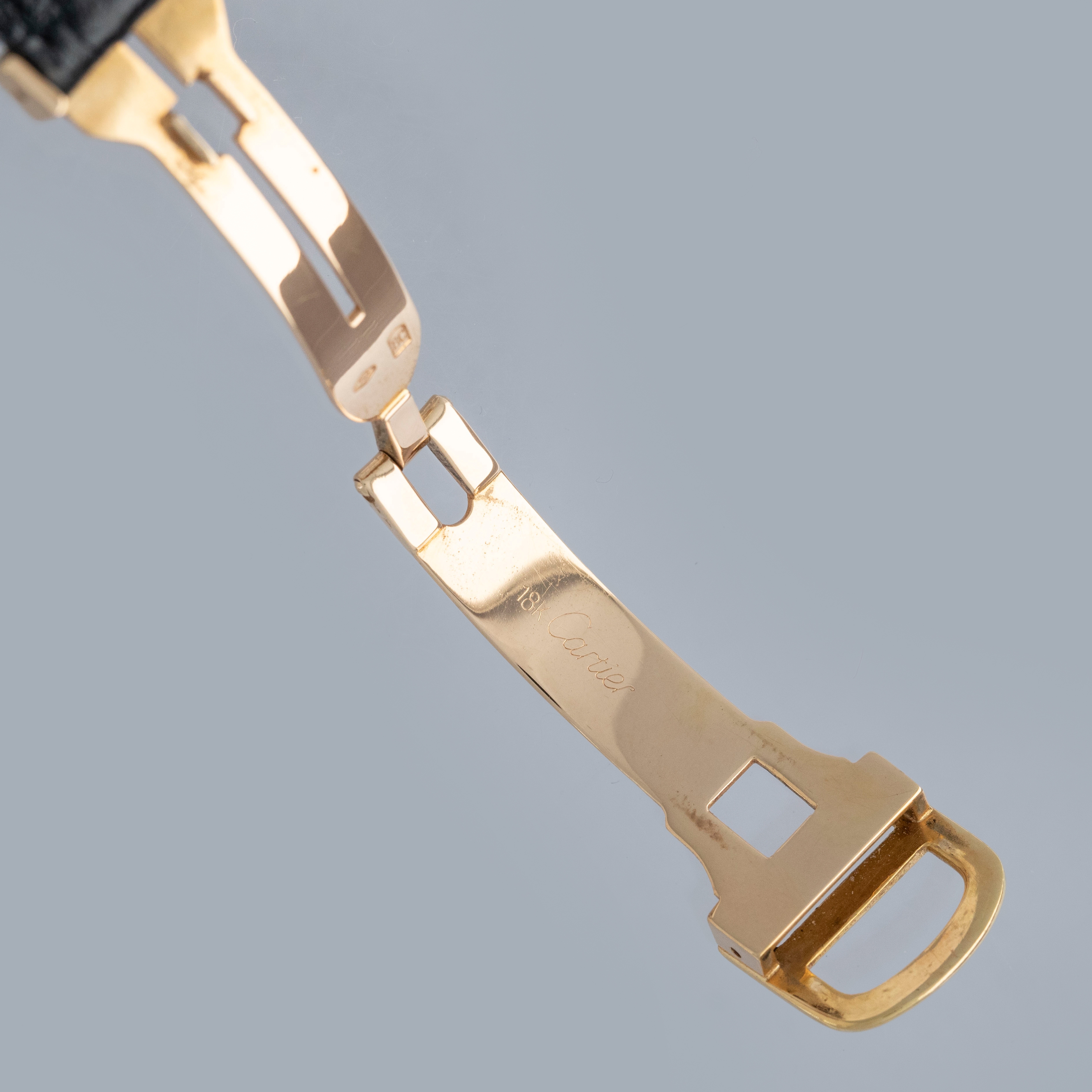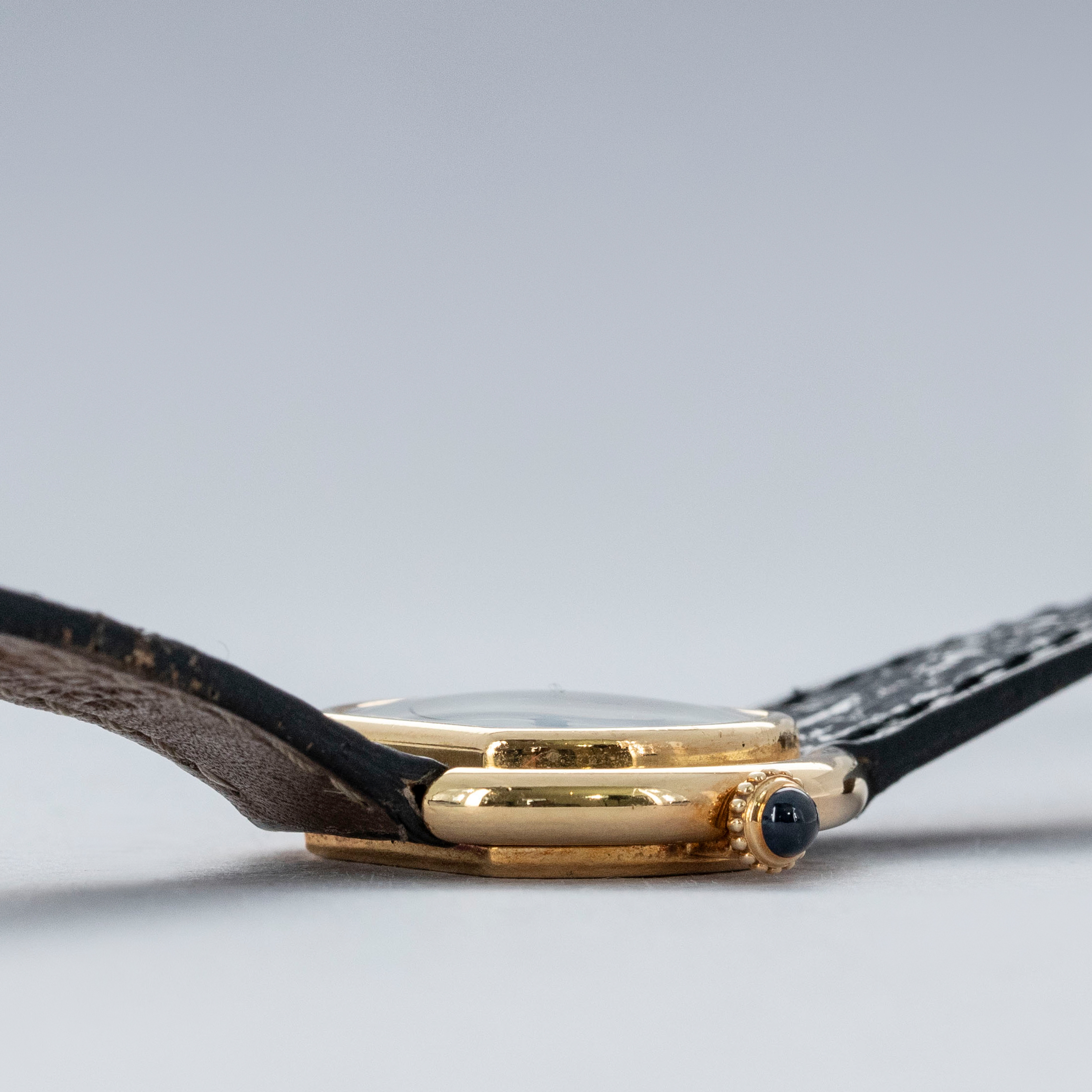 The watch is in overall excellent condition. The yellow gold case has some scratches and light nicks, but remains well defined. The case back features crisp engravings and hallmarks, and the cabochon winder is in excellent condition. The dial is very good, with some fine hairline cracks in the enamel, while the blued hands are very clean. Fitted with a black alligator strap and yellow gold deployant clasp in excellent condition. Please note the watch ticks at time of cataloging, but timekeeping is poor and a service is recommended.