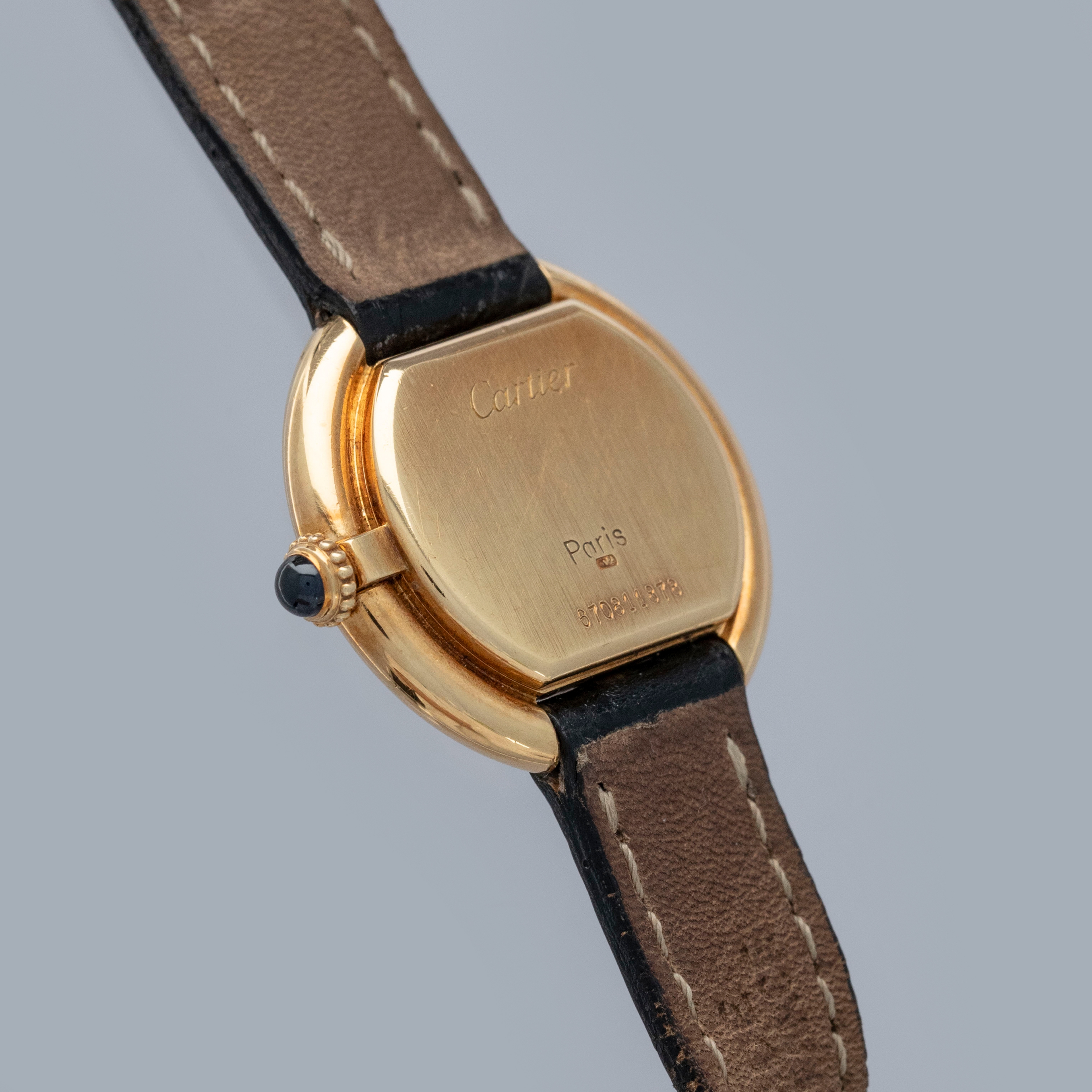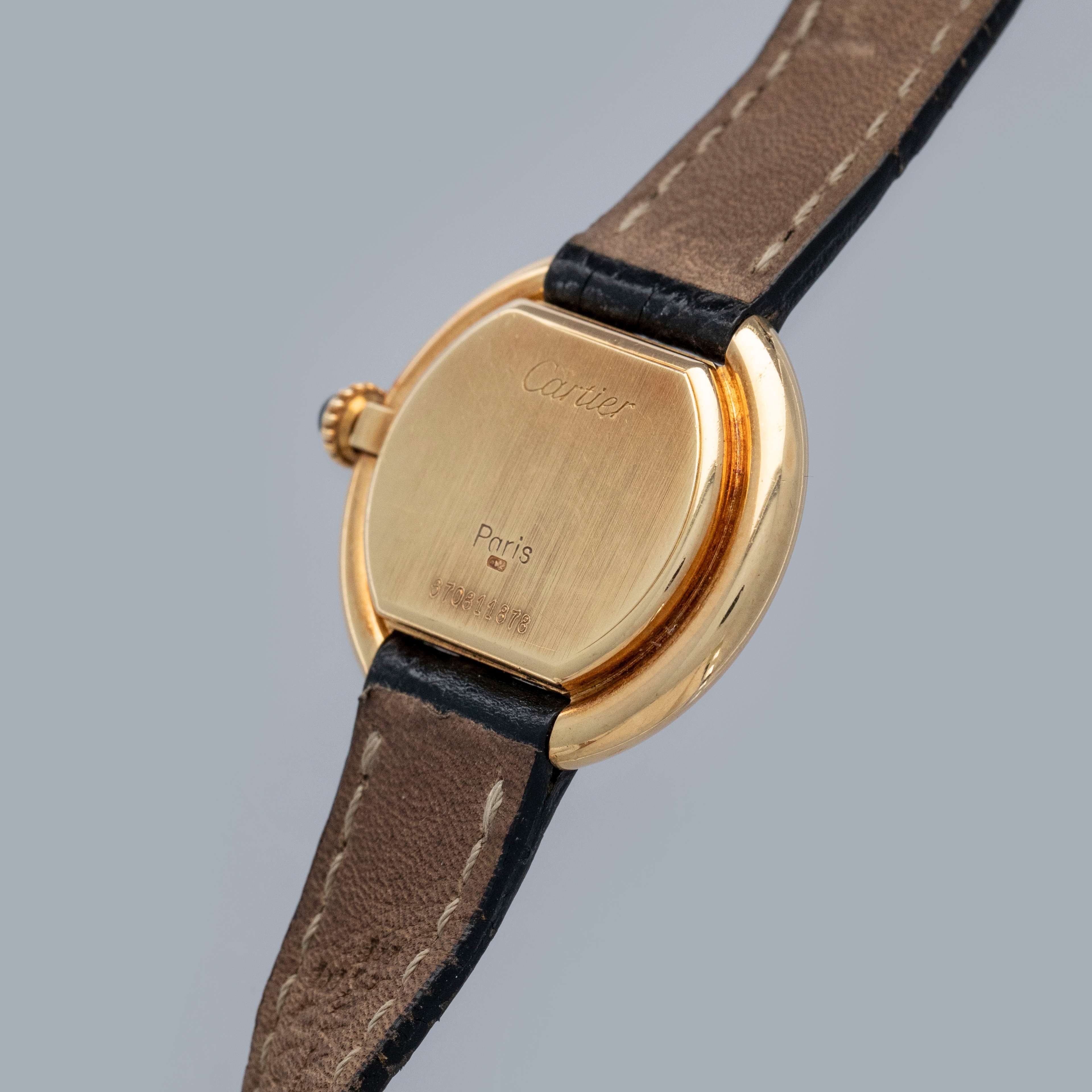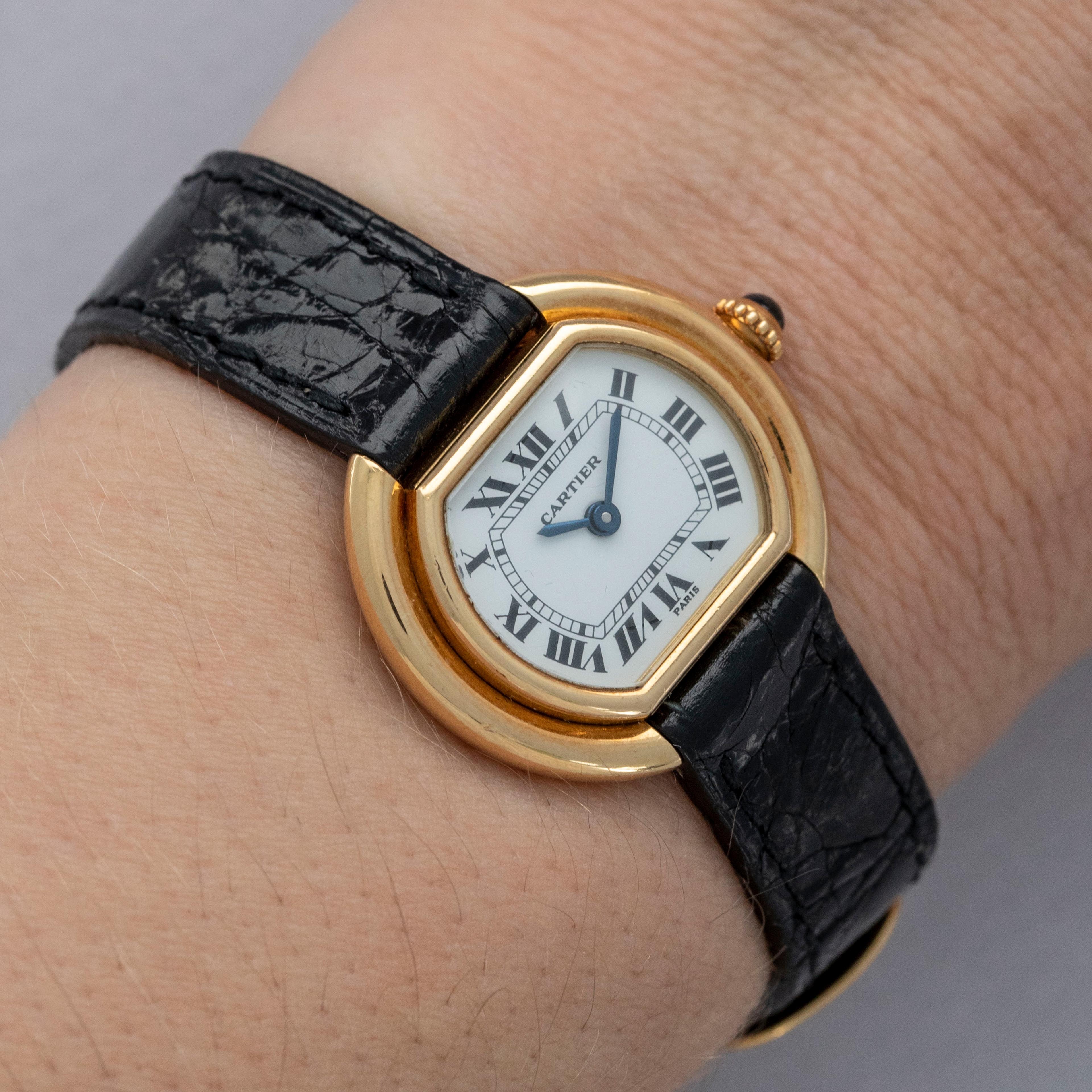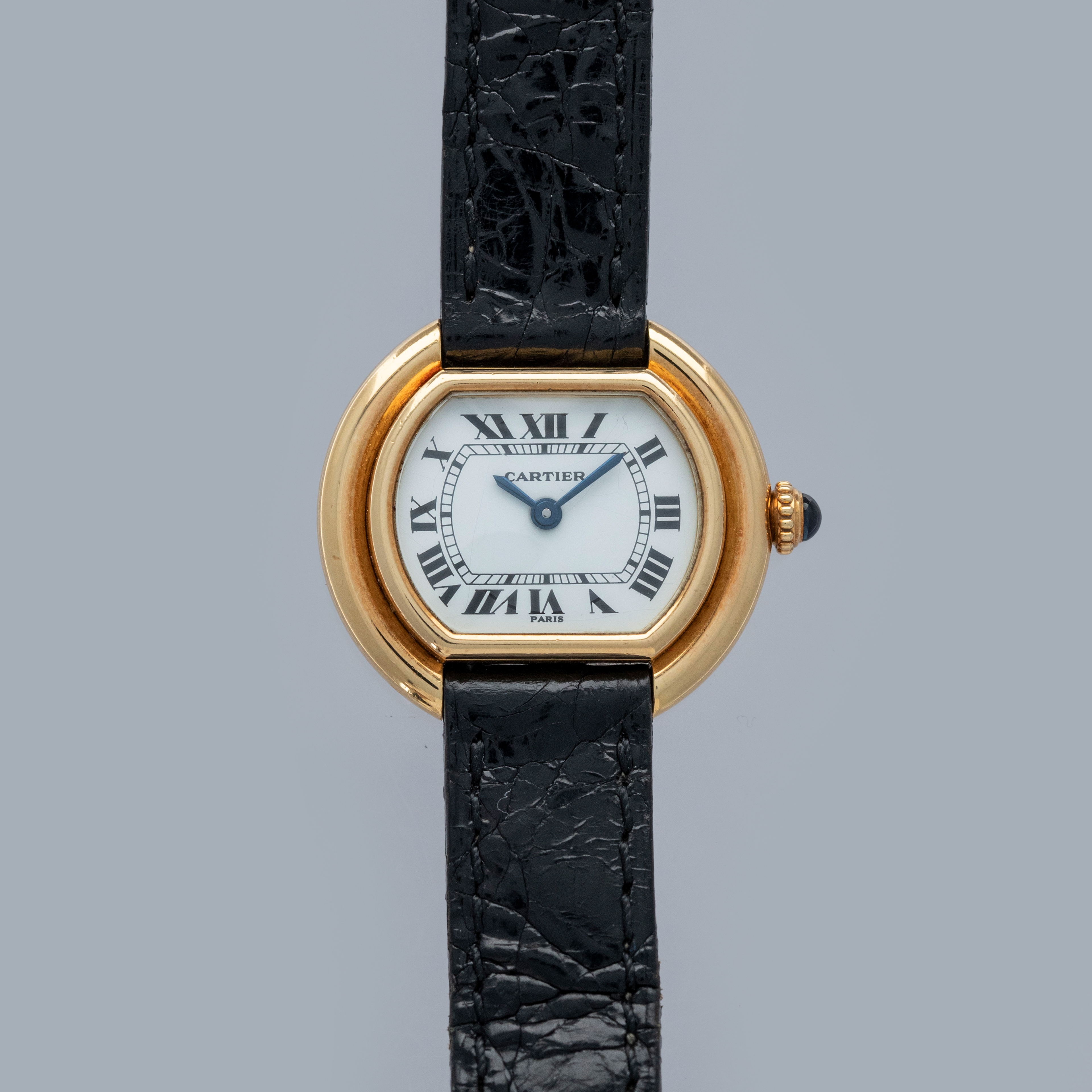 Featuring all of Cartier's core design tenets, the Ellipse boasts the same bright white dial with black Roman numerals, a railroad minute track and blued steel hands that can be found across hundreds of Cartier designs.