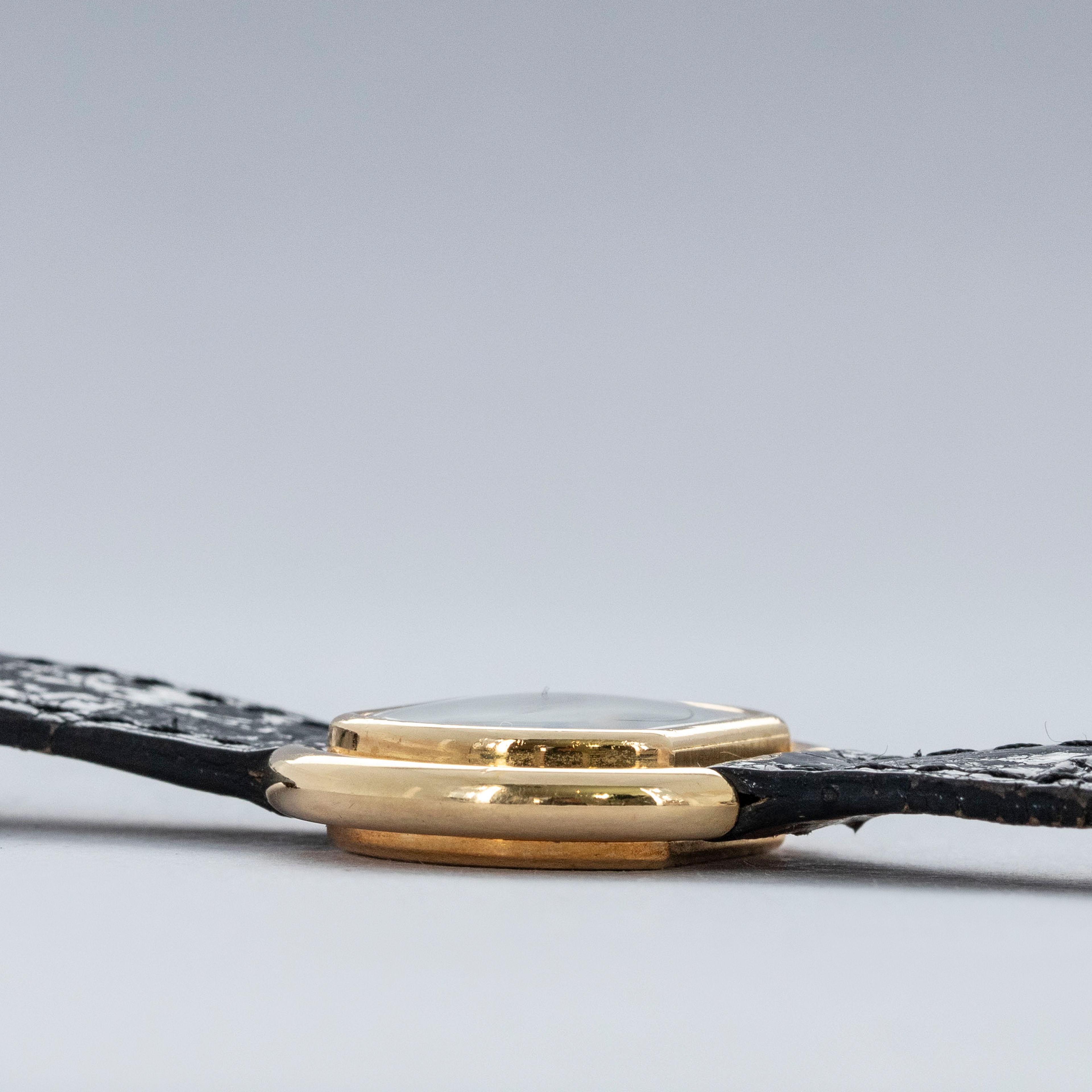 With its squared-off oval shape, the Gondole Ellipse wears neatly on the wrist while still maintaining a distinctive presence on account of its hefty 18kt yellow gold construction, stepped bezel and unique shape.
