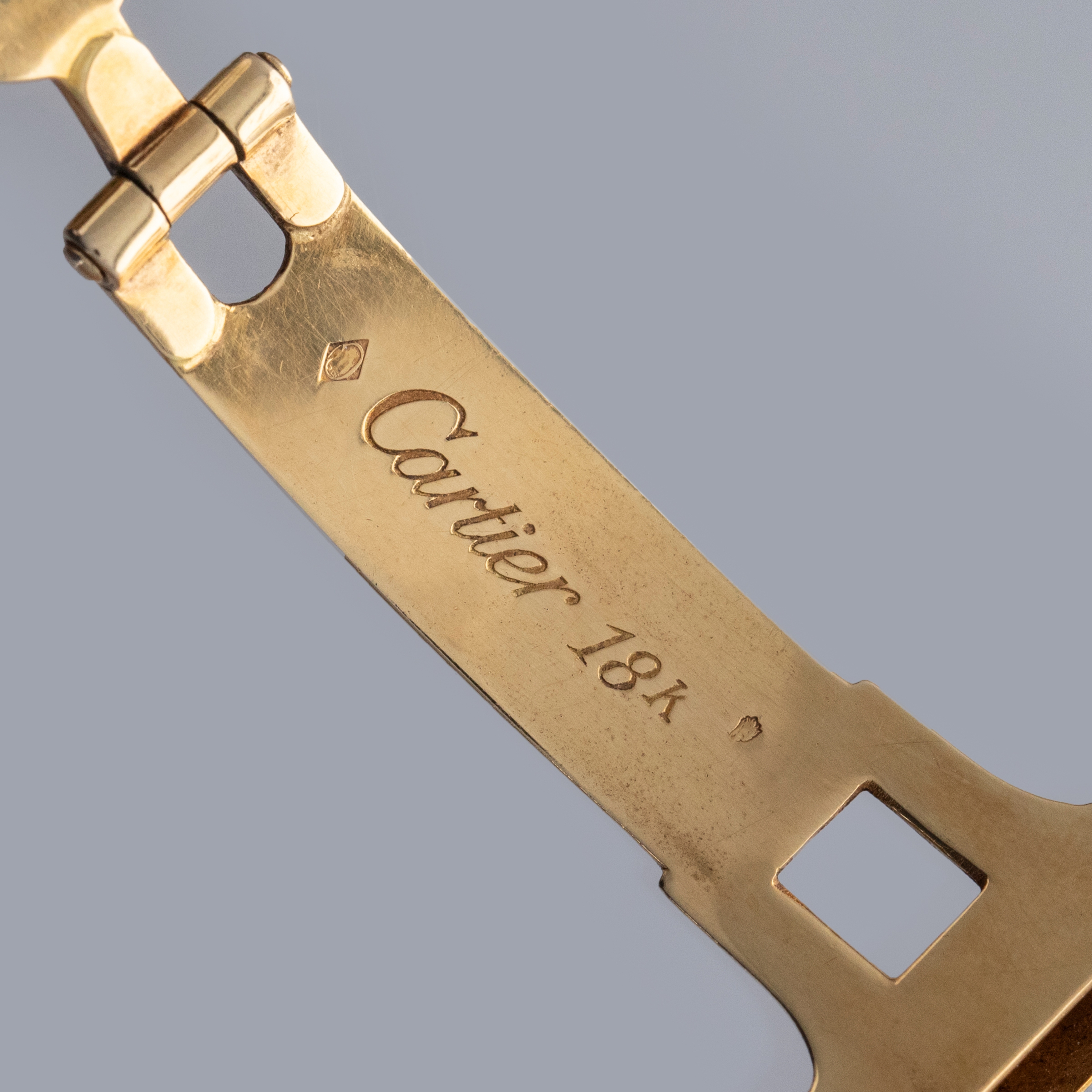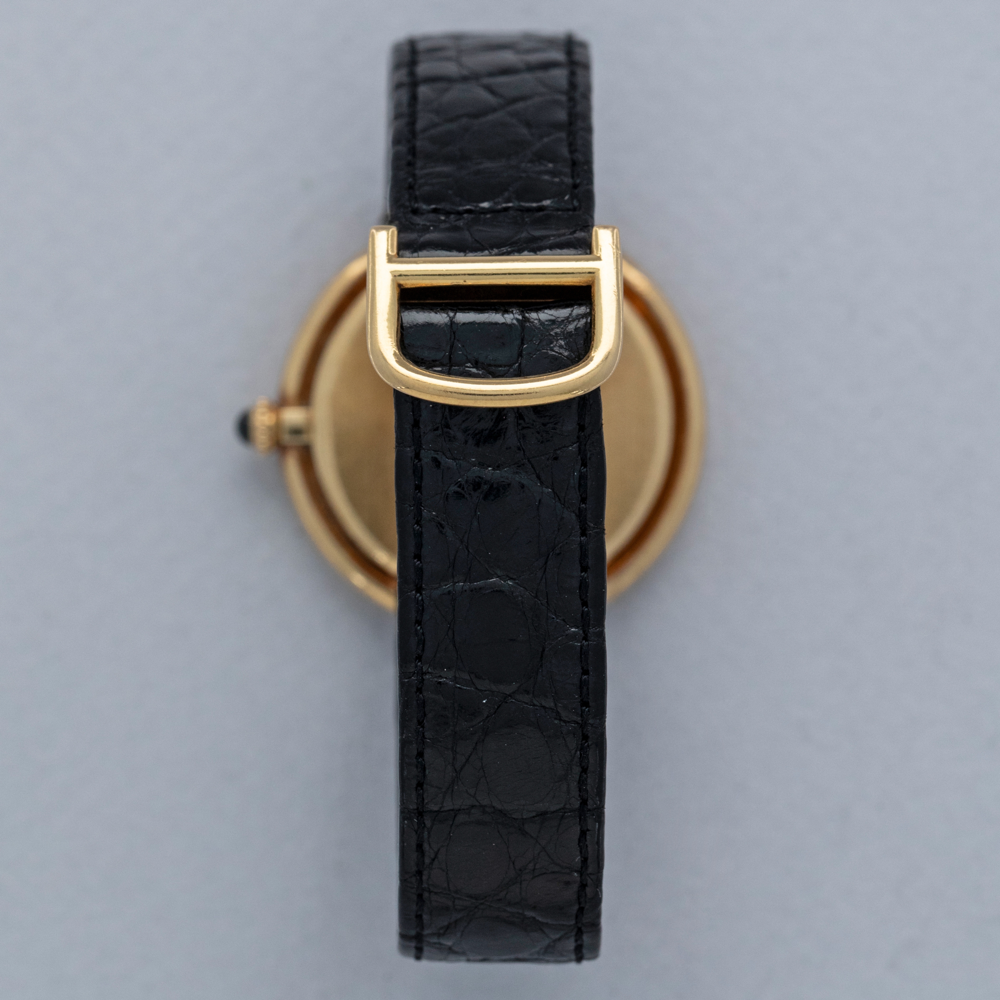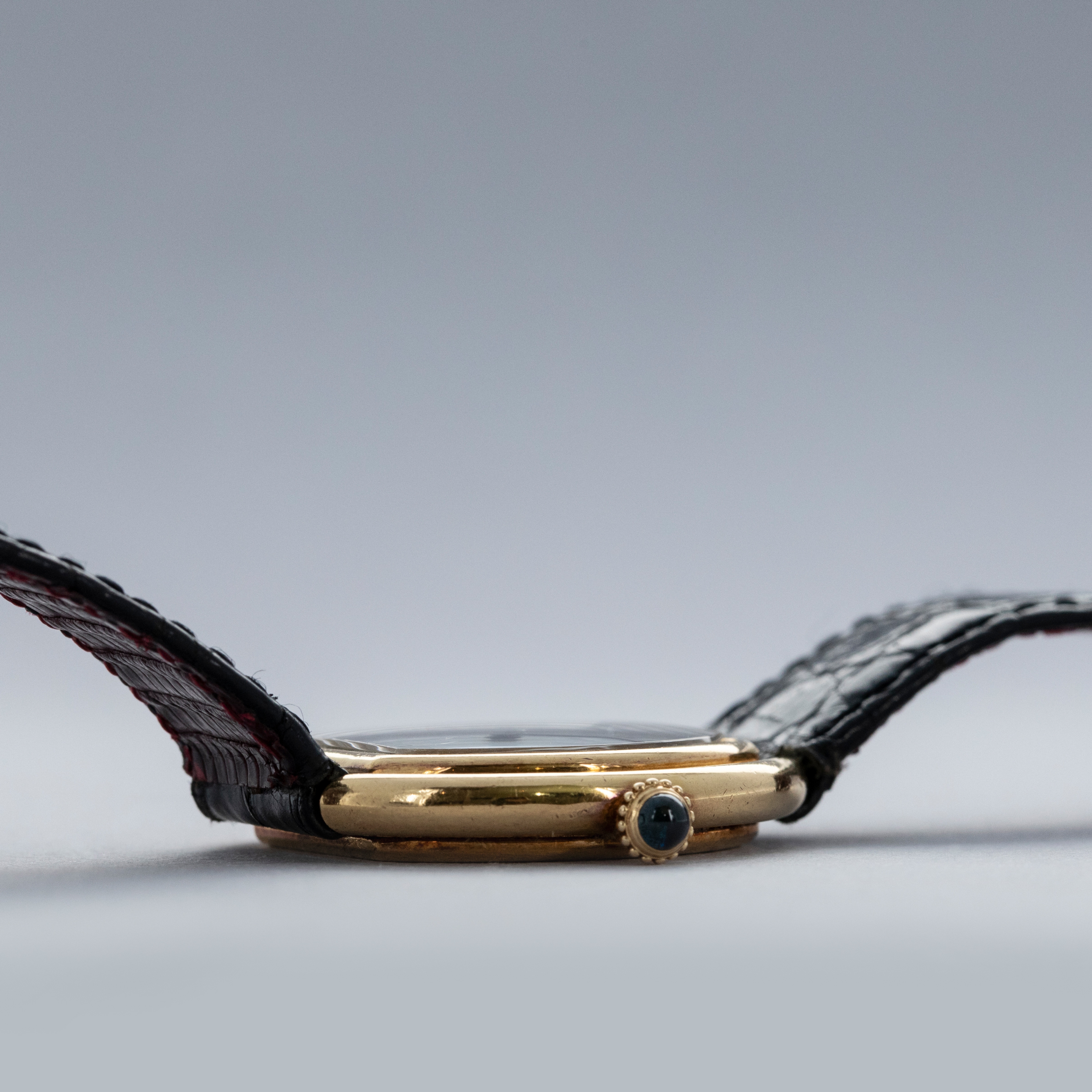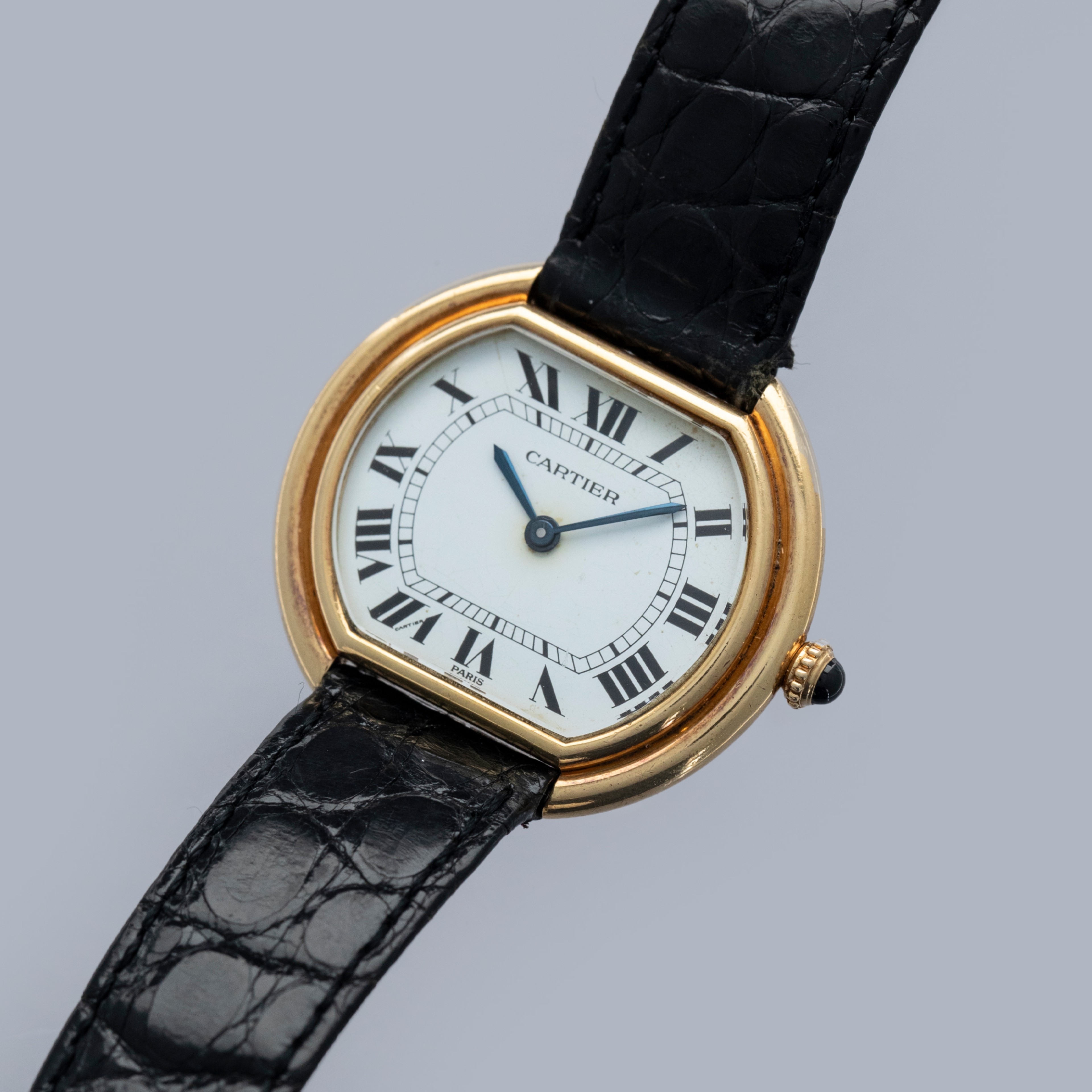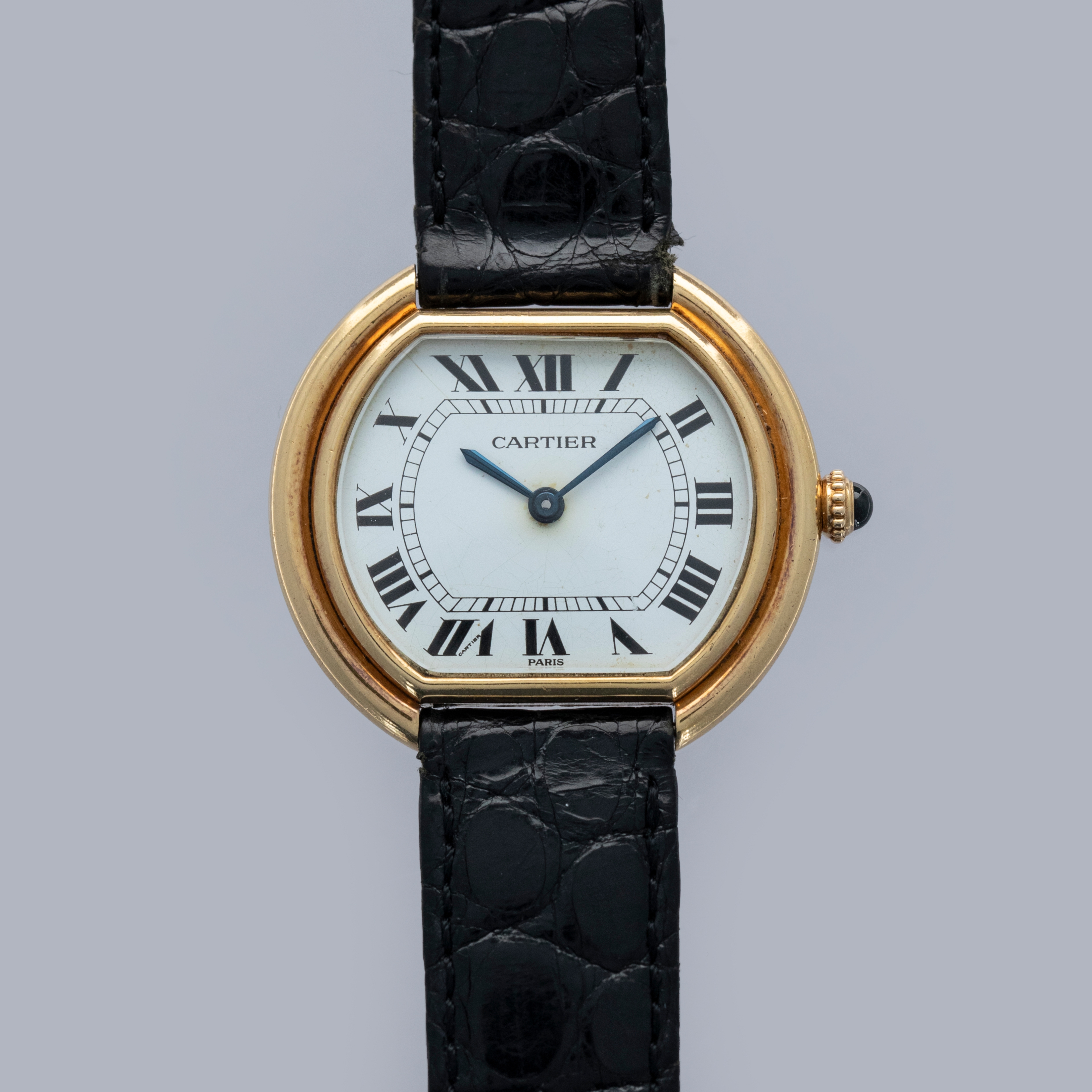The yellow gold case is in very good condition, with some surface scratches. The case back features well-defined engravings and hallmarks, with some nicks around the edge. The white Paris-signed dial with Roman numerals shows discoloration around the center, with marks and crazing across the surface. A more noticeable crack is present near eleven o’clock. The watch is fitted with a black leather strap and the original yellow gold Cartier deployant clasp.